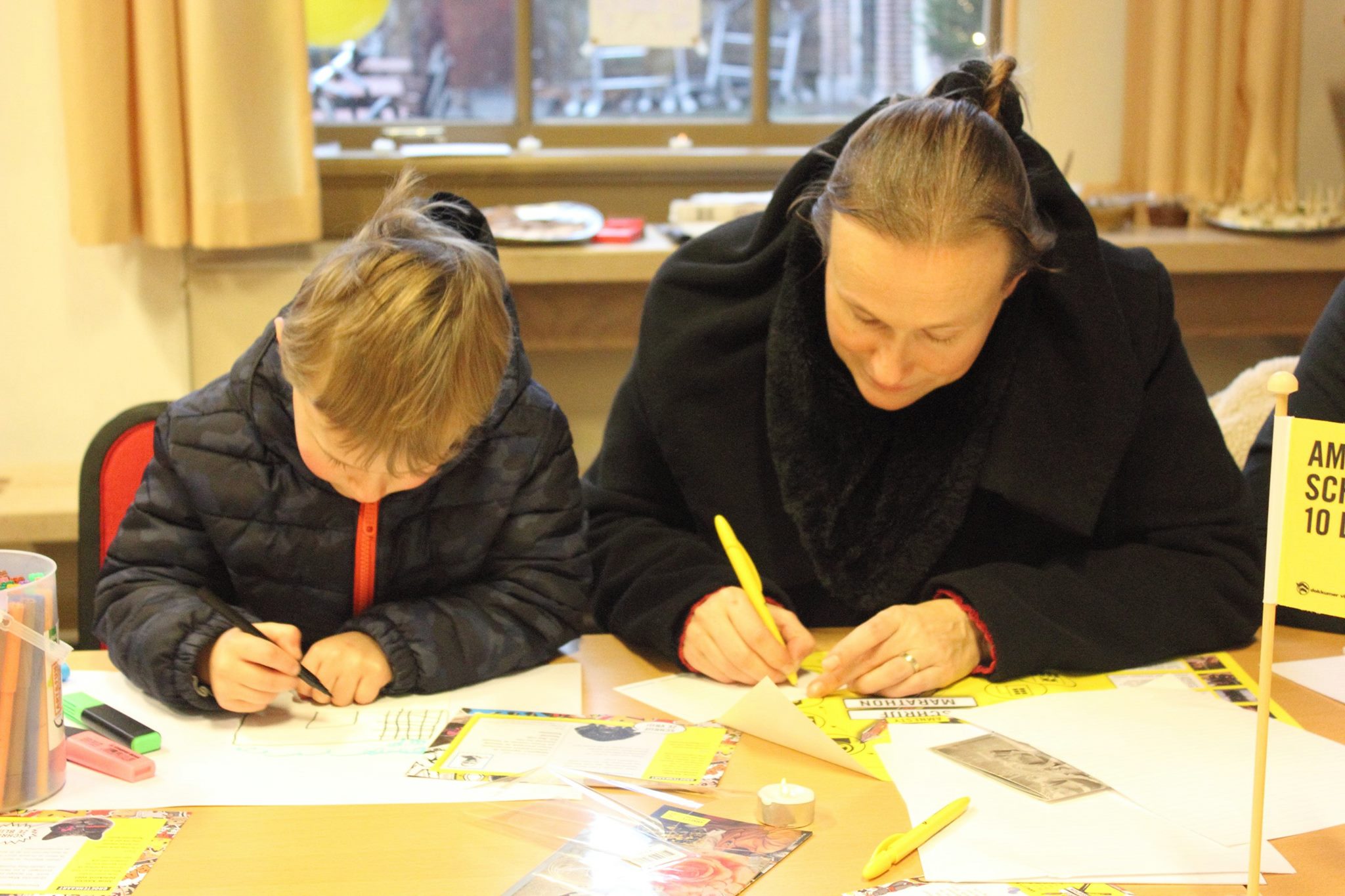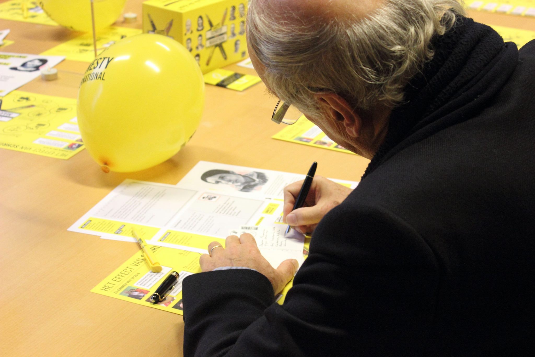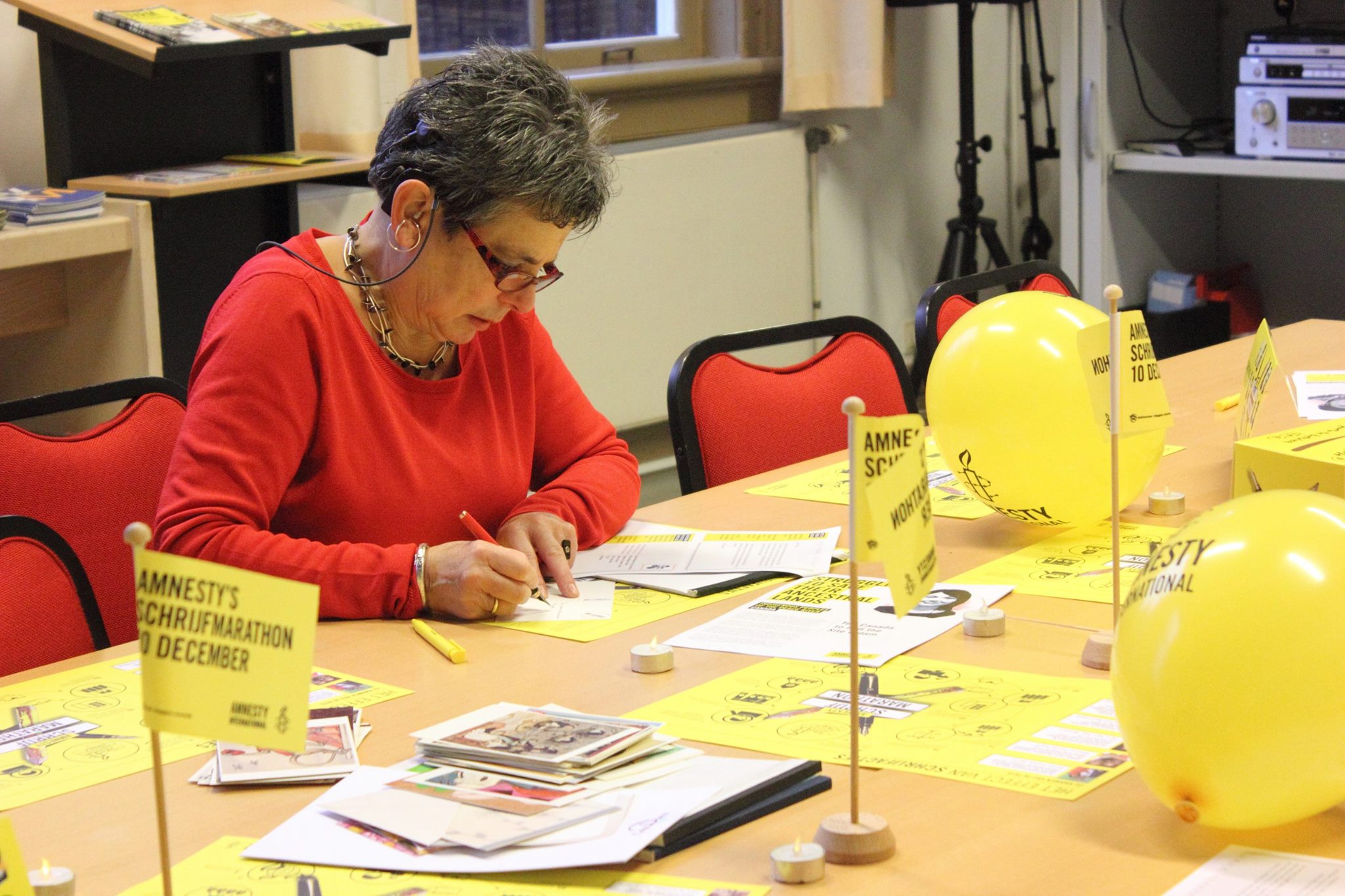 Een van de schrijvers was Gabriel. Hij kan zelf net twee maanden schrijven en wilde heel graag een kaartje naar Fomusoh Ivo Feh sturen. Fomusoh zit in de gevangenis in Kameroen voor het doorsturen van een sms’je. Ook Egbert Meyer, voormalig Nederlandse rechter bij het Europees Hof voor de Rechten van de Mens, was aanwezig. Hij deed een kort openingswoord waarna hij zelf druk aan het schrijven sloeg. Jenny Goldschmidt, oud voorzitter van de Commissie Gelijke Behandeling, kwam ook langs om een aantal brieven te schrijven.