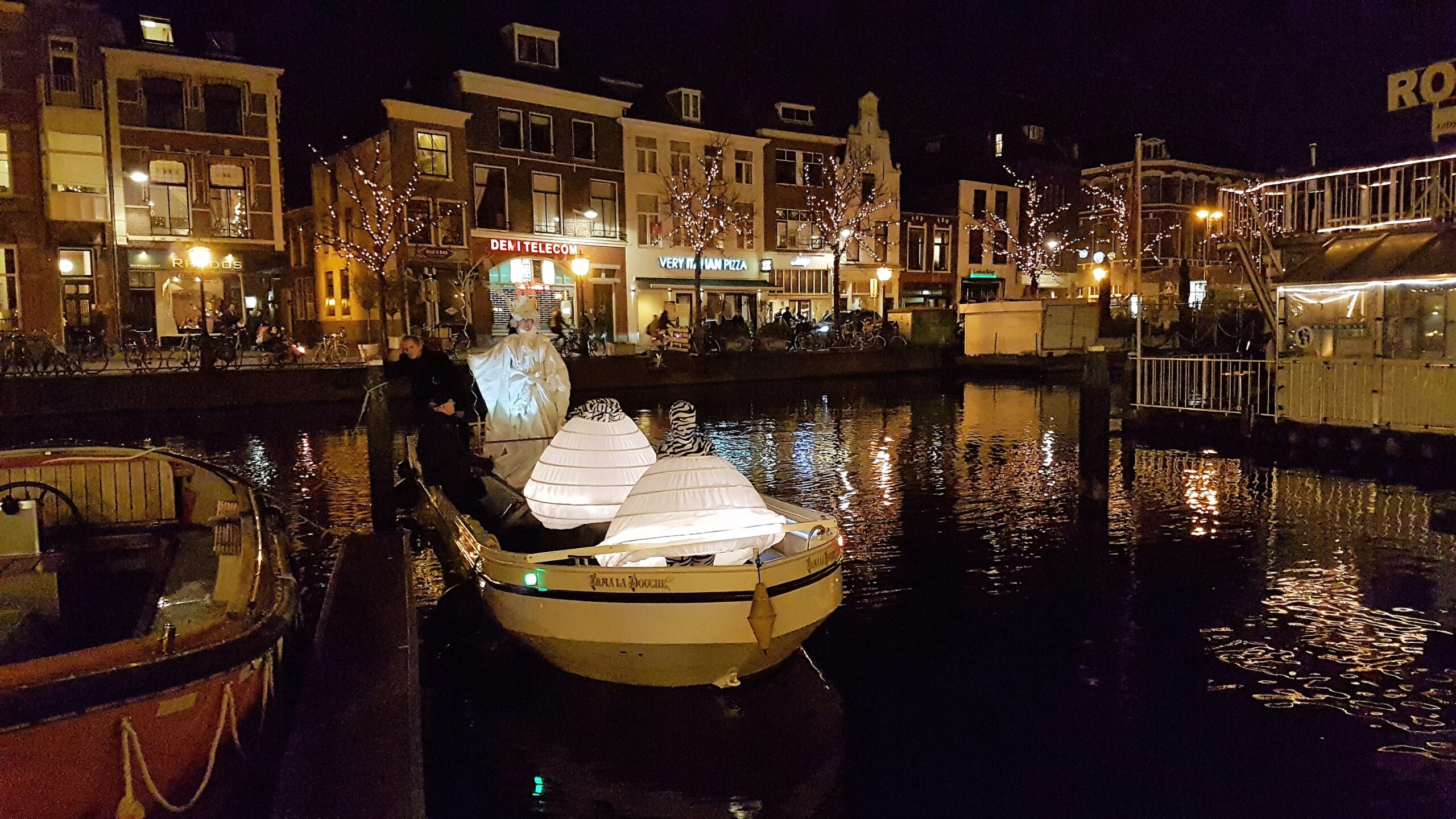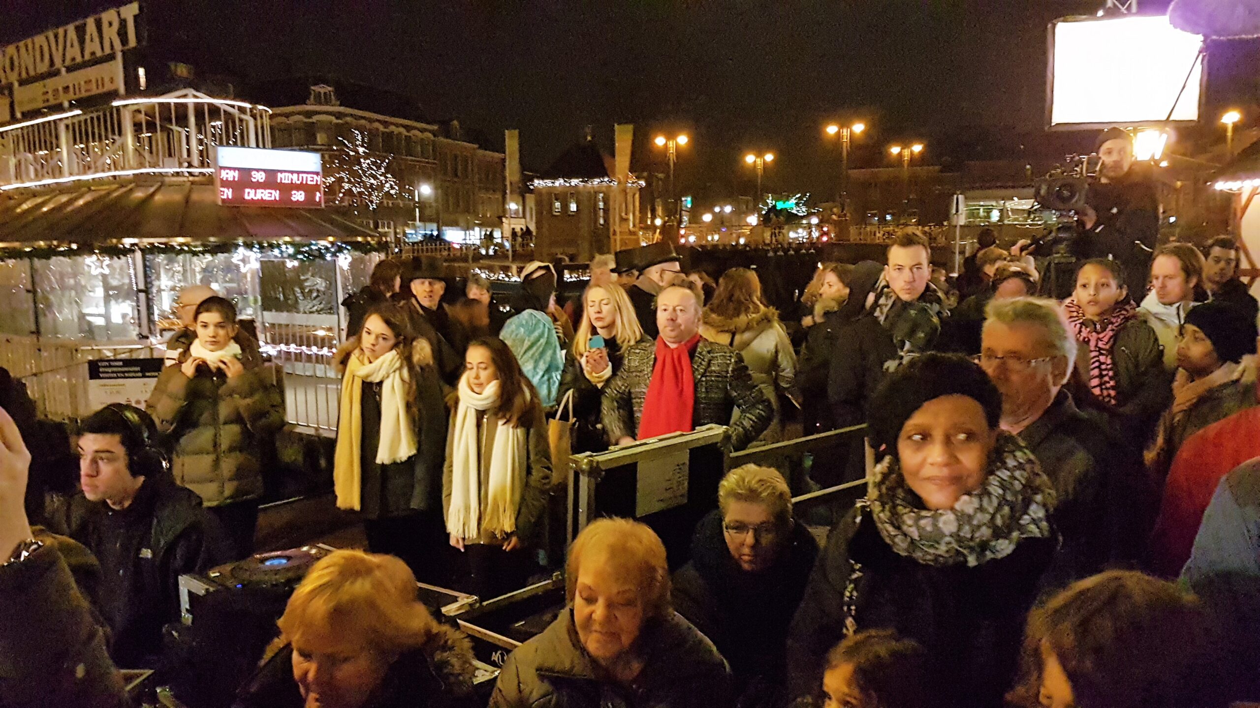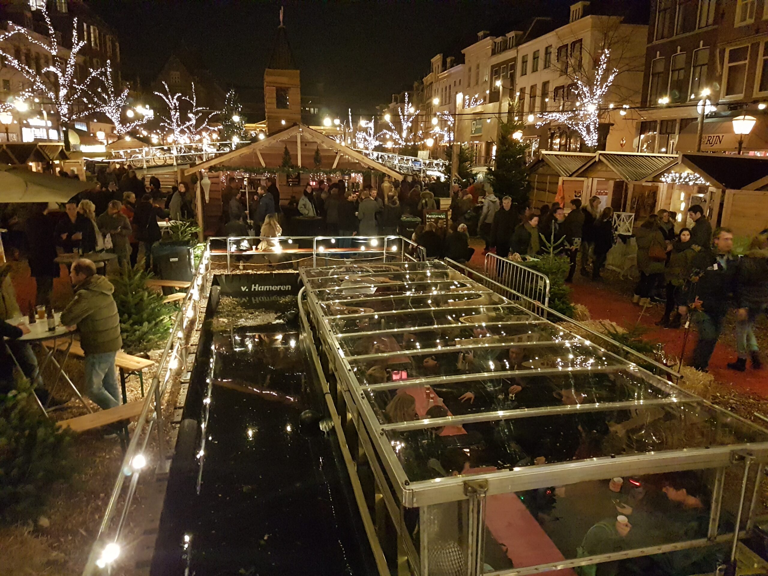 Ook het rondvaartbedrijf doet goede zaken. Om de haverklap vertrekt een volgeladen boot uit het speciale haventje dat in de kerstmarkt is gemaakt. “We liggen hier met twee schepen,” zegt Jack Geerlings van Rondvaart Leiden dat de 40 minuten durende tochtjes verzorgt. Overdag varen we met een open sloep, maar ’s avonds willen de meeste mensen toch liever in de overdekte boot.”