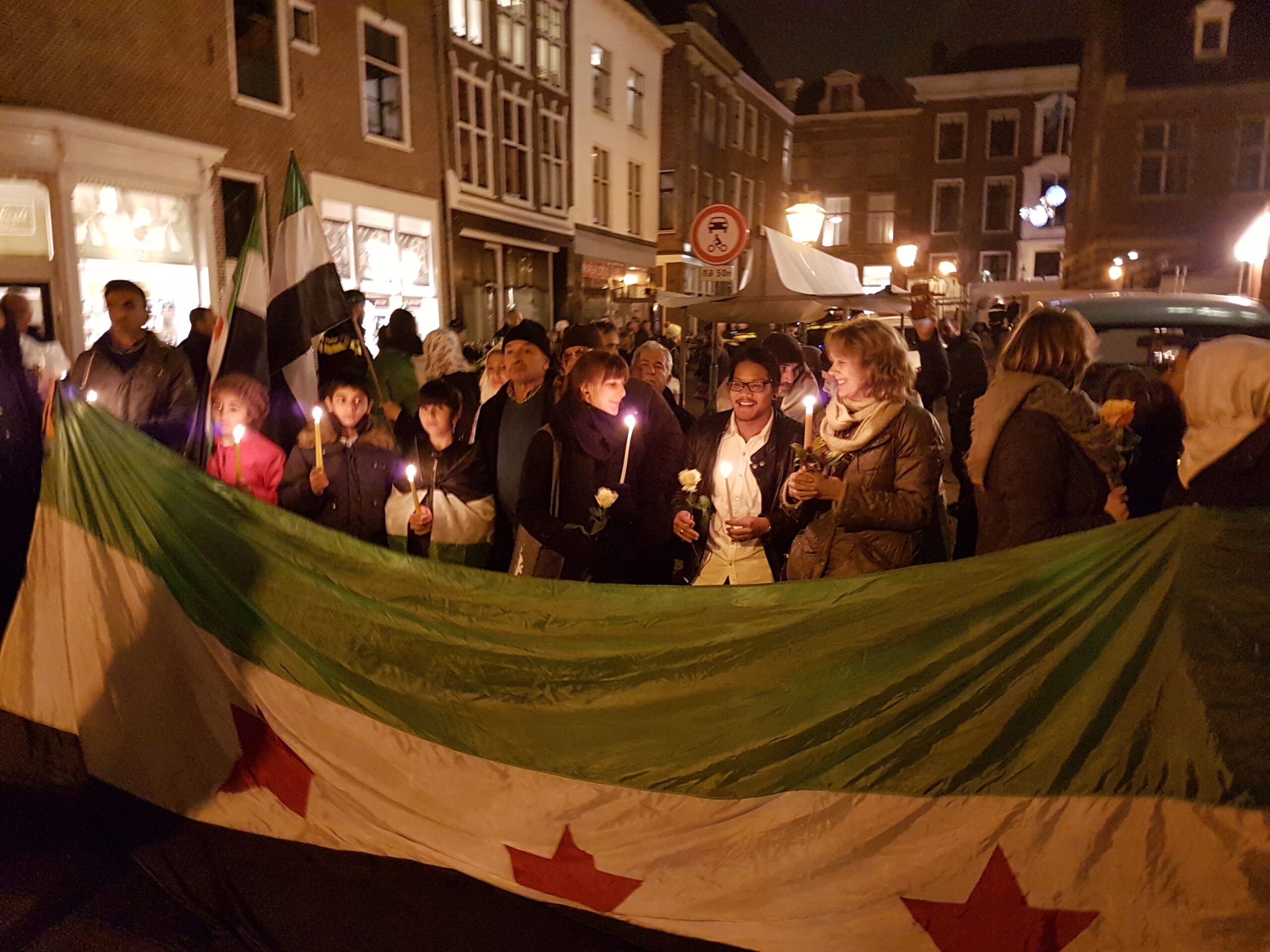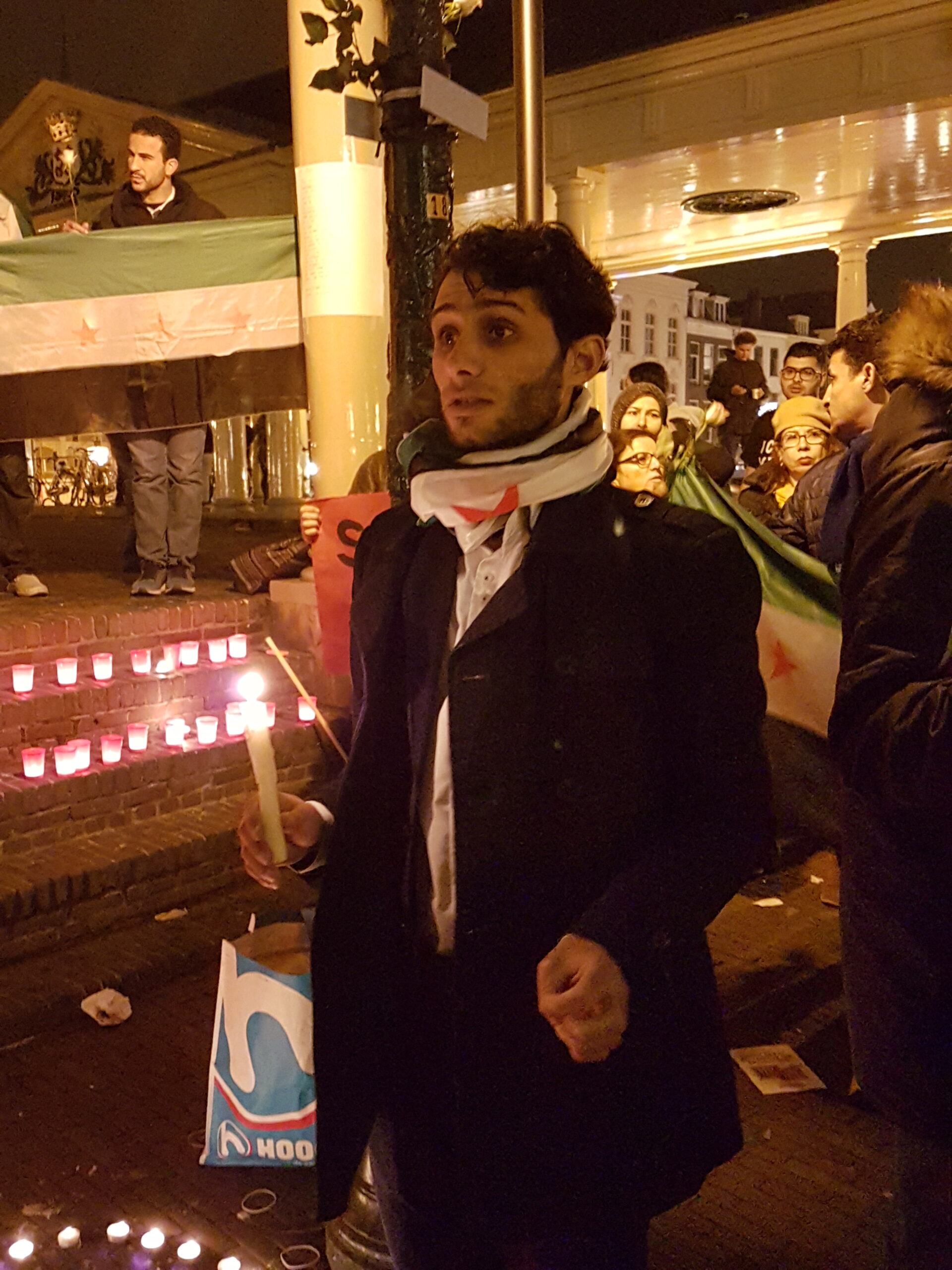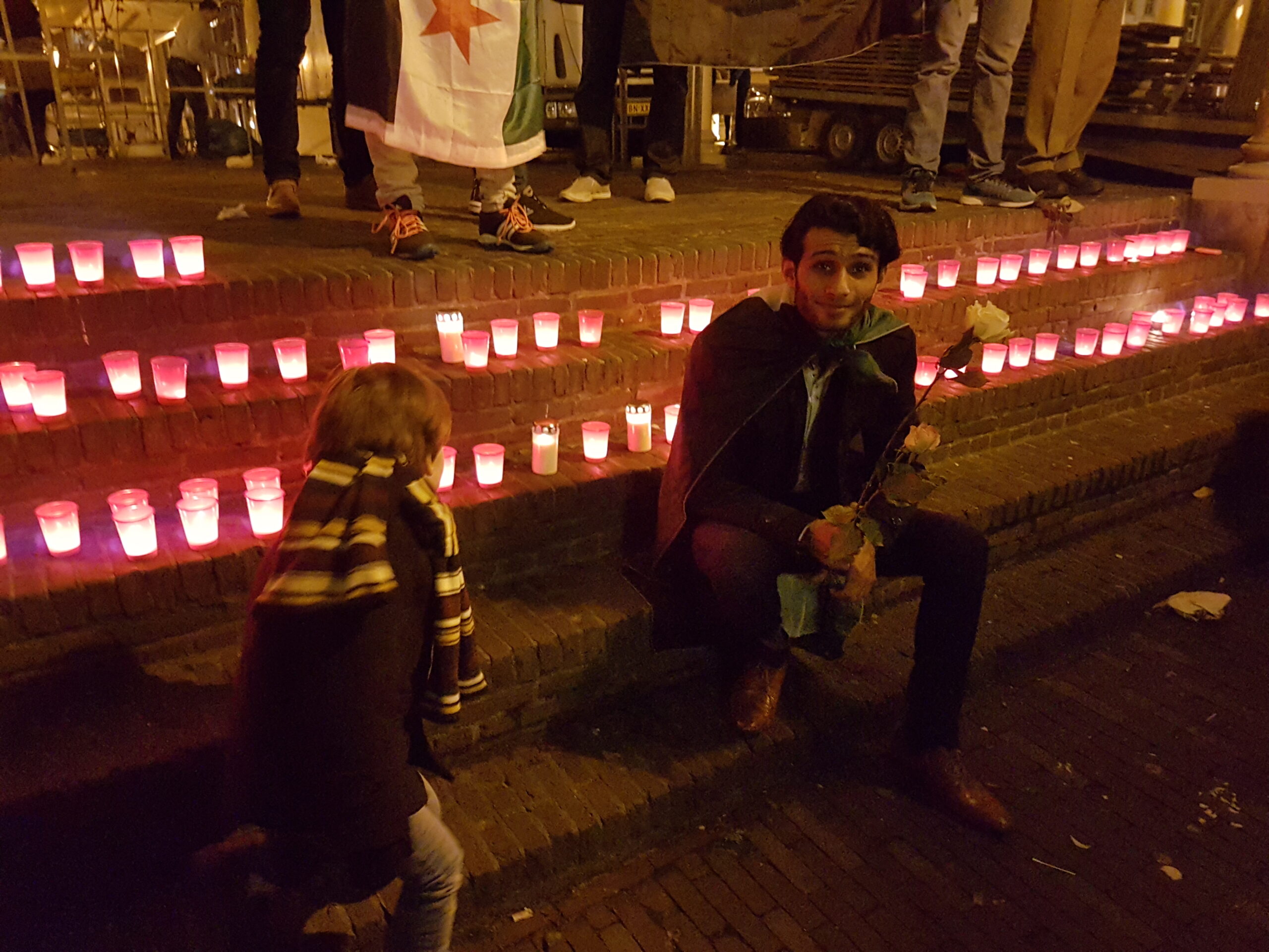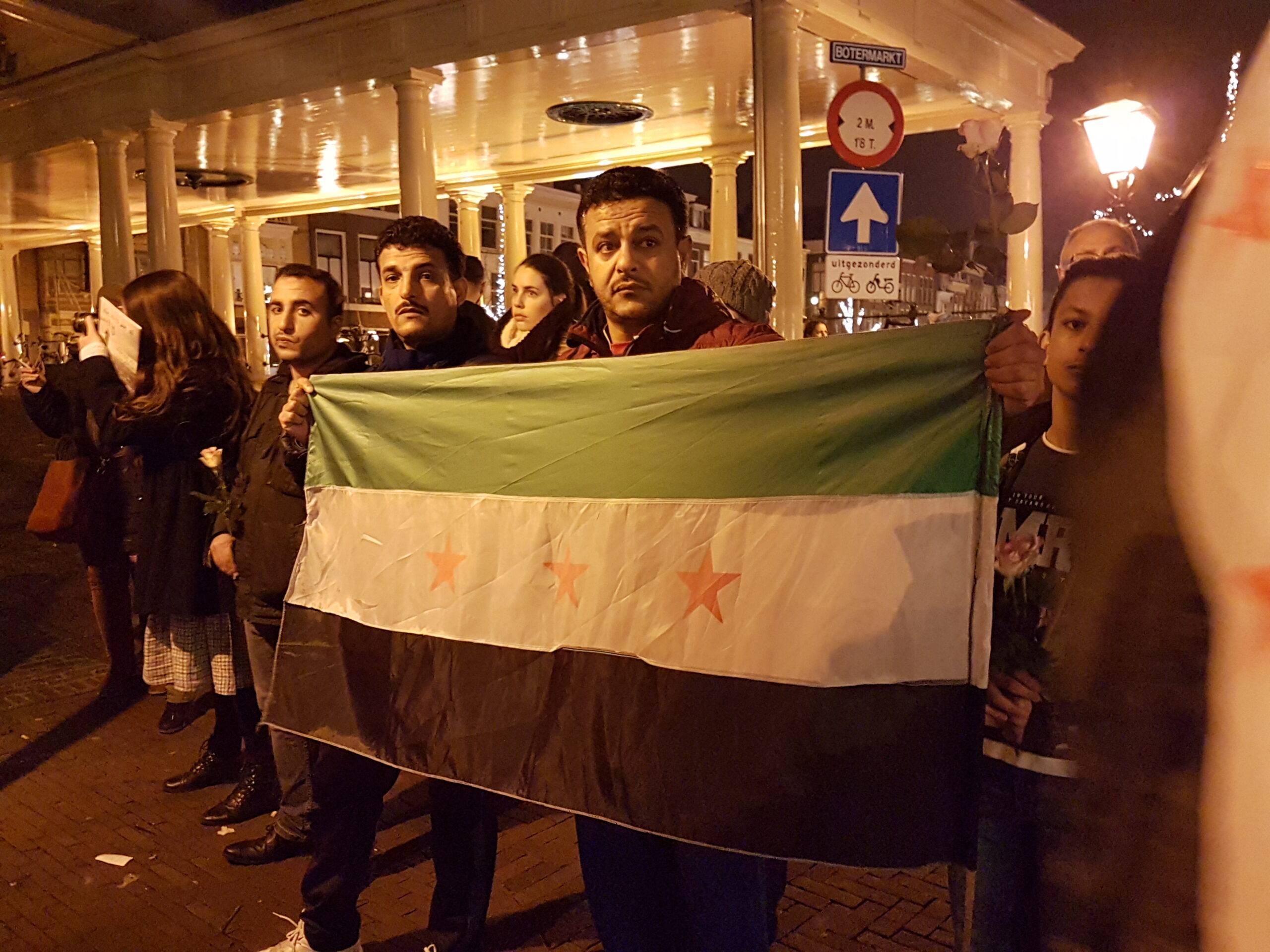 Afgelopen zaterdagavond kwamen meer dan honderd Syrische vluchtelingen uit Leiden en omgeving bij elkaar tijdens een ingetogen manifestatie rondom de Koornbeursbrug. De bijeenkomst had het karakter van een herdenking. Er werd een minuut stilte gehouden voor de slachtoffers in het door oorlog geteisterde land. Toespraken waren er niet. “Er wordt al zoveel gepraat, het helpt allemaal niets,” vertelt Amira. Ze is een van de initiatiefnemers.