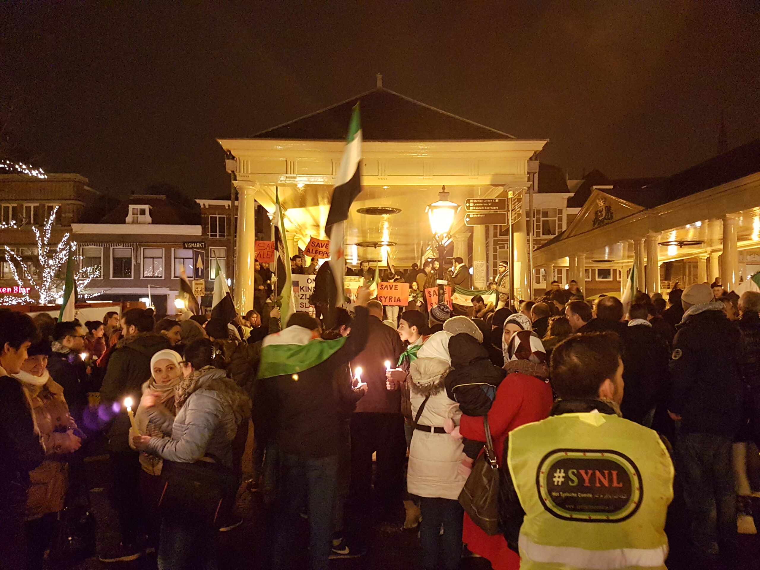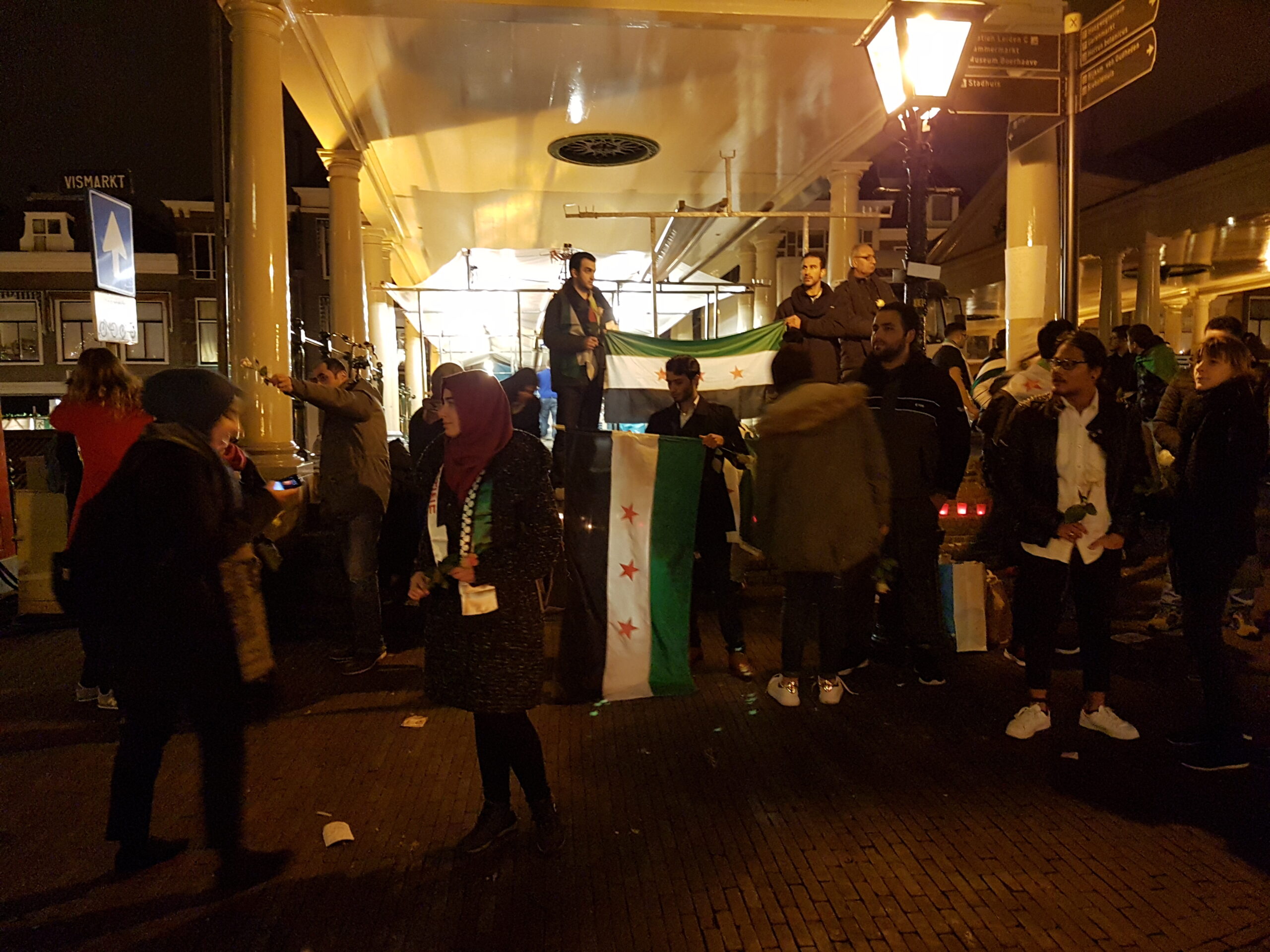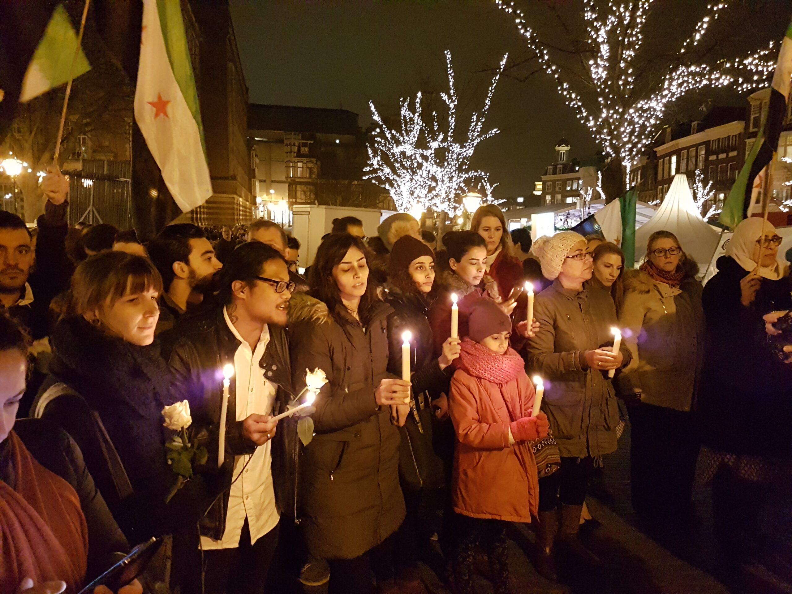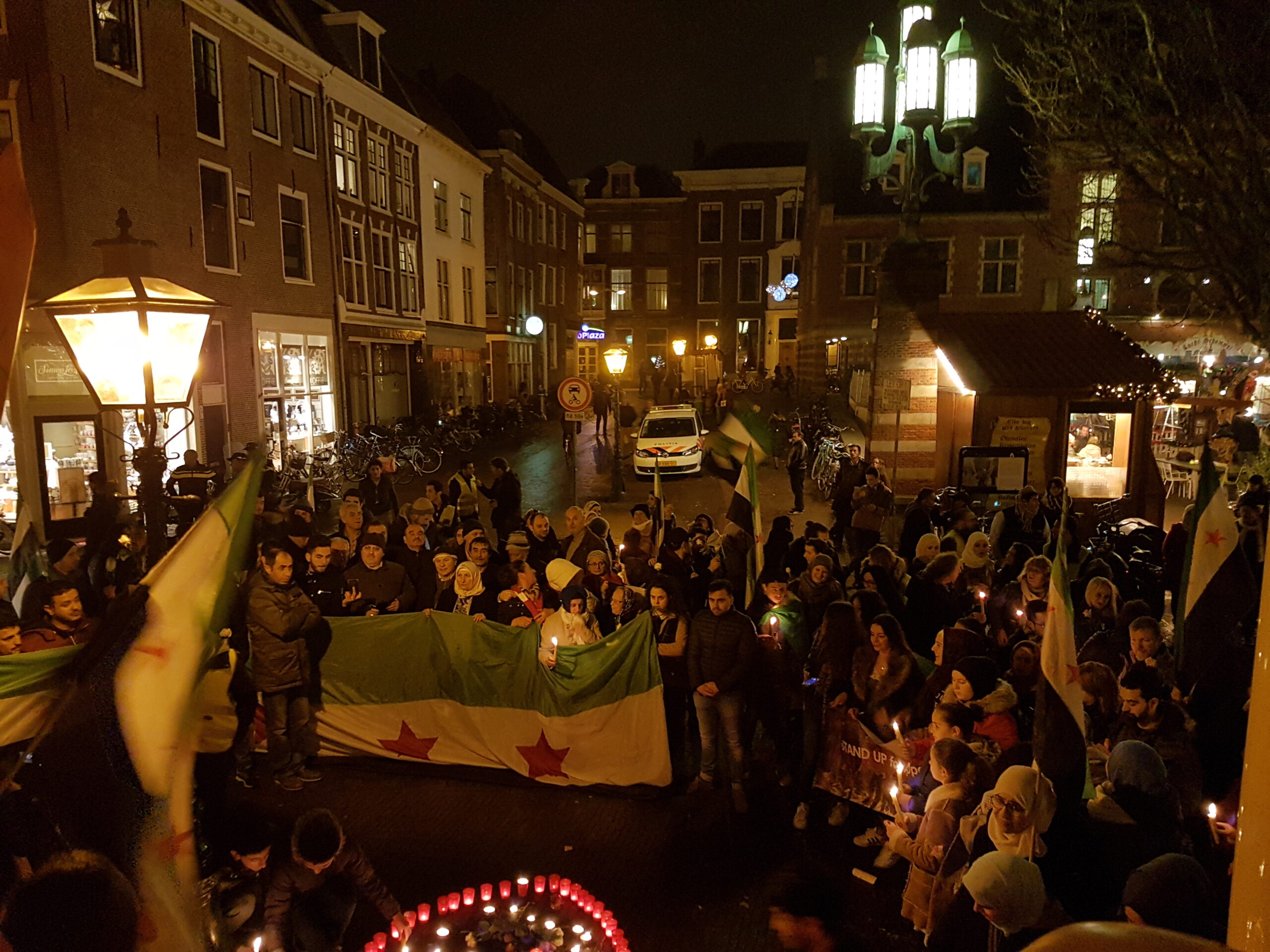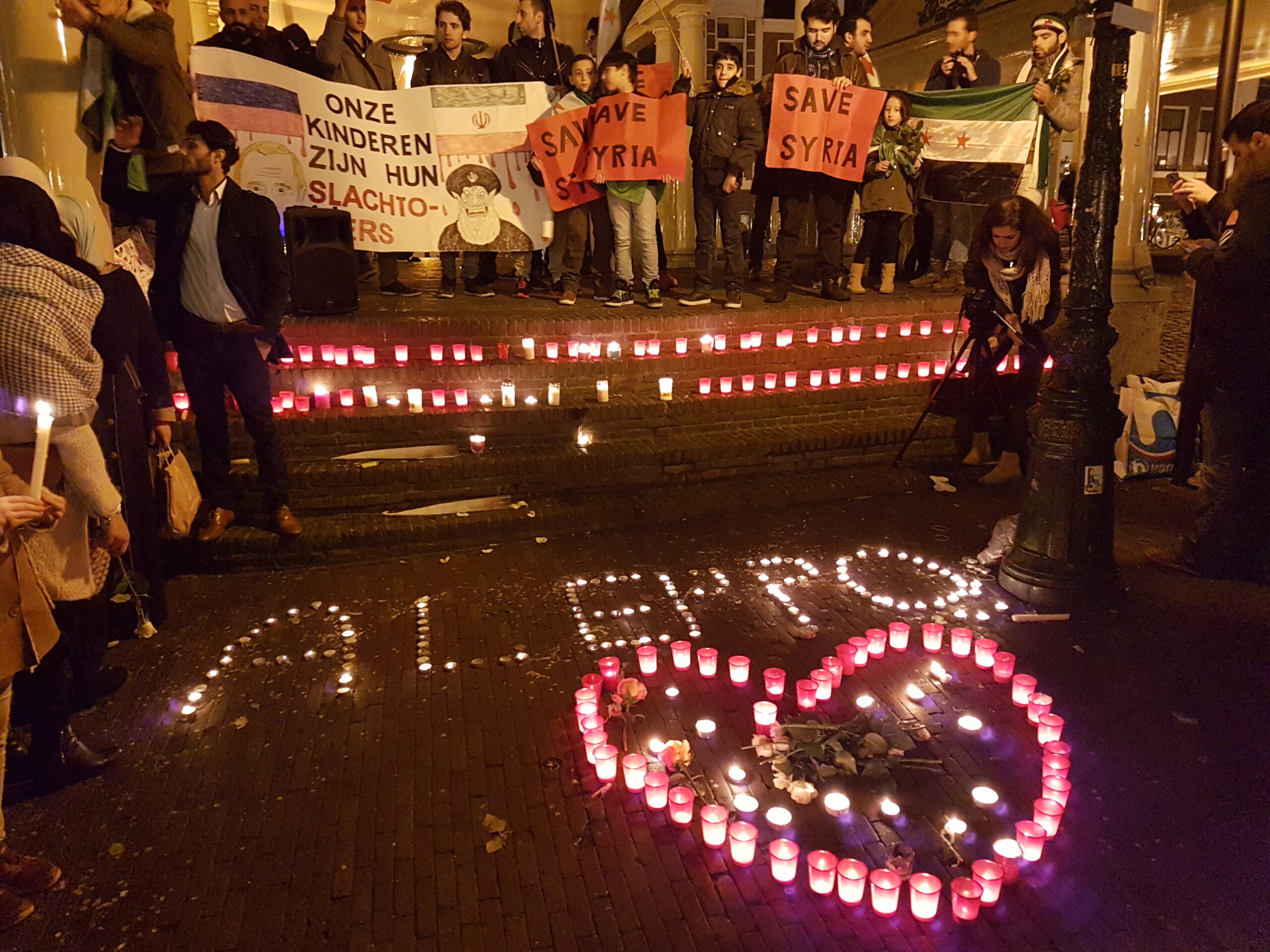 Afgelopen zaterdagavond kwamen meer dan honderd Syrische vluchtelingen uit Leiden en omgeving bij elkaar tijdens een ingetogen manifestatie rondom de Koornbeursbrug. De bijeenkomst had het karakter van een herdenking. Er werd een minuut stilte gehouden voor de slachtoffers in het door oorlog geteisterde land. Toespraken waren er niet. “Er wordt al zoveel gepraat, het helpt allemaal niets,” vertelt Amira. Ze is een van de initiatiefnemers.