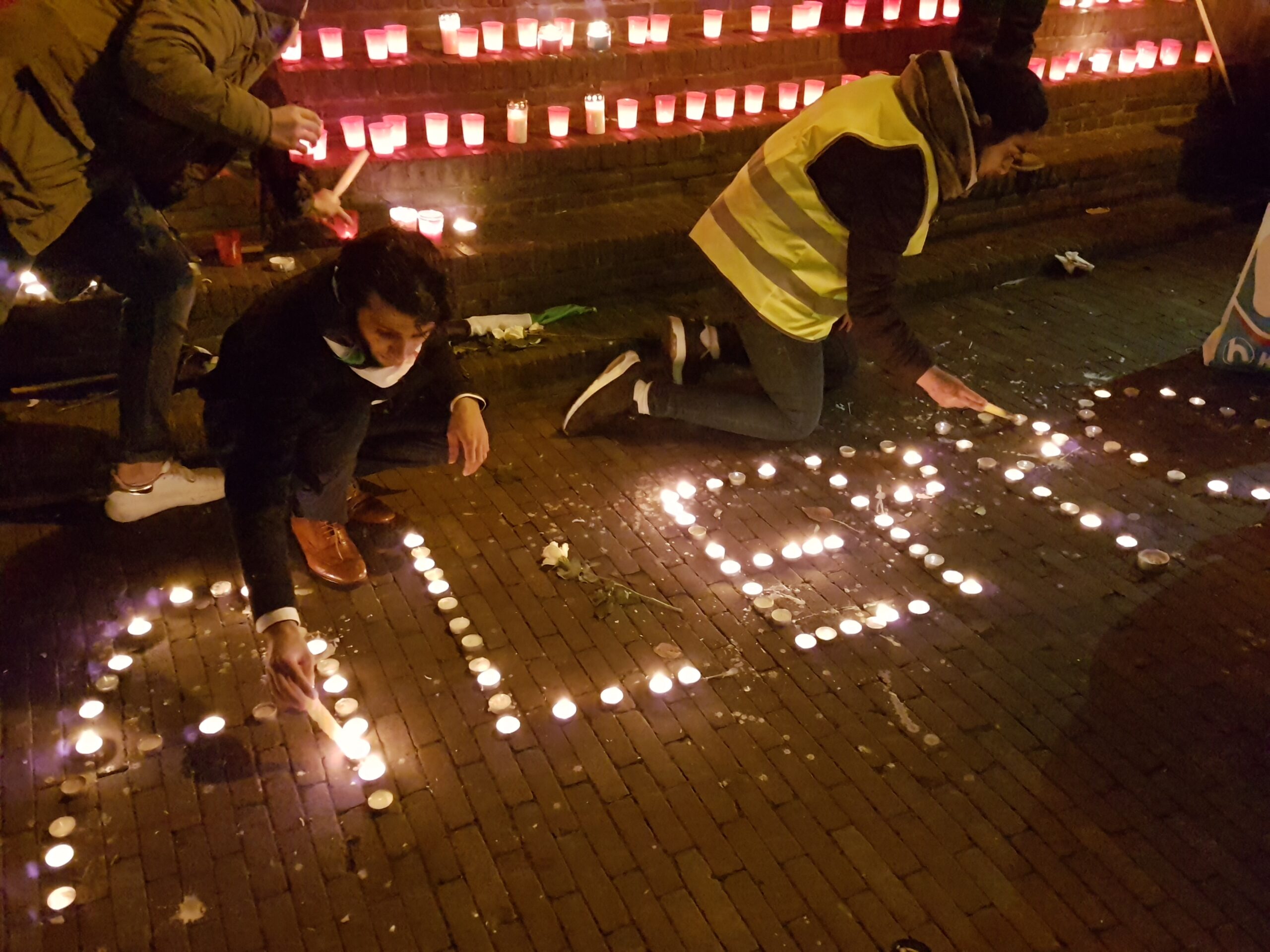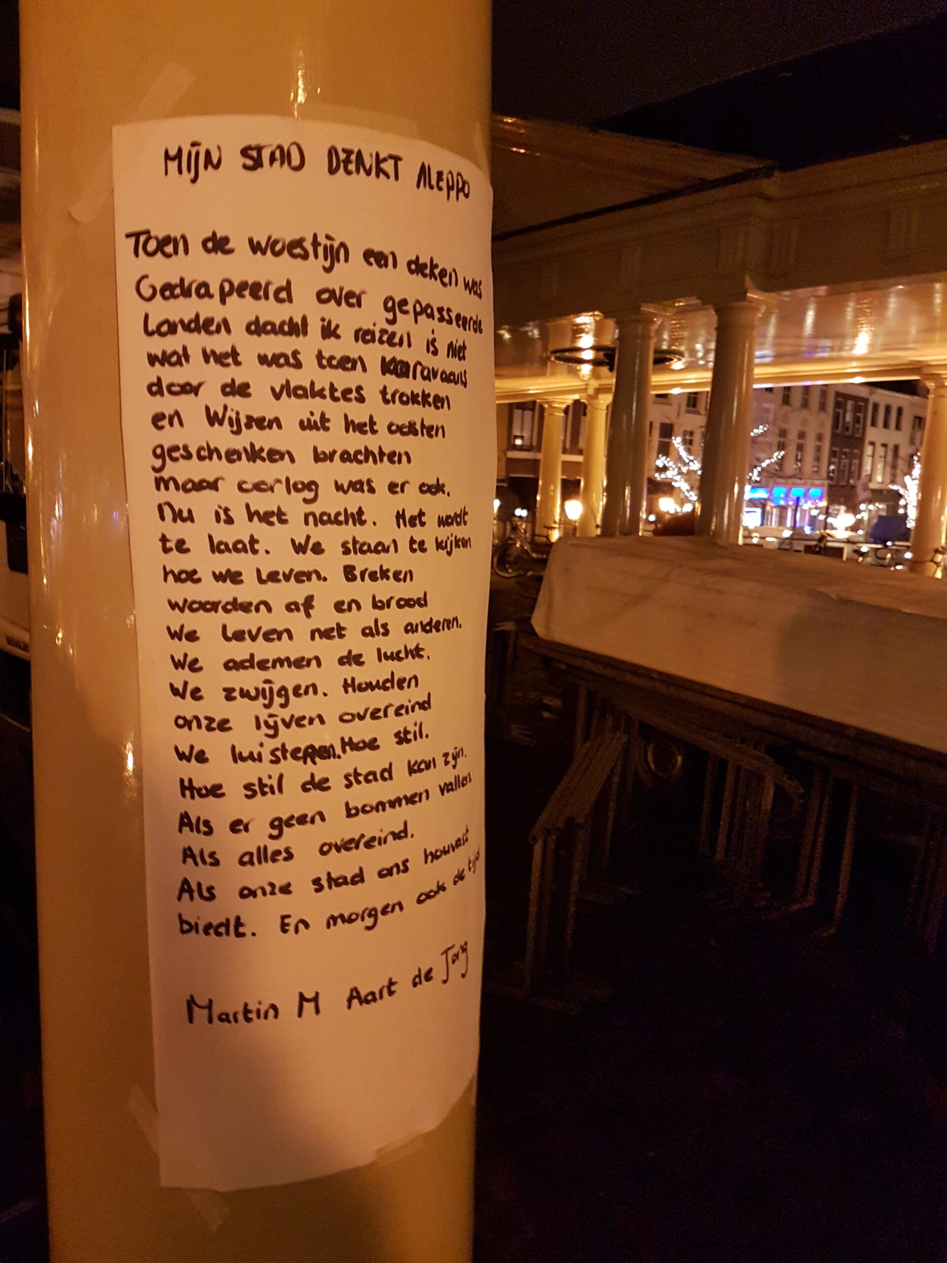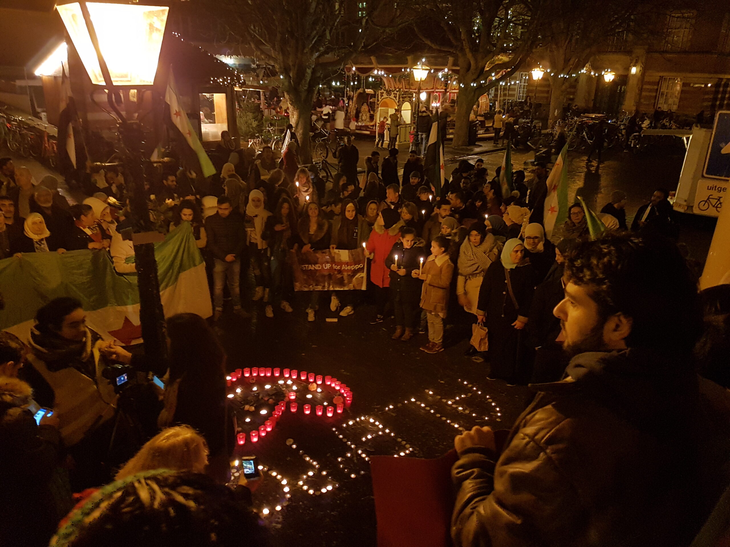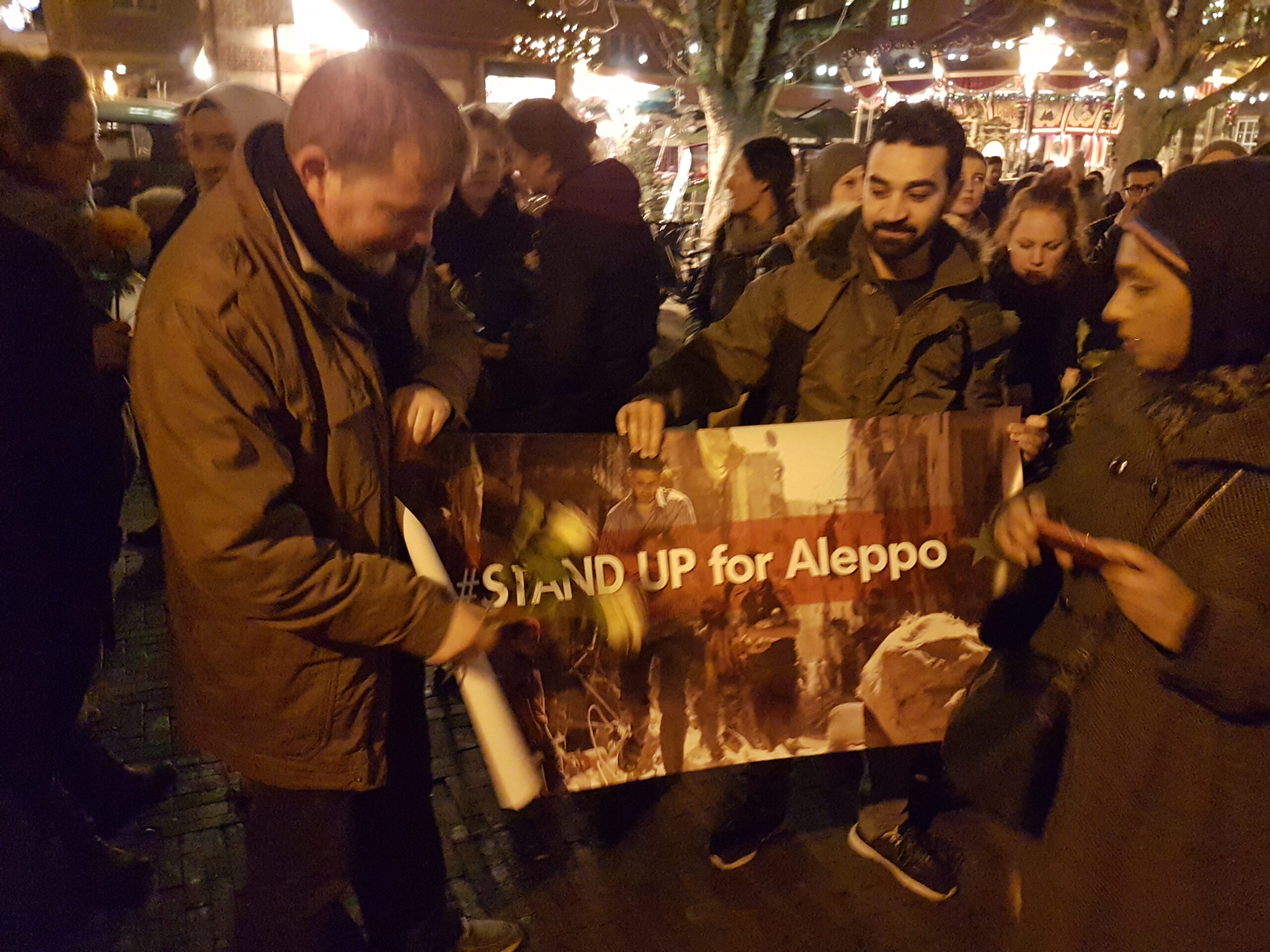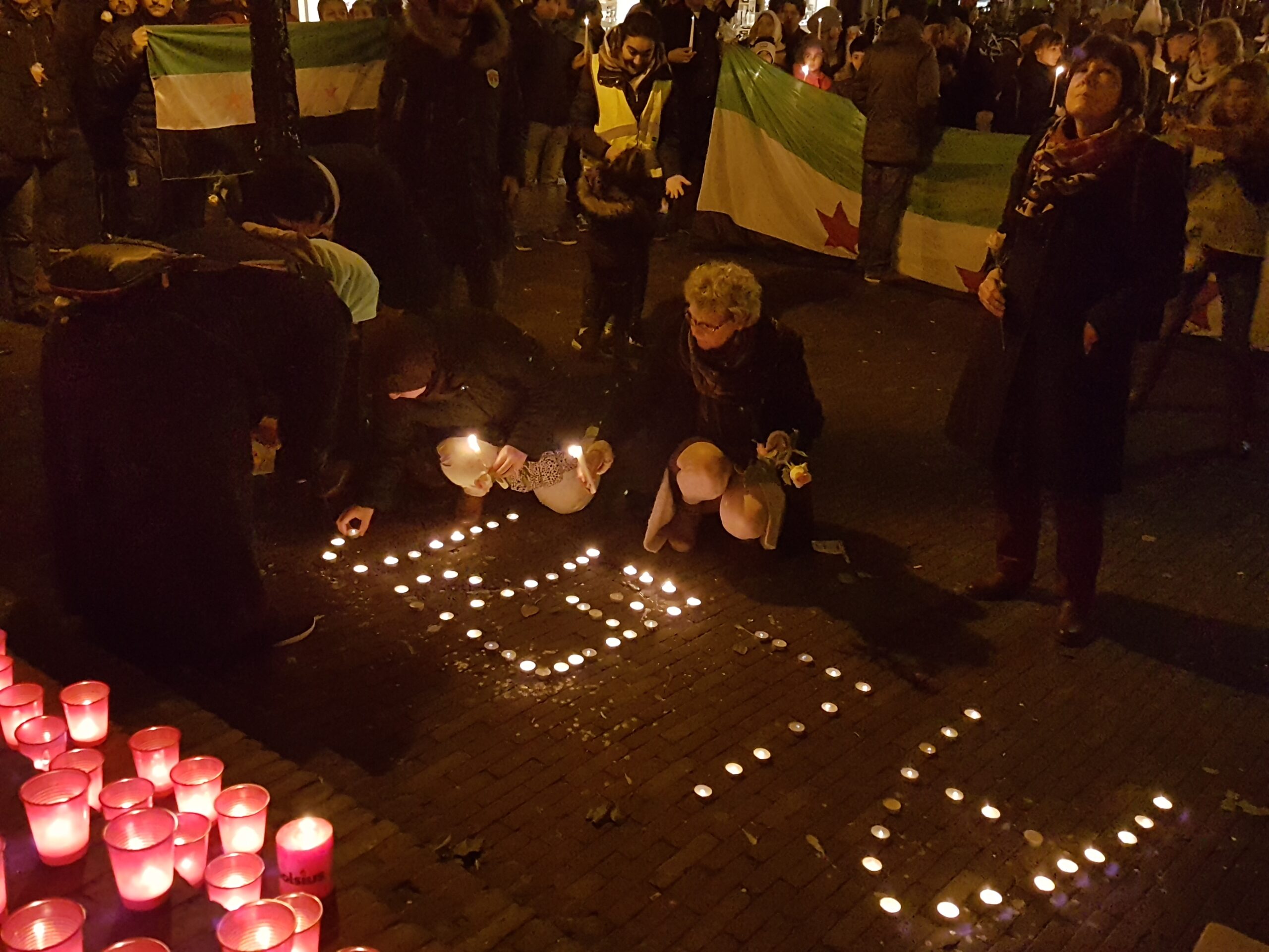 Op de trappen van de brug worden kaarsen gebrand. Op straat wordt met waxinelichtjes het woord Aleppo ‘geschreven’. Daaronder een hart van orde kaarsjes. Ook de deelnemers aan de bijeenkomst dragen kaarsen bij zich. En bloemen. Die delen ze uit.