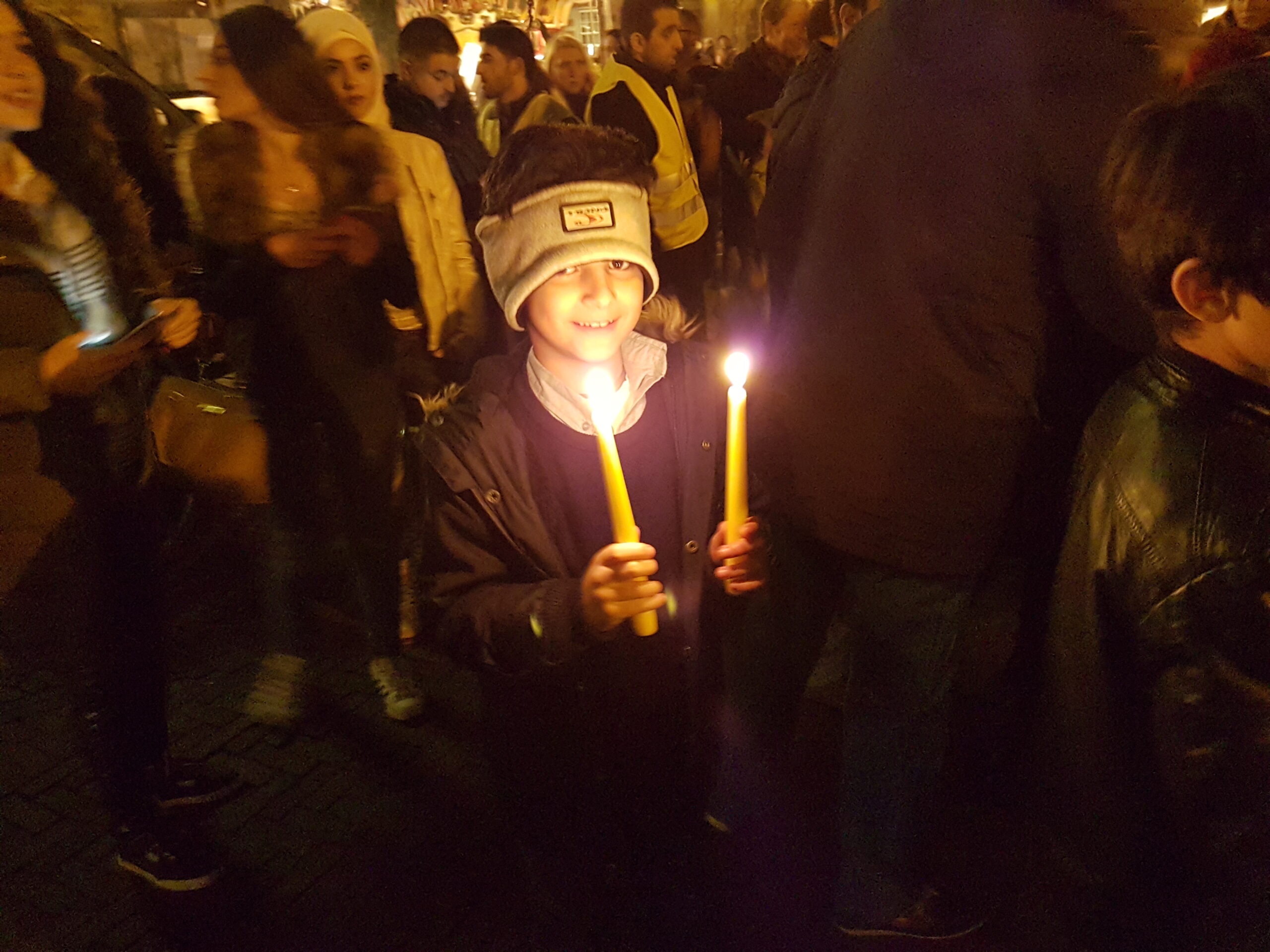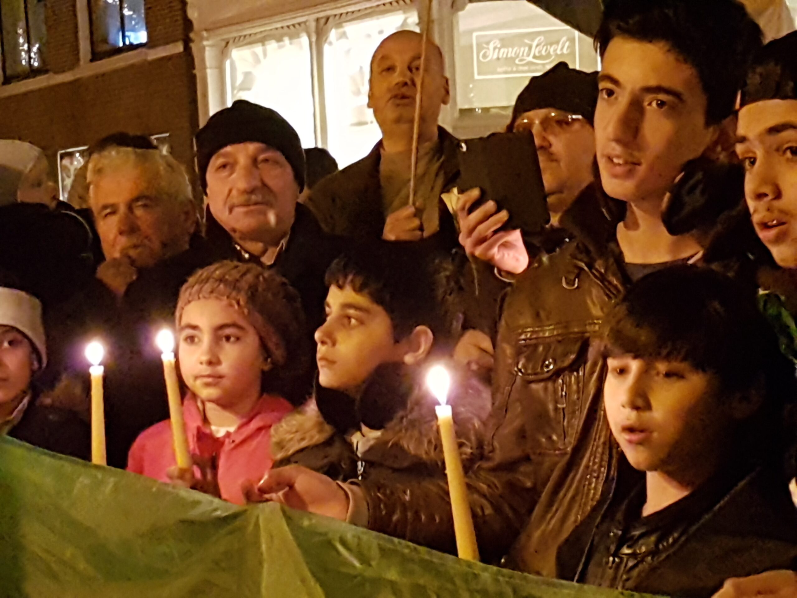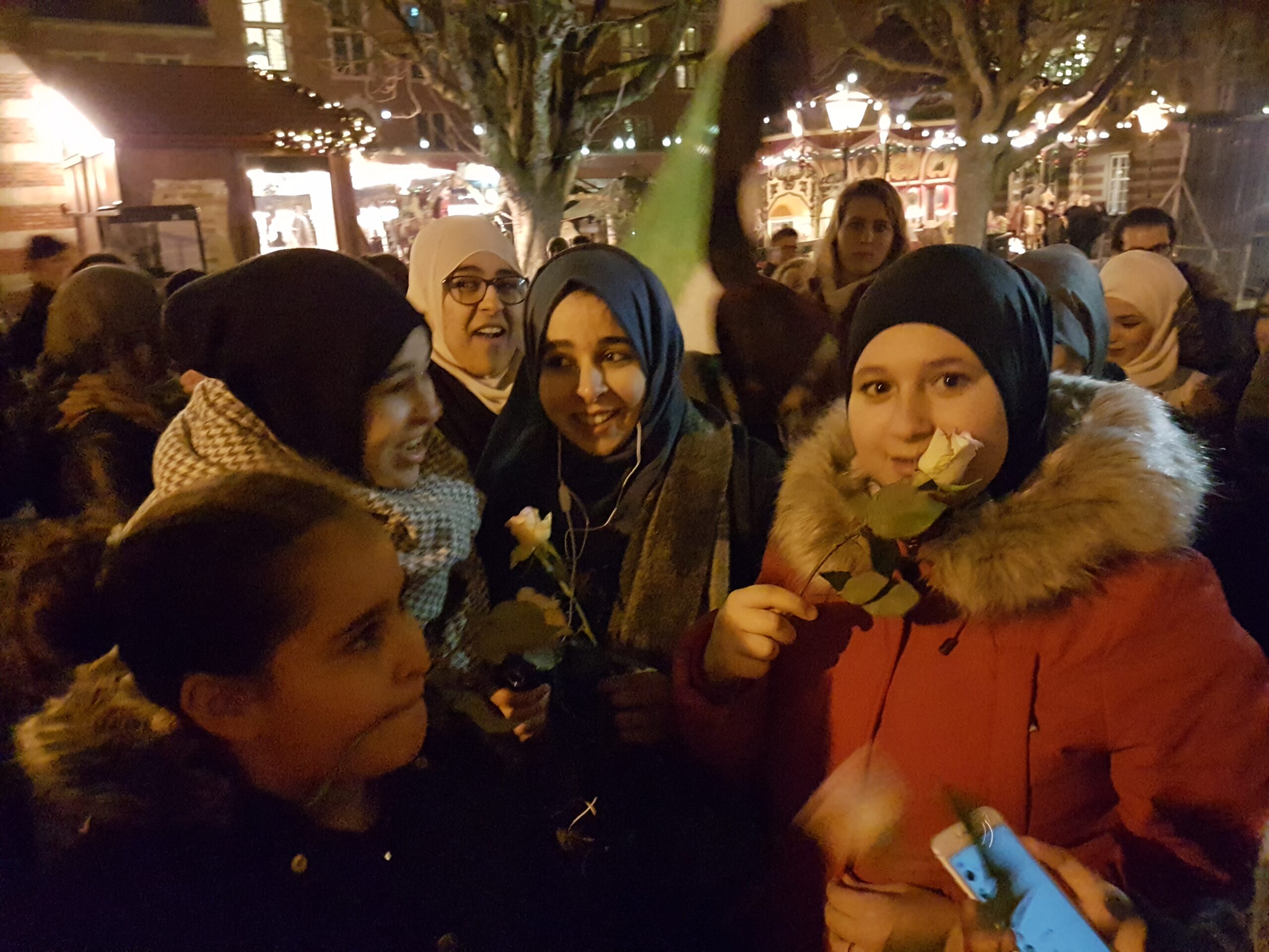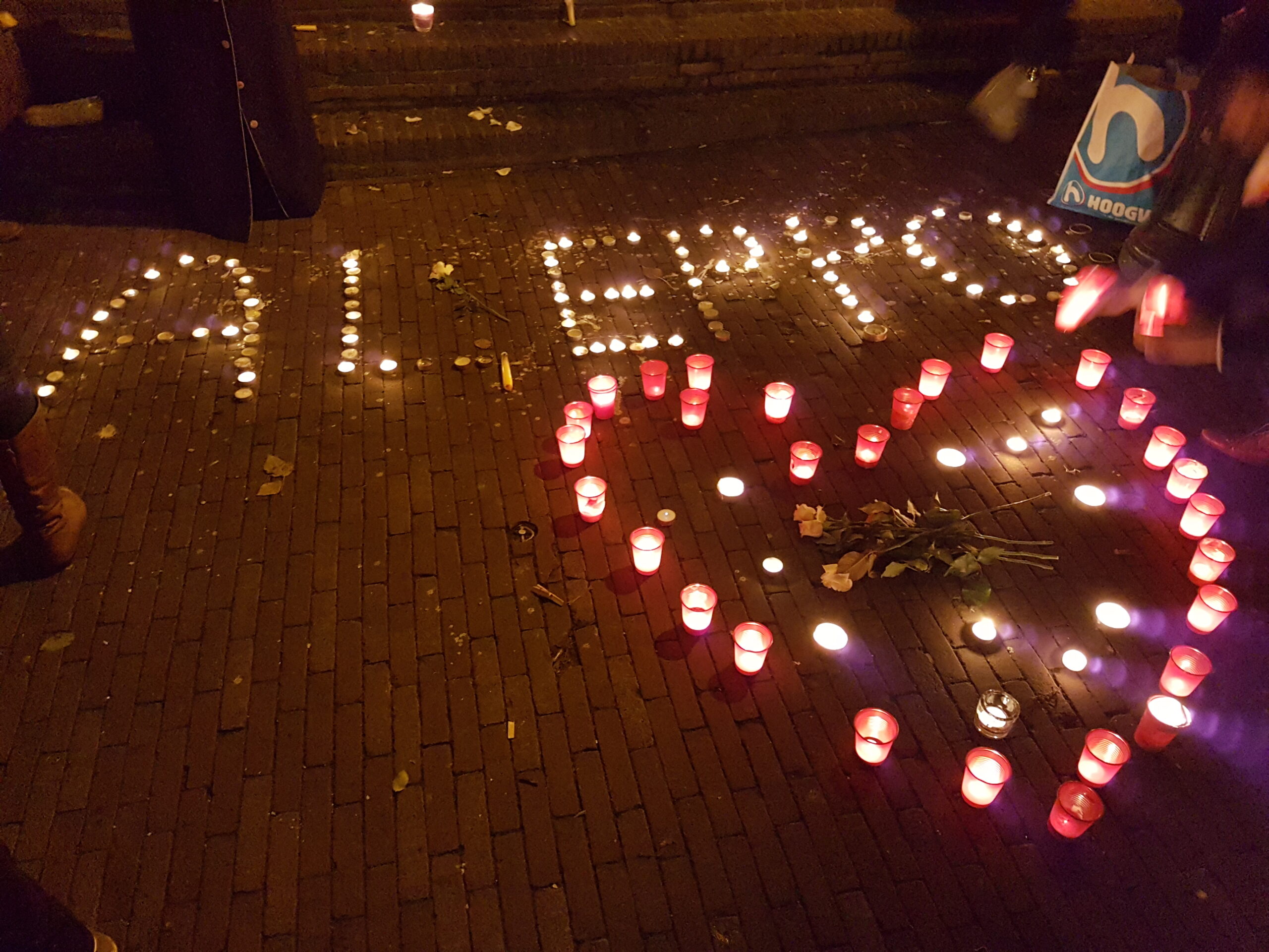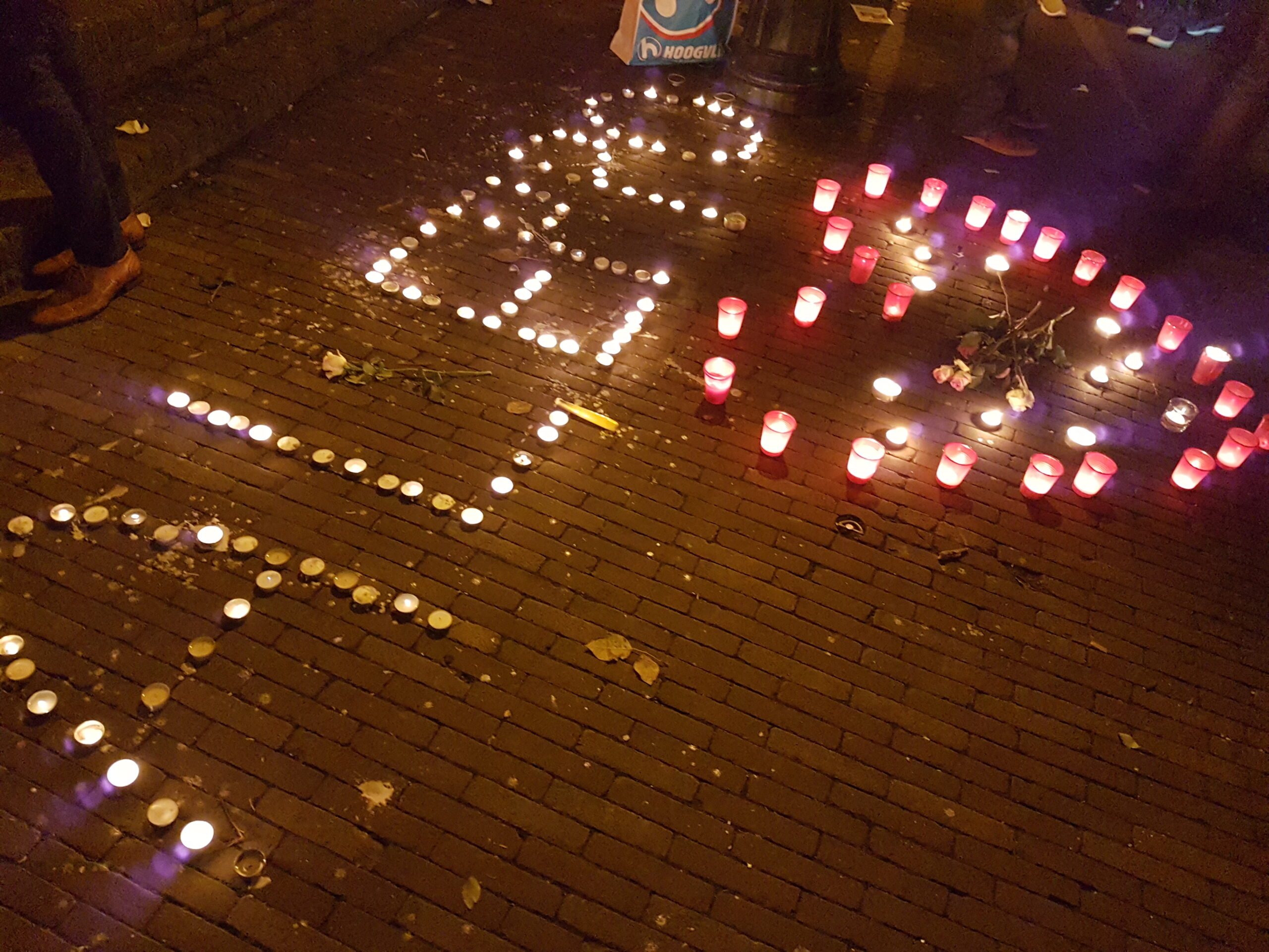 Op de trappen van de brug worden kaarsen gebrand. Op straat wordt met waxinelichtjes het woord Aleppo ‘geschreven’. Daaronder een hart van orde kaarsjes. Ook de deelnemers aan de bijeenkomst dragen kaarsen bij zich. En bloemen. Die delen ze uit.