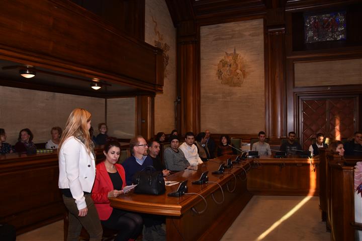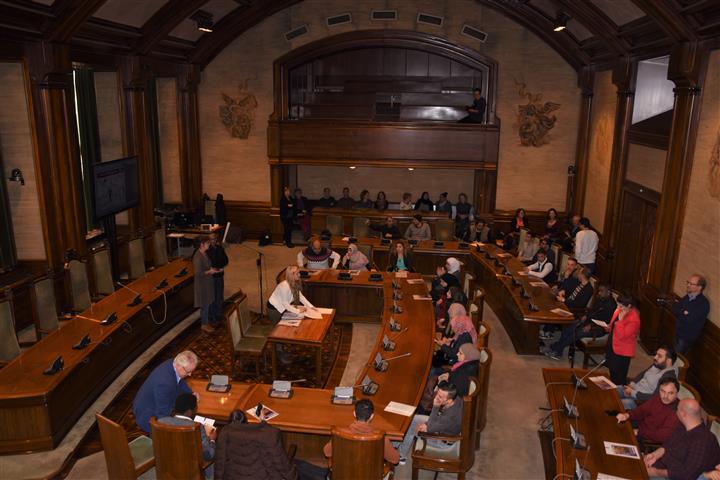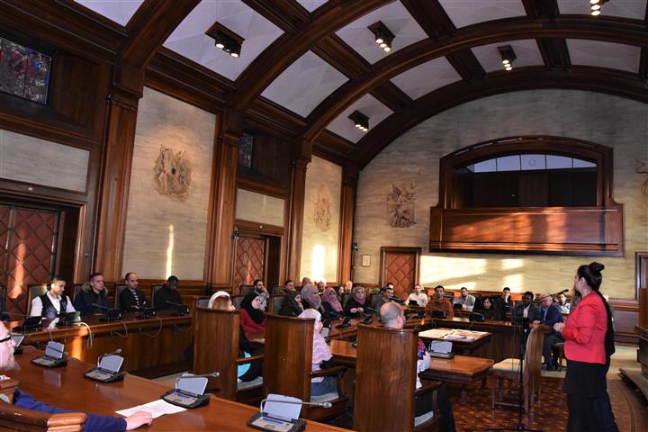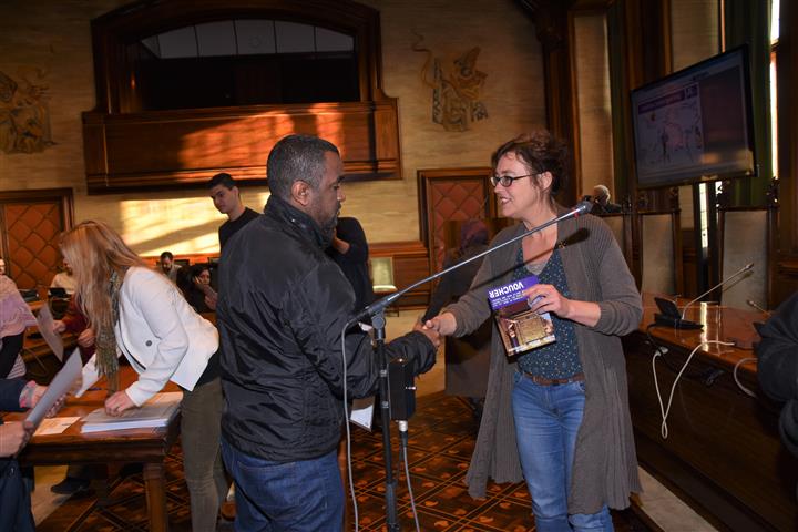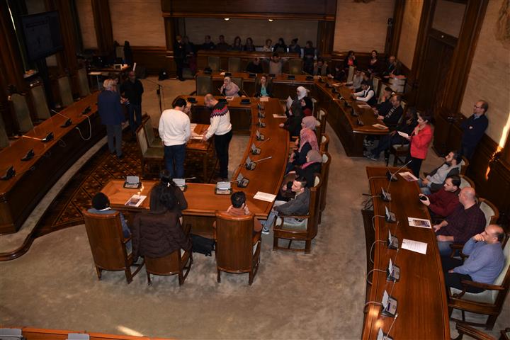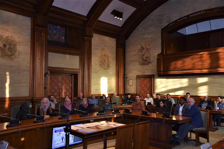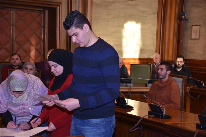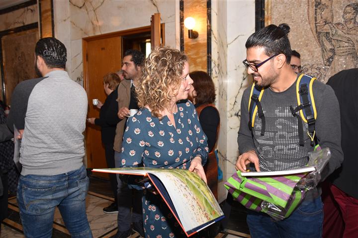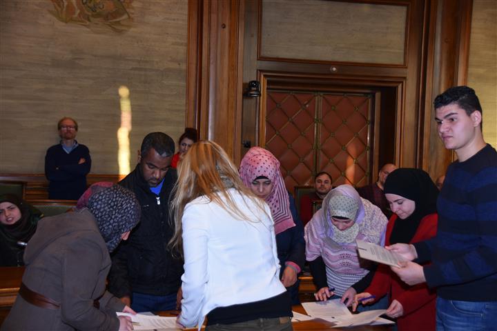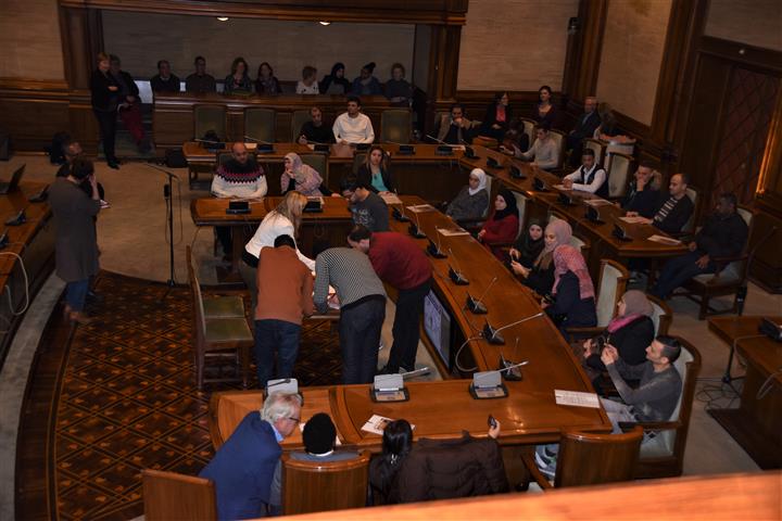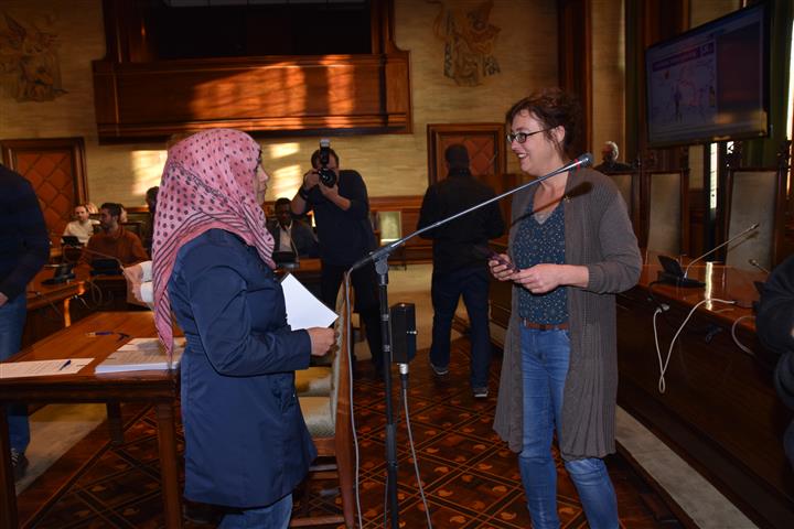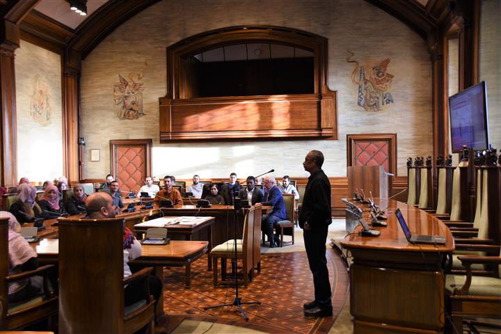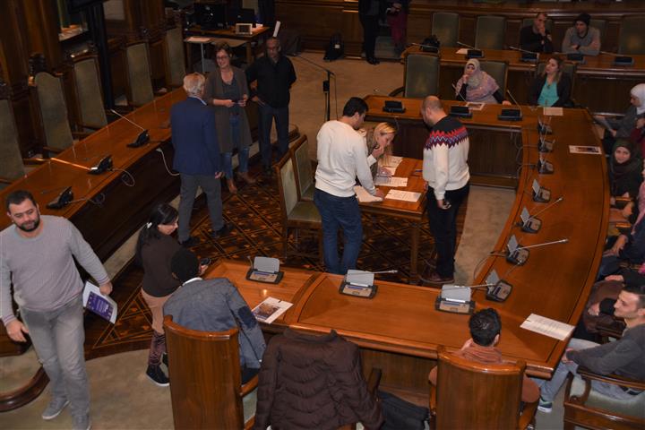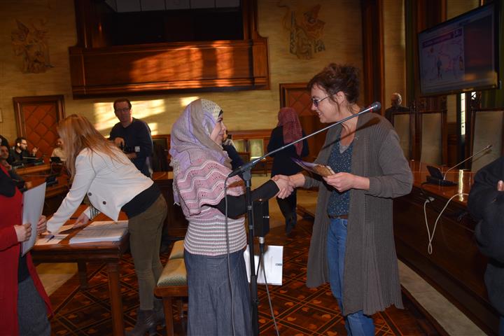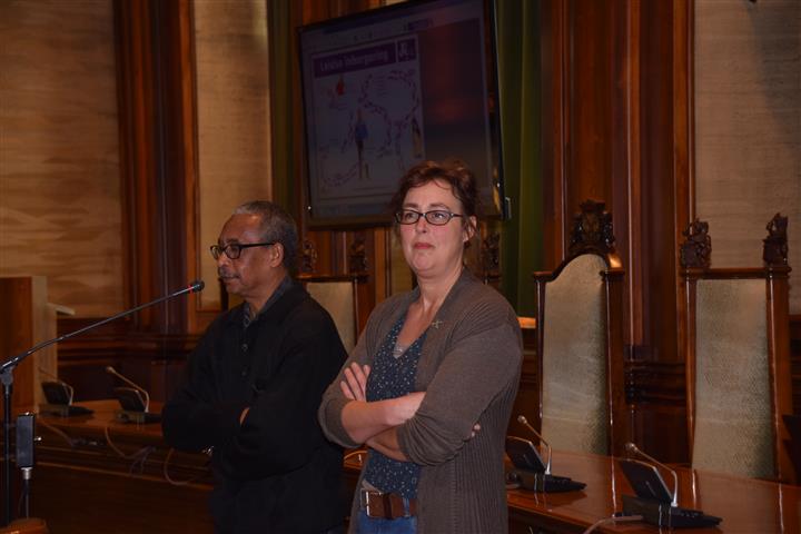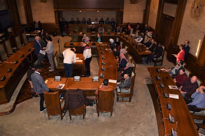 De groep mensen die zich om 10.00 uur in de hal van het stadhuis verzamelt, bestaat grotendeels uit (Syrische) vluchtelingen en hun (vrijwillige) mentoren. Historicus Jos Hooghuis zet daar een en ander uiteen over het gebouw. Maar in tegenstelling tot afgelopen juli eindigt hij zijn verhaal in de raadszaal van het stadhuis. Daar wordt het verhaal verteld dat Leidenaren goed kennen; dat van het Spaanse beleg, Leidens Ontzet “het enige jaartal dat ik noemde, want iedere Leidenaar moet dát kennen”, en de komst van (geloofs)vluchtelingen en de instelling van de universiteit. Leiden als “bolwerk van vrijheid”, zoals de universiteit zich omschrijft.