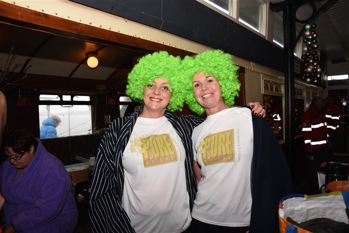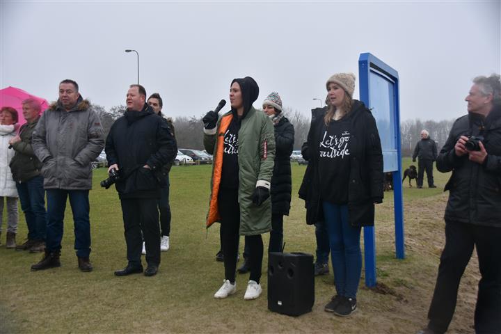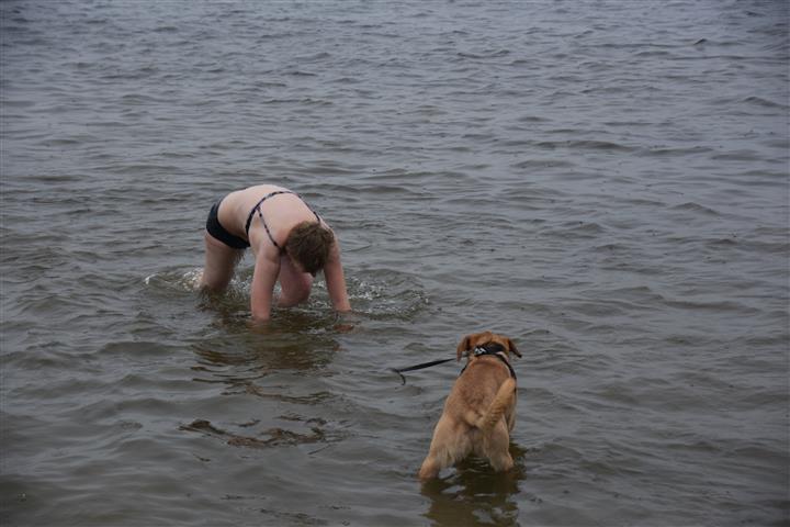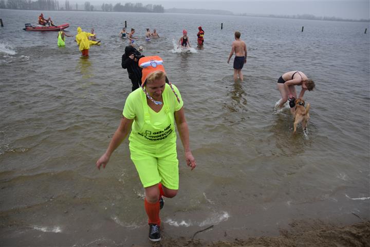 De nieuwjaarsduik van kattenverzorgster Marlies Knoppert en asielhonden Kanella en Filo van Dierentehuis Stevenshage.