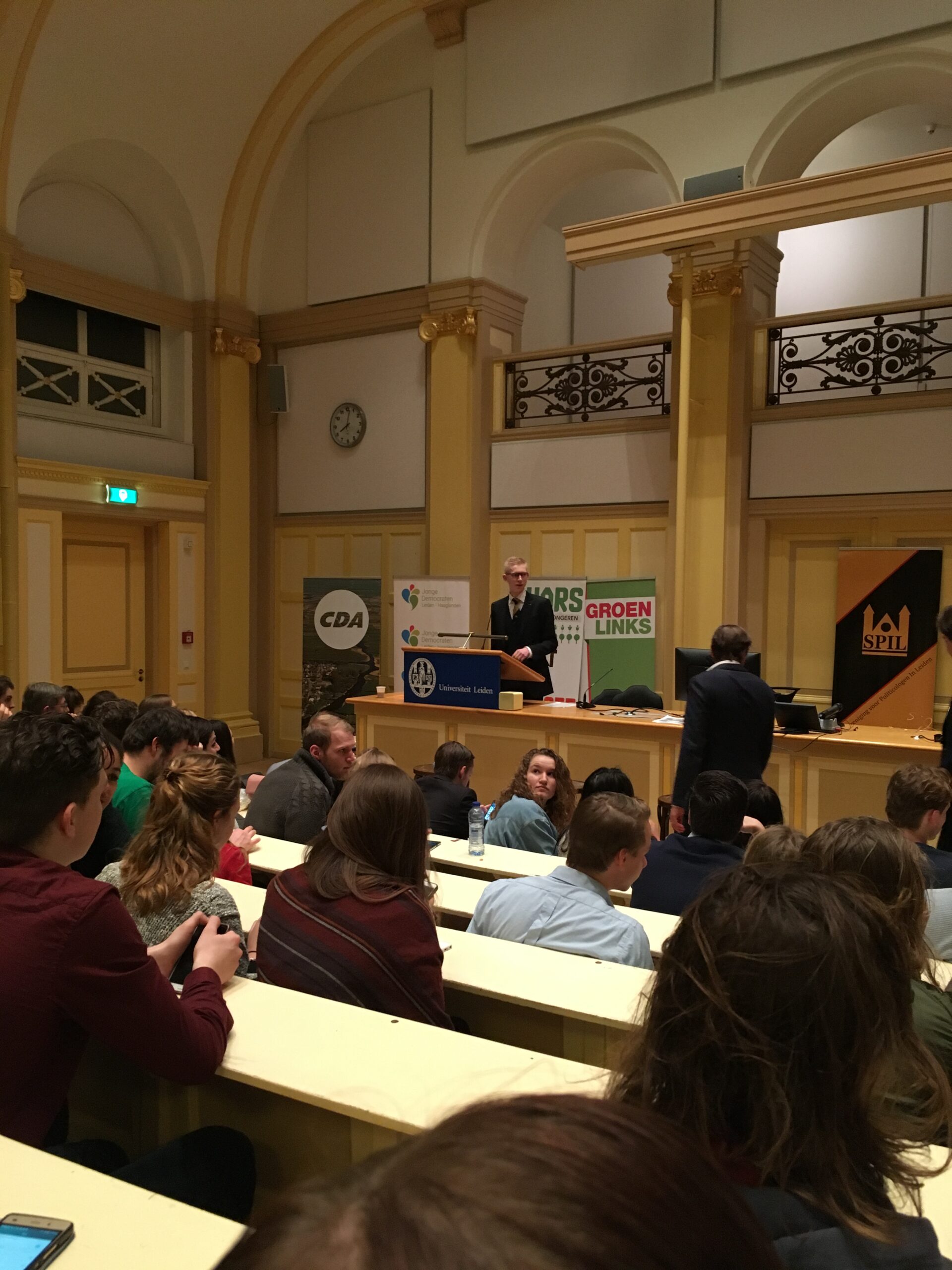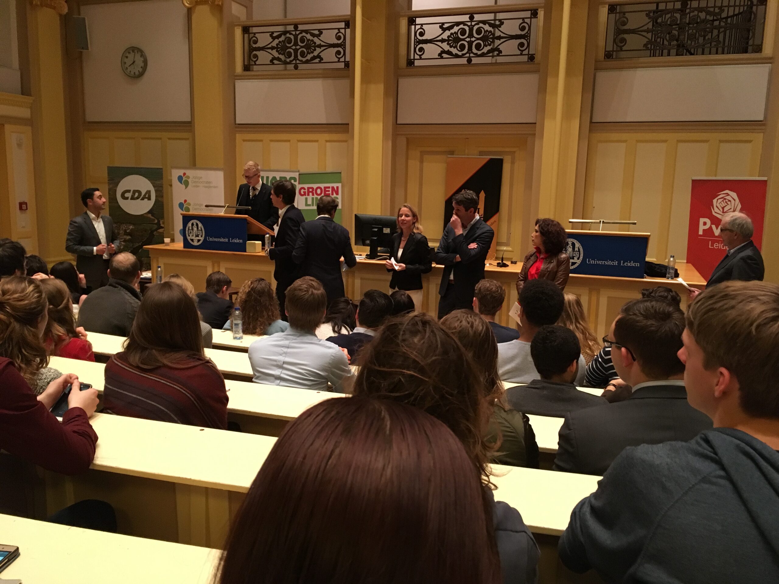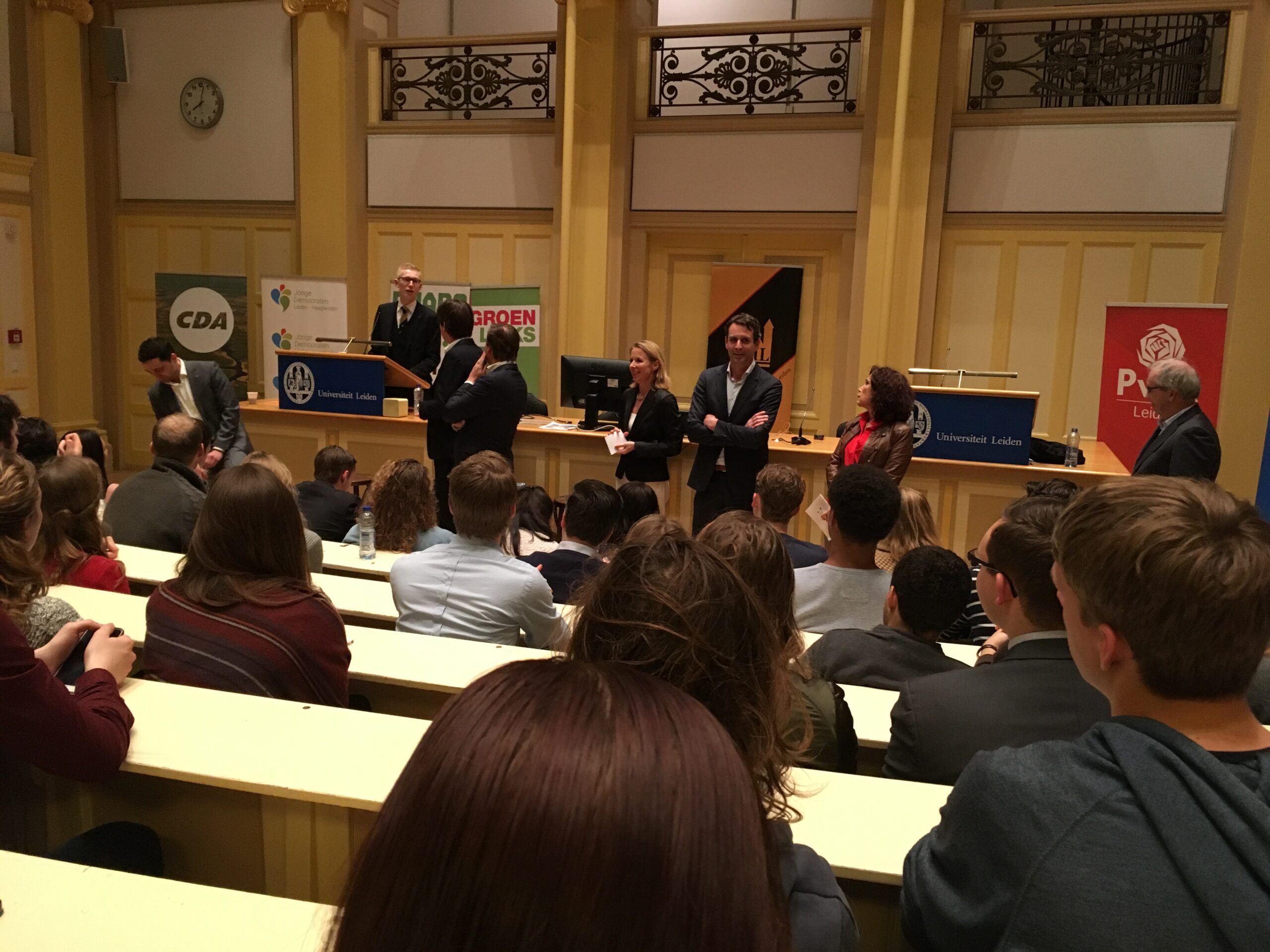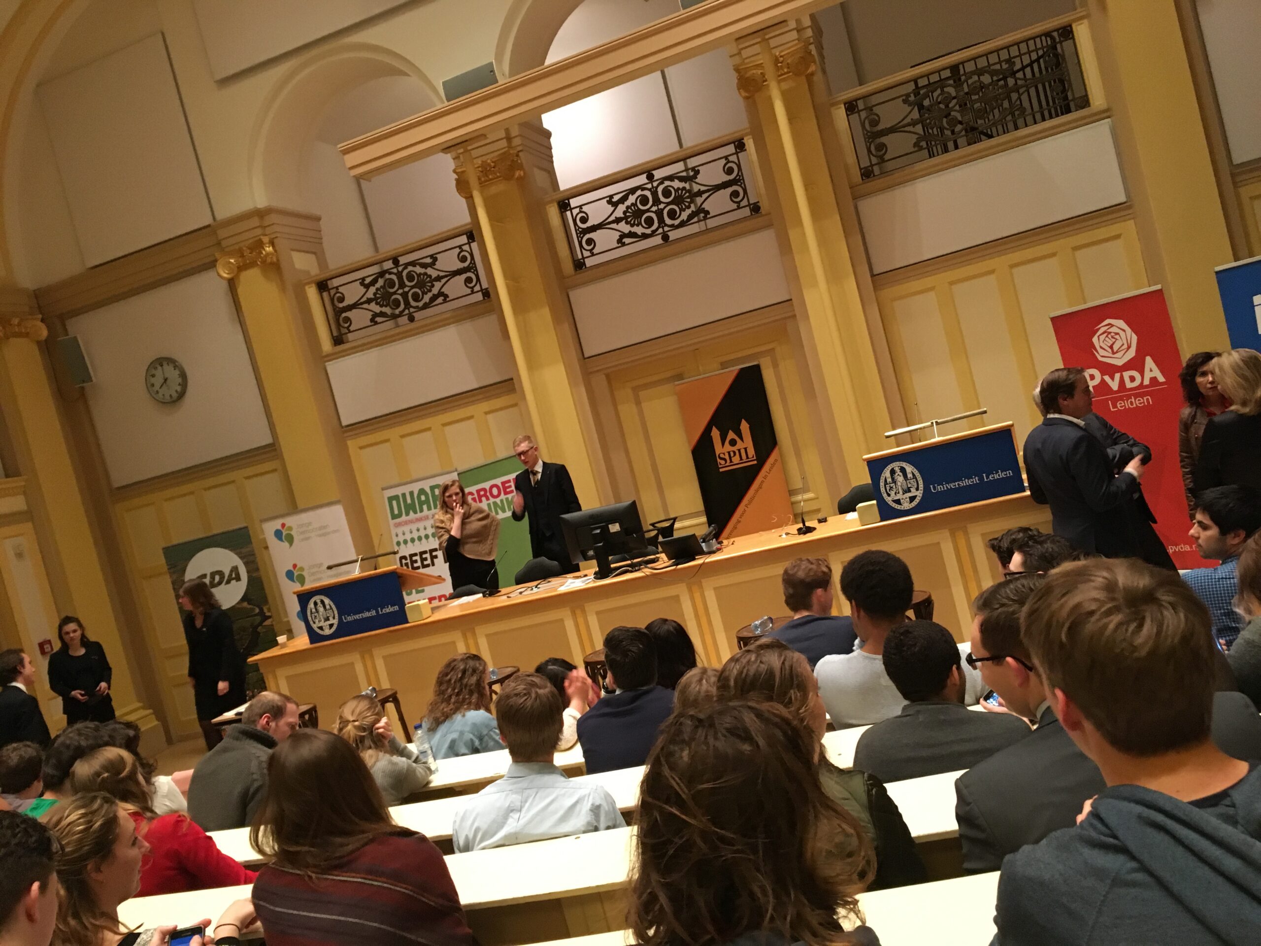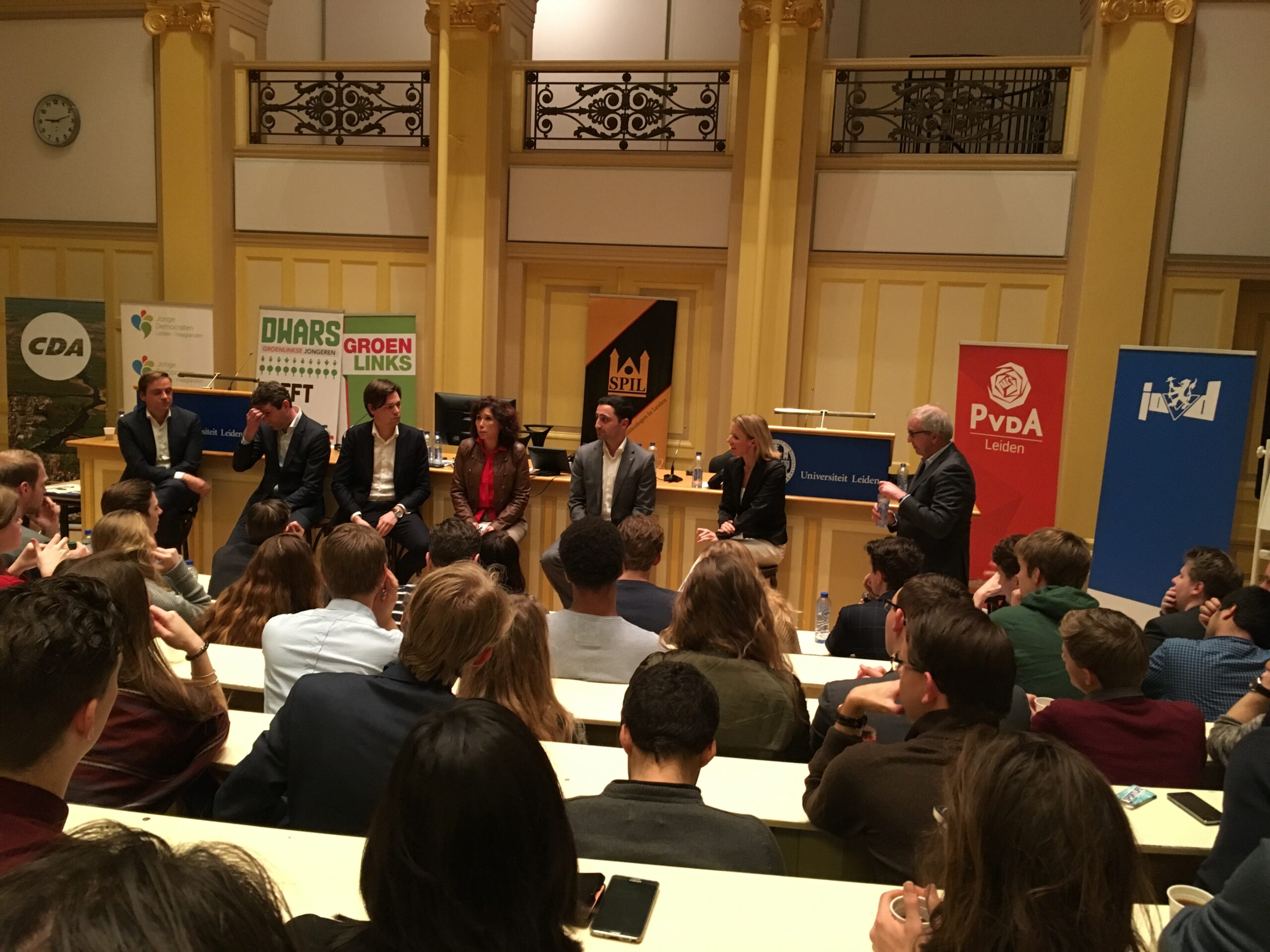 Donderdagavond vond het eerste Leidse verkiezingsdebat voor de Tweede Kamerverkiezingen van 15 maart plaats. Zes partijen, VVD, PvdA, CDA, D66, SP en GroenLinks, hadden kandidaten gestuurd. Opvallende afwezige was de PVV. Onder leiding van RTL-parlementair verslaggever Jos Heymans debatteerden de partijen over vier stellingen die de Studievereniging voor Politicologen in Leiden (SPIL) had bedacht. Het Groot Verkiezingsdebat werd georganiseerd door de Leidse Politieke Jongerenverenigingen en SPIL.