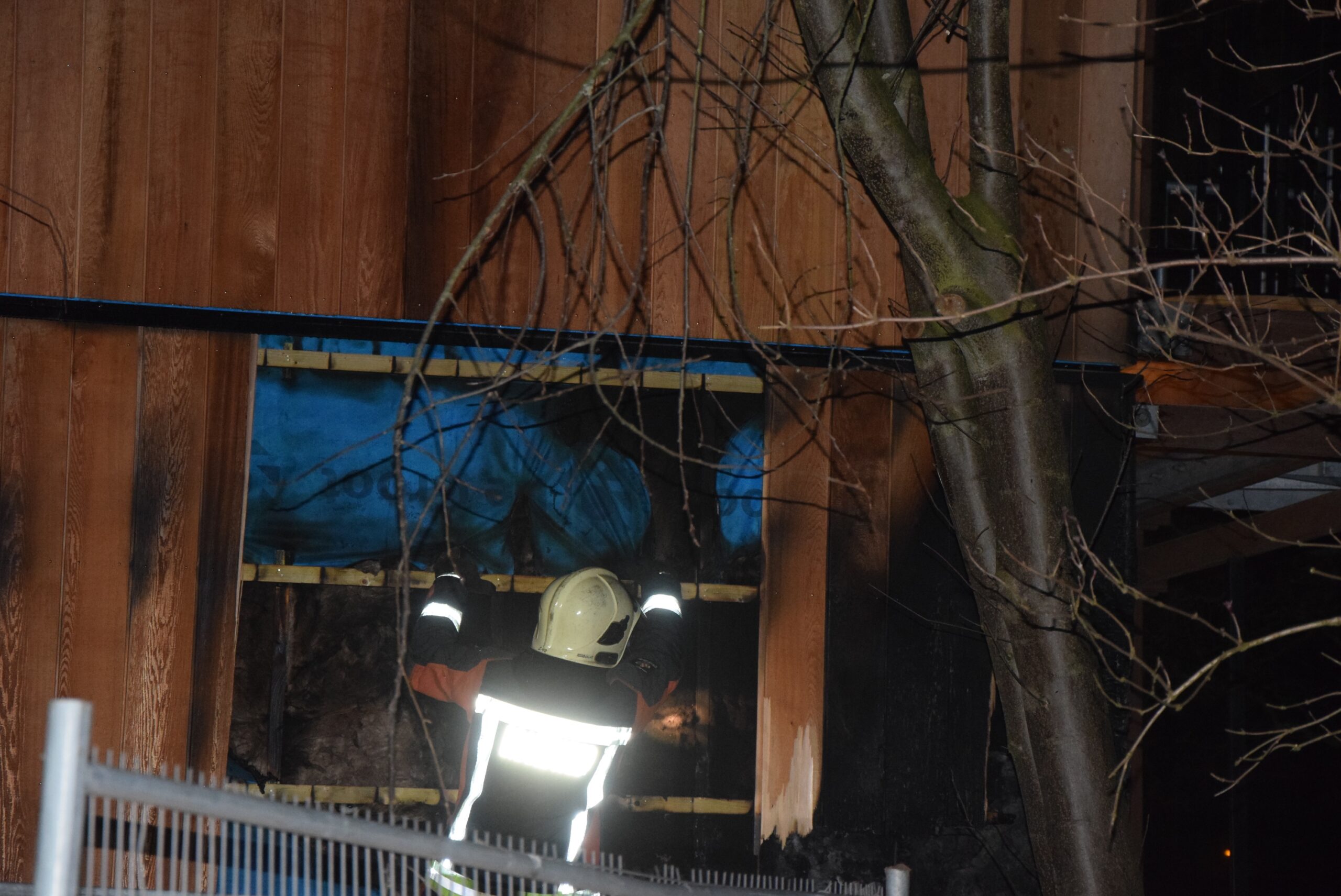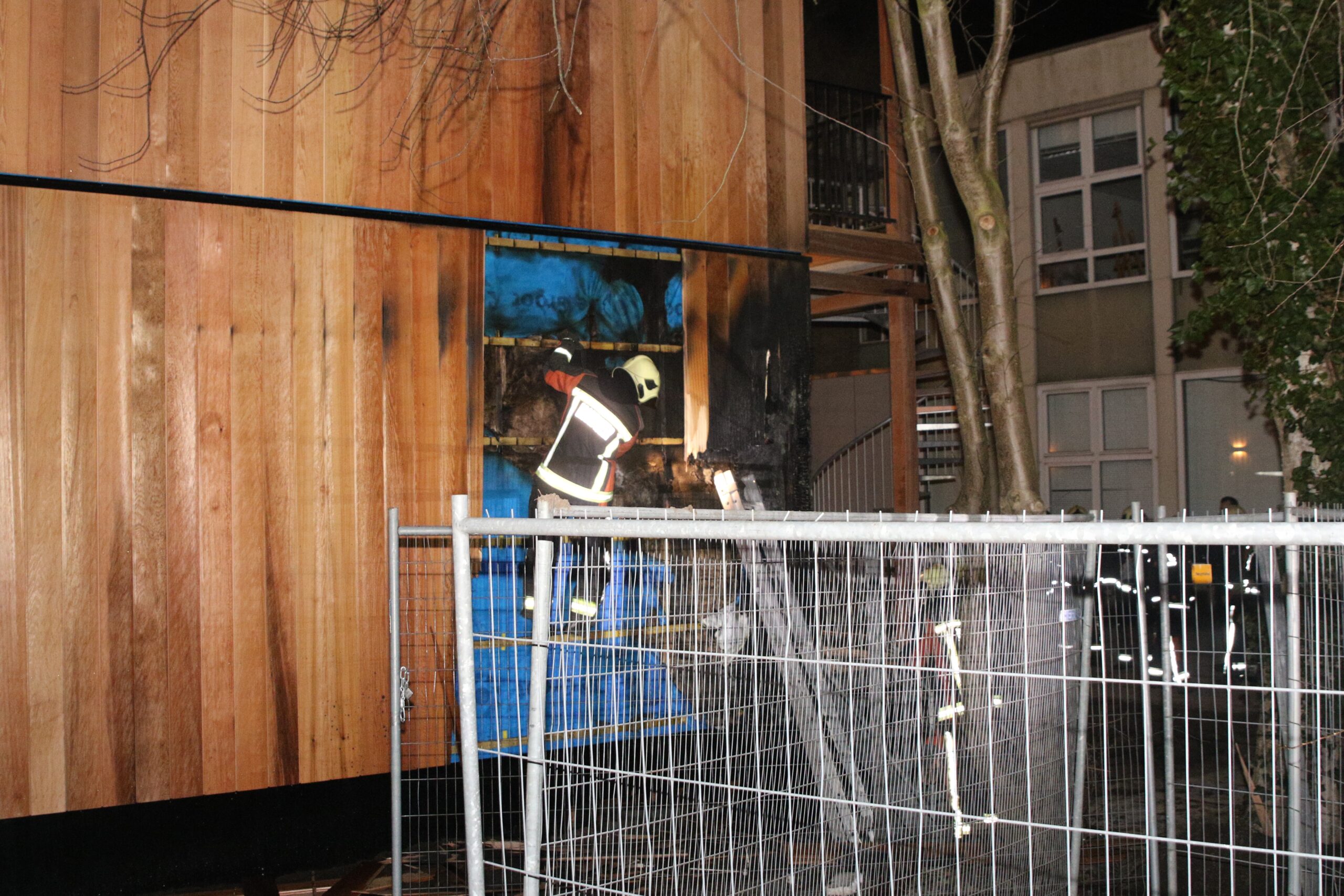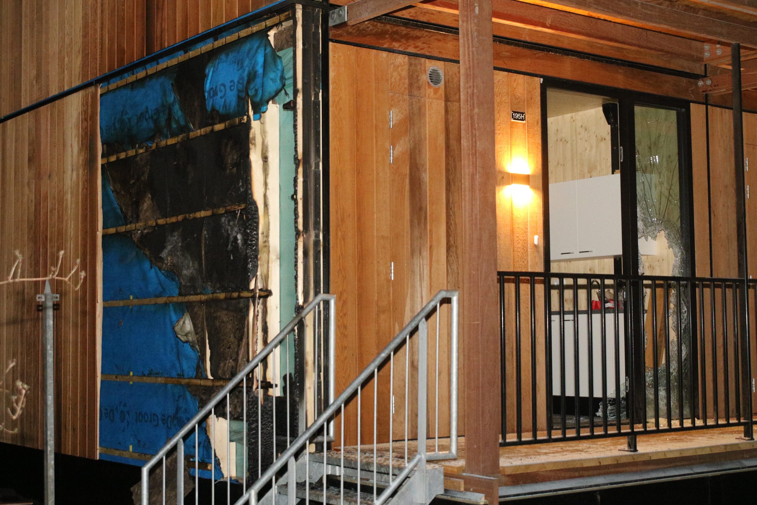 Toen de brandweer ter plaatse kwam, stond de houten buitenwand van het complex in lichterlaaie. Er is meteen begonnen met blussen. Daarbij is ook een deel van de houten bekleding verwijderd.