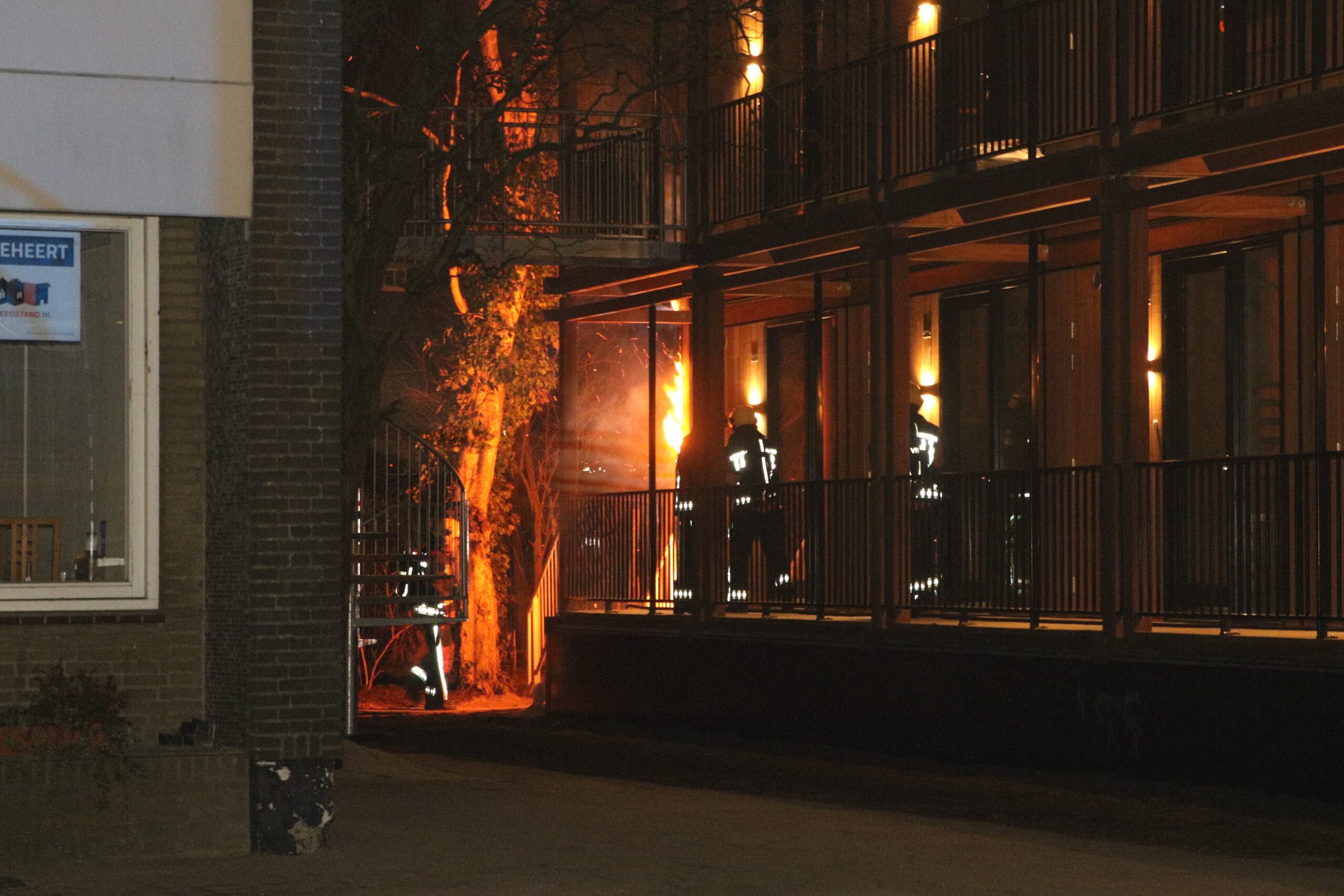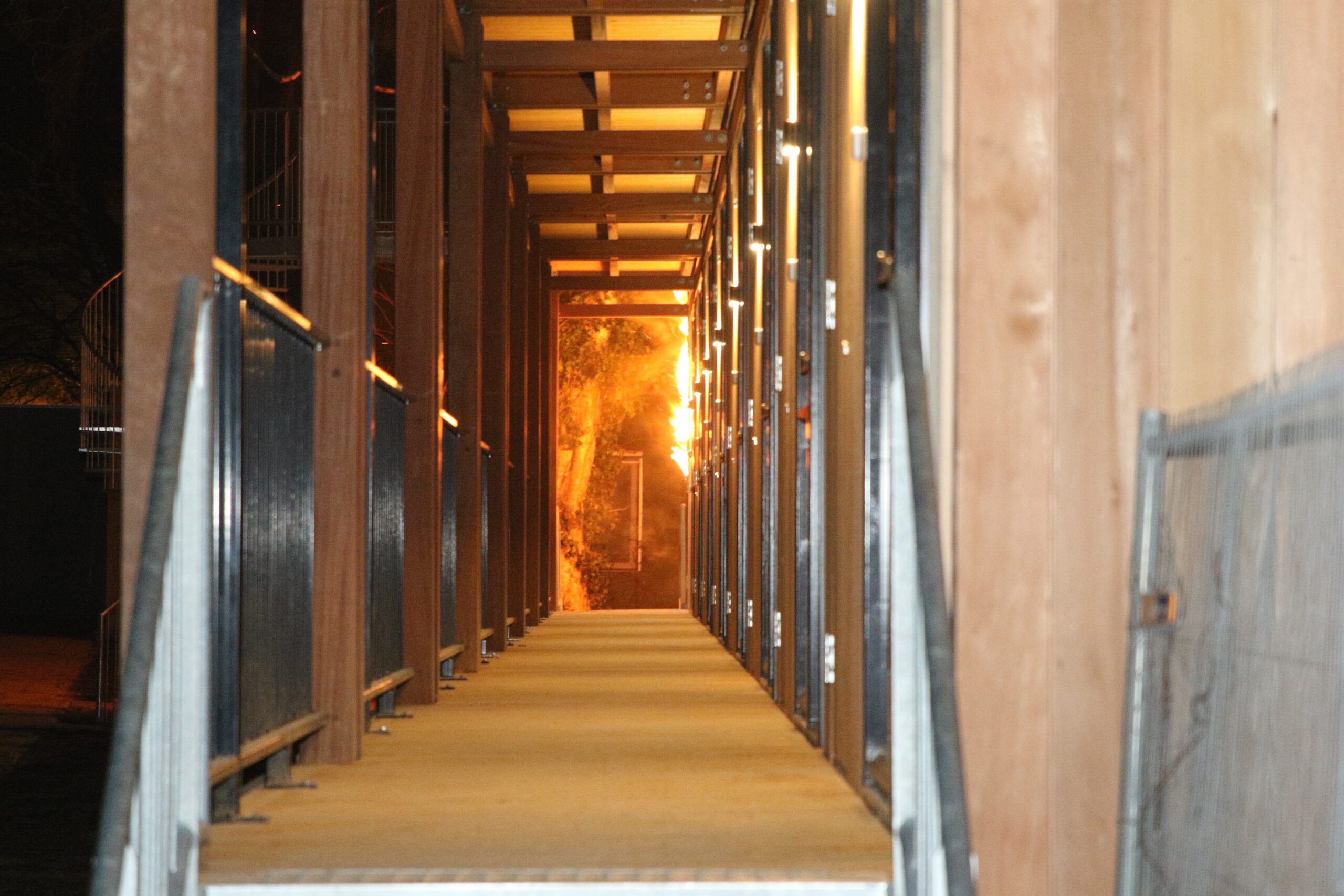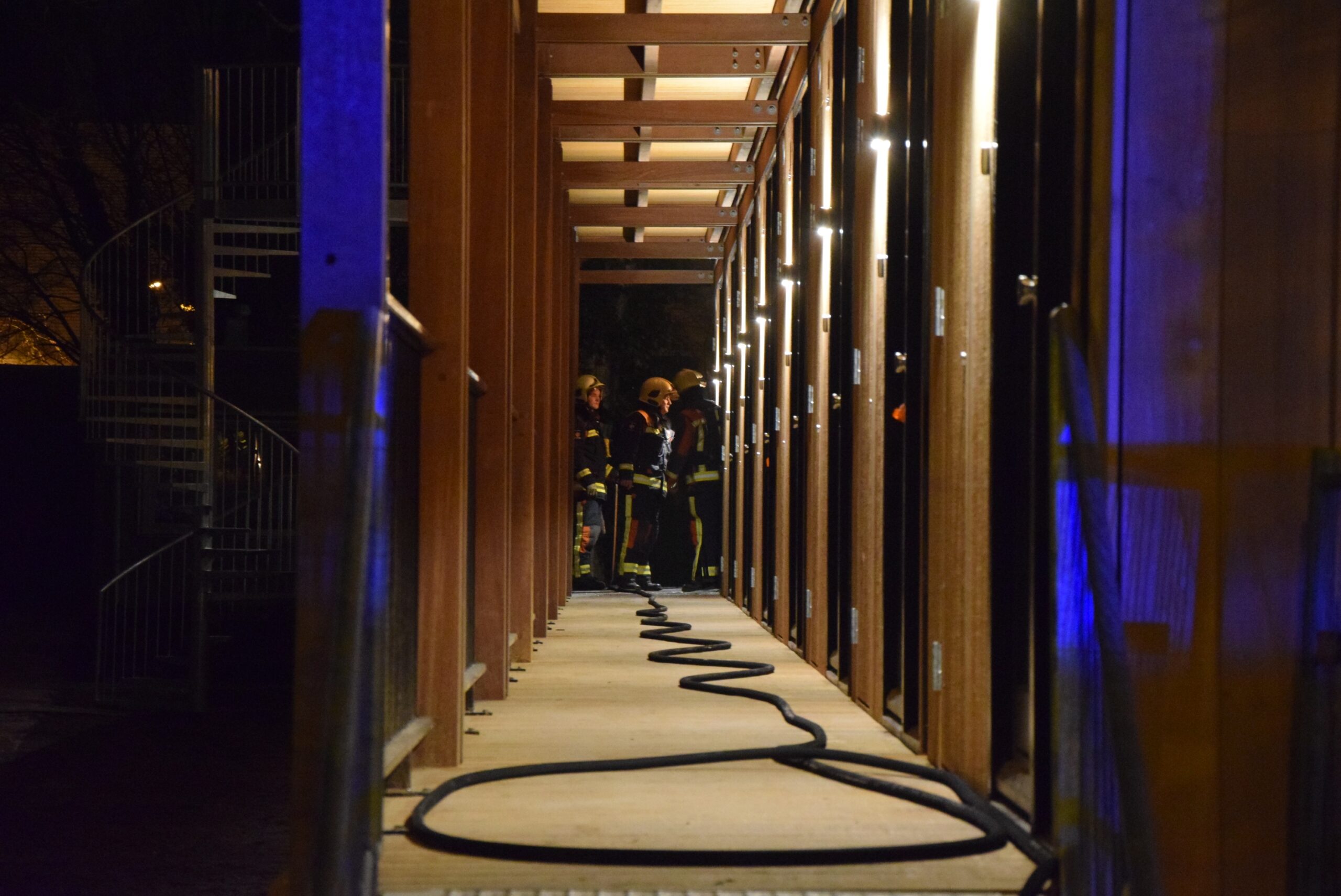 Toen de brandweer ter plaatse kwam, stond de houten buitenwand van het complex in lichterlaaie. Er is meteen begonnen met blussen. Daarbij is ook een deel van de houten bekleding verwijderd.