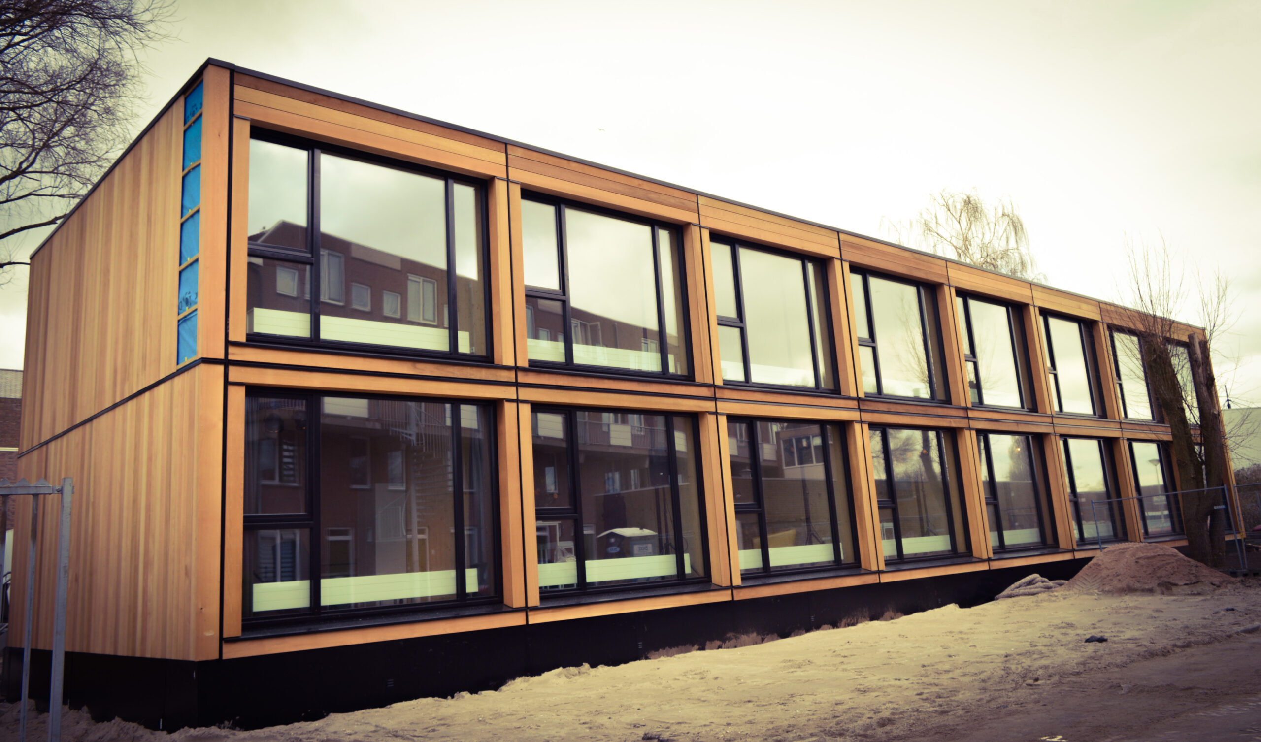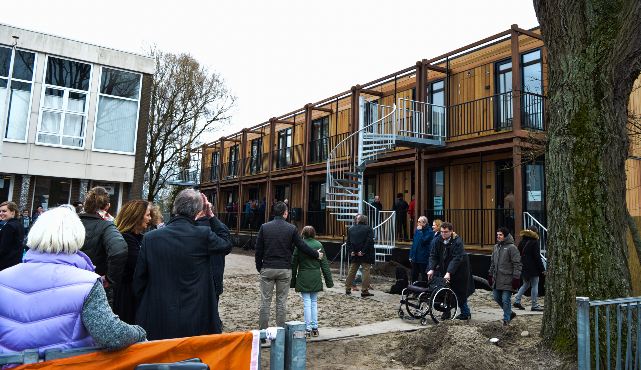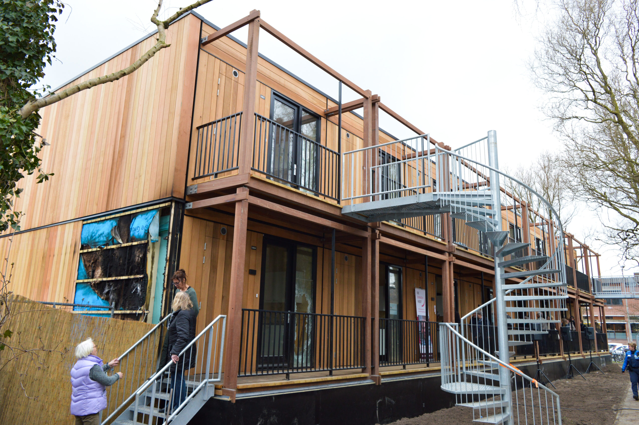 Leiden is een bijzonder wooncomplex rijker. Op het terrein van de voormalige basisschool De Springplank aan de Sumatrastraat zijn vanmiddag de 16 zogenaamde Finch modules officieel geopend. Na een praatje van wethouder Roos van Gelderen, directeur Christoffel Klap van Woonstichting Ons Doel, directeur Emmy Sloos van Stichting De Binnenvest en oprichter Jurrian Knijtijzer van Finch Buildings gingen de deuren van de onderste laag woningen open voor belangstellenden.