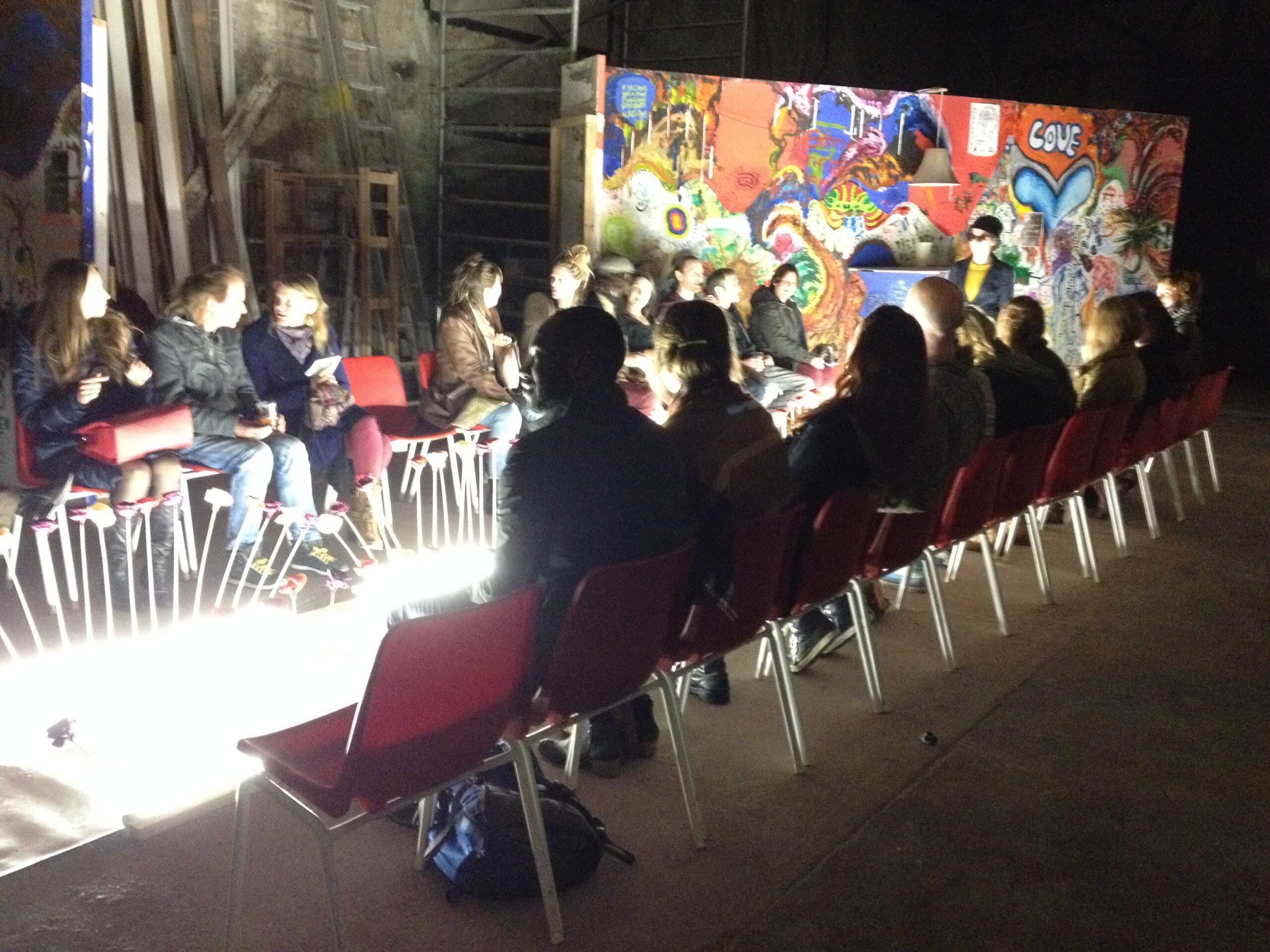 Het is er nog niet eens. Theater De Generator moet, volgens de plannen, volgend jaar starten. Maar ook een half-affe zaal kun je gebruiken, zoveel bewijst On Probation wel. Een mini-festival was het donderdagavond 17 maart in De Vrijplaats: twee theatervoorstellingen, een panelgesprek(je), een modeshow, een brochure met achtergrondinformatie en (gratis) eten. On Probation had deze keer als thema ‘dakloosheid en woonrecht’. Een thema dat blijkbaar veel mensen aanspreekt, want het was nokkievol. Buiten waait het en klettert de regen tegen de ramen.