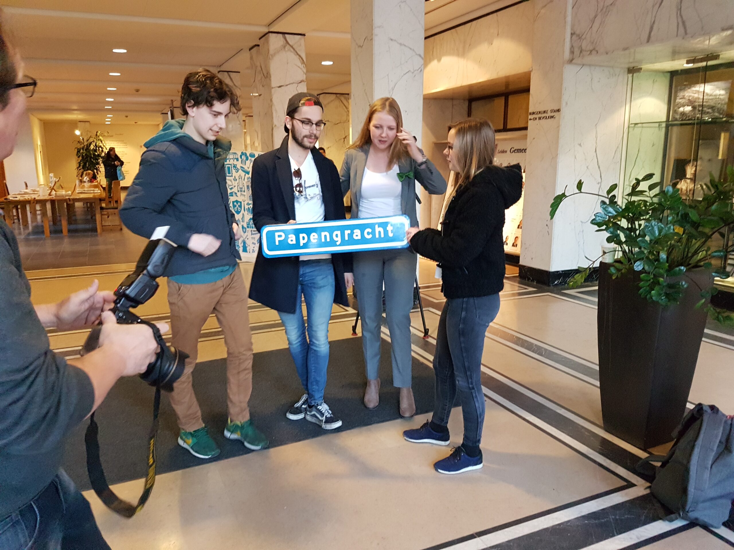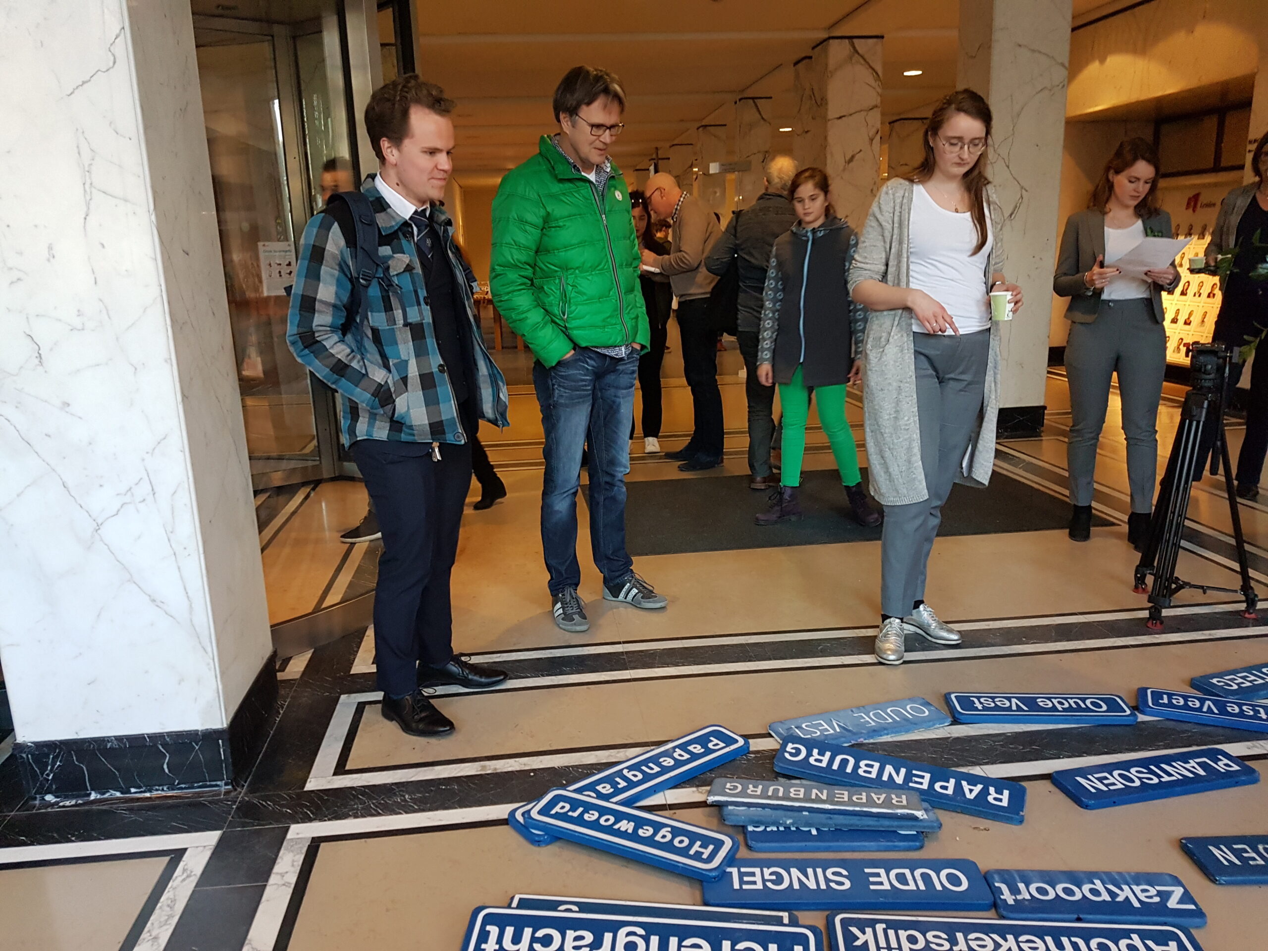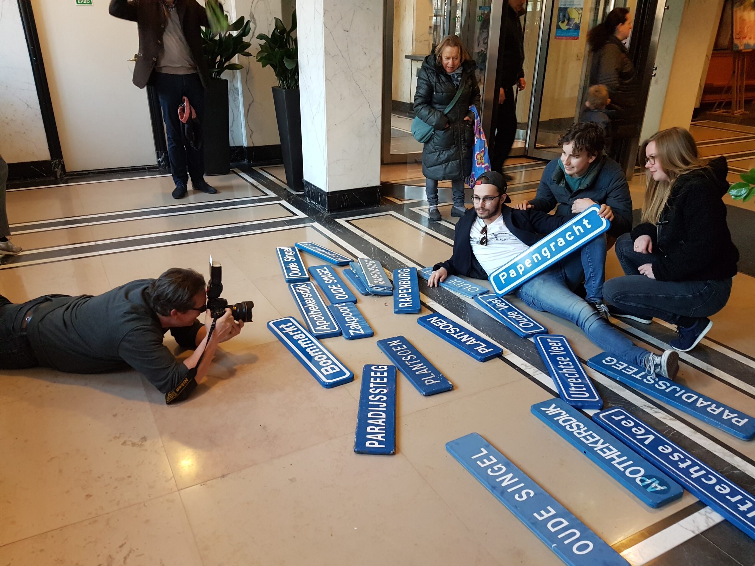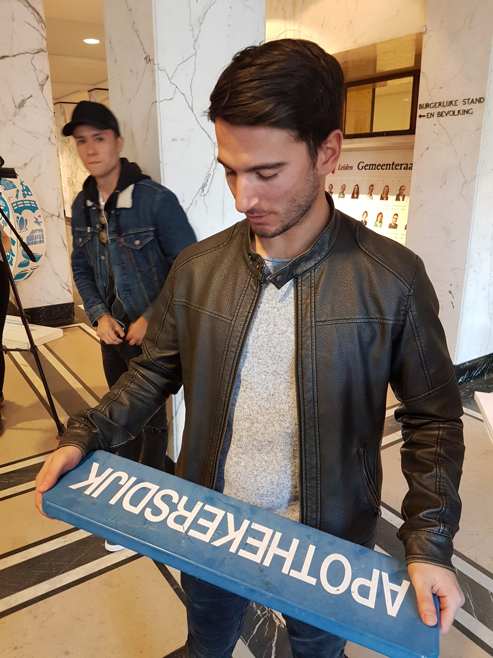 De hal van het stadhuis in Leiden lag gisteren vol met borden. Het Rapenburg, de Herengracht, de Paradijssteeg en de Zaksteeg. Voor alle borden kwamen de winnaars van de actie gisteren opdagen om het felbegeerde straatnaambord op te halen en een mooi plekje te geven in de eigen woning.