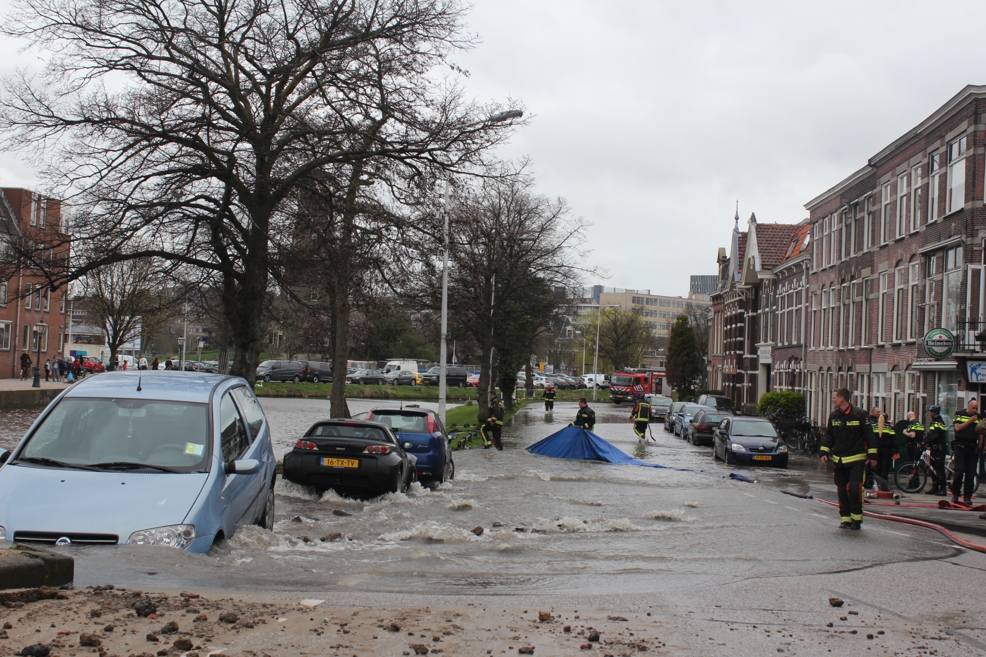 Ondergelopen huizen, een verzakte straat met wegzakkende auto’s en een enorme hoeveelheid water die van alles meeneemt. Dat is kort samengevat de situatie op de Rijnsburgersingel waar een waterleiding is gesprongen. Dat gebeurde rond 13.30 uur. Inmiddels is het lek gedicht.