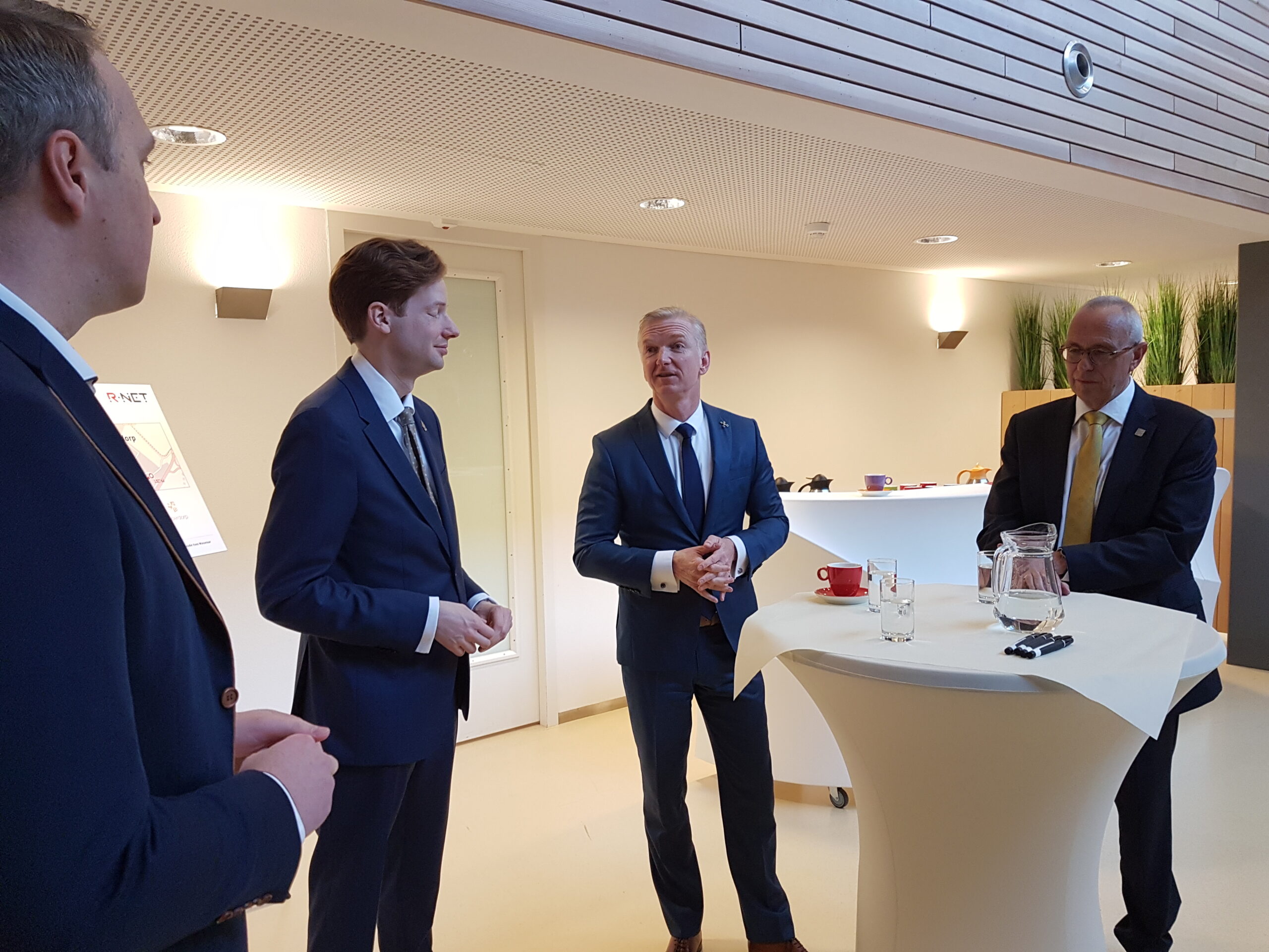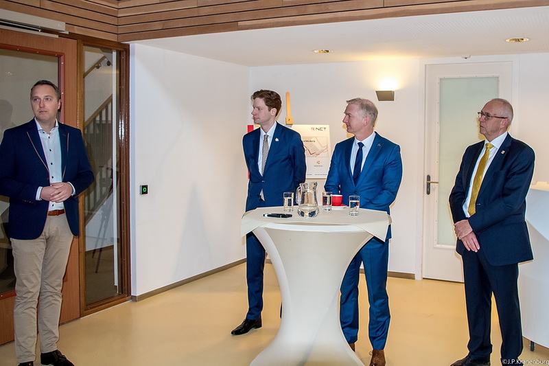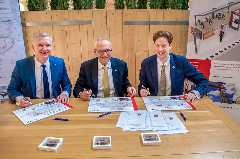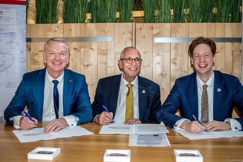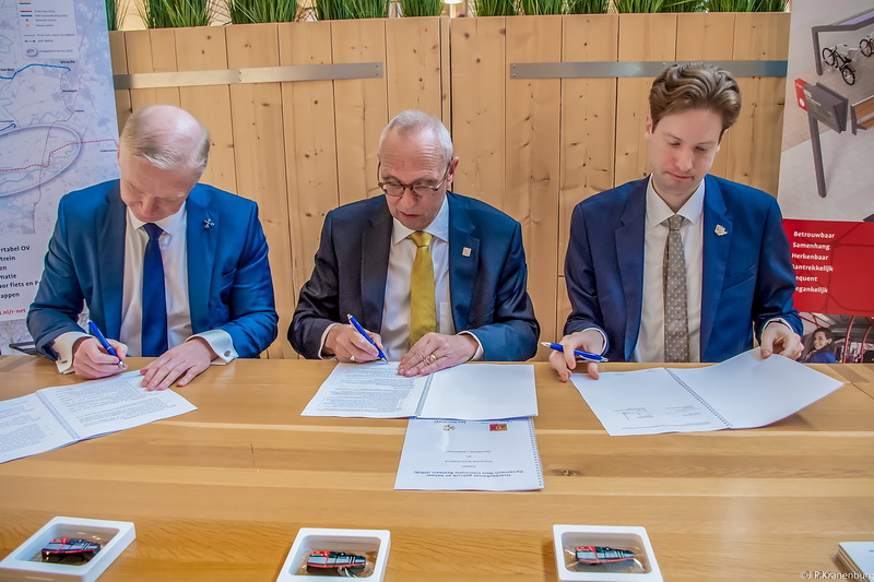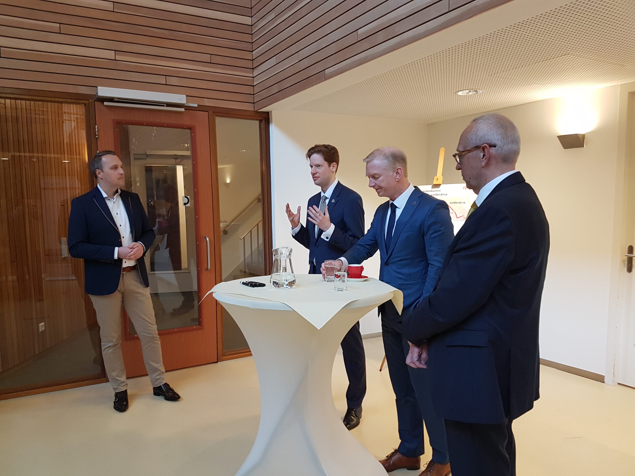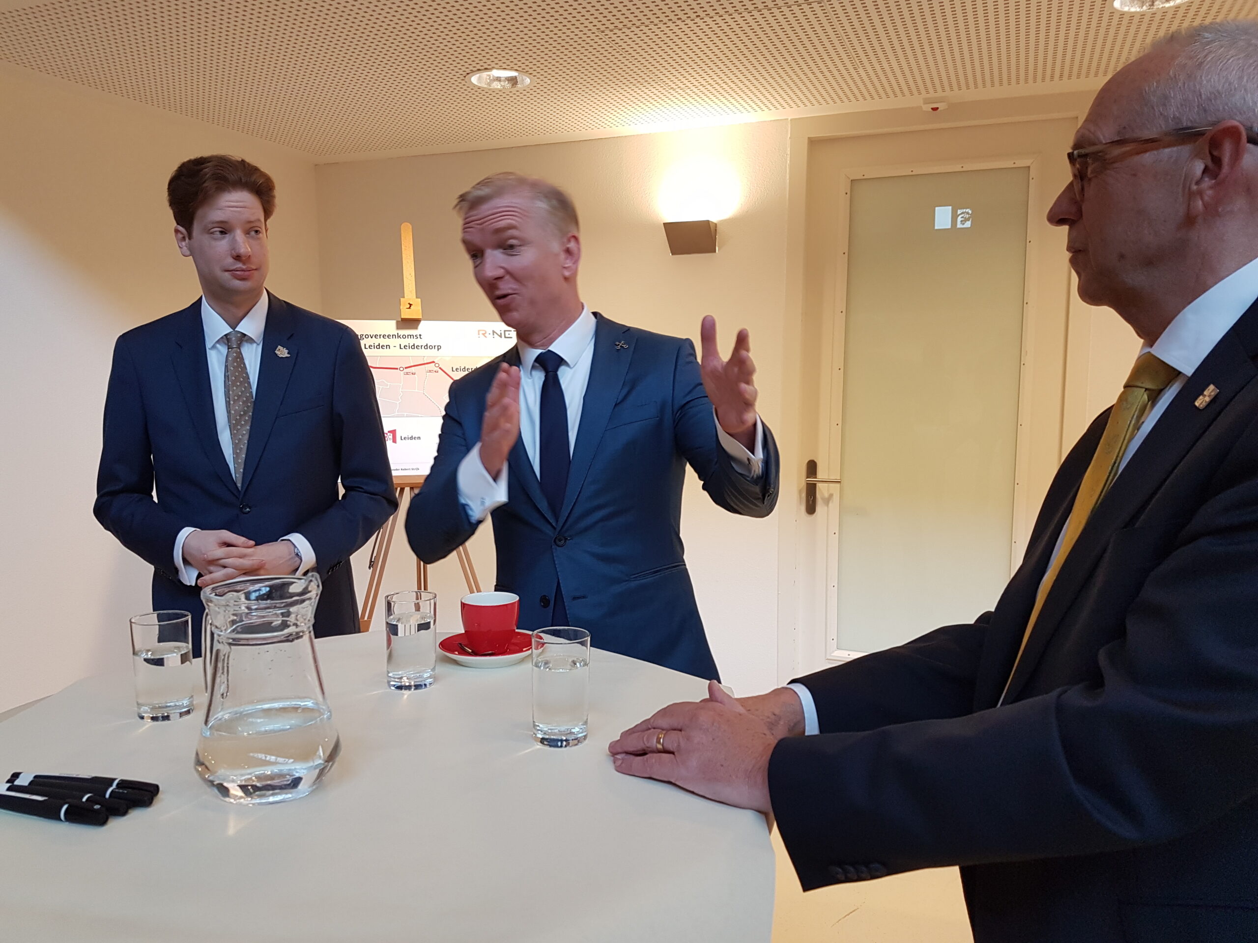 Gedeputeerde Floor Vermeulen van de provincie Zuid-Holland en de wethouders Robert Strijk en Kees Wassenaar van Leiden en Leiderdorp gaven vanmorgen in het gemeentehuis van Leiderdorp het startsein voor de nieuwe hoogwaardige busverbinding tussen station Leiden Centraal en het Alrijne Ziekenhuis in Leiderdorp.
