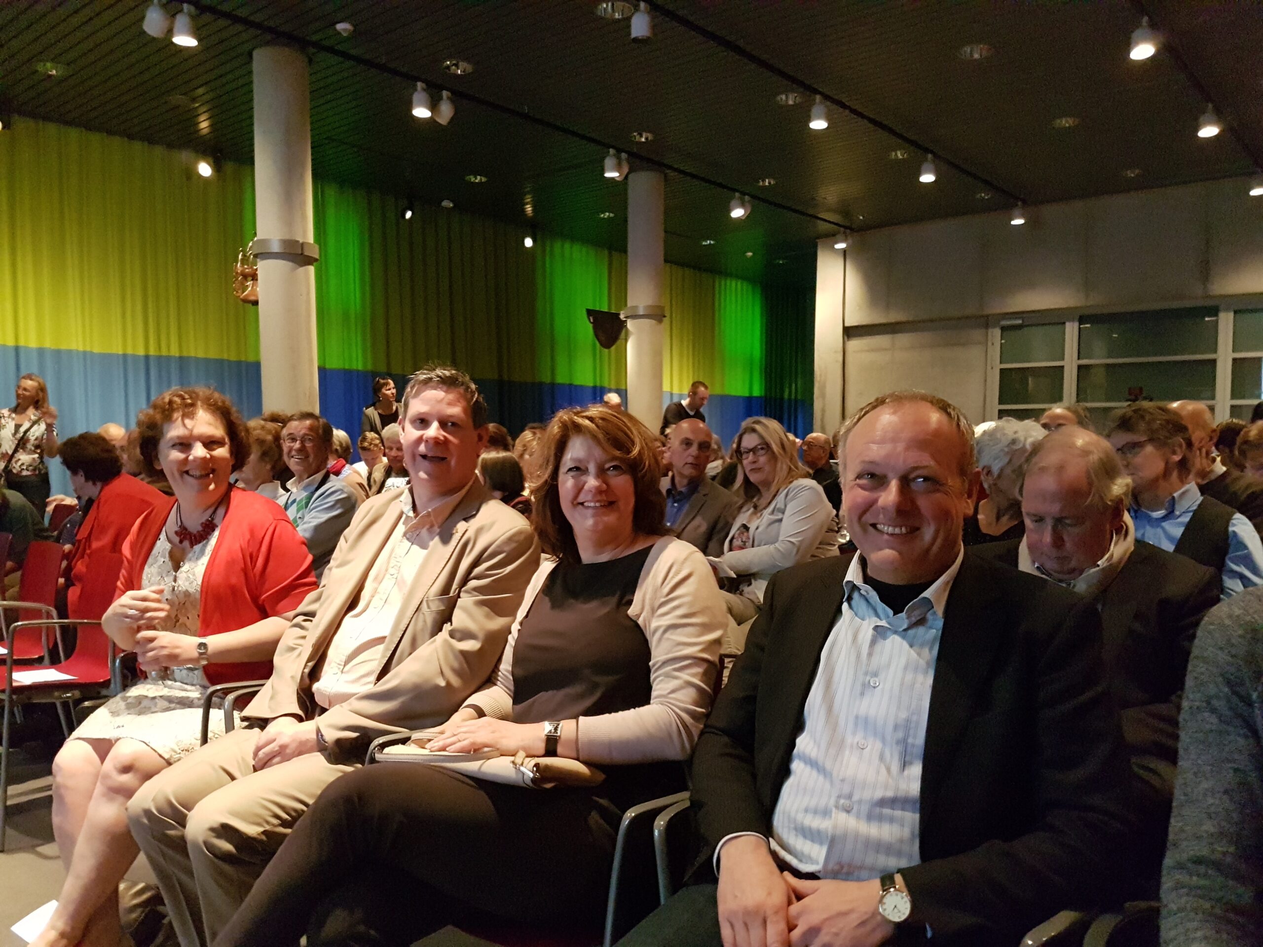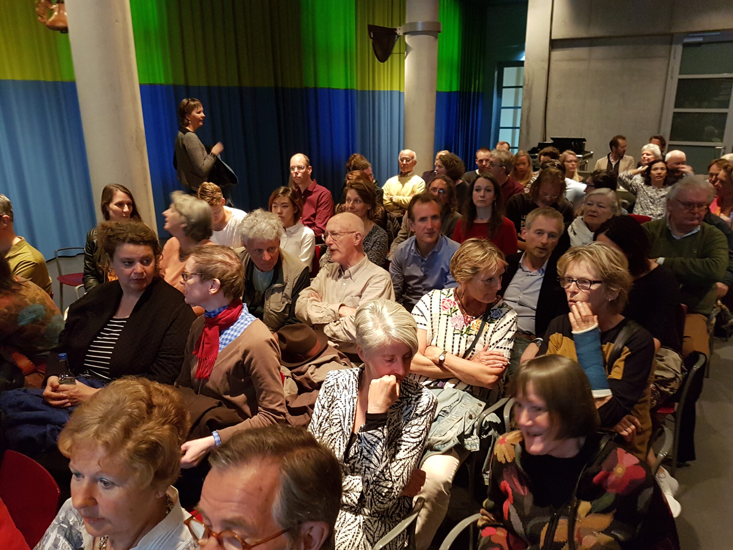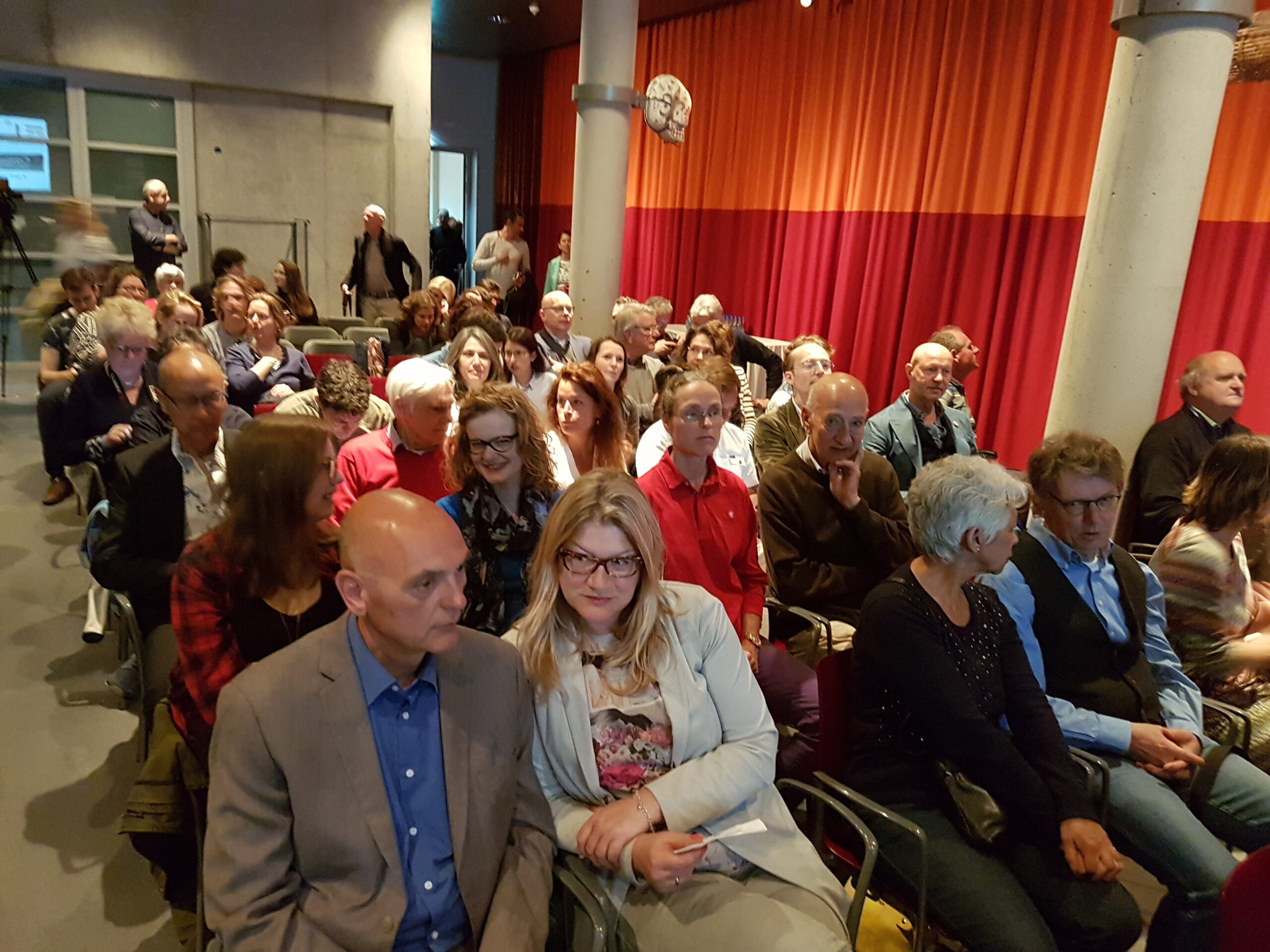 Mark Neupert’s film over Leiden werd vertoond aan een zaaltje vol bekende Leidenaren onder wie burgemeester Lenferink. (Video: Chris de waard en Emile van Aelst).