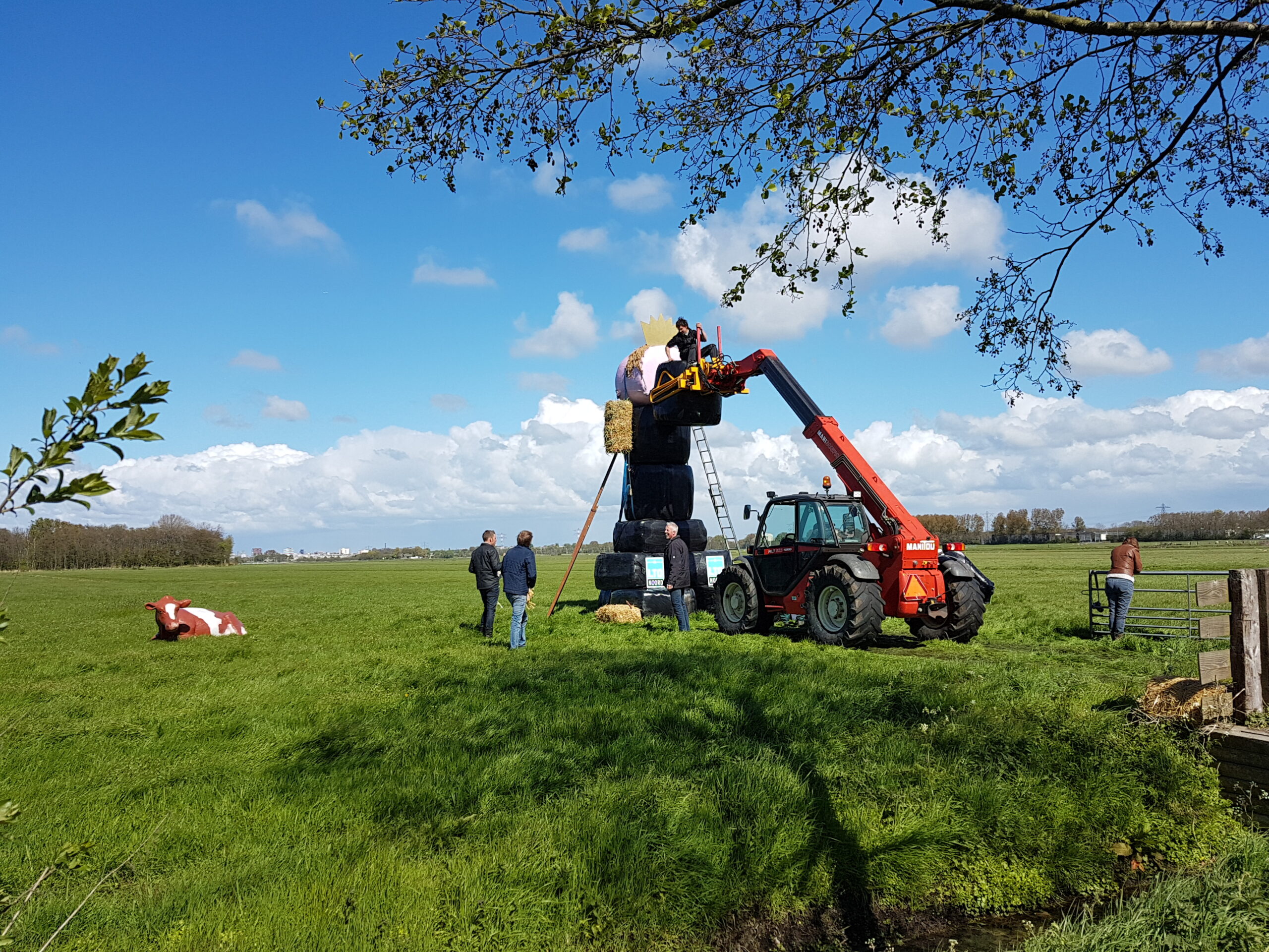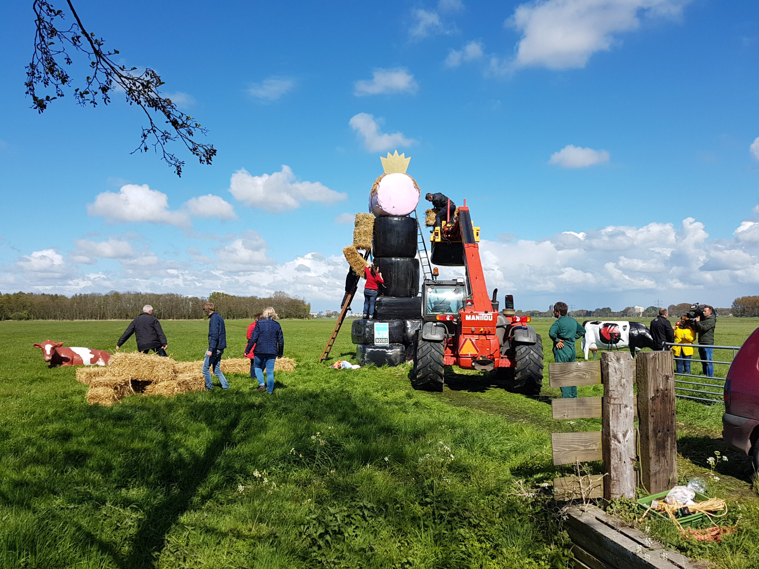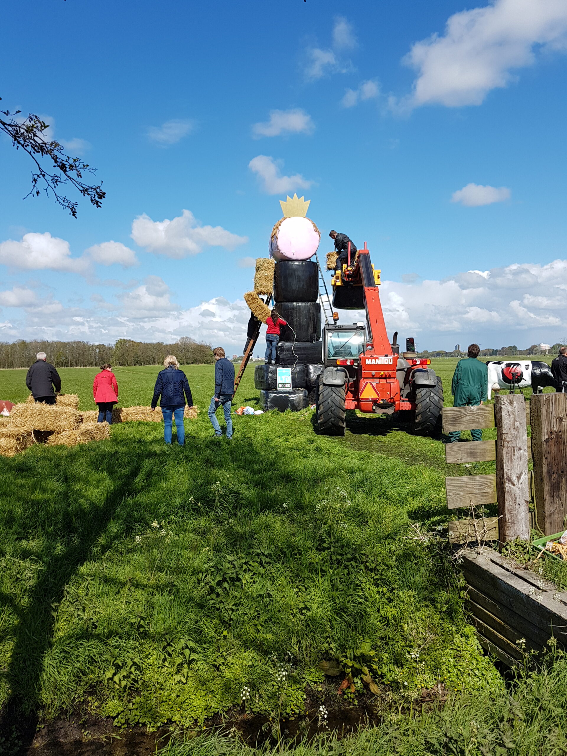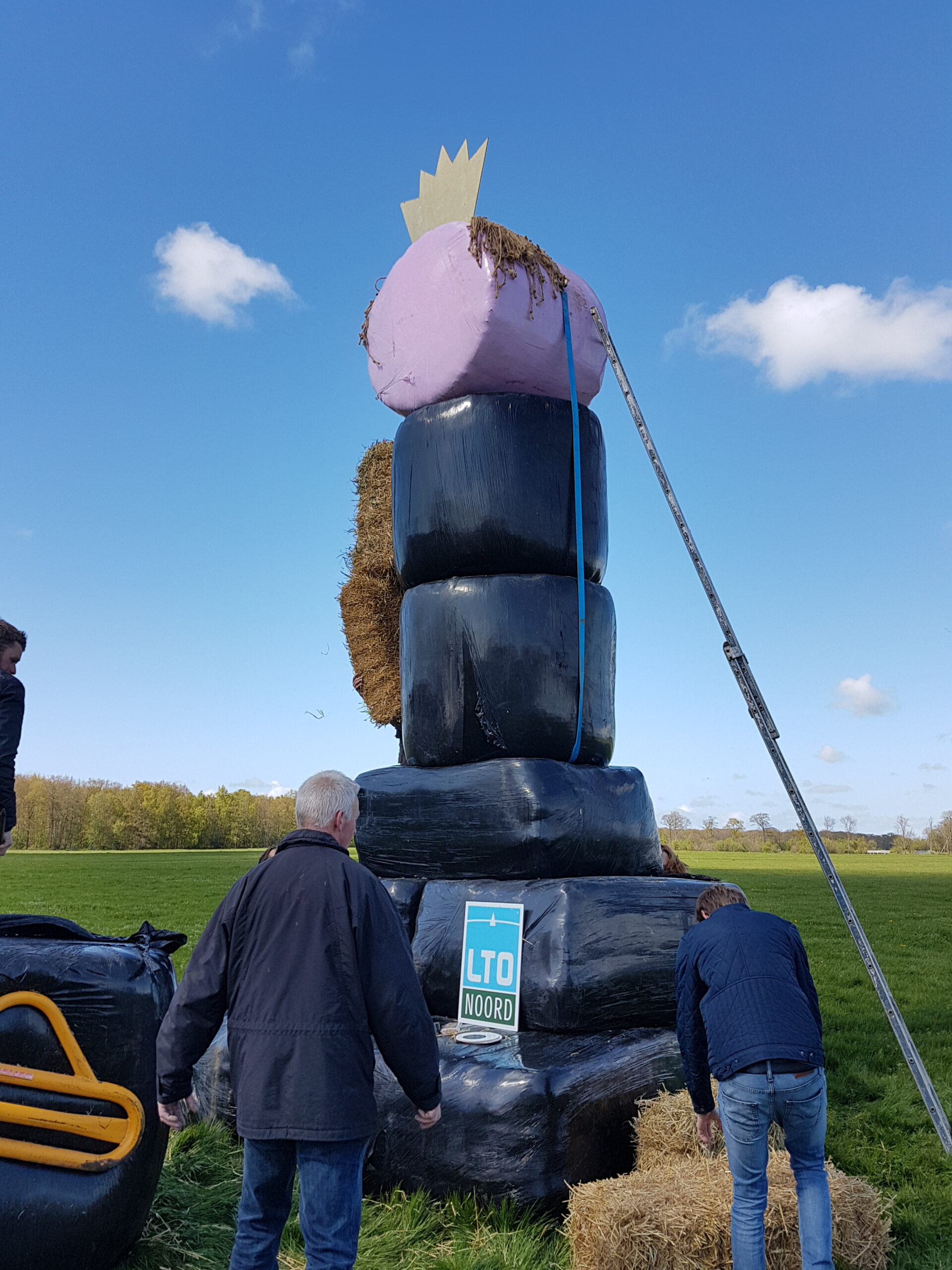 Boeren uit verschillende delen van Nederland hebben vanmiddag tegenover landgoed De Horsten in Wassenaar een enorme Abraham gebouwd. In een weiland langs de Papeweg werd van strobalen een pop opgebouwd van wel zes à zeven meter hoog. Er bovenop een kroon.