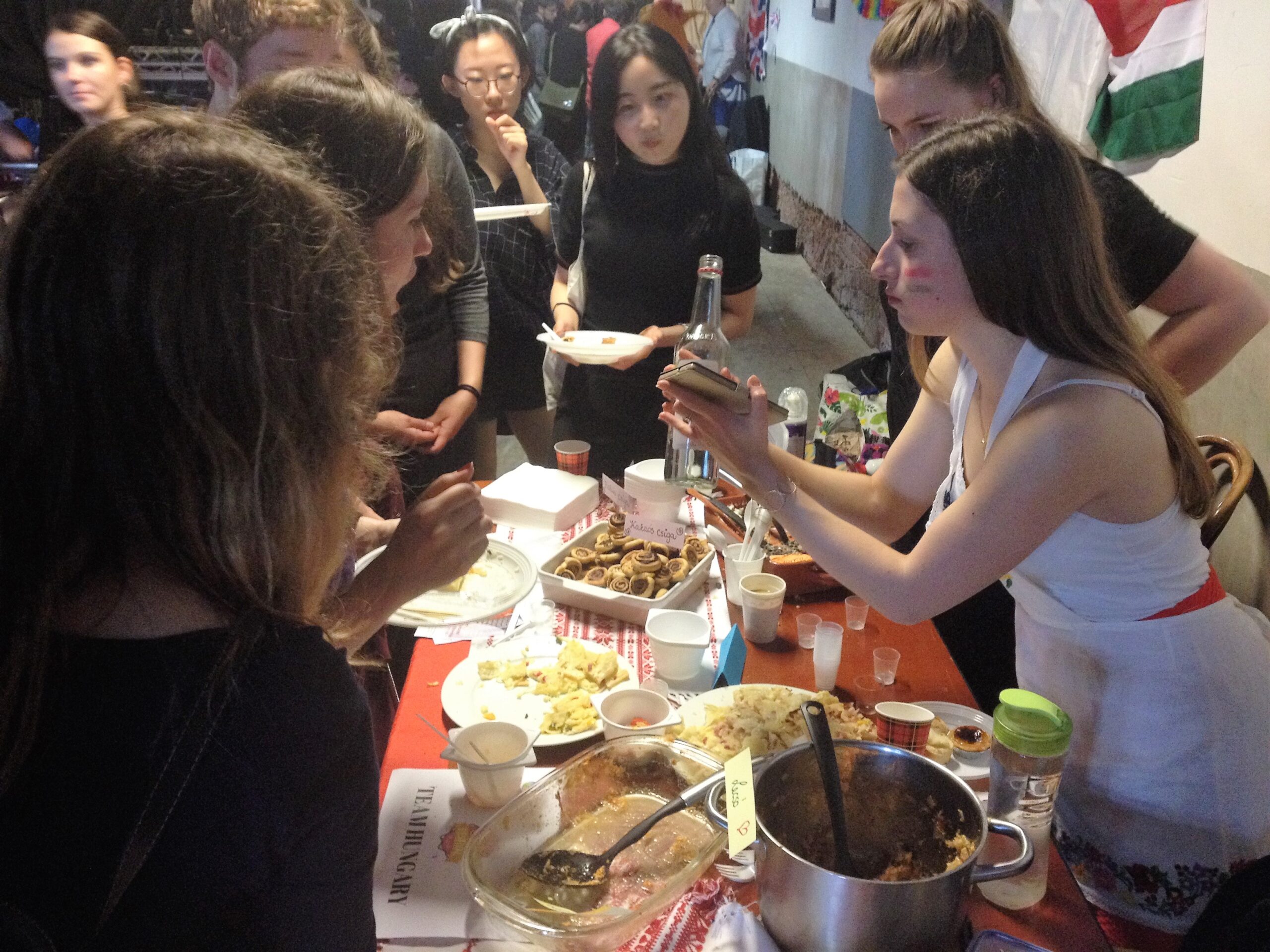 Vreemde gerechten proberen, is leuk. Met mensen praten, is nog leuker. Waar waren bijvoorbeeld de Franse slakken? Die bleken de studenten/koks niet te hebben gevonden in de winkels noch in het wild “I wanted to go hunting in the park”. Of de Litauwse grey peas, die ik eerst aanzag voor capucijners. Die blijken nog beschermd ook, en lekker! Het is bijzonder om al die gerechten op één samen te zien; van de wat grovere tot en met de verfijnde smaken. ’s Lands wijs….. zie je terug in het voedsel.
