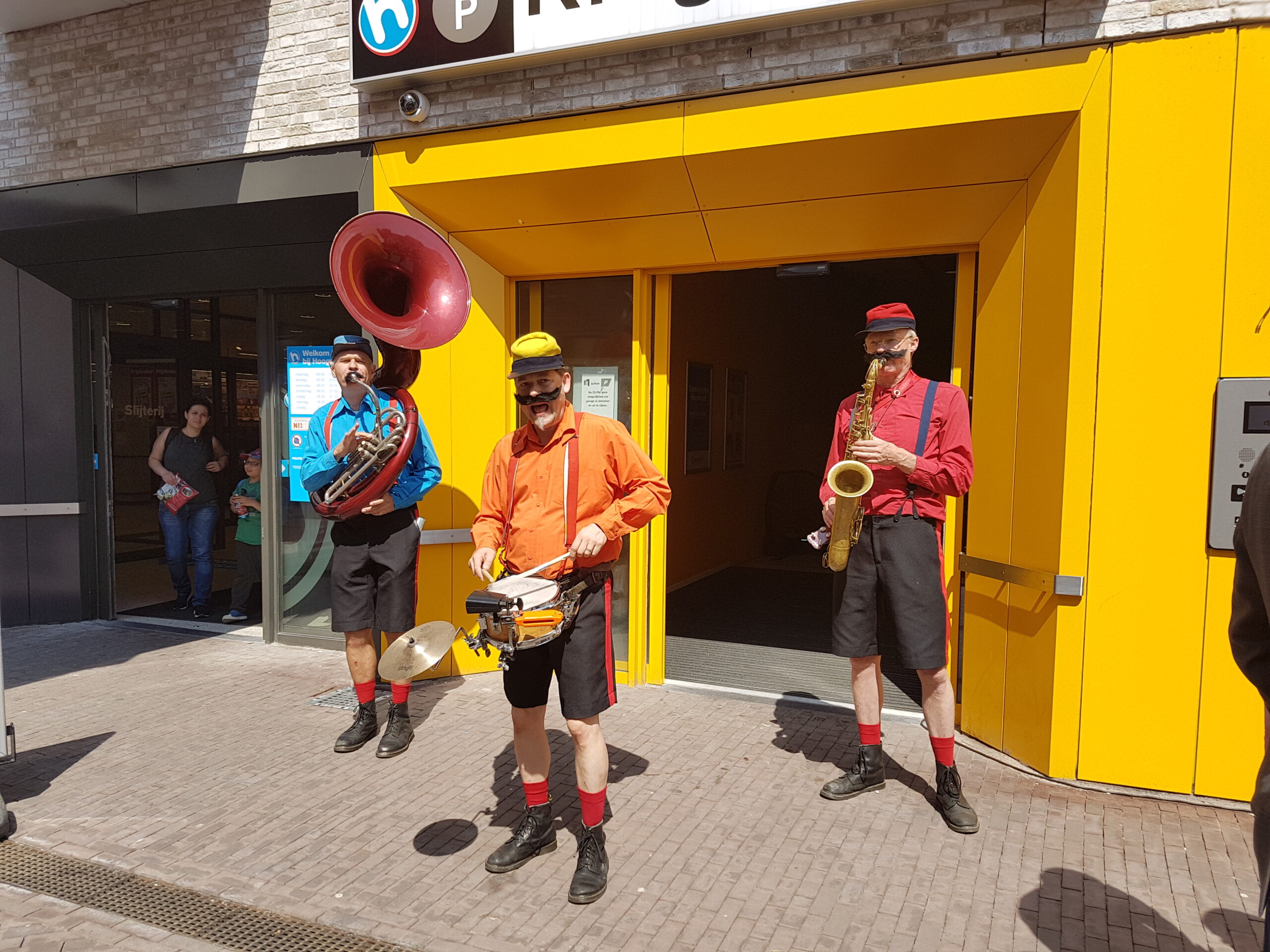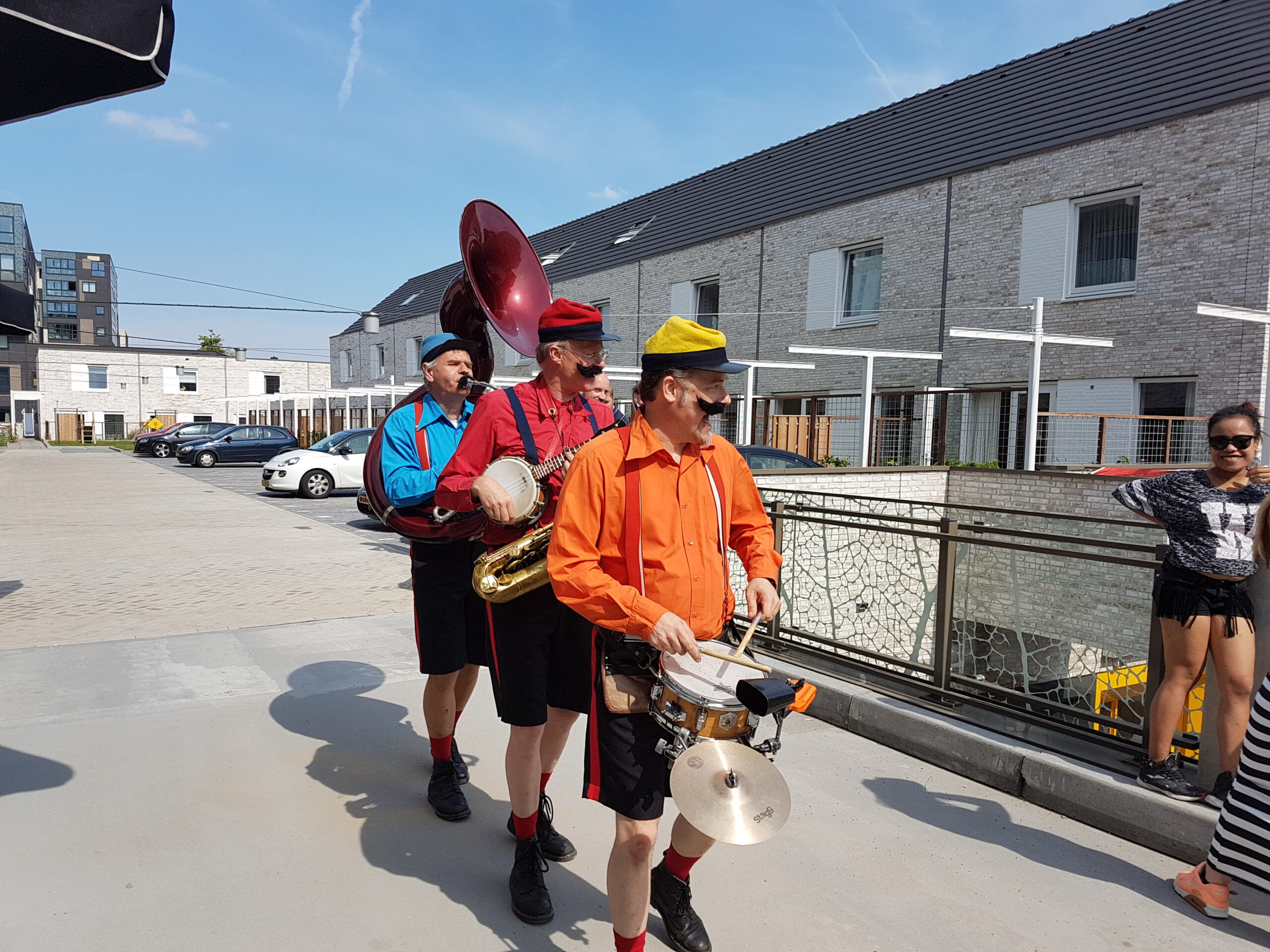 De Funfare en butler Alfons zorgden voor een vrolijke noot bij het opleveringsfeestje van Pleinzicht in de Kooi. (Video: Chris de Waard).