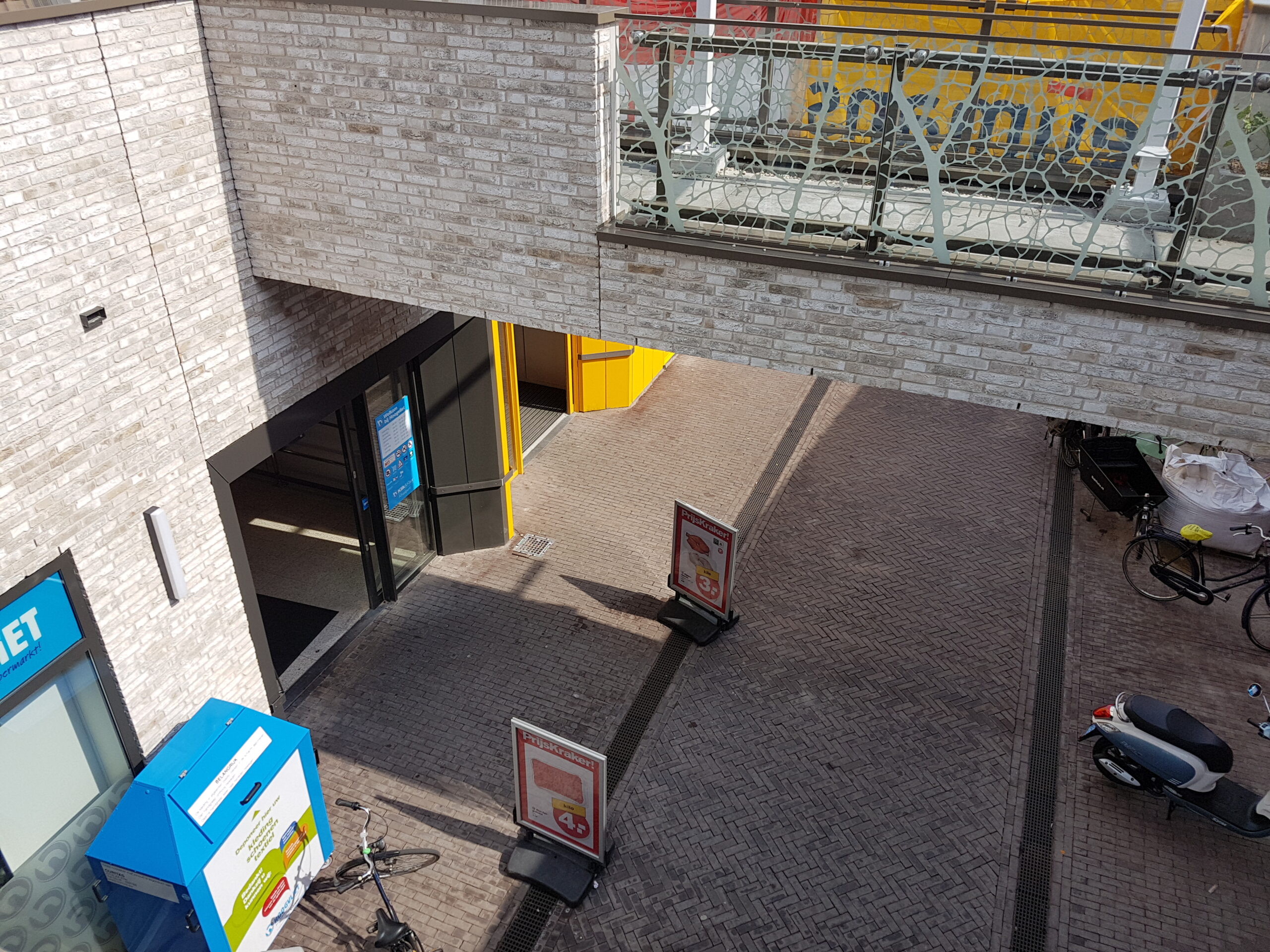 Een parkeergarage en winkels waaronder een flinke supermarkt van Hoogvliet vormen de begane grond. Er bovenop nu niet eens alleen appartementen, maar een halve woonwijk. Compleet met straten met daaraan eengezinswoningen. Elk met een parkeerplek voor de deur en een tuin. Wie niet goed kijkt waant zich in een reguliere straat ergens in Leiden. Totdat je je realiseert dat je bovenop de supermarkt staat en uitkijkt op de bovenste verdiepingen van de woningen van de overburen aan de Ringkade. Daarbovenop wel nog tientallen appartementen.