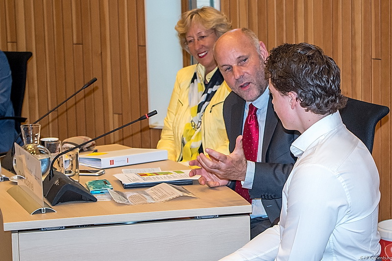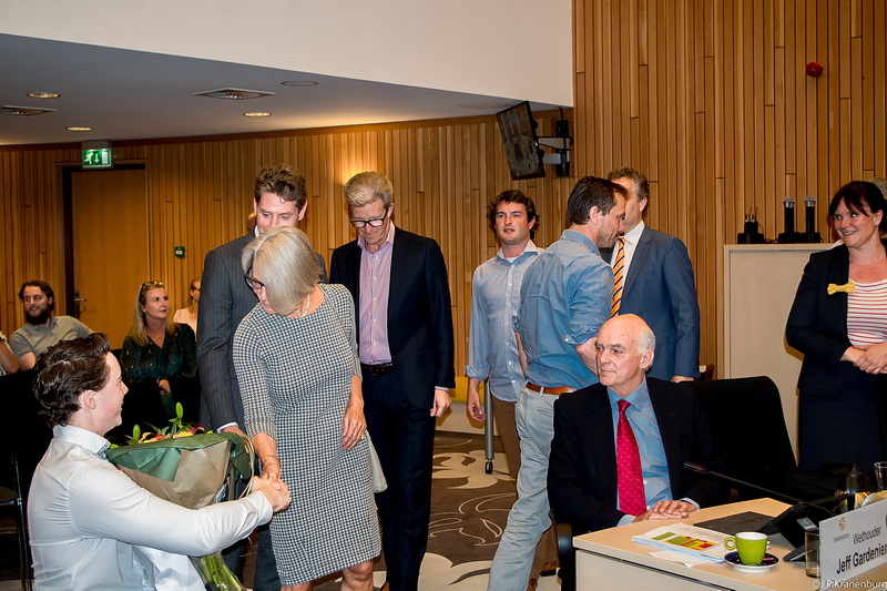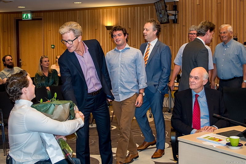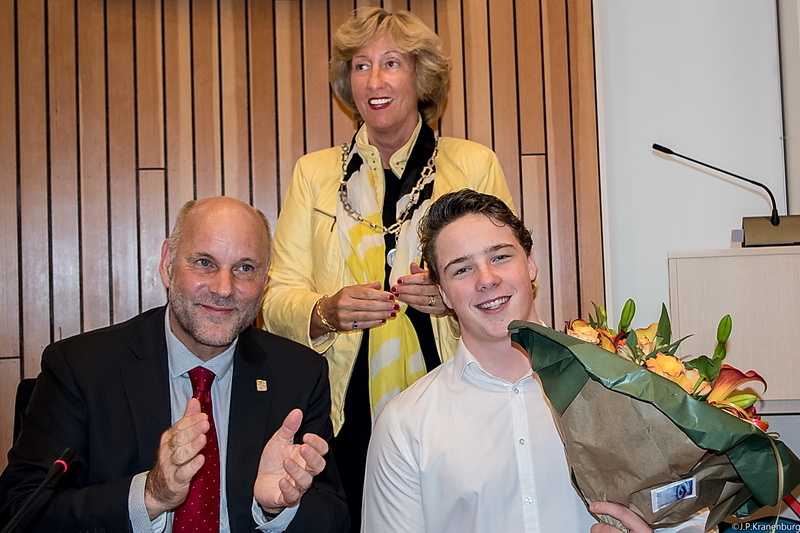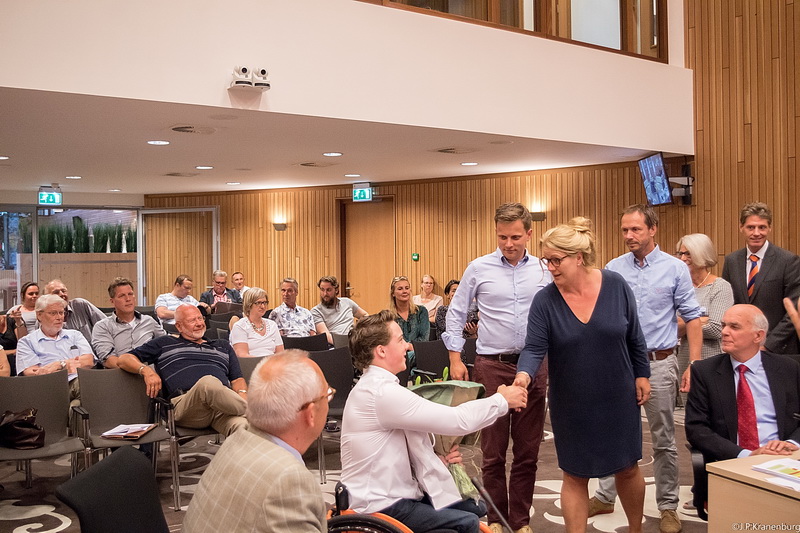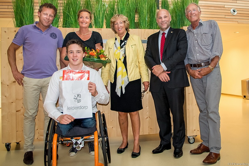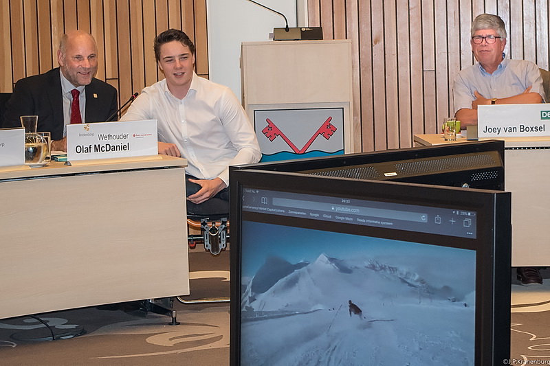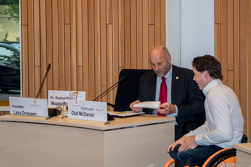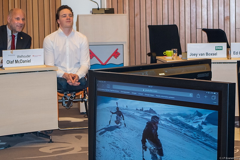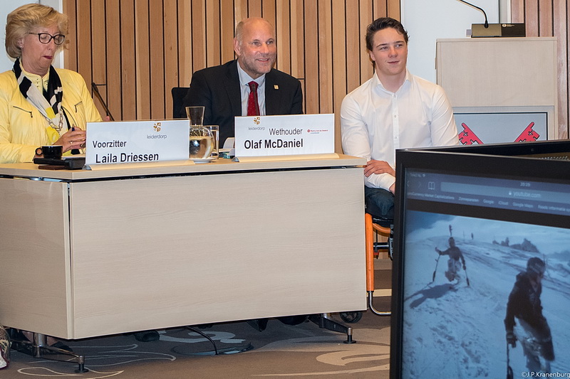 De Leiderdorpse paraskiër Jeroen Kampschreur werd maandagavond bij de gemeenteraadsvergadering in Leiderdorp burgemeester Laila Driessen en sportwethouder Olaf McDaniel. Daar werd hij door het gemeentebestuur gefeliciteerd met zijn bijzondere prestaties.