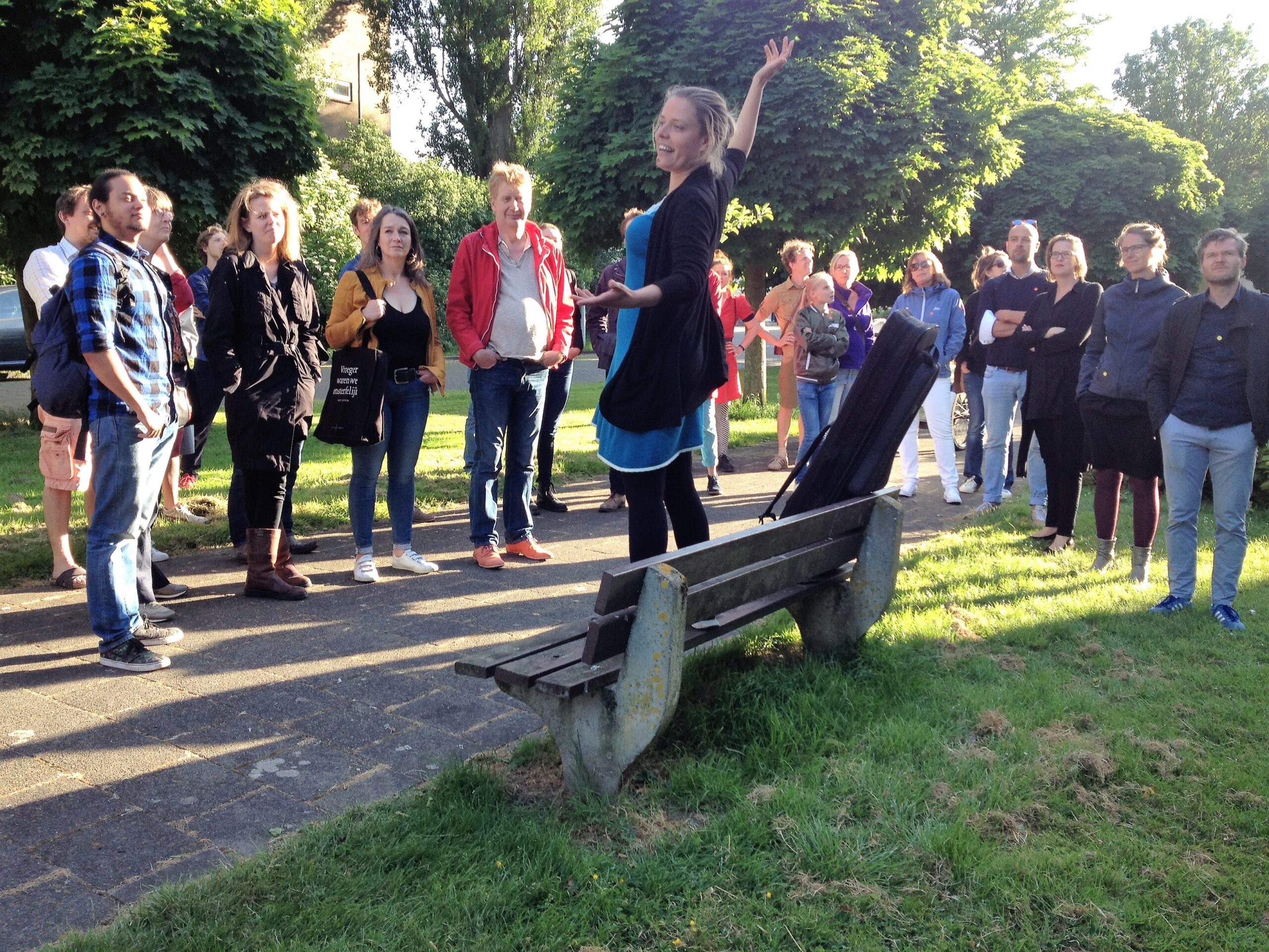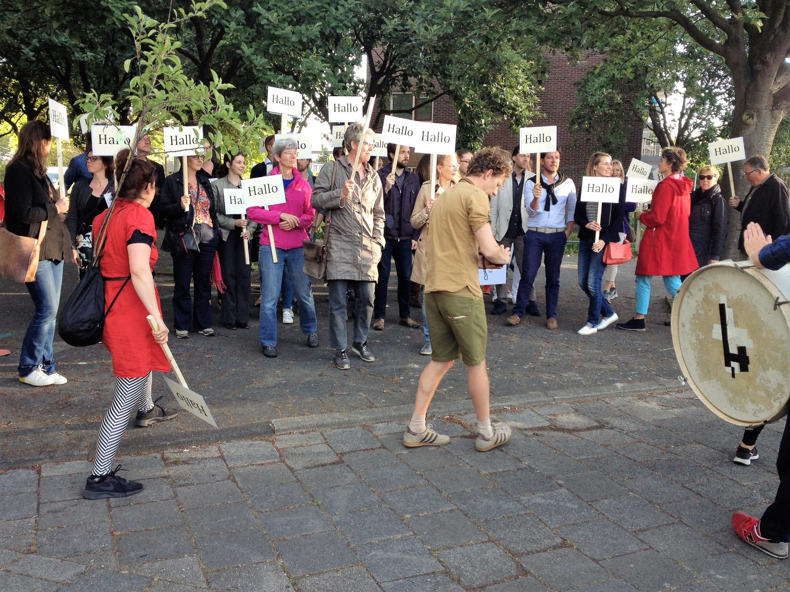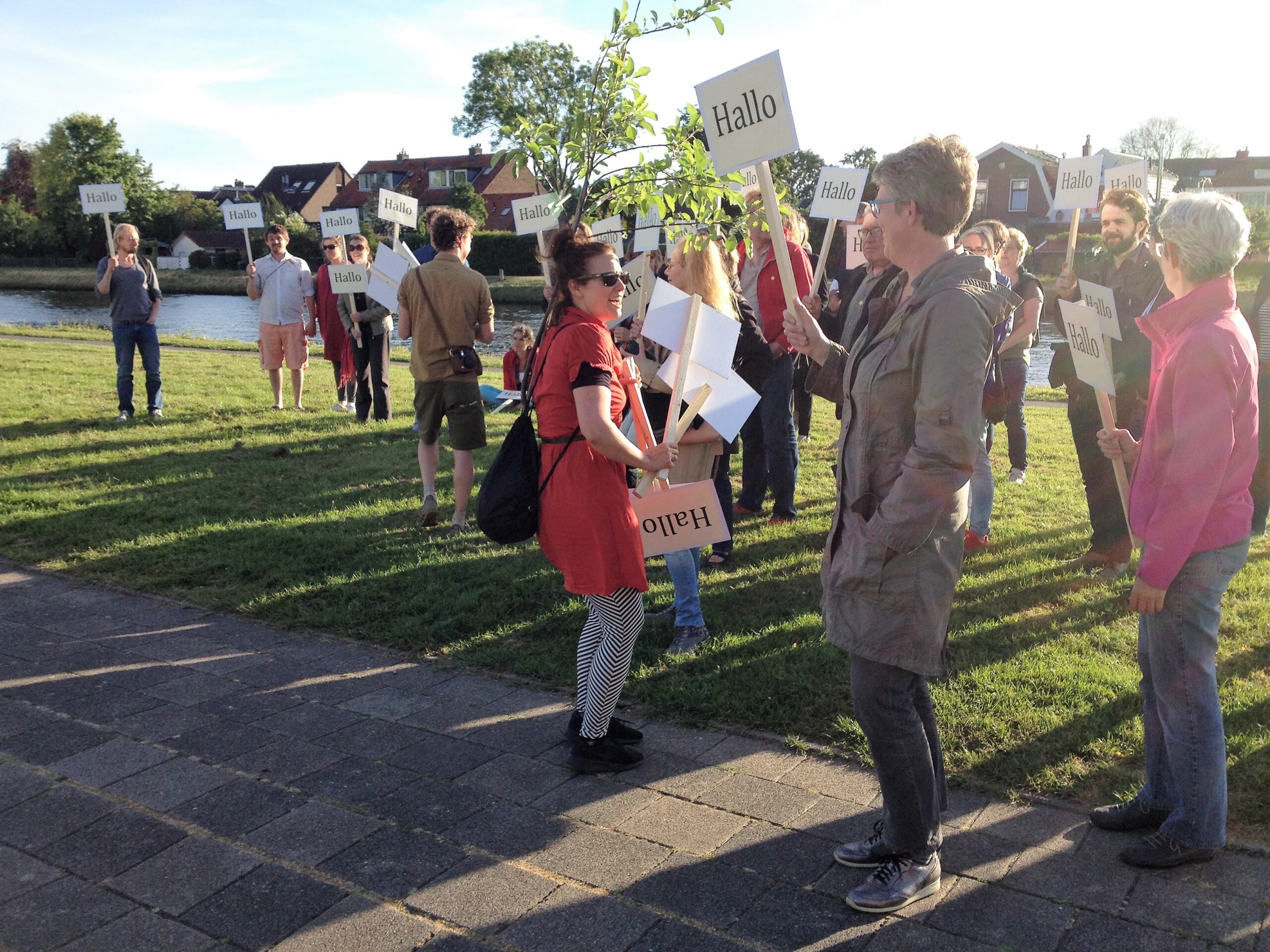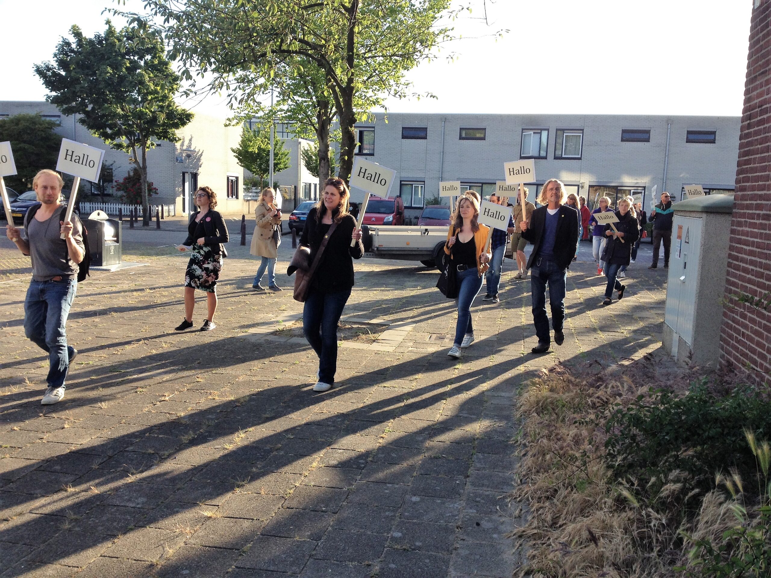 De medewerking van de bewoners versterkt de voorstelling enorm. Dat doet ook het loslaten van de wijk. We wandelen een stukje door de wijk, zónder de koptelefoons maar met live gesprekken en spel. Het werkt veel beter dan de audio tour uit eerdere versies. De toeschouwer hoort over zwevende flats, over revolutiebouw, over straatnaamkeuzes (wat doet Kennedy tussen de componisten?). We planten een boom “tot over 75 jaar. Succes!”, zien een spelletje gespeeld – waarheid, durven, doen – lopen met ‘Hallo’borden door de buurt en worden opvallend vaak terug gegroet.