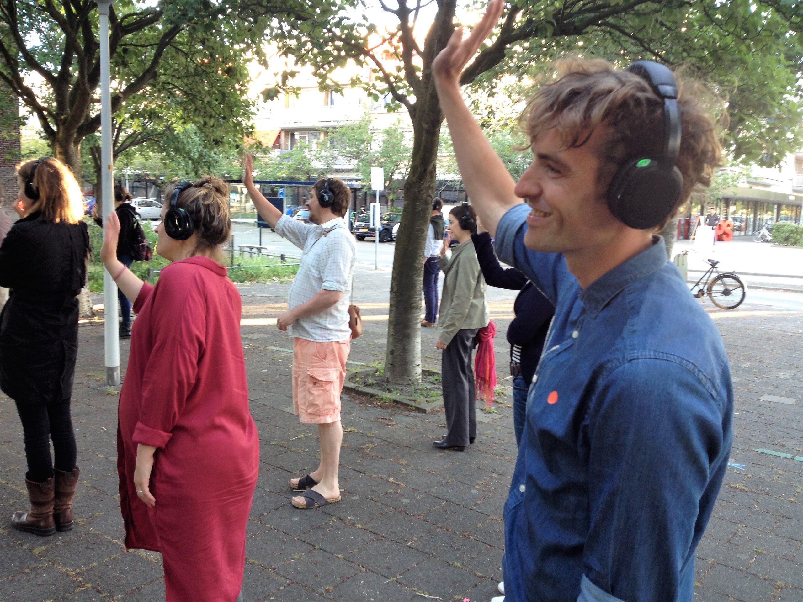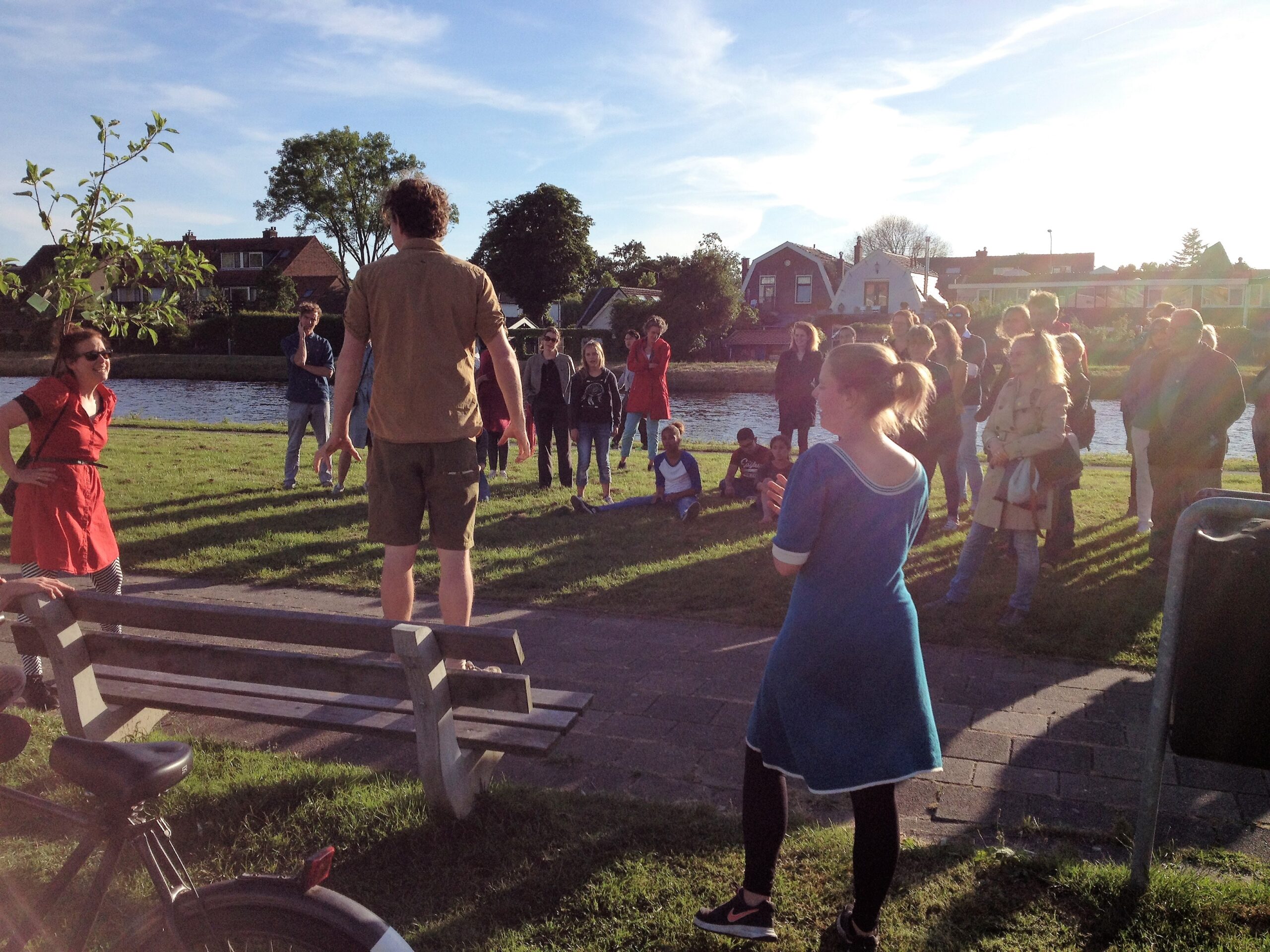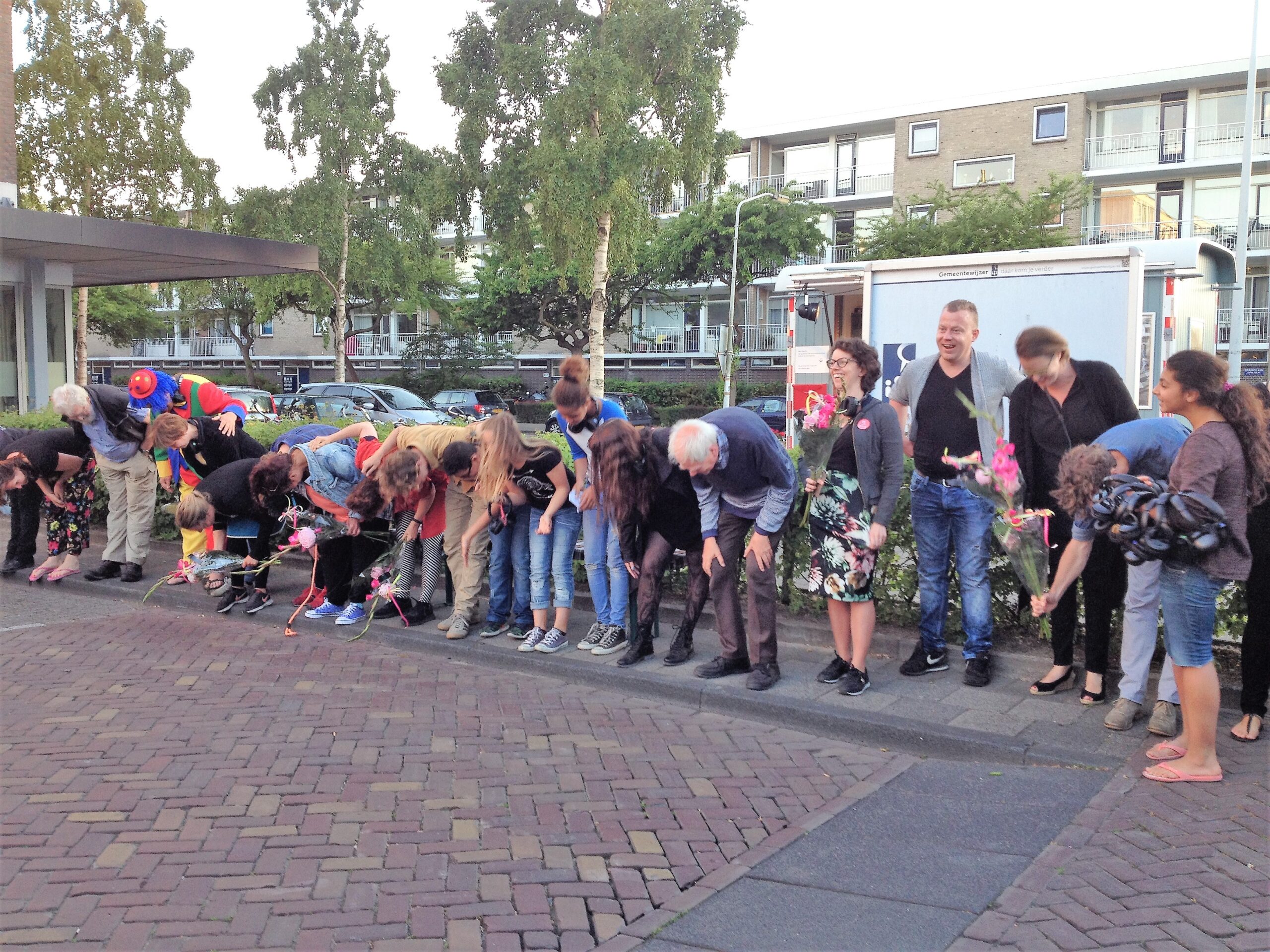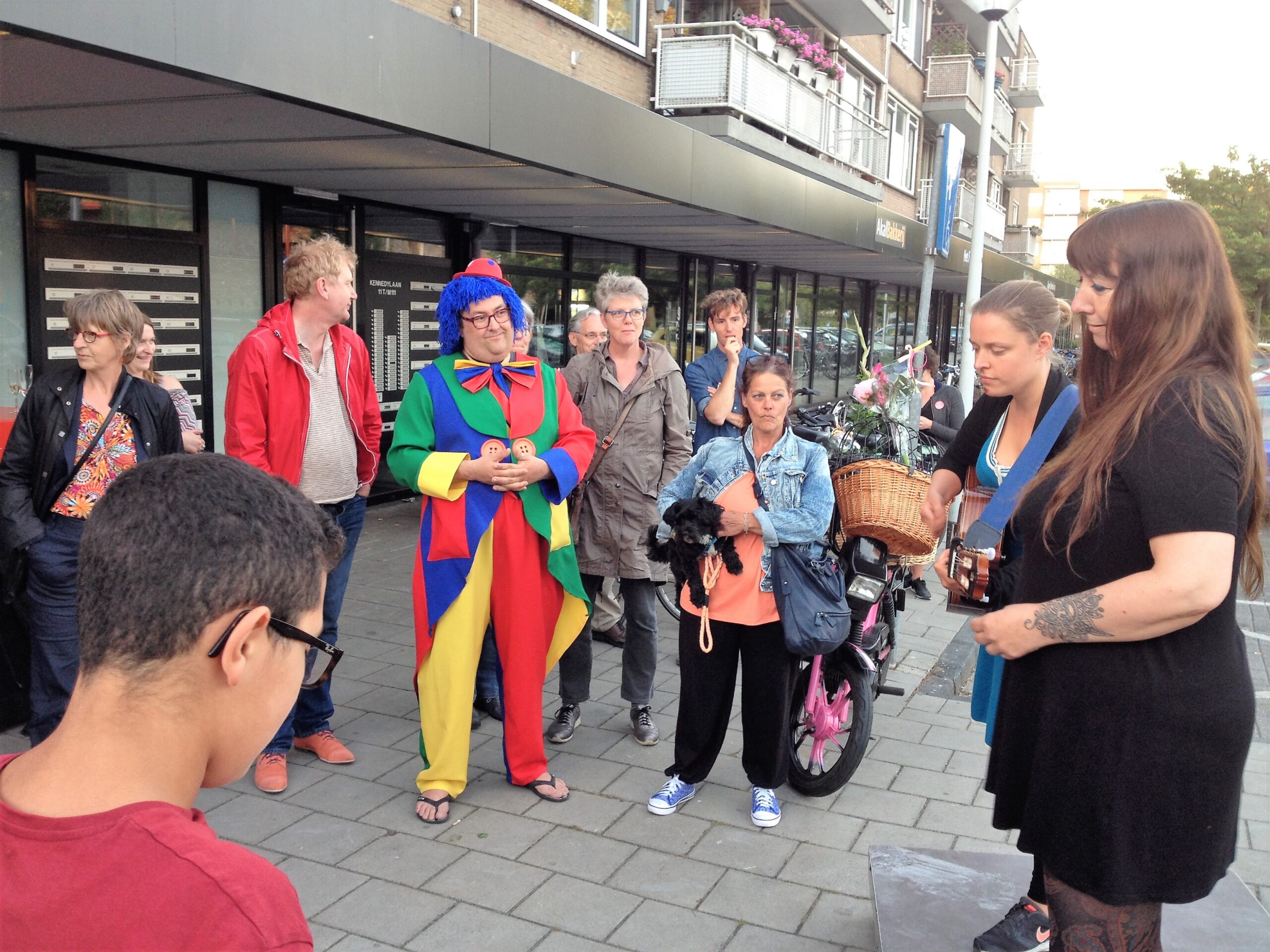 De medewerking van de bewoners versterkt de voorstelling enorm. Dat doet ook het loslaten van de wijk. We wandelen een stukje door de wijk, zónder de koptelefoons maar met live gesprekken en spel. Het werkt veel beter dan de audio tour uit eerdere versies. De toeschouwer hoort over zwevende flats, over revolutiebouw, over straatnaamkeuzes (wat doet Kennedy tussen de componisten?). We planten een boom “tot over 75 jaar. Succes!”, zien een spelletje gespeeld – waarheid, durven, doen – lopen met ‘Hallo’borden door de buurt en worden opvallend vaak terug gegroet.