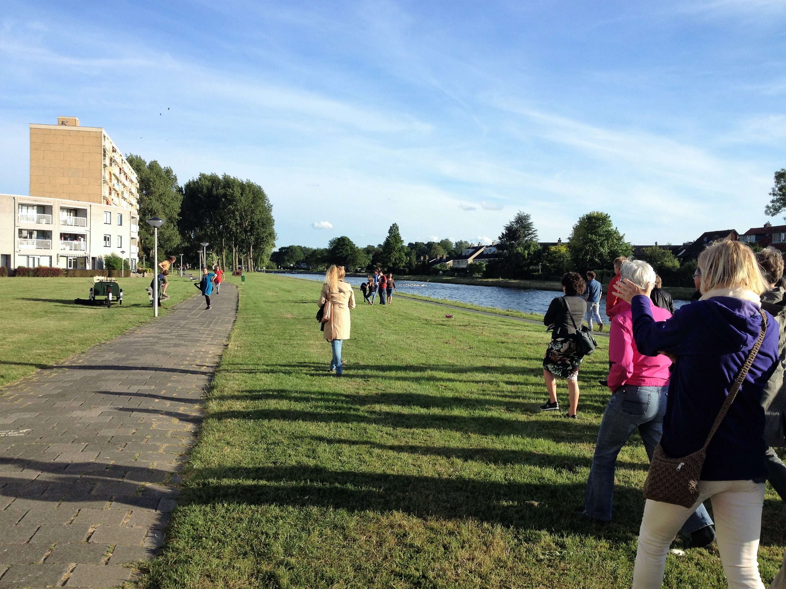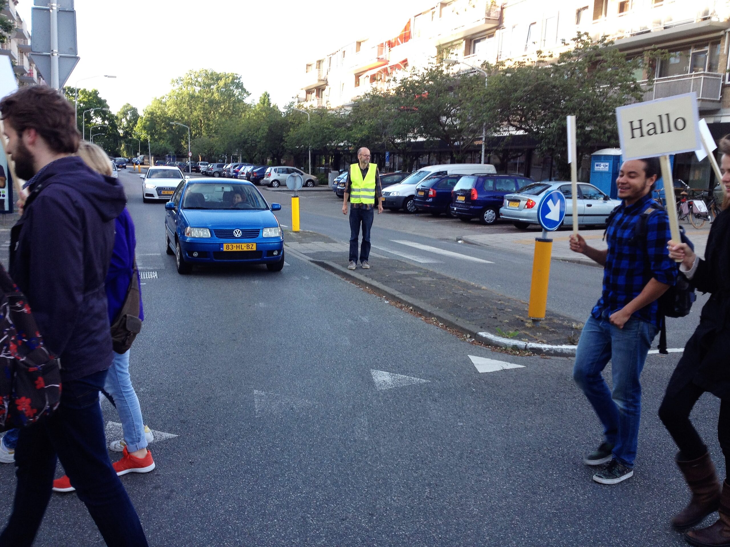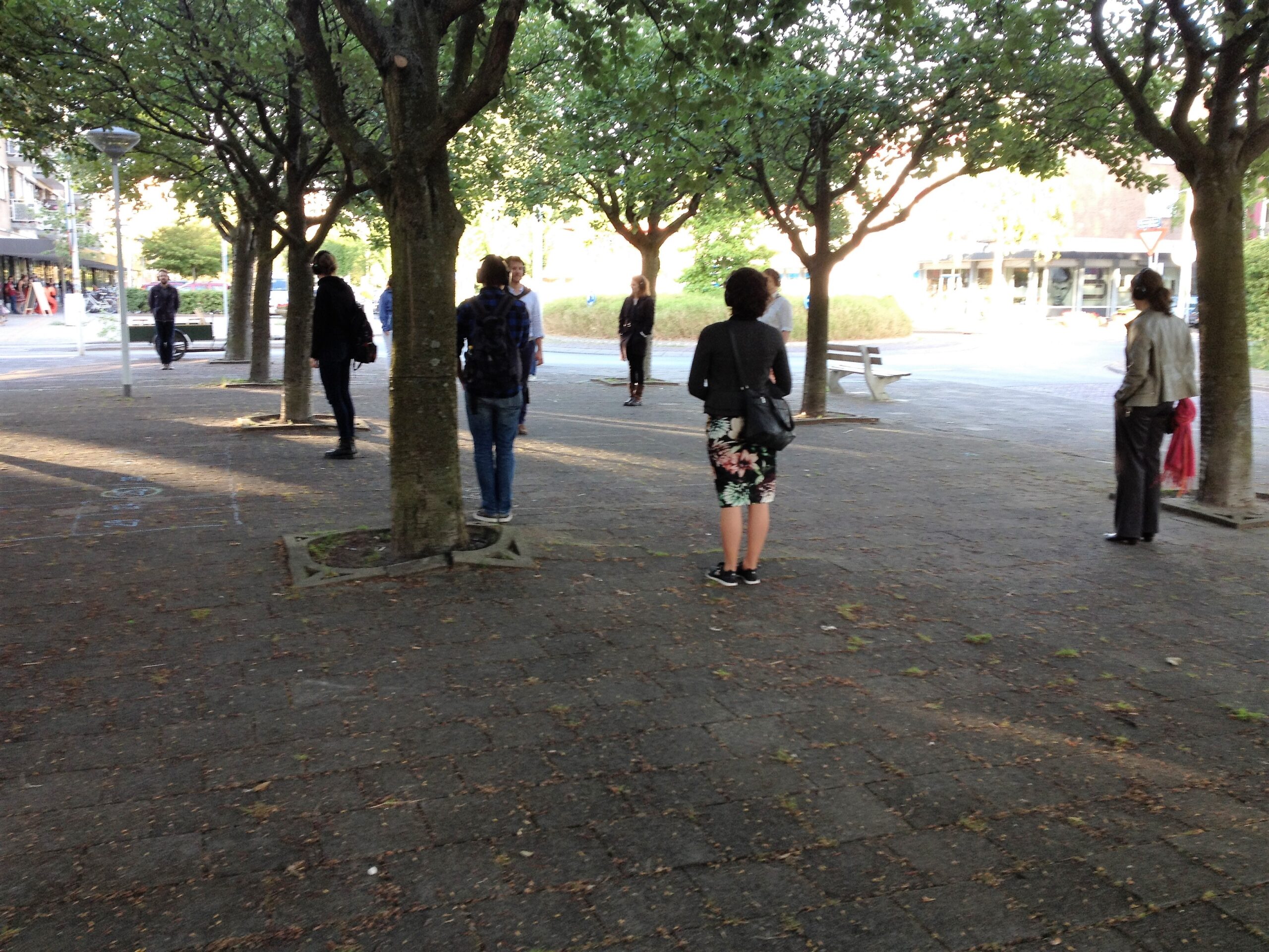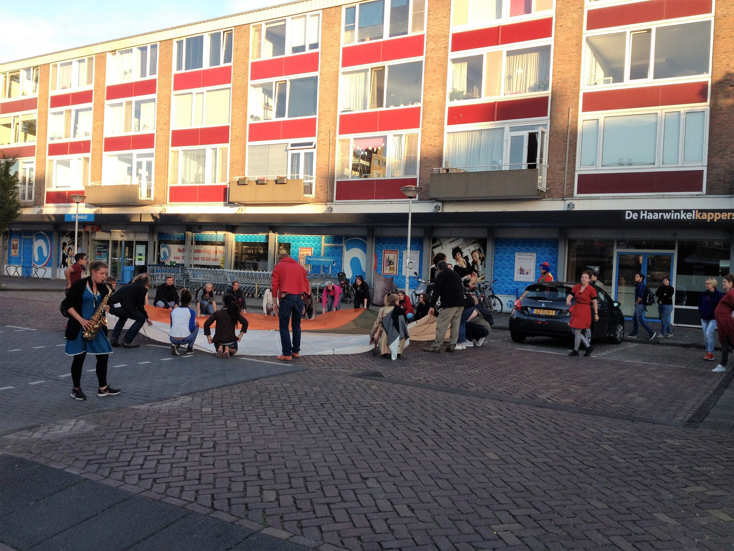 De medewerking van de bewoners versterkt de voorstelling enorm. Dat doet ook het loslaten van de wijk. We wandelen een stukje door de wijk, zónder de koptelefoons maar met live gesprekken en spel. Het werkt veel beter dan de audio tour uit eerdere versies. De toeschouwer hoort over zwevende flats, over revolutiebouw, over straatnaamkeuzes (wat doet Kennedy tussen de componisten?). We planten een boom “tot over 75 jaar. Succes!”, zien een spelletje gespeeld – waarheid, durven, doen – lopen met ‘Hallo’borden door de buurt en worden opvallend vaak terug gegroet.