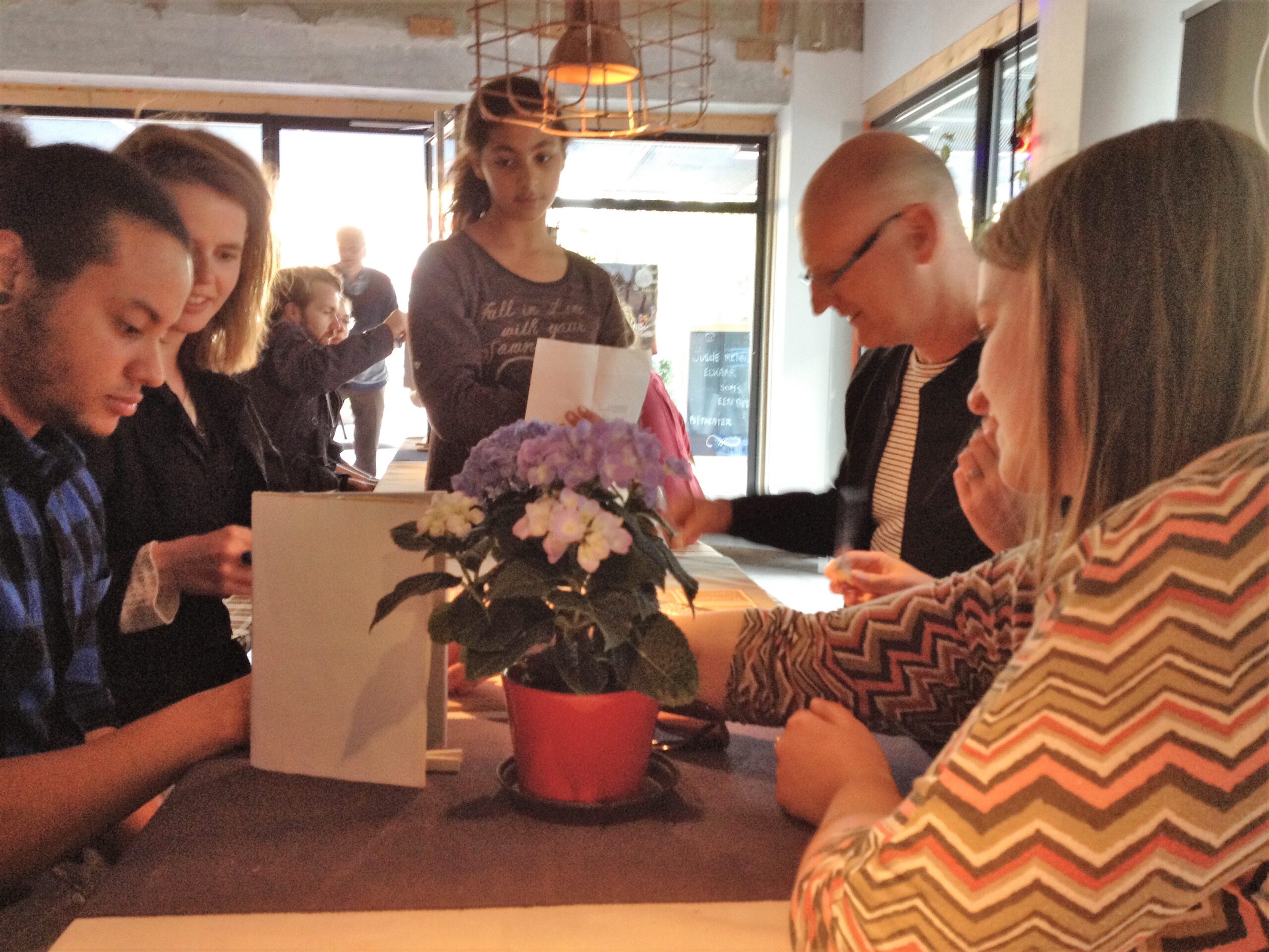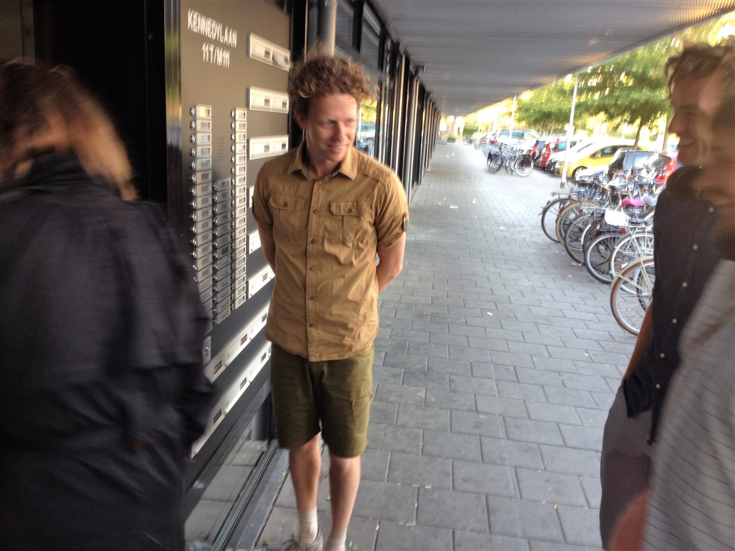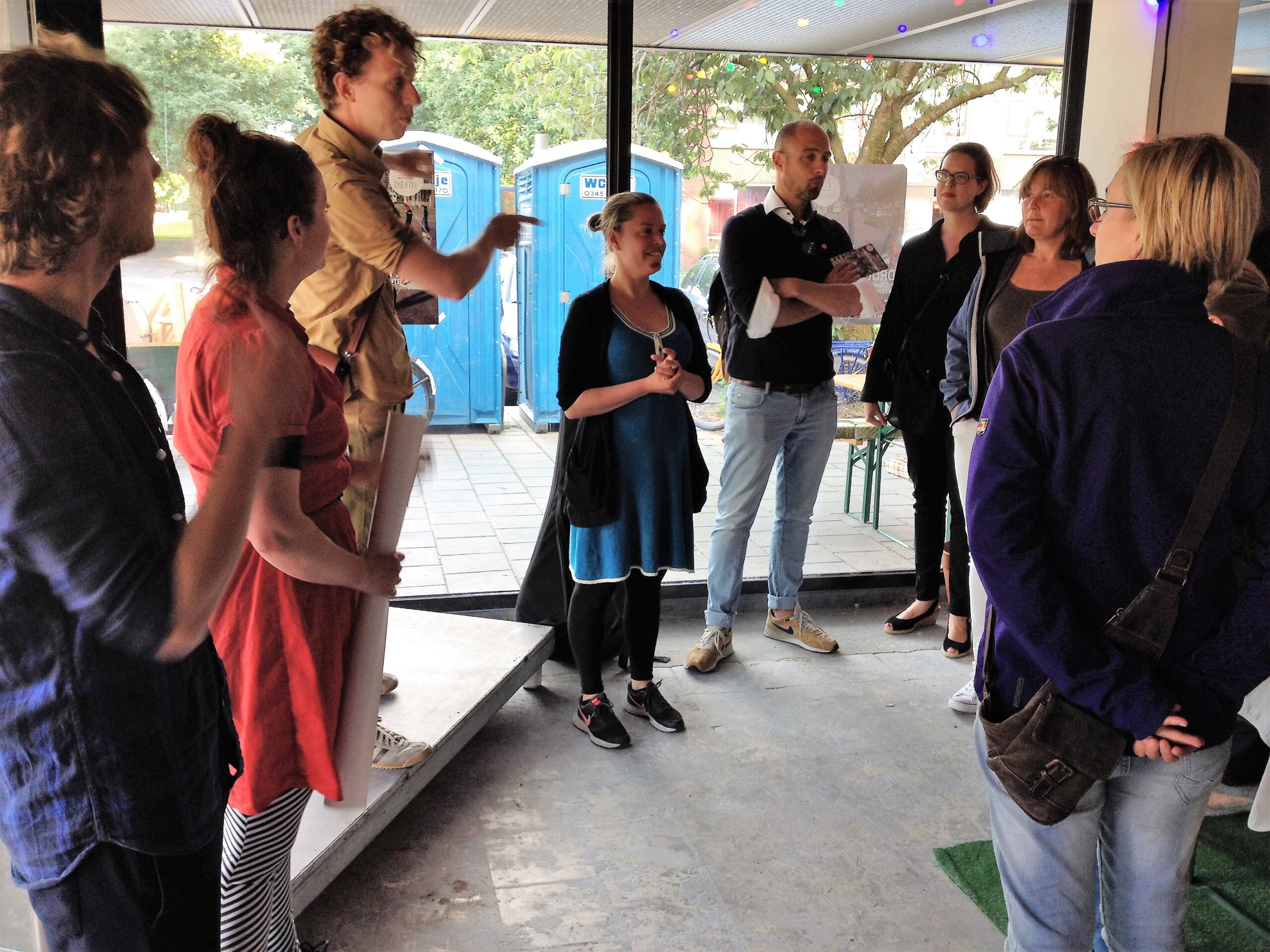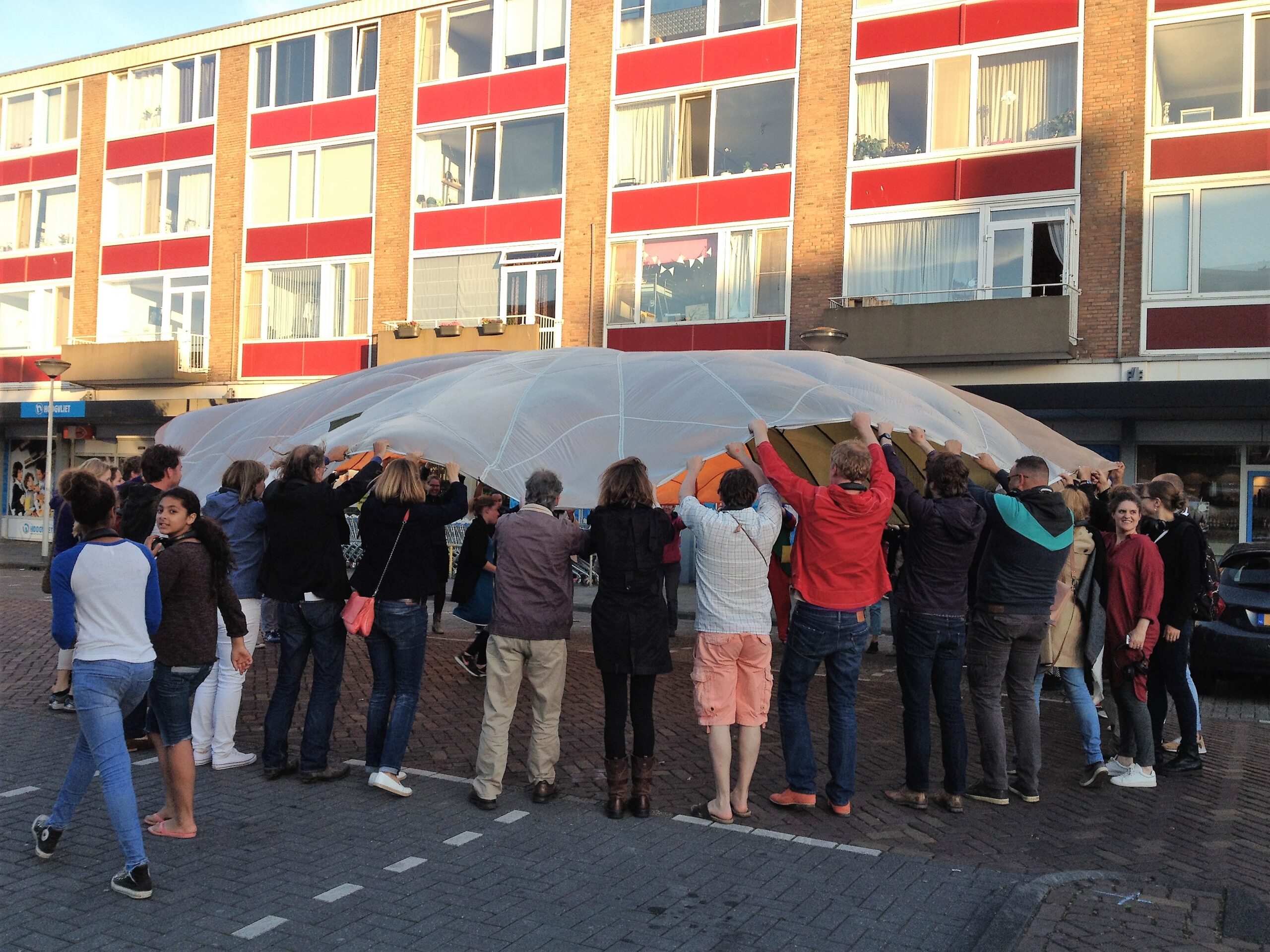 De medewerking van de bewoners versterkt de voorstelling enorm. Dat doet ook het loslaten van de wijk. We wandelen een stukje door de wijk, zónder de koptelefoons maar met live gesprekken en spel. Het werkt veel beter dan de audio tour uit eerdere versies. De toeschouwer hoort over zwevende flats, over revolutiebouw, over straatnaamkeuzes (wat doet Kennedy tussen de componisten?). We planten een boom “tot over 75 jaar. Succes!”, zien een spelletje gespeeld – waarheid, durven, doen – lopen met ‘Hallo’borden door de buurt en worden opvallend vaak terug gegroet.