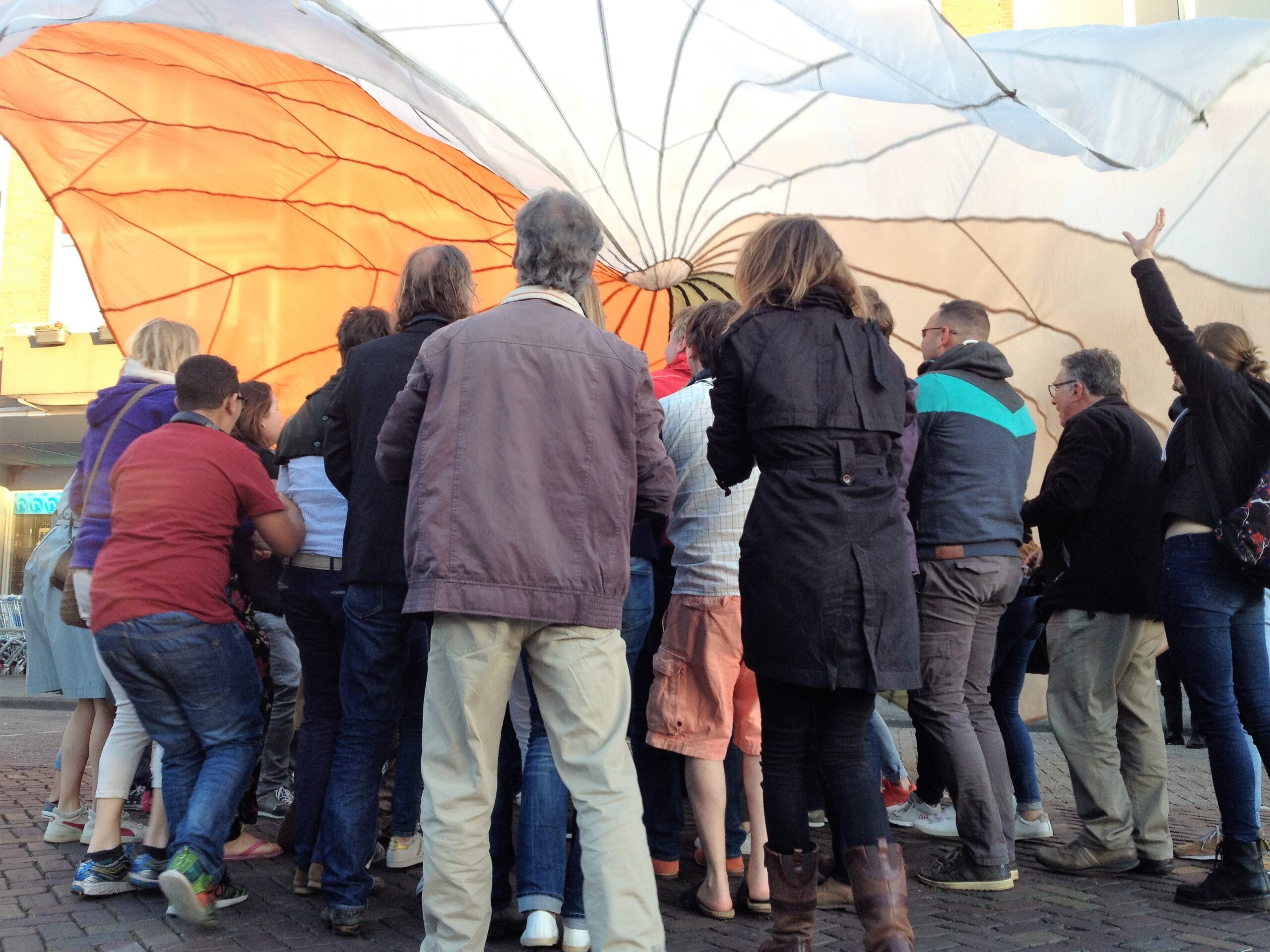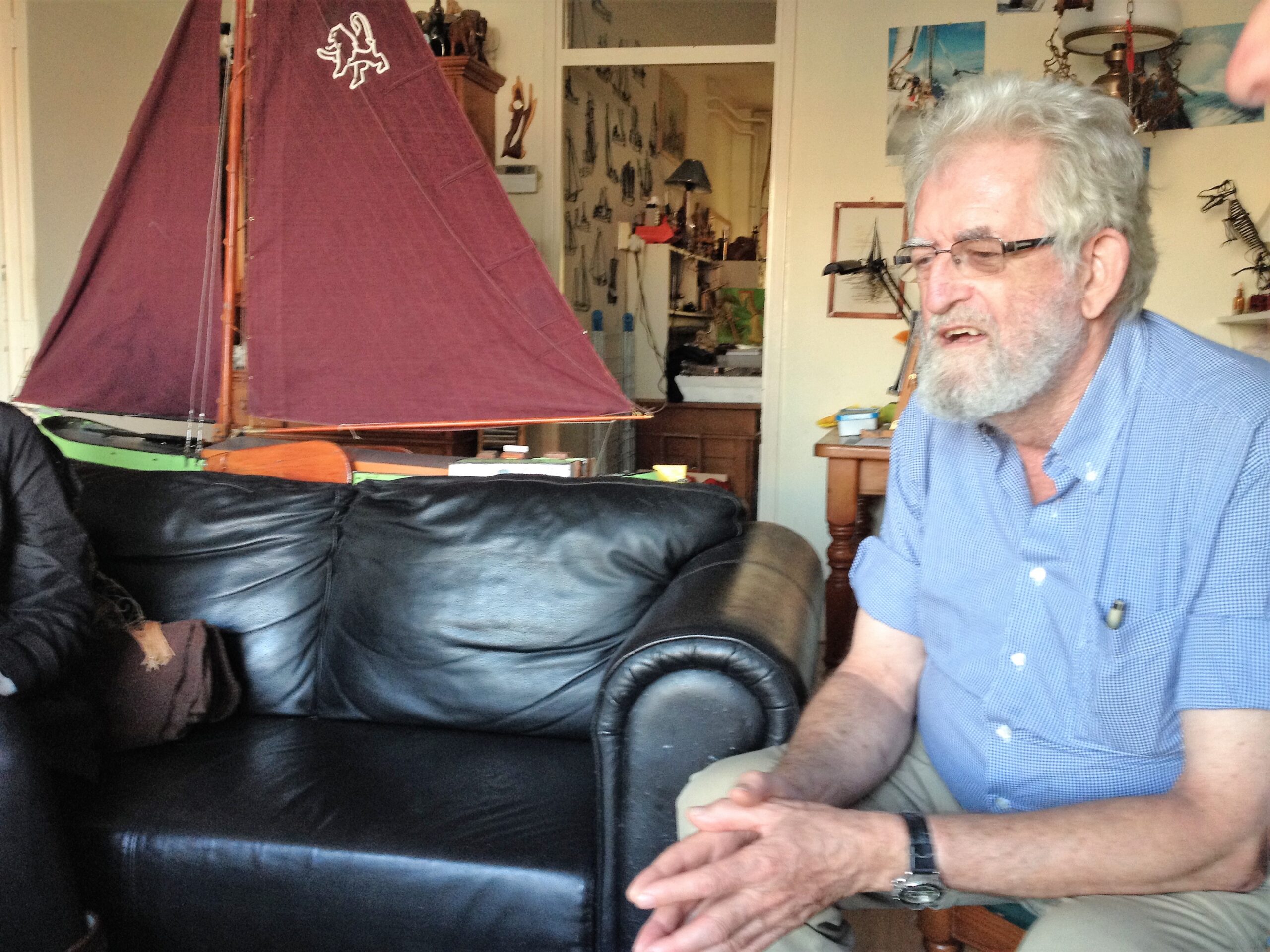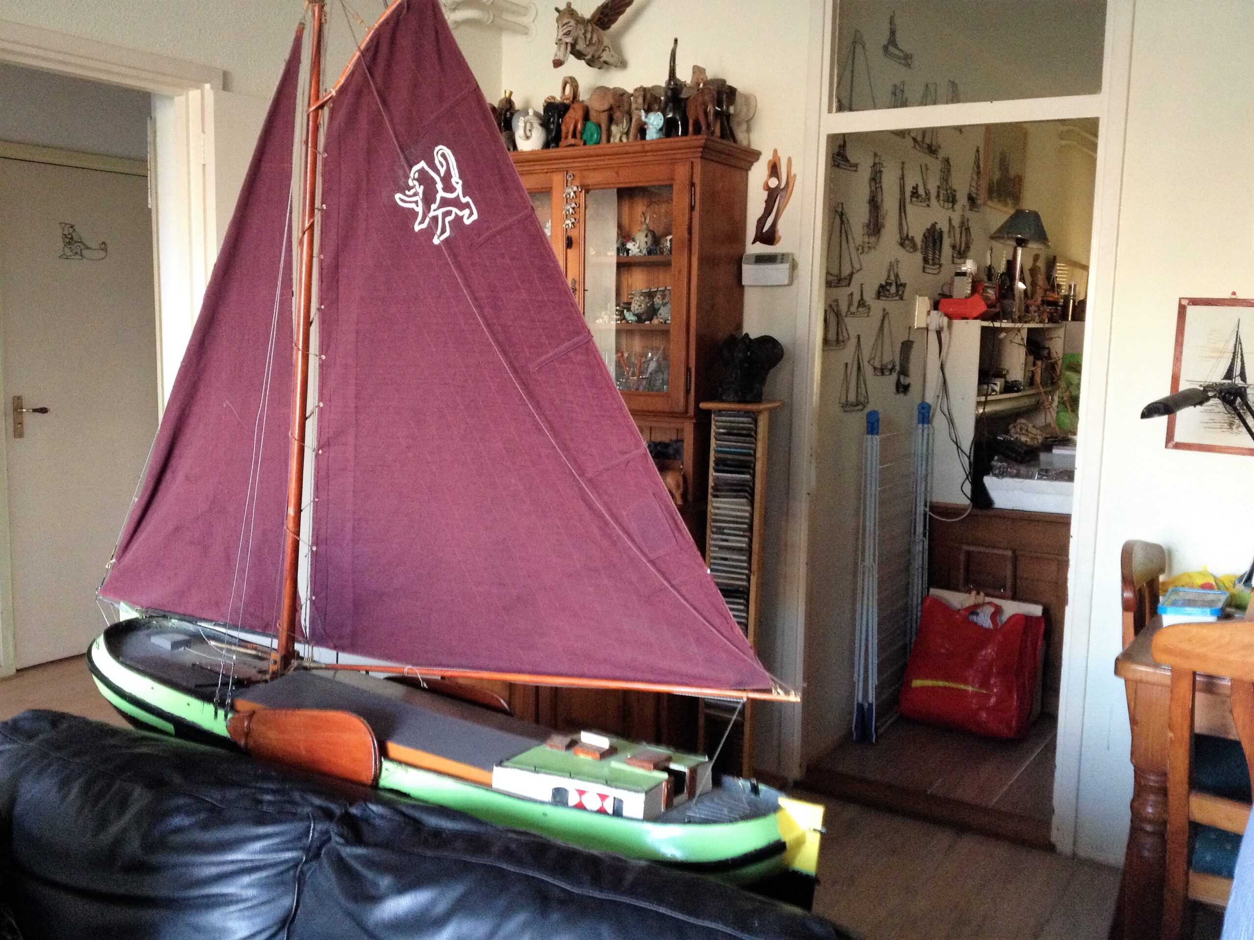 Keken we een paar jaar geleden met PS|theater nog bij de overburen aan de Raamsteeg naar binnen; dat doen we in zekere zin nu weer. In drie groepjes gesplitst zijn de toeschouwers te gast bij bewoners. Niet om de woningen door te banjeren, maar om – kort – kennis te maken. Dat in korte tijd ook veel over tafel kan gaan, maakten we mee bij Charles – volgens PS “zeg maar Sjarrel, op z’n Leids”. Een begenadigd model(boot)bouwer en creatieve geest uit de categorie ‘wat m’n hoofd bedenkt, kan ik maken’ “Ik heb wel altijd lekker creatief bezig willen zijn”. Samen met de hond “een erfenis van m’n vrouw” woont hij alleen boven de winkels. Hij had graag willen gaan varen als beroep. Dat kwam er niet van. Nu vult een enorme modelskûtsje, die ook zeilt bij HMBC, de huiskamer, naast een kathedraal “een kilometer figuurzagen”, tal van hoefnagelfiguurtjes en een verzameling olifanten.