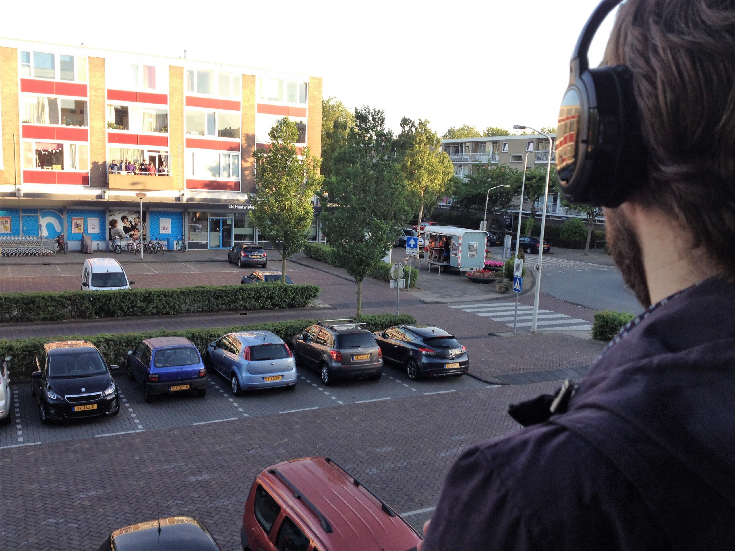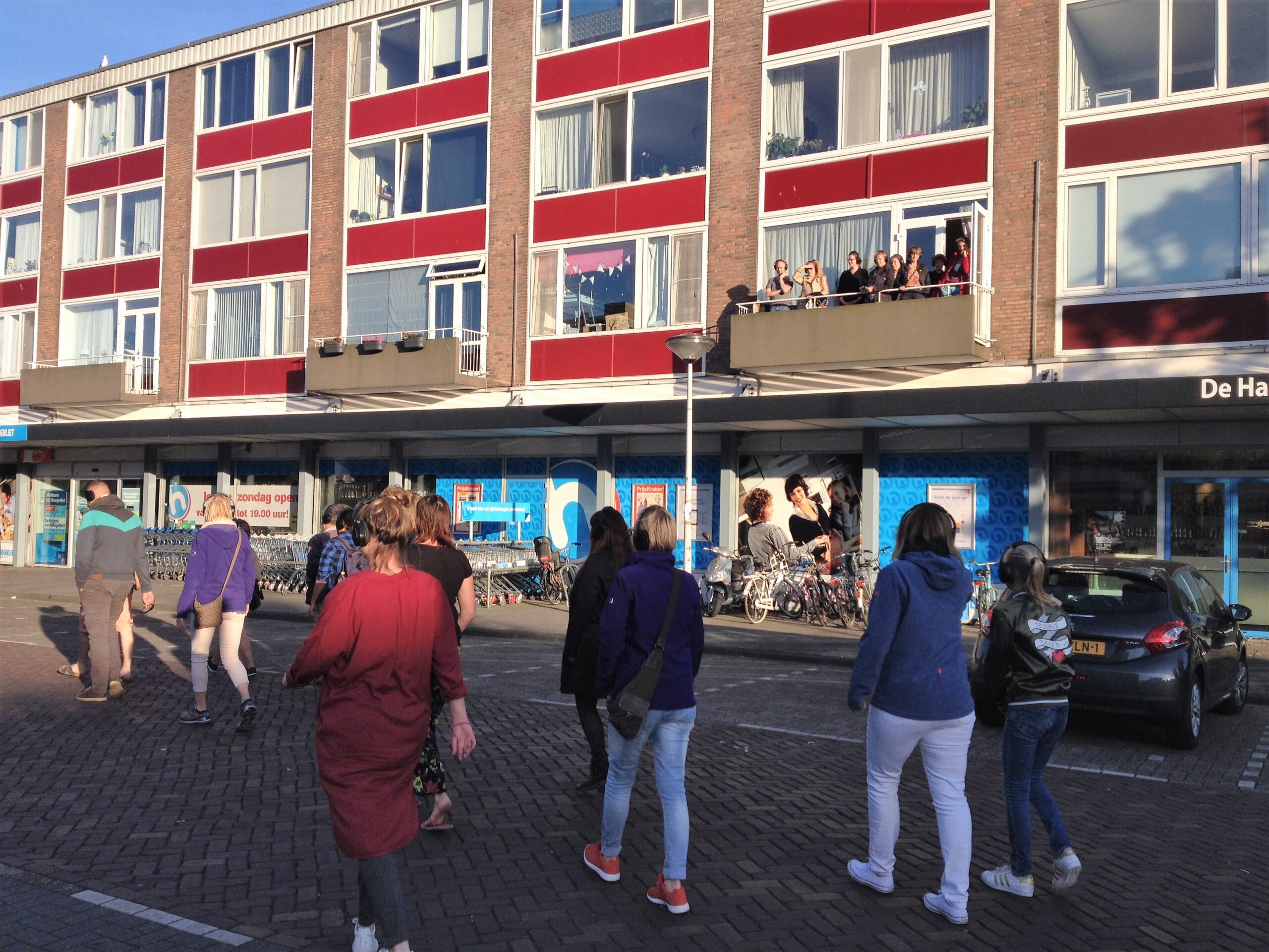 De drie balkons zijn ook uitkijkpunt, tribune voor de verhalen die via de koptelefoon worden verteld. Alsof de verteller een toevallige passant pakt en diens verhaal vertelt. Sandra en Frans zijn twee van die ‘figuranten’. En, nee, ze kenden elkaar vooraf niet en hebben ook geen enkele toneelervaring. Bewoner van het eerste uur Frans werd vanwege zijn website en zijn kennis van de wijk benaderd. Sandra was creatief bezig in Vogelvlucht toen de vraag voorbij kwam “maar ik moest even nadenken, hoor. Want ik had dit nooit eerder gedaan, en is iedereen wel te vertrouwen?”.