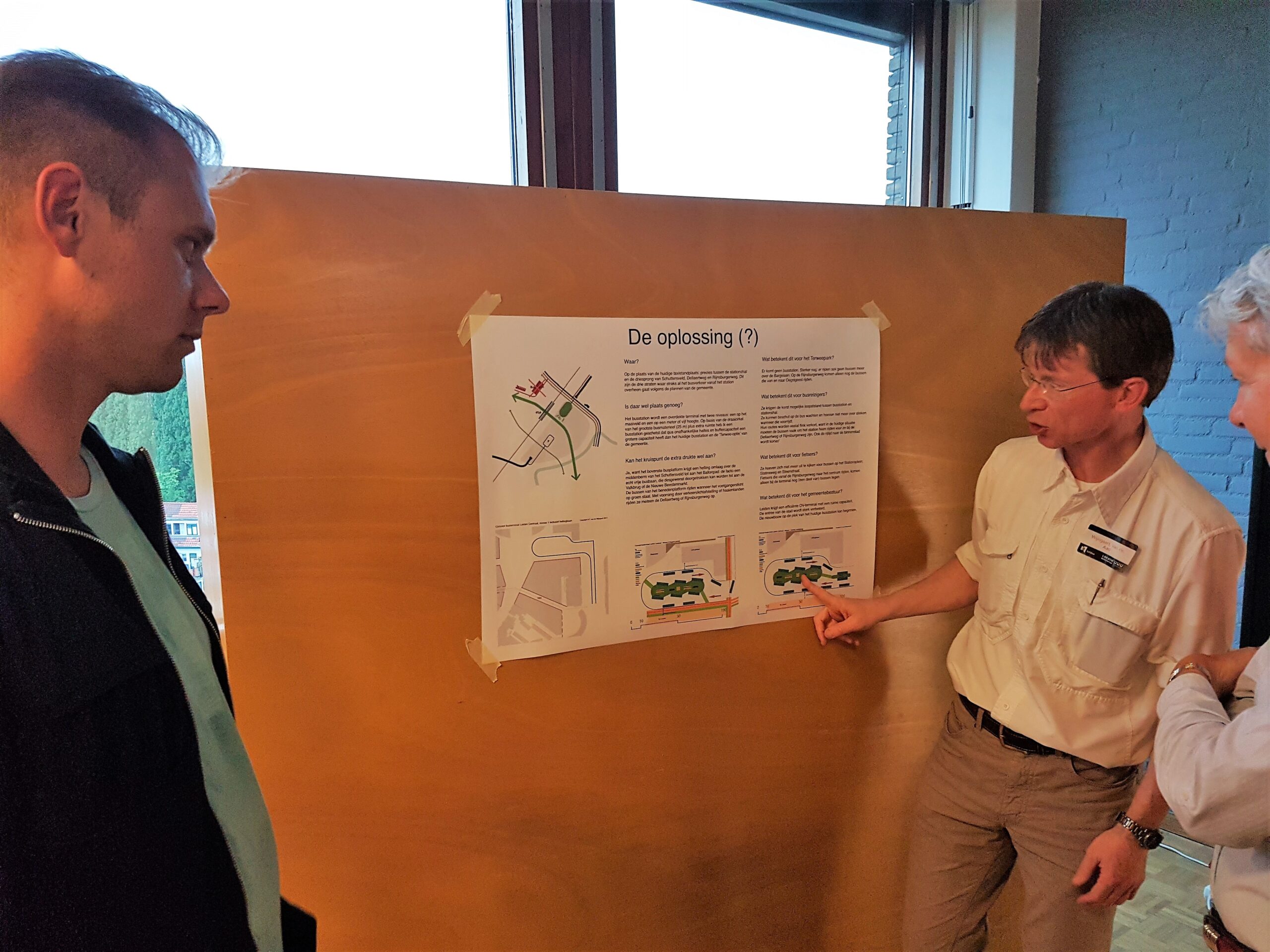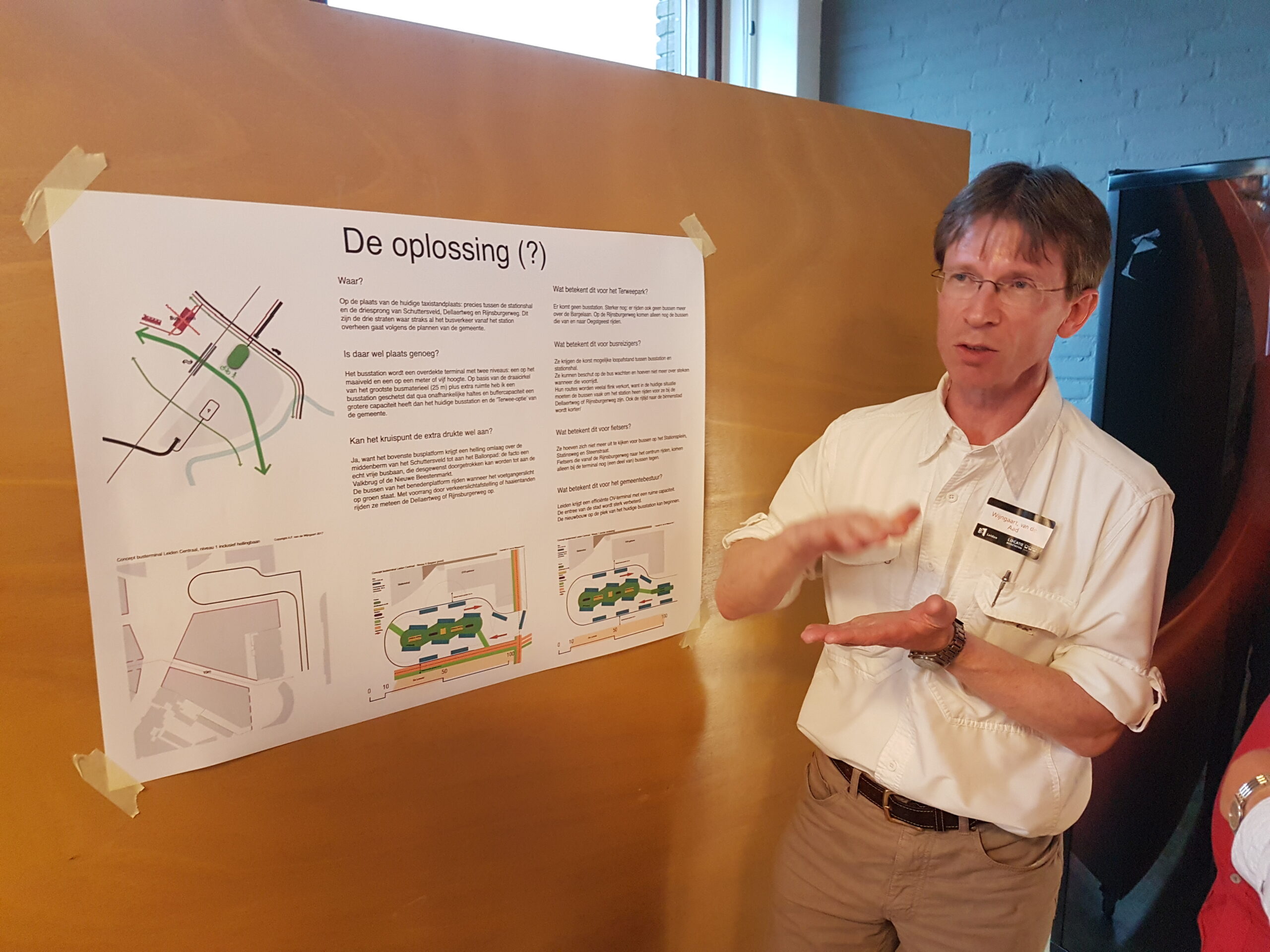Eén van de aanwezigen heeft een zeer constructieve bijdrage: een uitgewerkte oplossing, met (?) er achter. Zijn aanpak – benut de ruimte van de huidige taxistandplaats voor een dubbellaags busstation – lijkt veel steun te krijgen, ook van de gemeentelijke stedenbouwkundigen. “Maar een oplossing op structuurniveau kan sneuvelen bij detaildoorrekening”, zegt één van hen, die met de bedenker uitgebreid stil staat bij de tekeningen en achterliggende ideeën. De suggestie als dat de gemeente z’n werk niet goed deed door gaten en witte vlekken in de plannen te laten ontstaan, wordt als onheus ervaren. Alsof de gemeente niet direct al met de provincie, met Prorail en Arriva heeft gesproken.