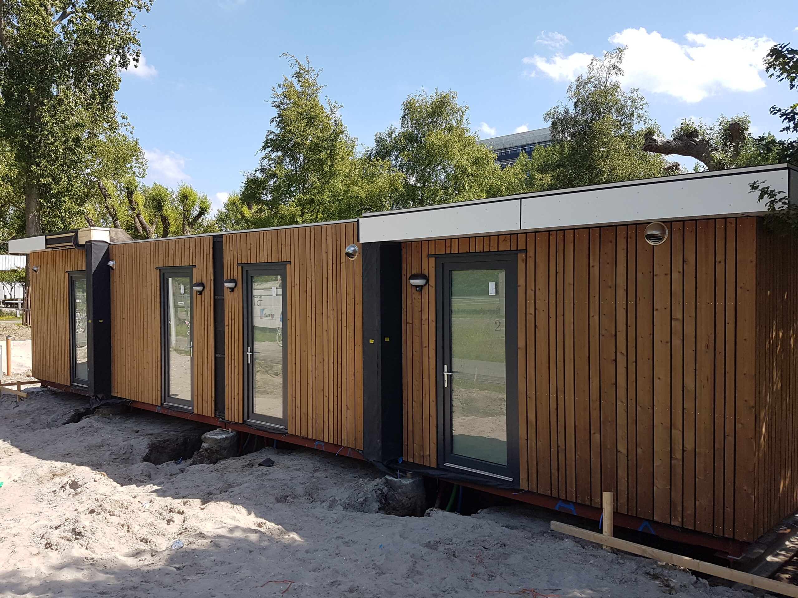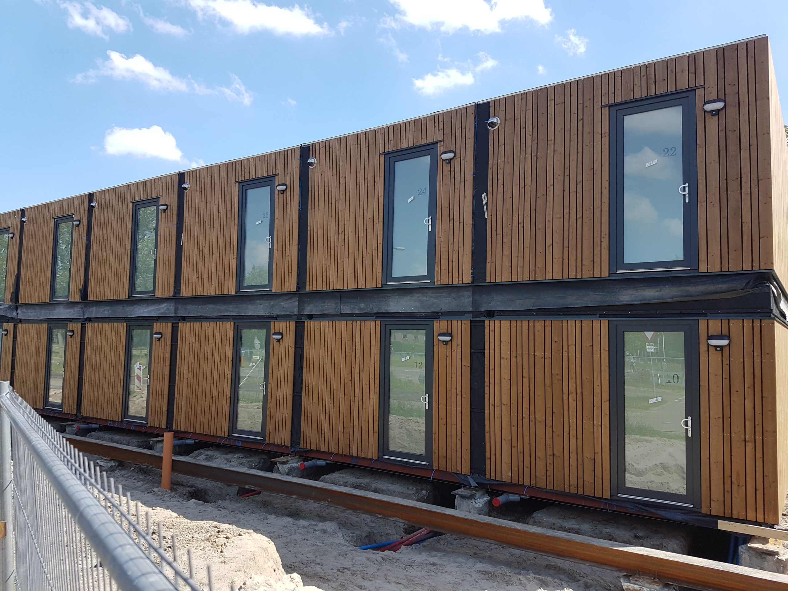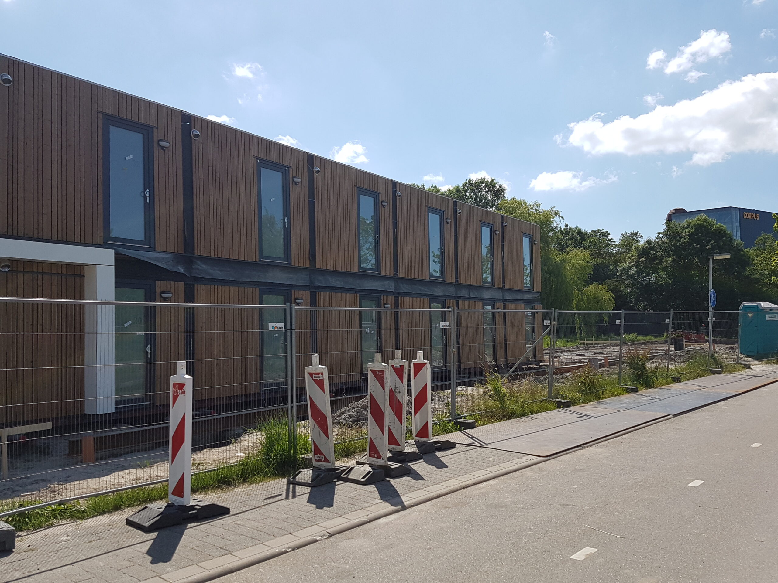 In opdracht van woningcorporatie Portaal zijn afgelopen zaterdag de eerste 16 tijdelijke woningen geplaatst op een terrein bij de Wassenaarseweg. In totaal komen er op de plek in de oksel van de A44 ter hoogte van museum Corpus dertig van dit soort studio’s. Ze blijven minimaal vijf jaar staan, maar waarschijnlijker is tien jaar.