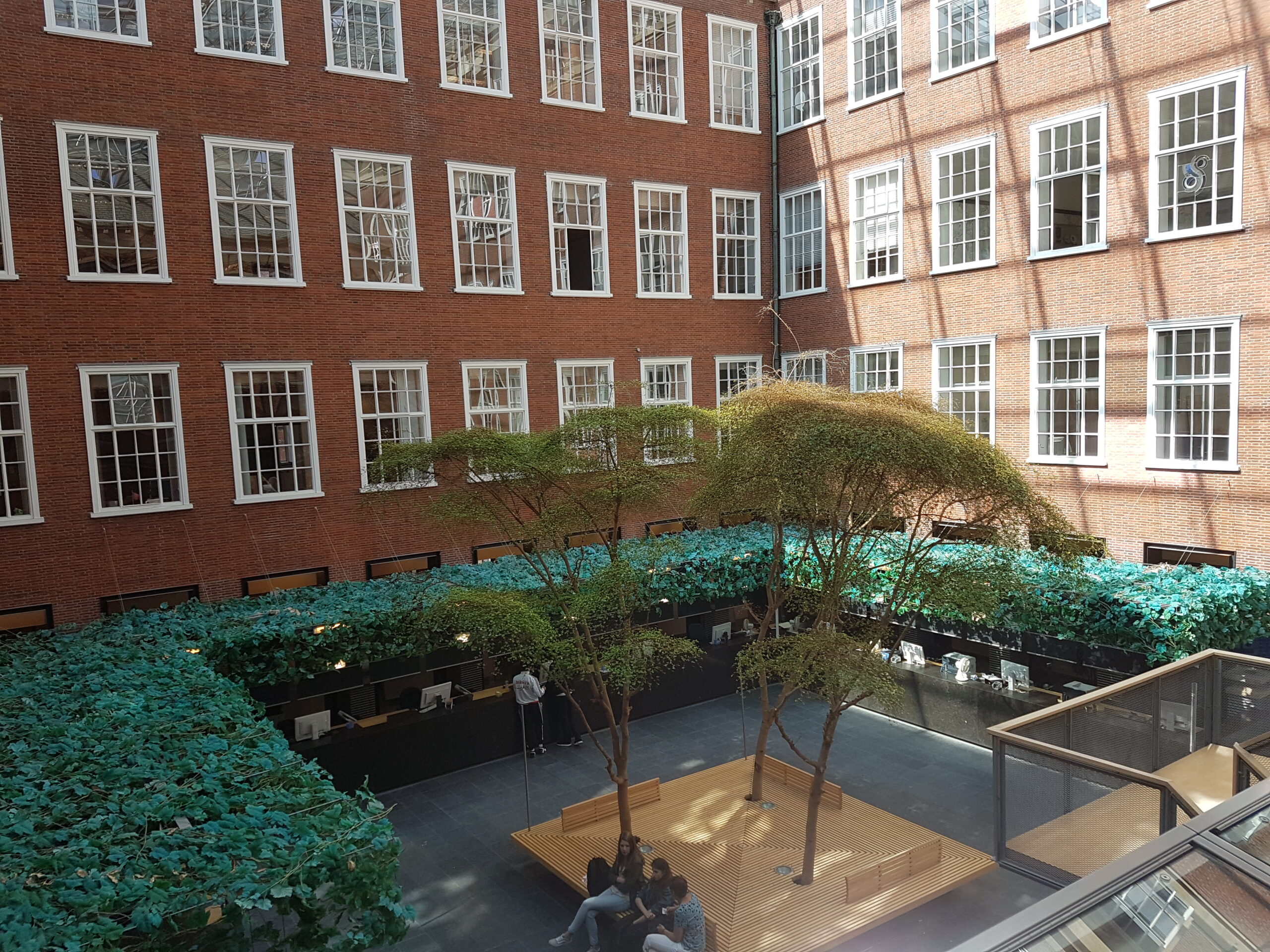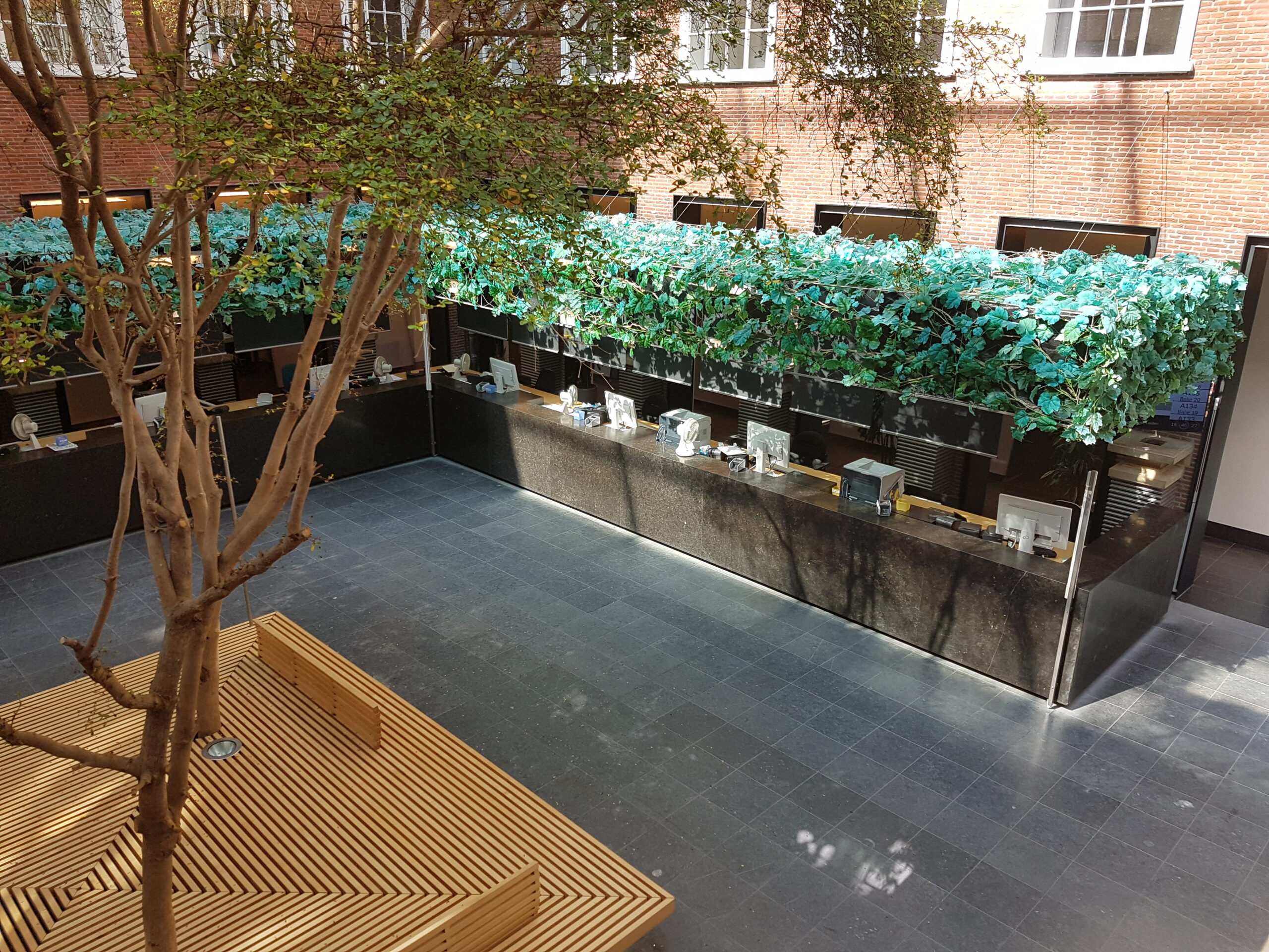 In het plan ‘Hof van Leiden’ wordt het atrium van het stadhuis ingericht als omsloten tuin, net als in het oorspronkelijke ontwerp van het stadhuis van architect C. J. Blaauw, uit de jaren dertig van de vorige eeuw. “Zo’n Hortus Conclusus geeft extra kwaliteit aan de omliggende kantoorverdiepingen,” denkt de selectiecommissie die unaniem voor dit ontwerp koos. “Bovendien sluit de groene hof aan op de beroemde hofjes van Leiden. Door de tuin in te zetten binnen het klimaatconcept van het gebouw, vormt het zowel een technische als symbolische bijdrage aan de duurzaamheidsambitie van de gemeente.”