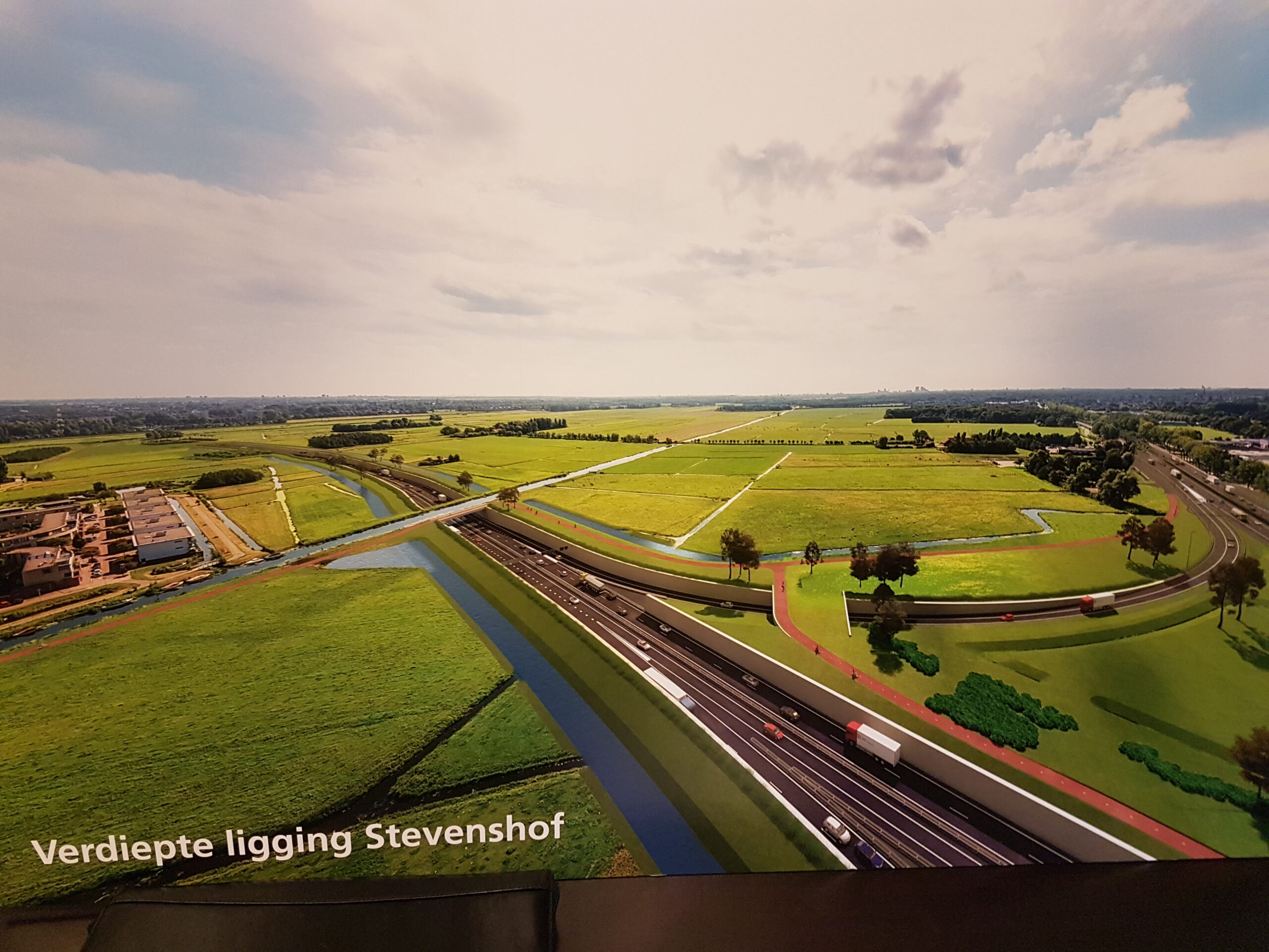 Chris de Waard sprak met Henk Osinga van de Wijkraad Stevenshof over de aanhoudende wens om de weg een paar meter dieper langs de wijk te laten lopen. Op min zeven in plaats van min vijf. Het gaat niet gebeuren.