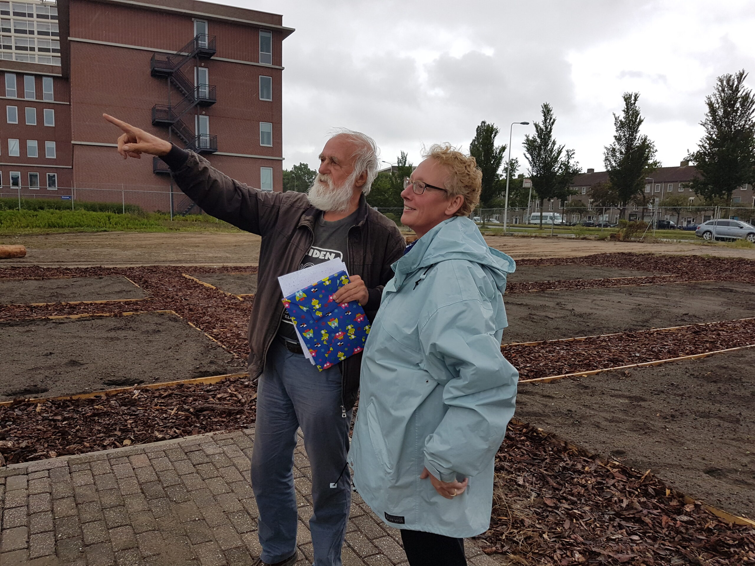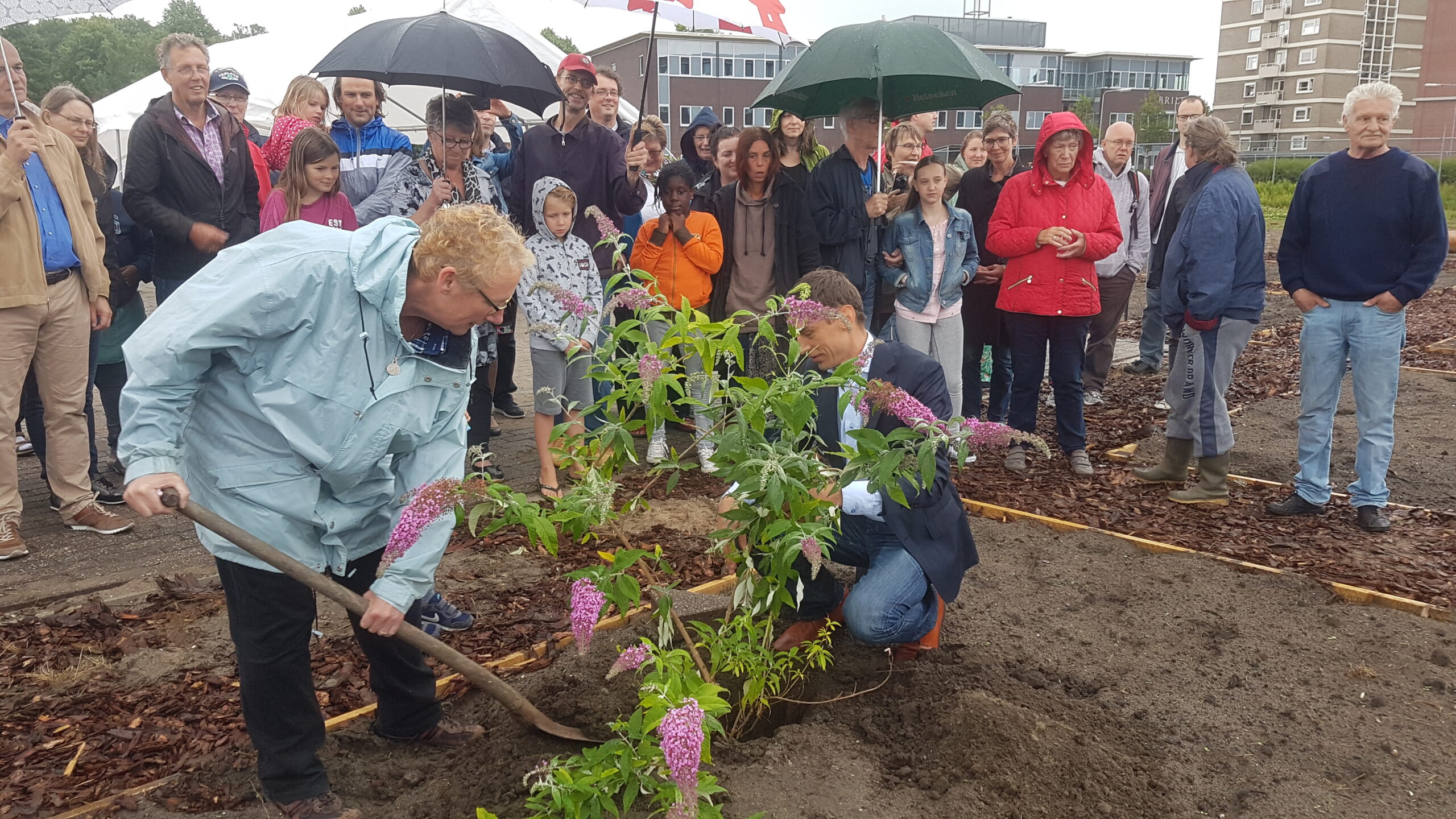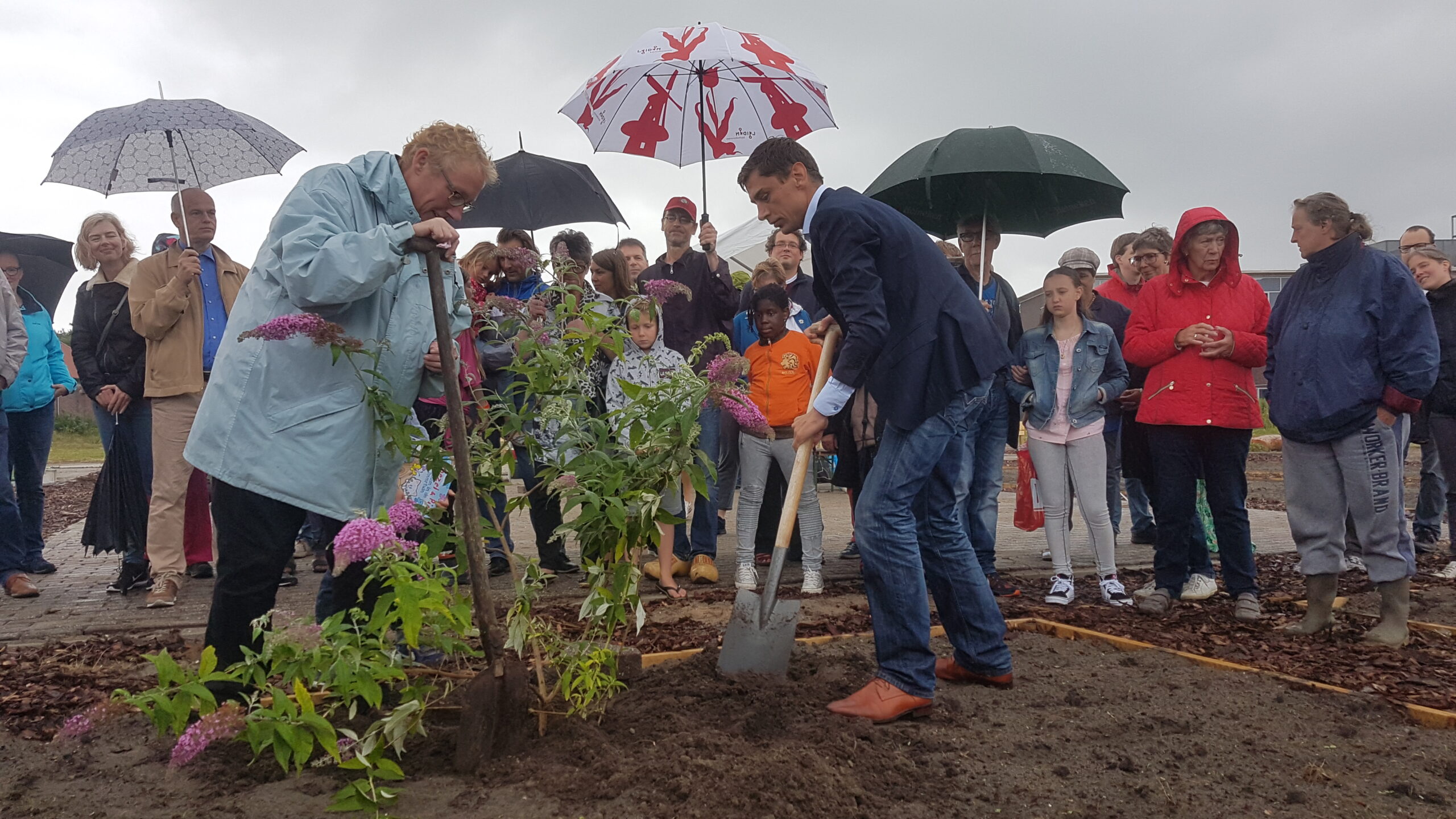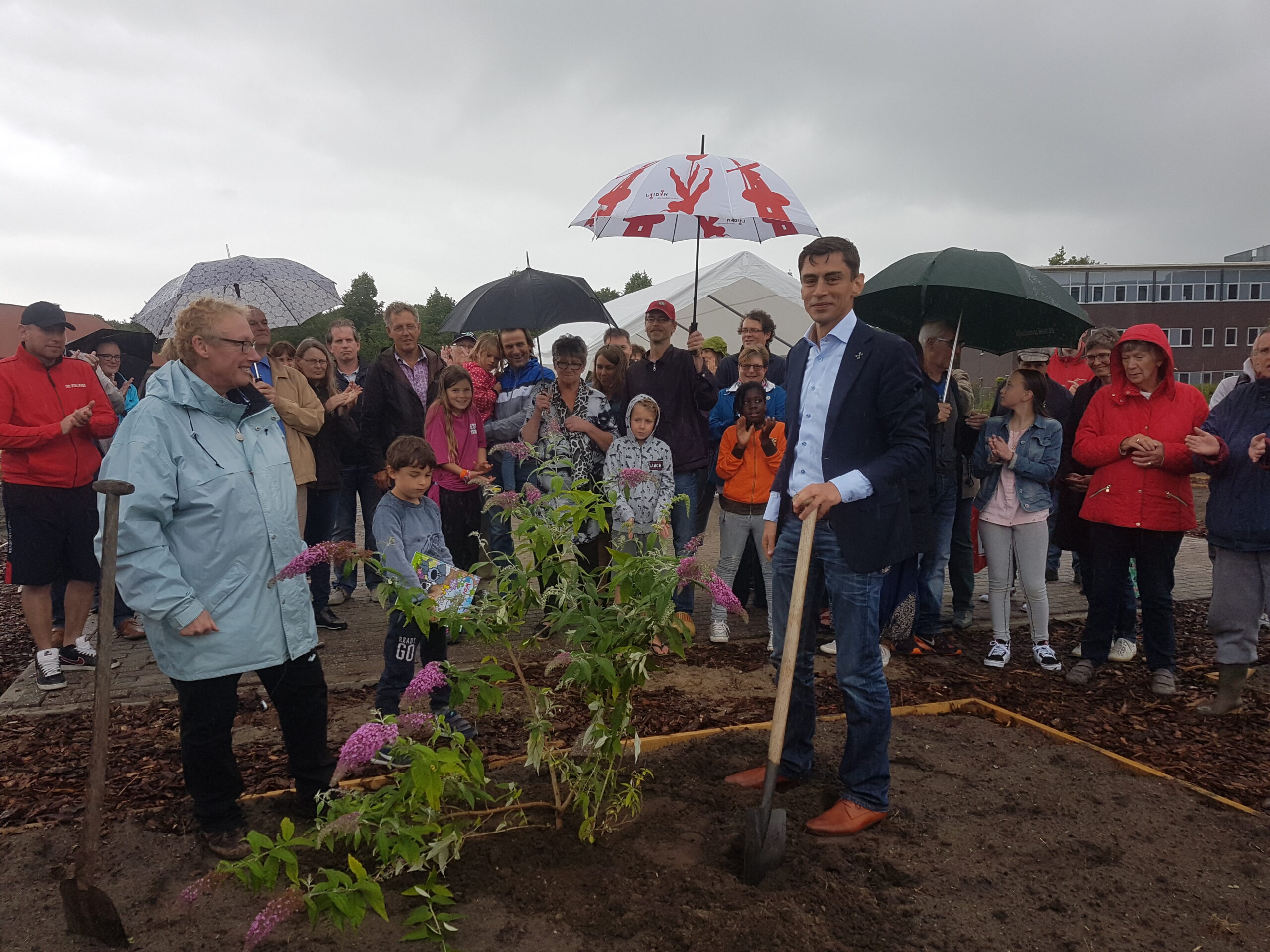 Die opening vond plaats in de regen: “Alleen vandaag is water geen probleem,” zo benoemde Groenendaal het enige echte probleem dat nog rest. Er is op het terrein geen water en dat is wel nodig als je bloemen en planten wilt laten groeien en groente wilt verbouwen. Buurman Zirkzee Wonen en Slapen zorgt vrijwel zeker voor de oplossing: “Ik denk dat we wel een buitenkraan kunnen aanleggen,” zei eigenaar Willem-Jan Zirkzee die ook even kwam kijken bij de feestelijke ingebruikname.