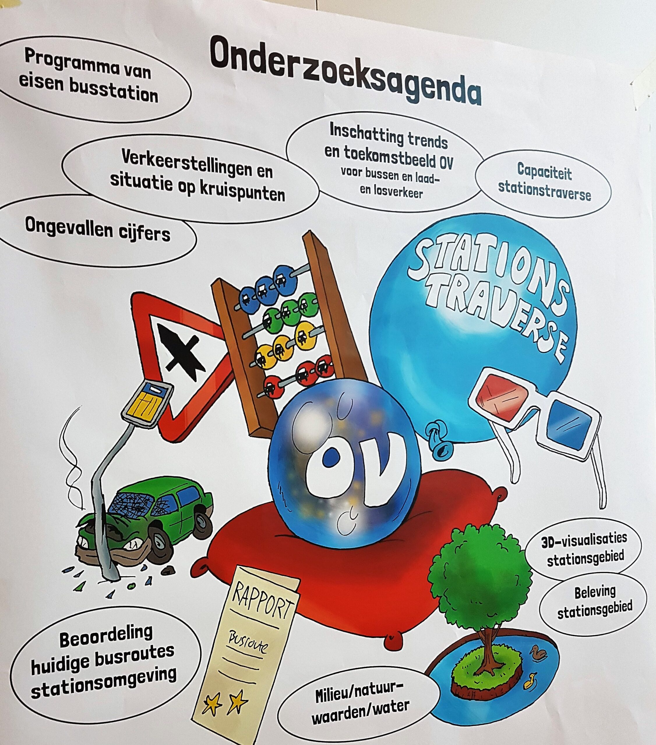 “Van rijp tot groen,” beseft ook Laudy. Een ondergrondse busterminal, een busstation van meerdere etages op de huidige taxi-plek, bussen onder of boven de treinsporen of zelfs helemaal bovenop het stationsgebouw. Ze zijn allemaal opgetekend en voor elke plek wordt uitgezocht hoe realistisch een busstation op elk van die plekken is.