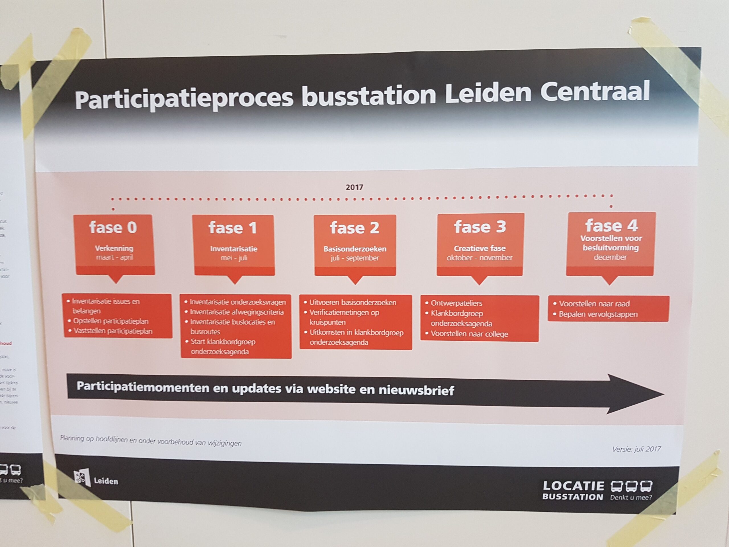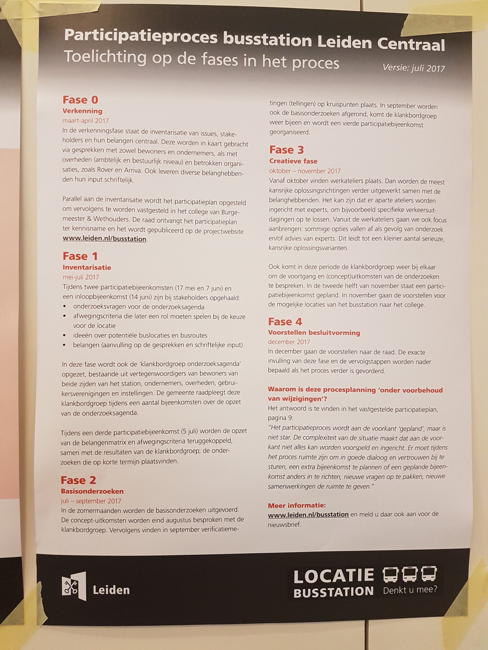 Dat nieuwe participatieproces is in volle gang en gisteravond werd de laatste bijeenkomst voor de vakantie gehouden in gebouw Nieuwe Energie. “Een terugkoppelavond,” zo noemde de gemeente de bijeenkomst waar de resultaten werden gedeeld die de drie voorgaande avonden had opgeleverd. “1500 vragen en suggesties op geeltjes, mails en brieven die de gemeente heeft ontvangen,” alles is bij elkaar gebracht en ook op de speciale website busstation.leiden.nl gezet.