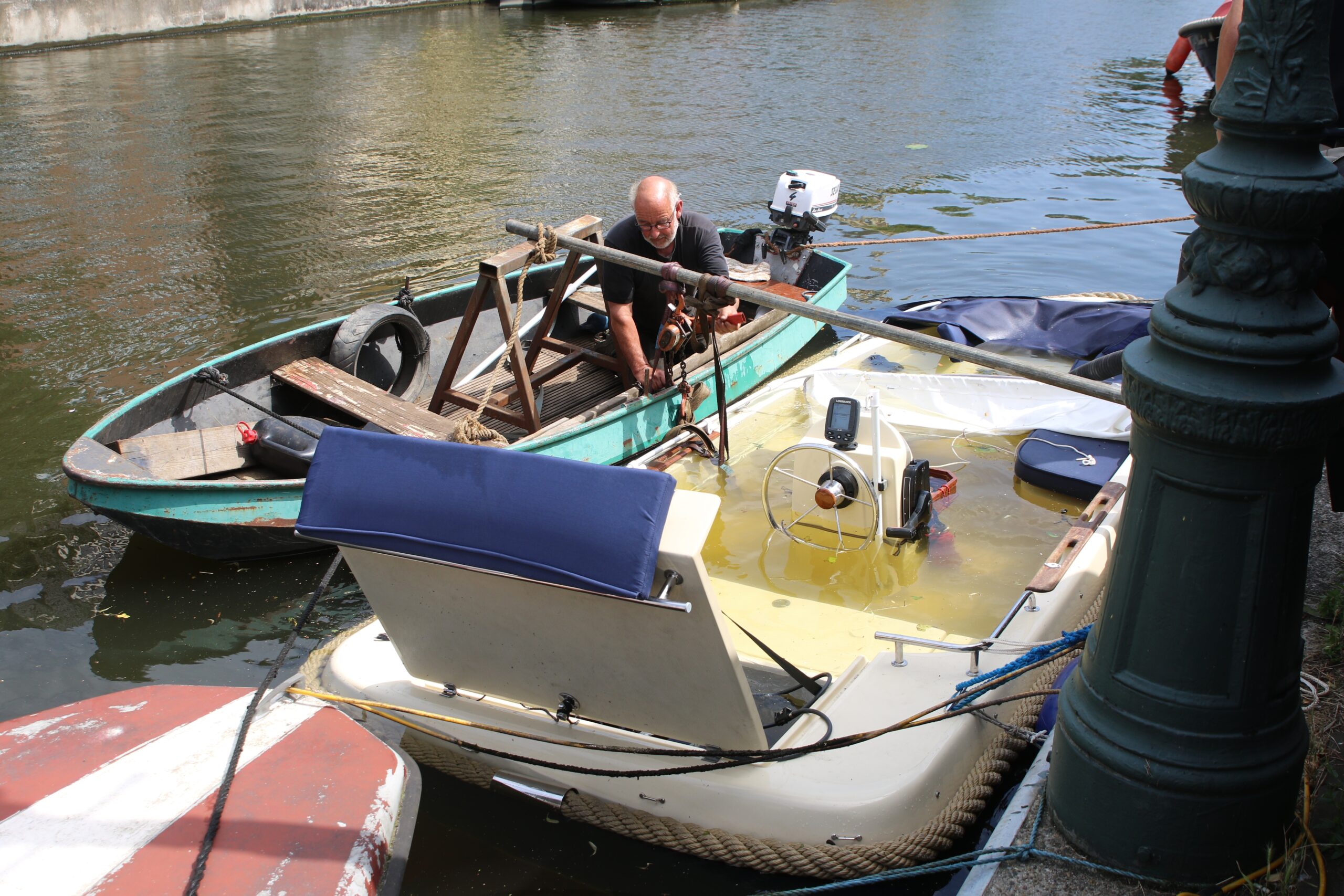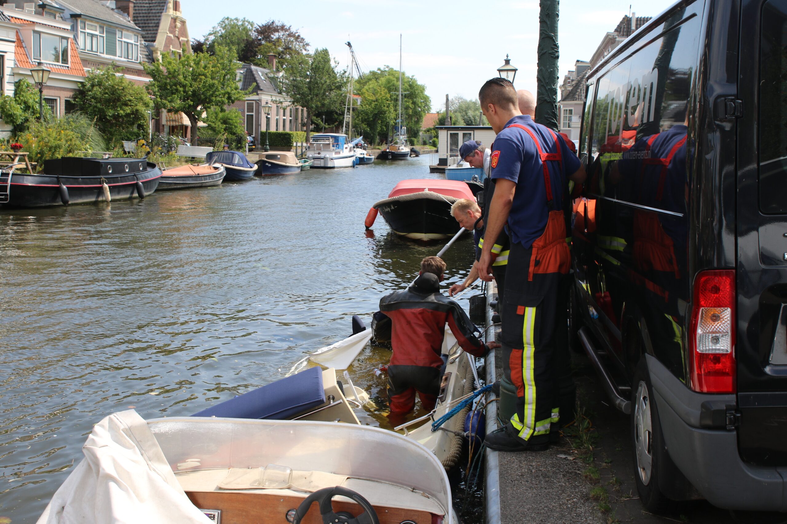 De brandweer heeft de meeste spullen uit de boot gehaald en op de kant gelegd. Iemand van de scheepswerf even verderop heeft de boot vanaf het water rechtgetrokken, waarop de brandweer de sloep zoveel mogelijk heeft leeggepompt.
