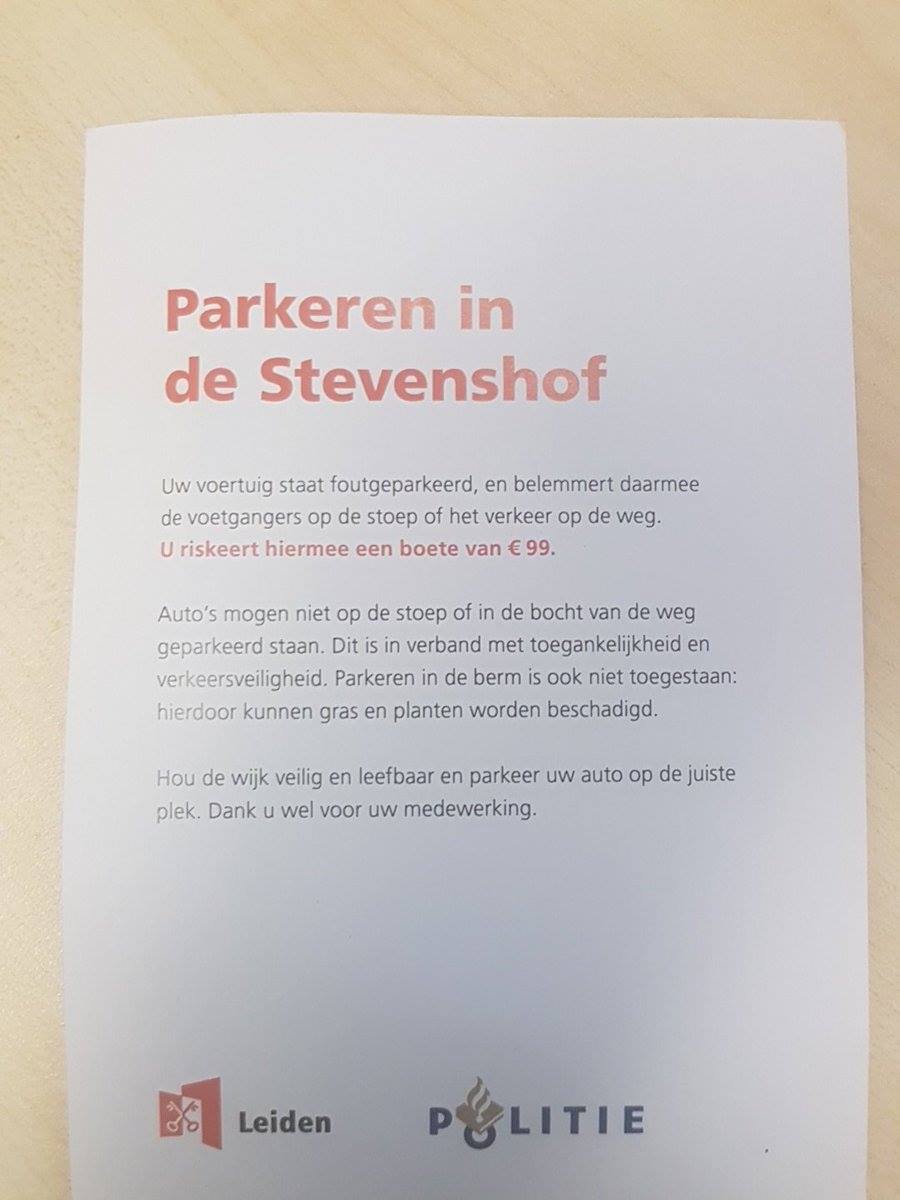 In een bewonersbrief van de gemeente Leiden zijn de wijkbewoners begin van de maand op de hoogte gesteld van extra handhaving op fout parkeren. Aanleiding was en toenemend aantal klachten van bewoners over auto’s die in bochten geparkeerd staan of zelfs op de stoep.