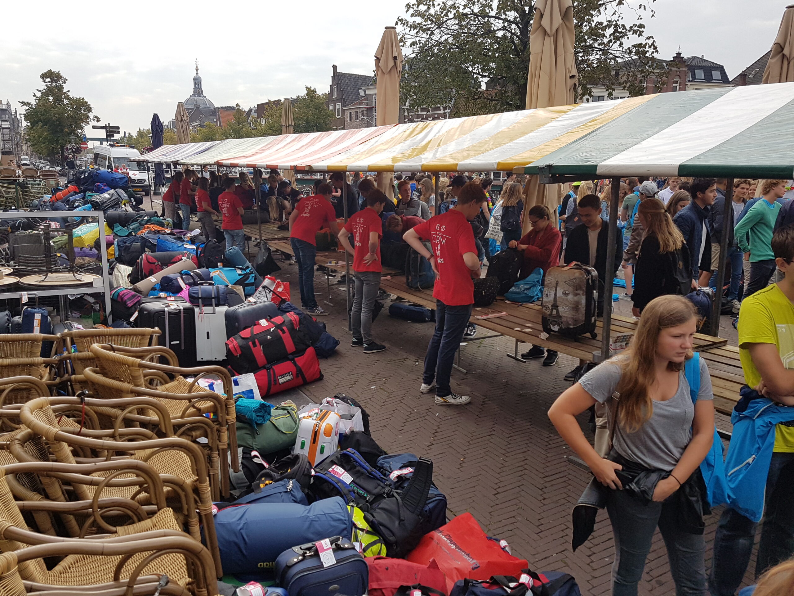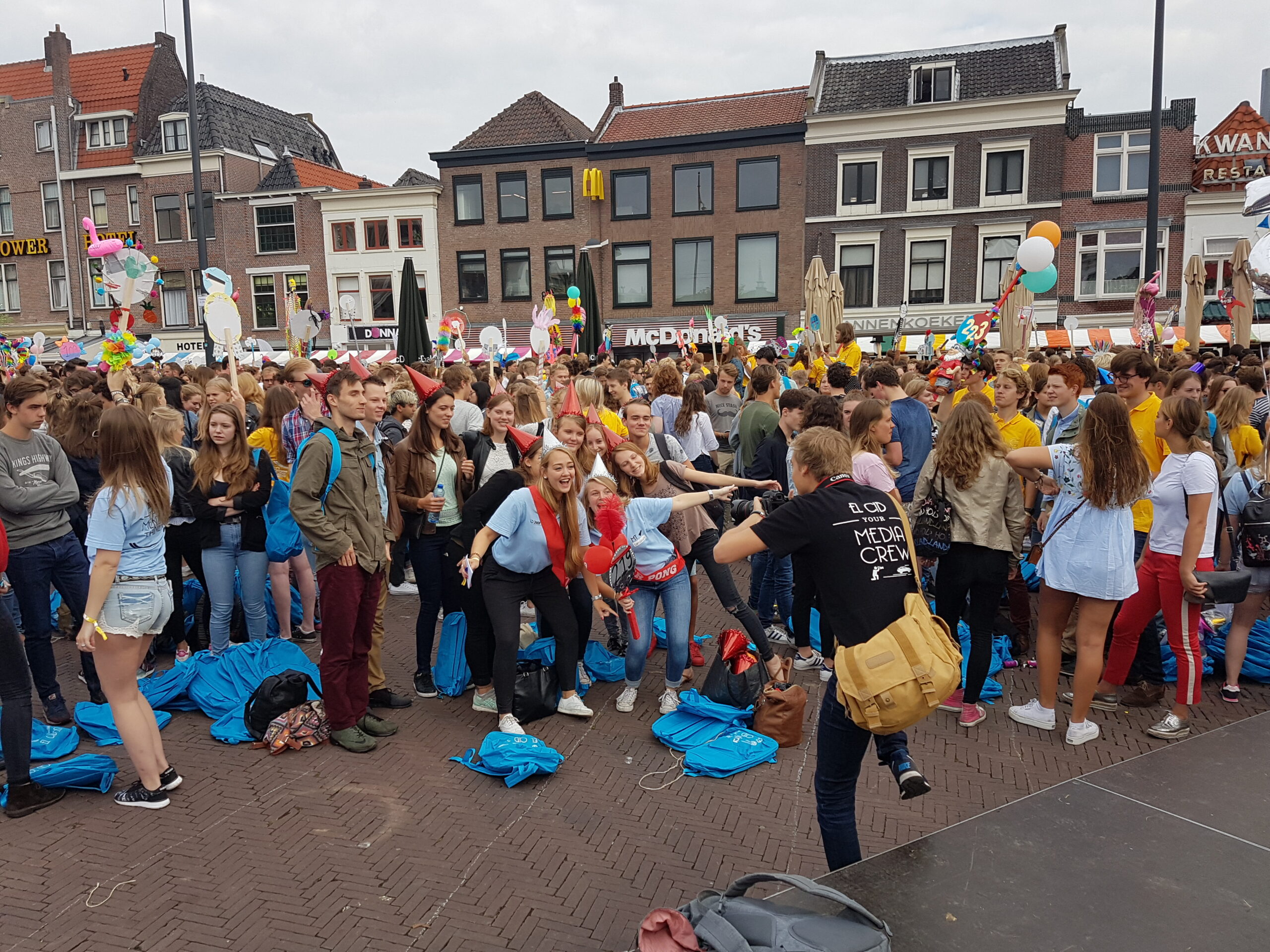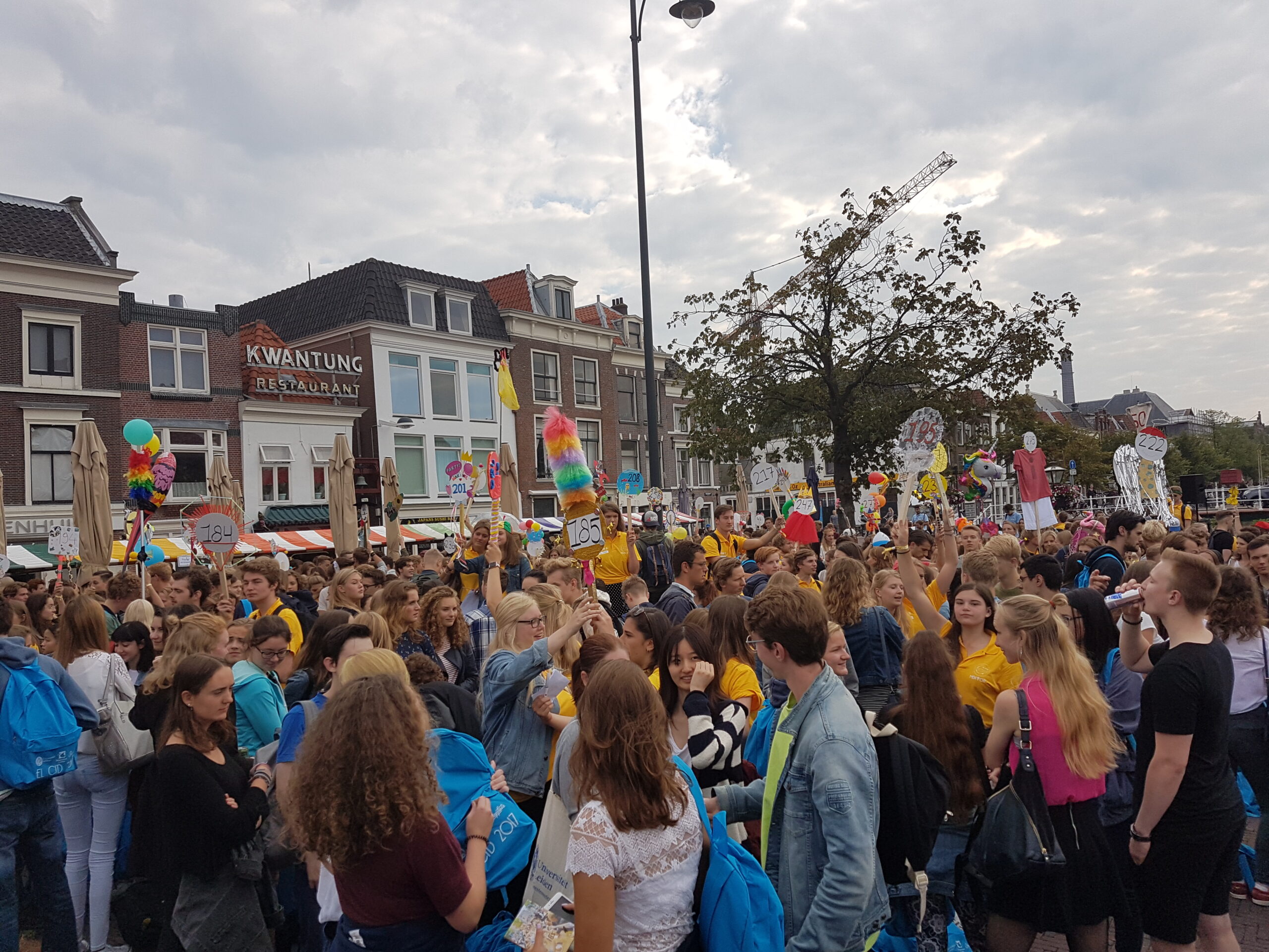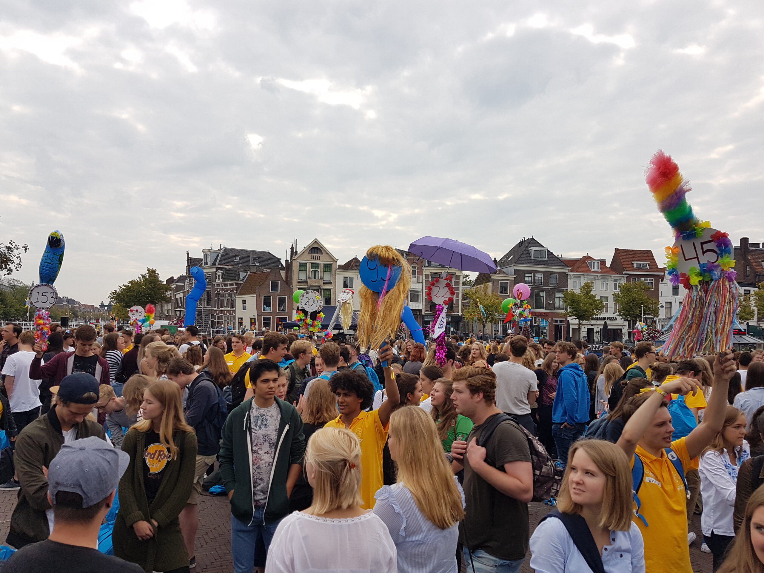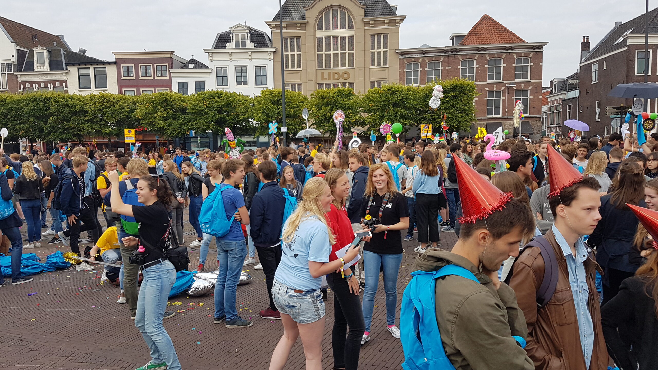 De komende dagen leren de eerstejaars de stad kennen. Vanmorgen werd er vanaf half tien verzameld op de Beestenmarkt. Daar konden ze onder meer hun tassen en koffers inleveren. Die werden met busjes naar naar de slaapzalen in de Schaatshal Leiden en het Universitair Sportcentrum gebracht.
