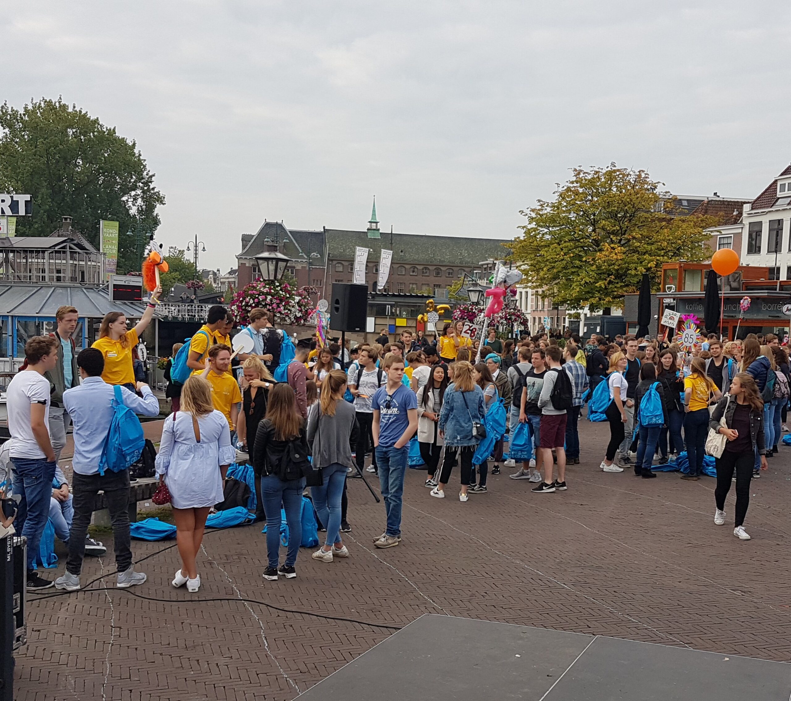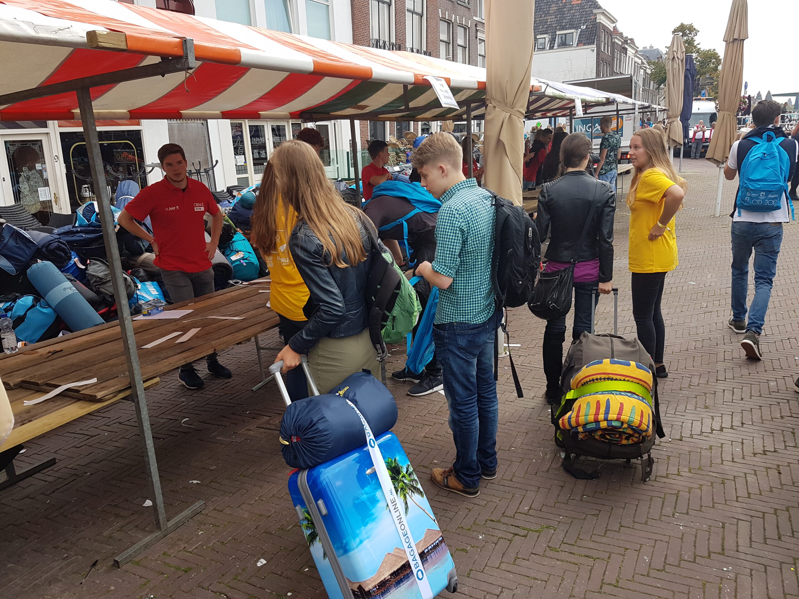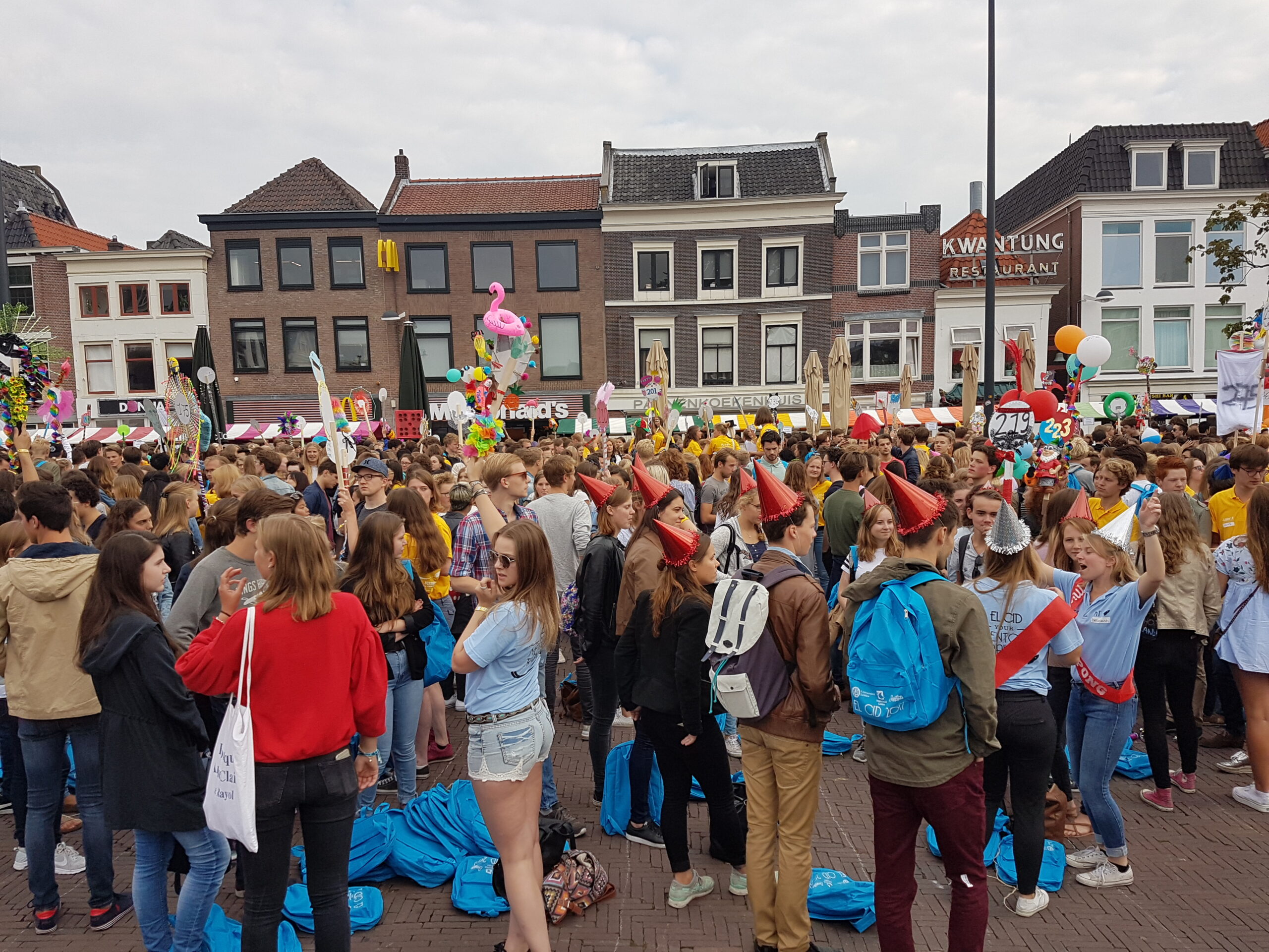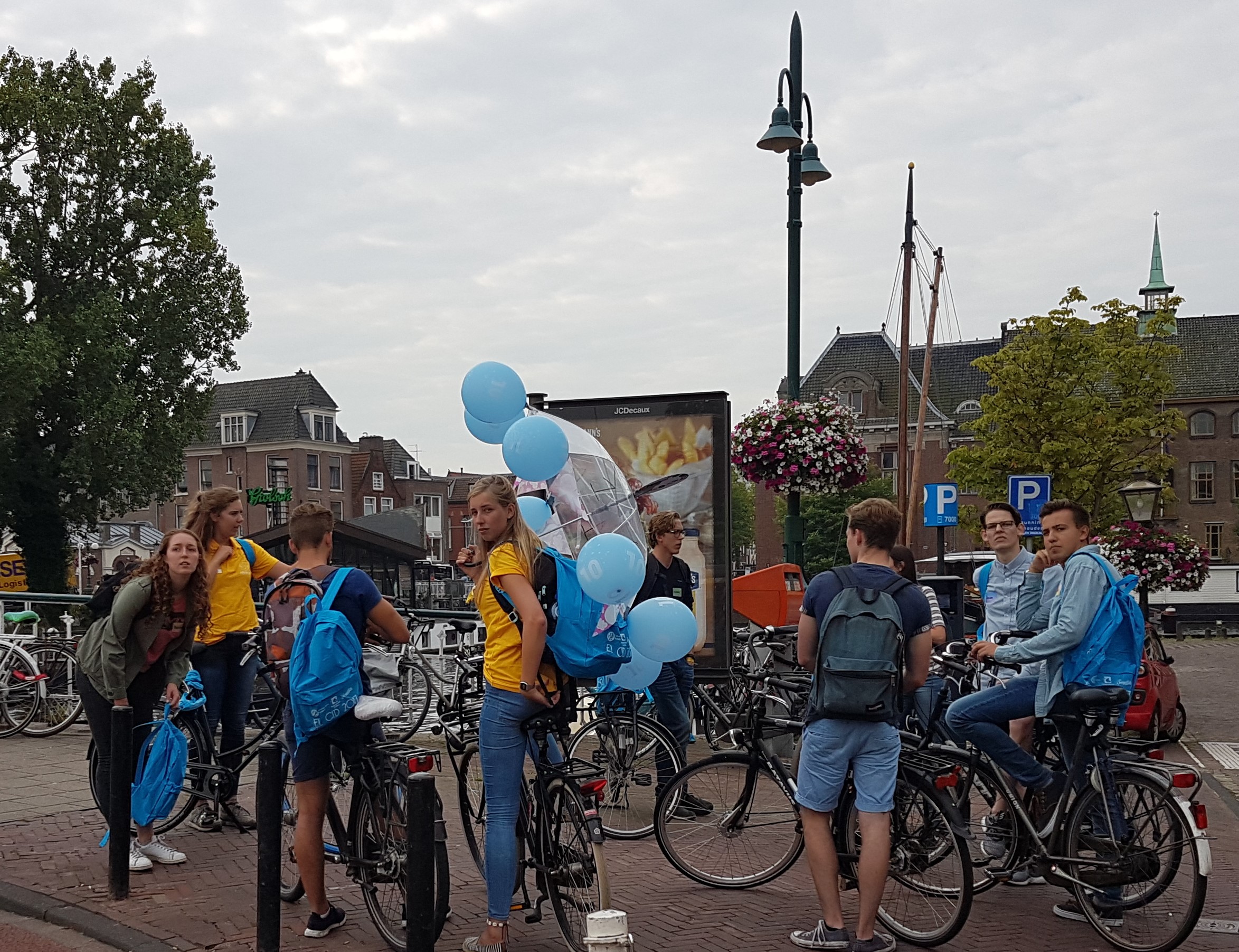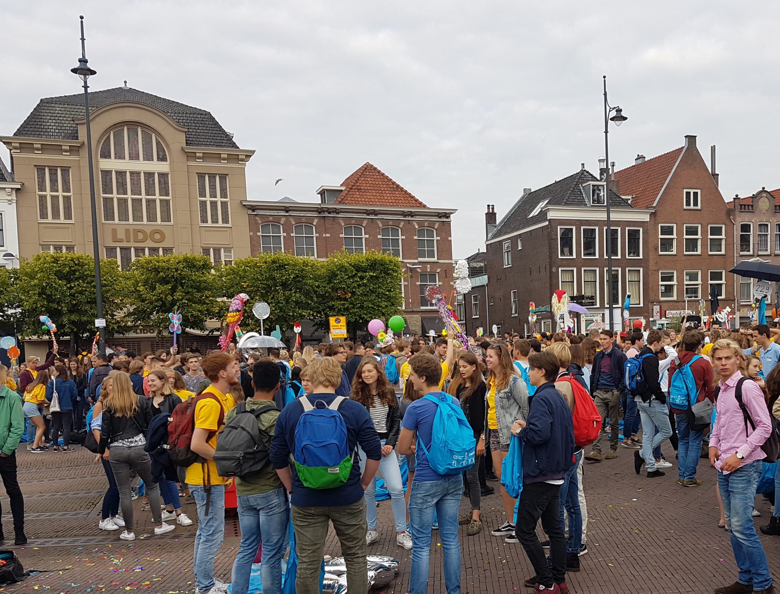 De komende dagen leren de eerstejaars de stad kennen. Vanmorgen werd er vanaf half tien verzameld op de Beestenmarkt. Daar konden ze onder meer hun tassen en koffers inleveren. Die werden met busjes naar naar de slaapzalen in de Schaatshal Leiden en het Universitair Sportcentrum gebracht.