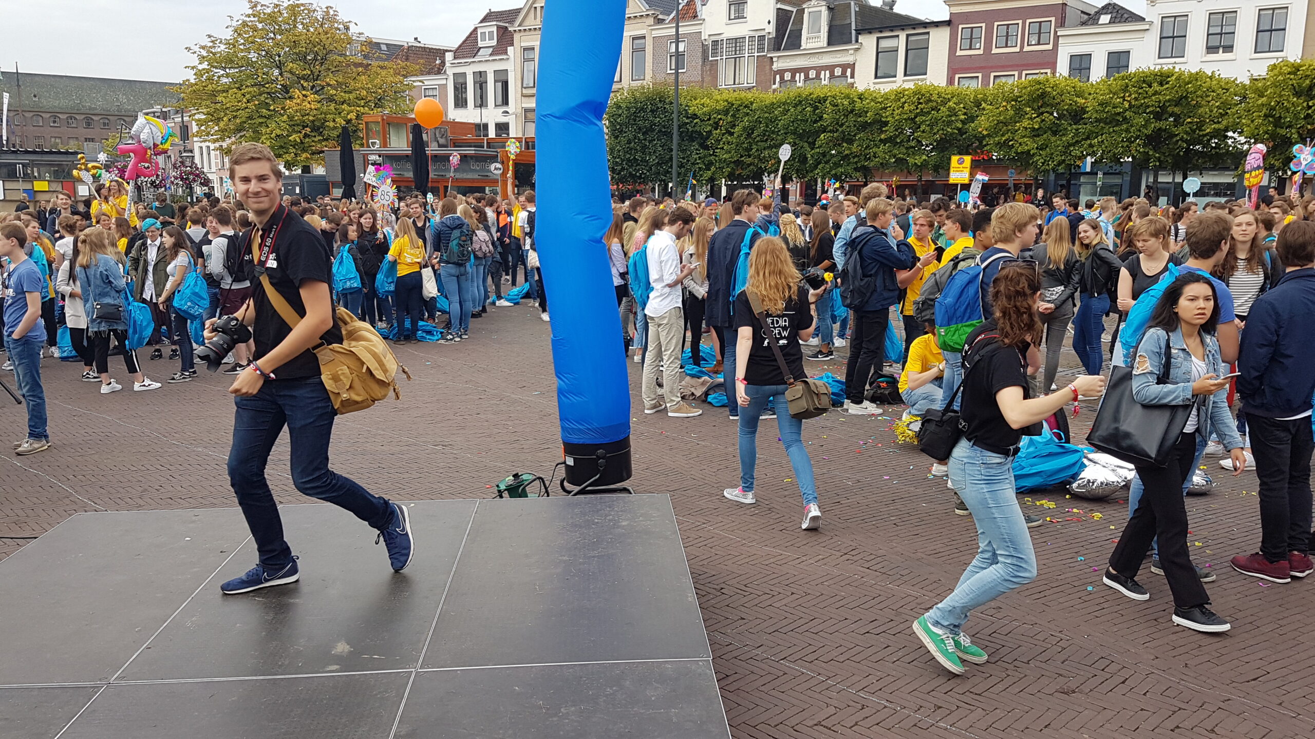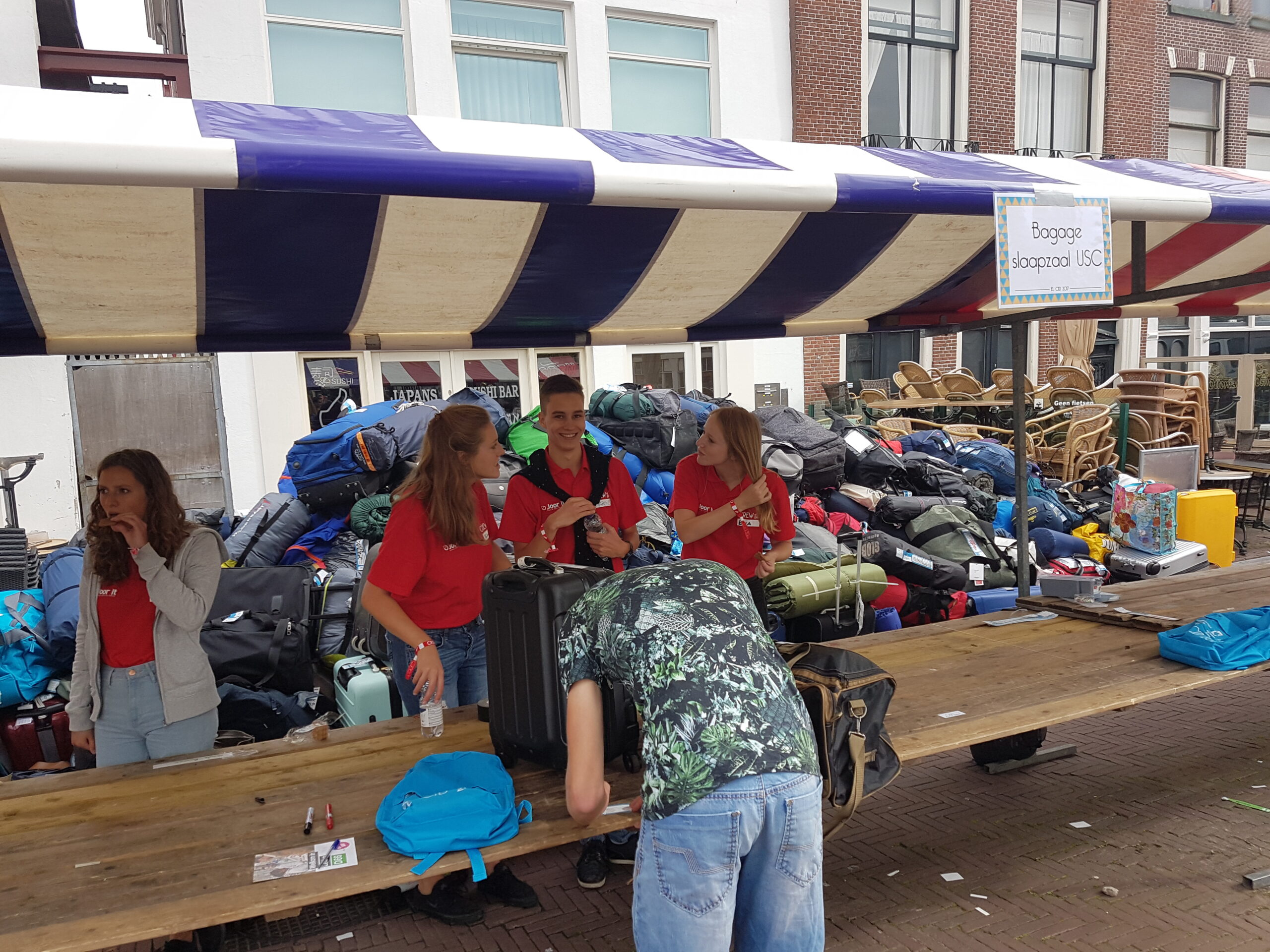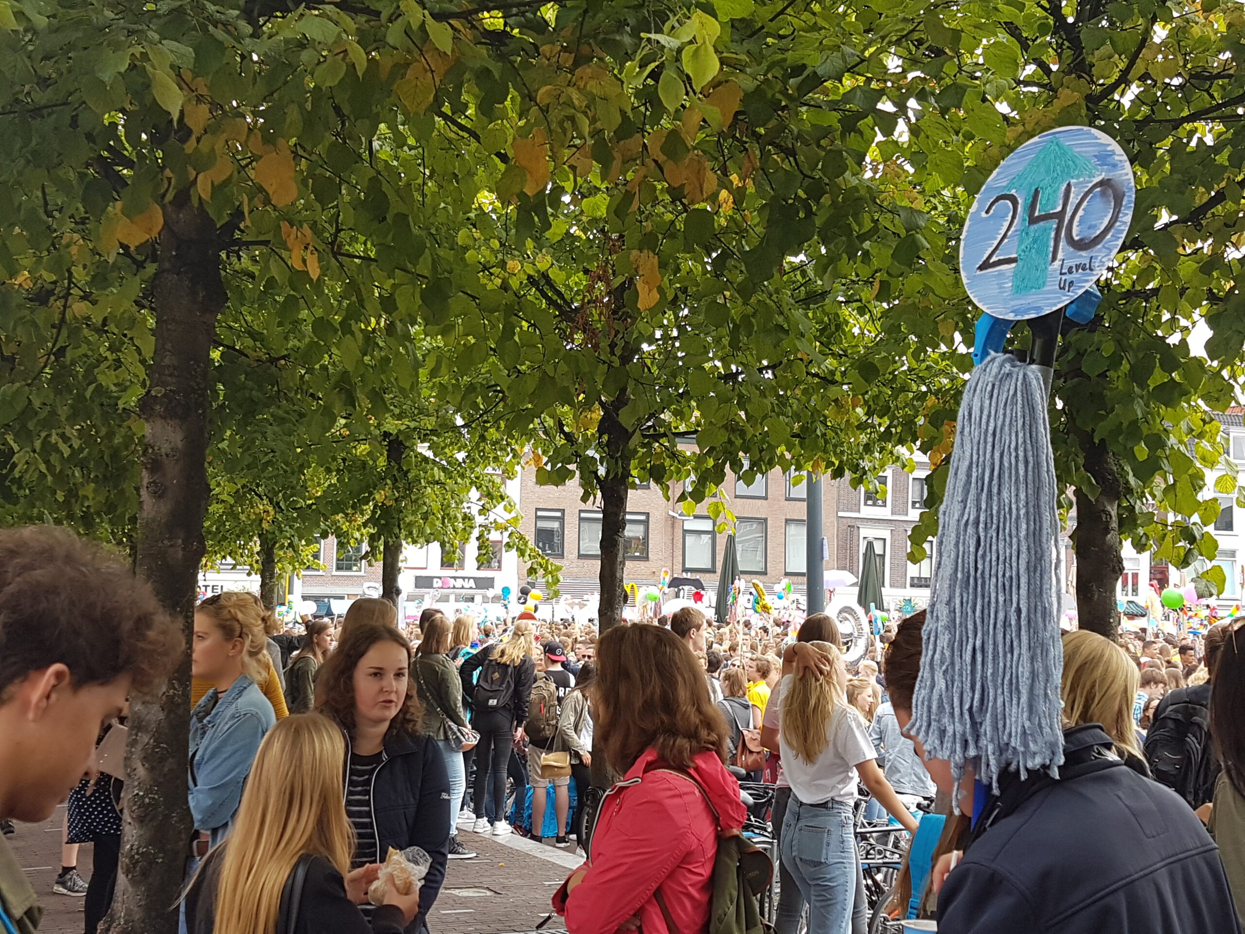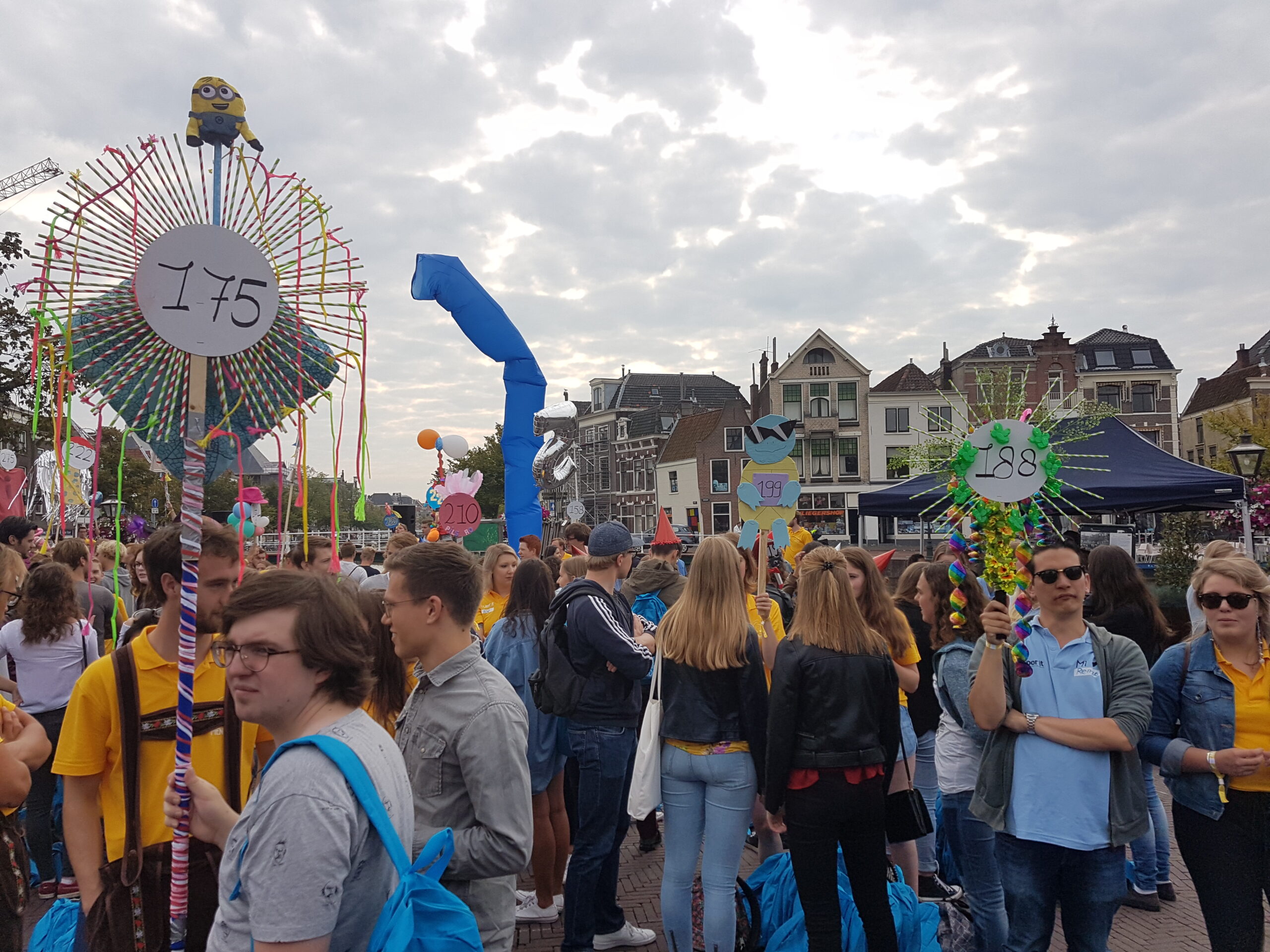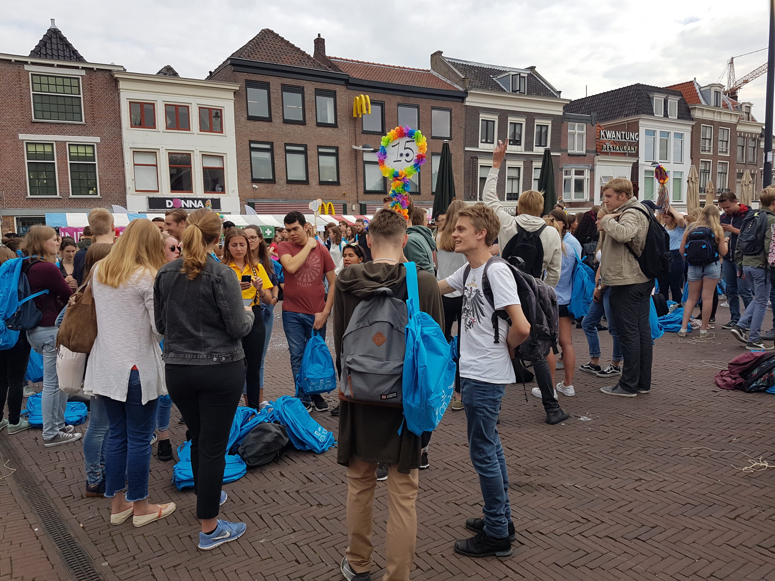 De komende dagen leren de eerstejaars de stad kennen. Vanmorgen werd er vanaf half tien verzameld op de Beestenmarkt. Daar konden ze onder meer hun tassen en koffers inleveren. Die werden met busjes naar naar de slaapzalen in de Schaatshal Leiden en het Universitair Sportcentrum gebracht.