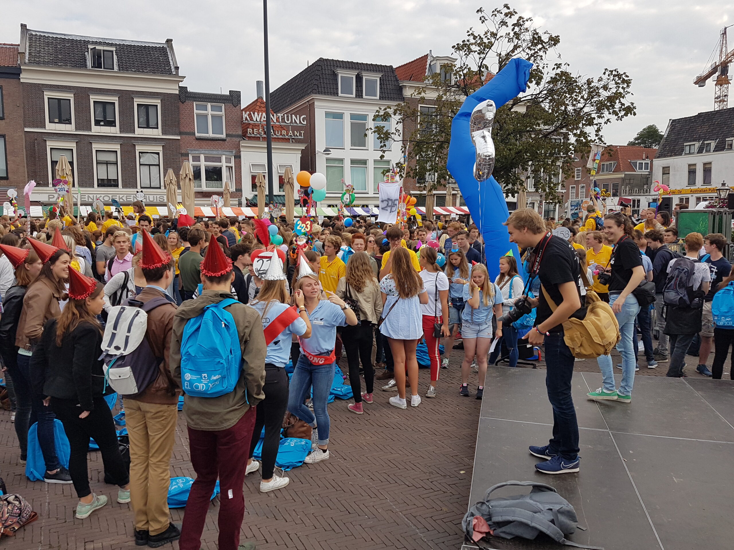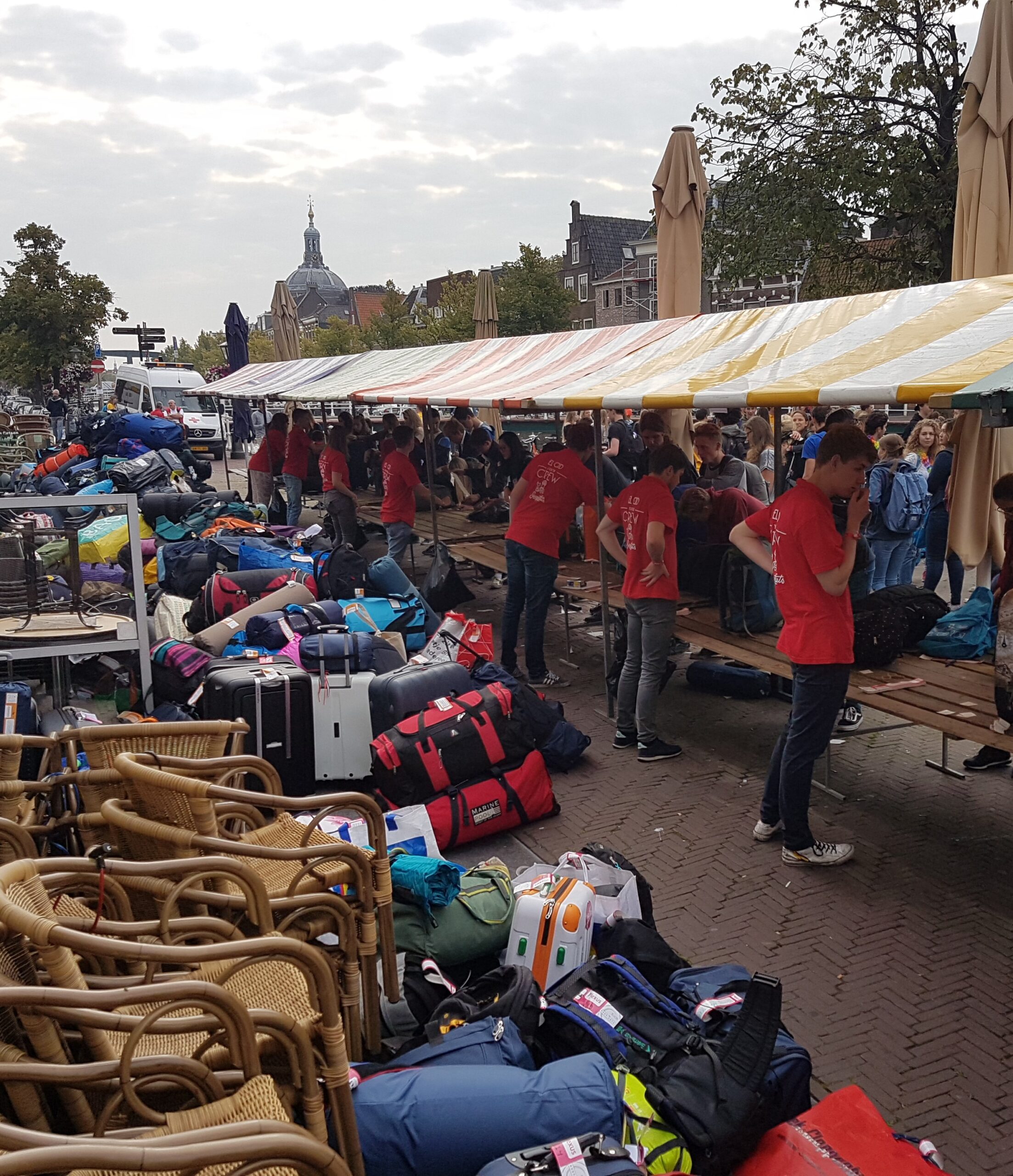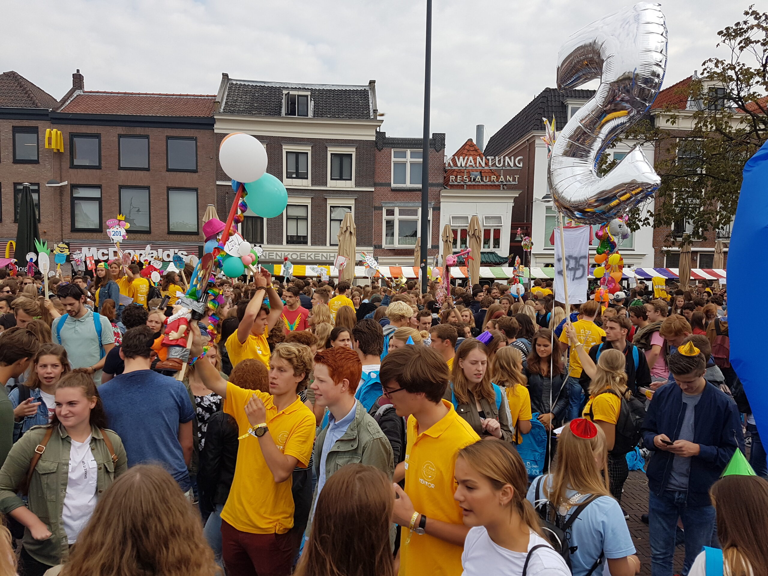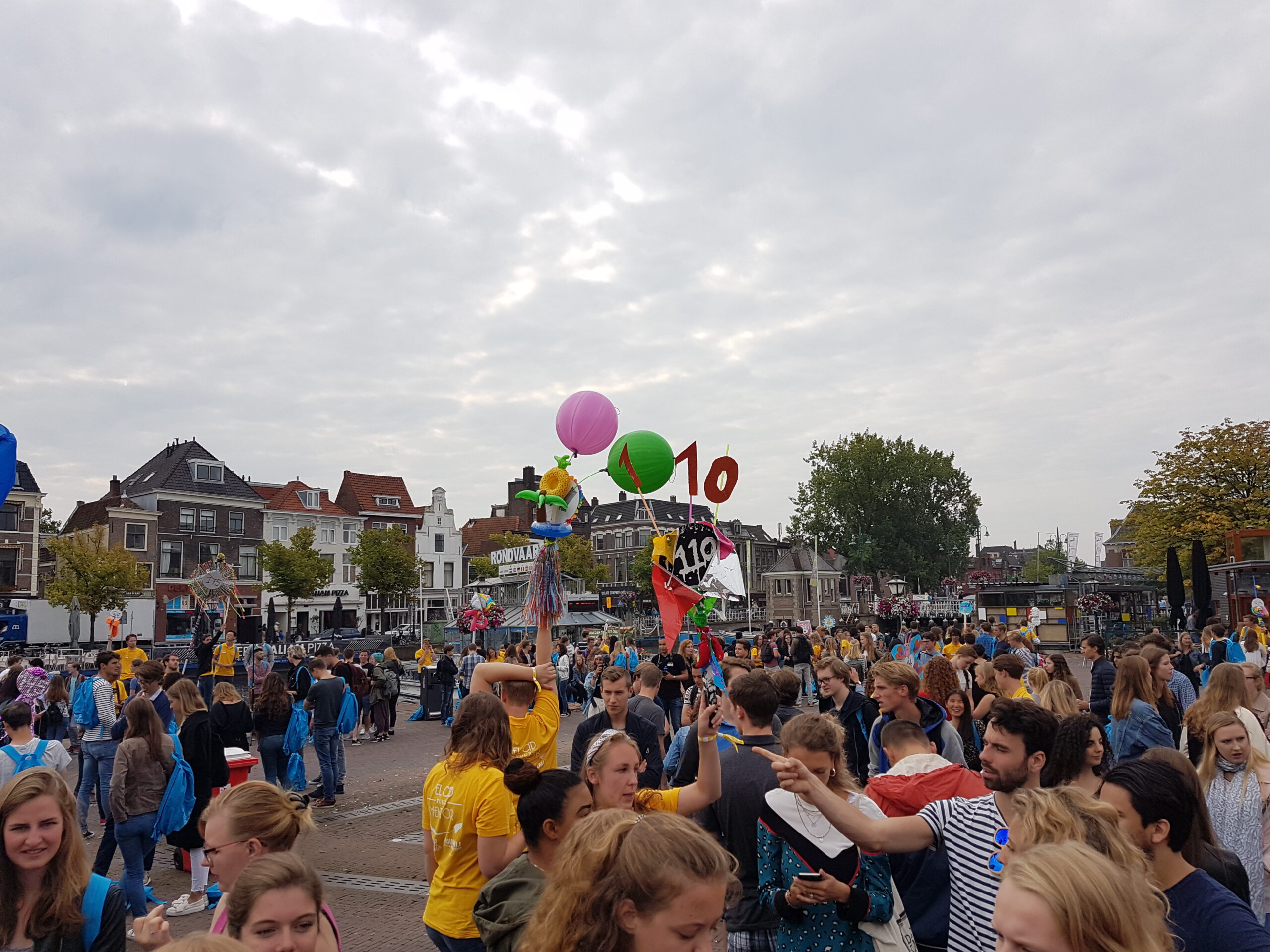 De komende dagen leren de eerstejaars de stad kennen. Vanmorgen werd er vanaf half tien verzameld op de Beestenmarkt. Daar konden ze onder meer hun tassen en koffers inleveren. Die werden met busjes naar naar de slaapzalen in de Schaatshal Leiden en het Universitair Sportcentrum gebracht.