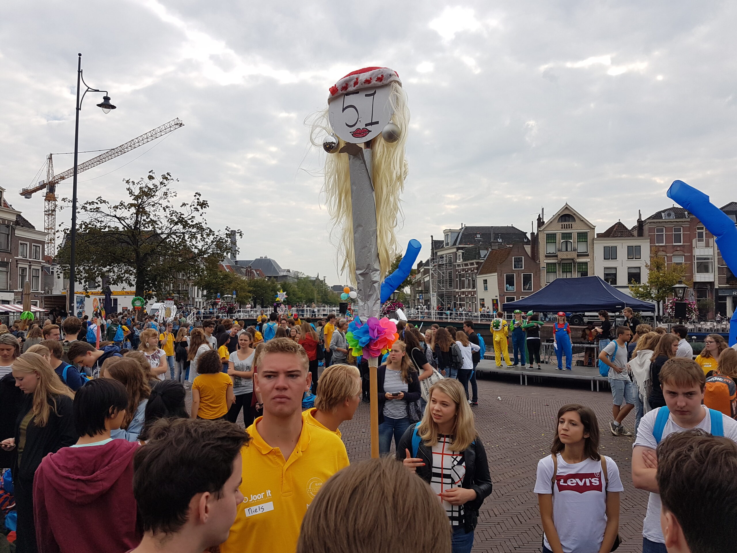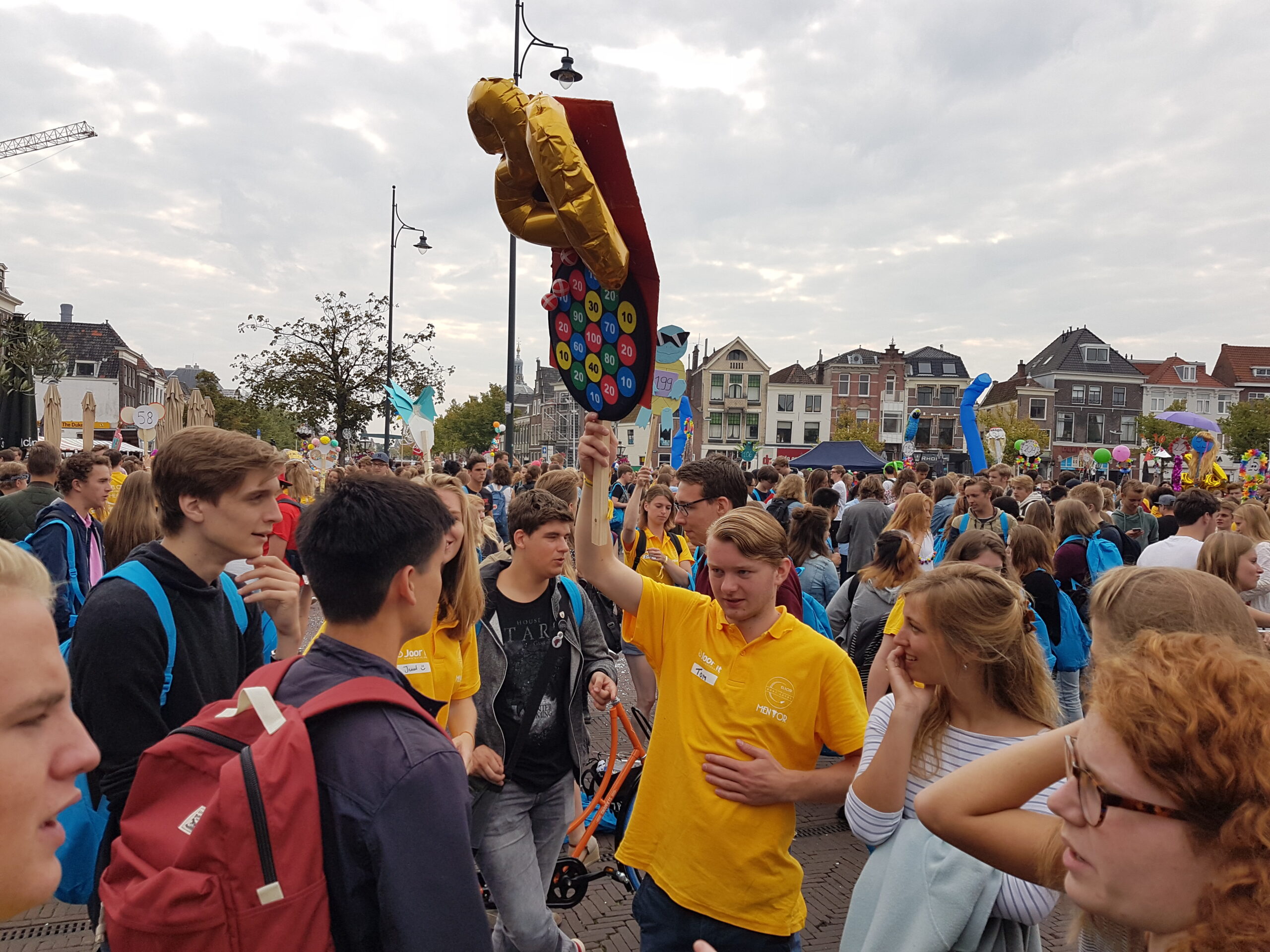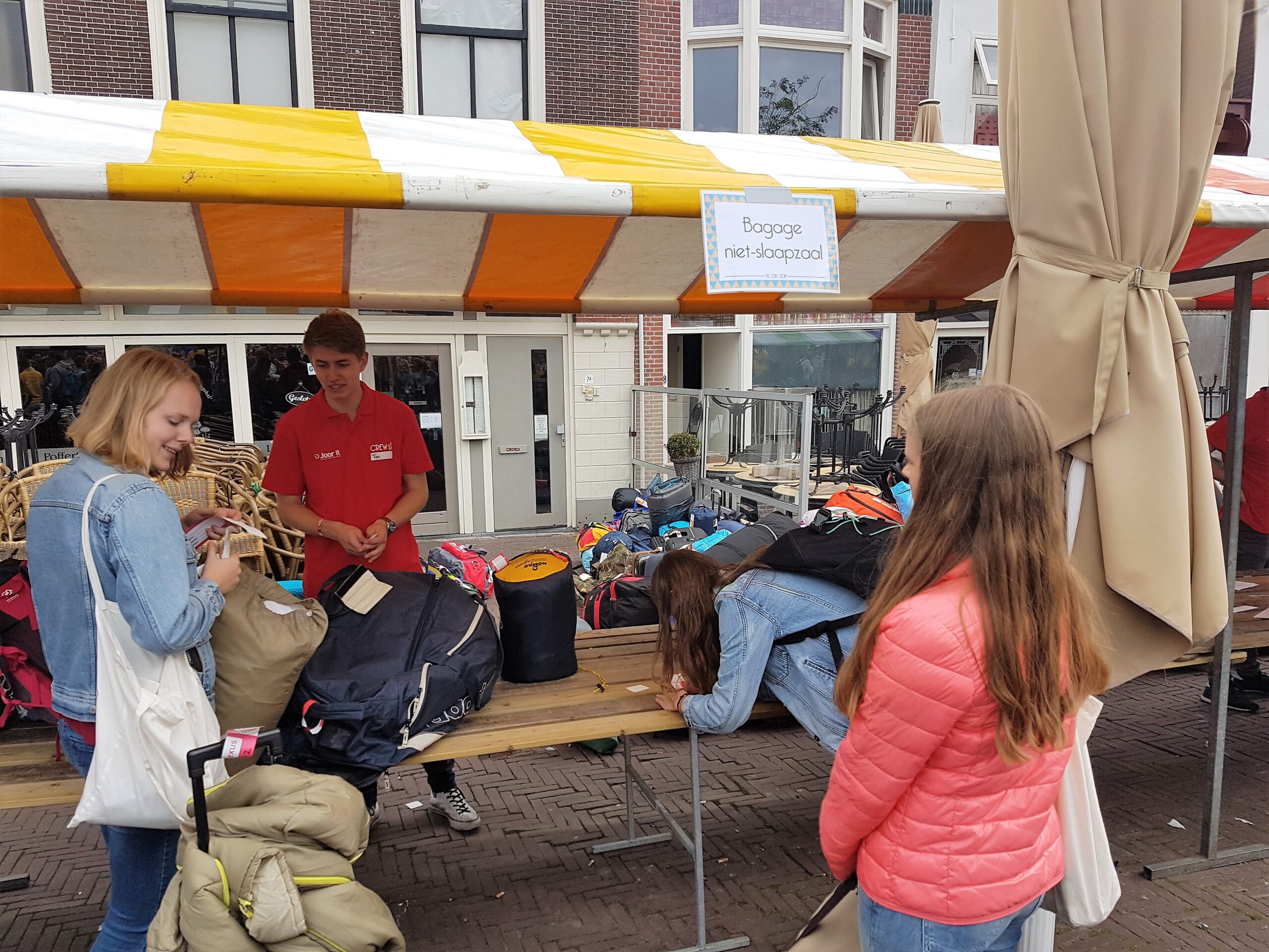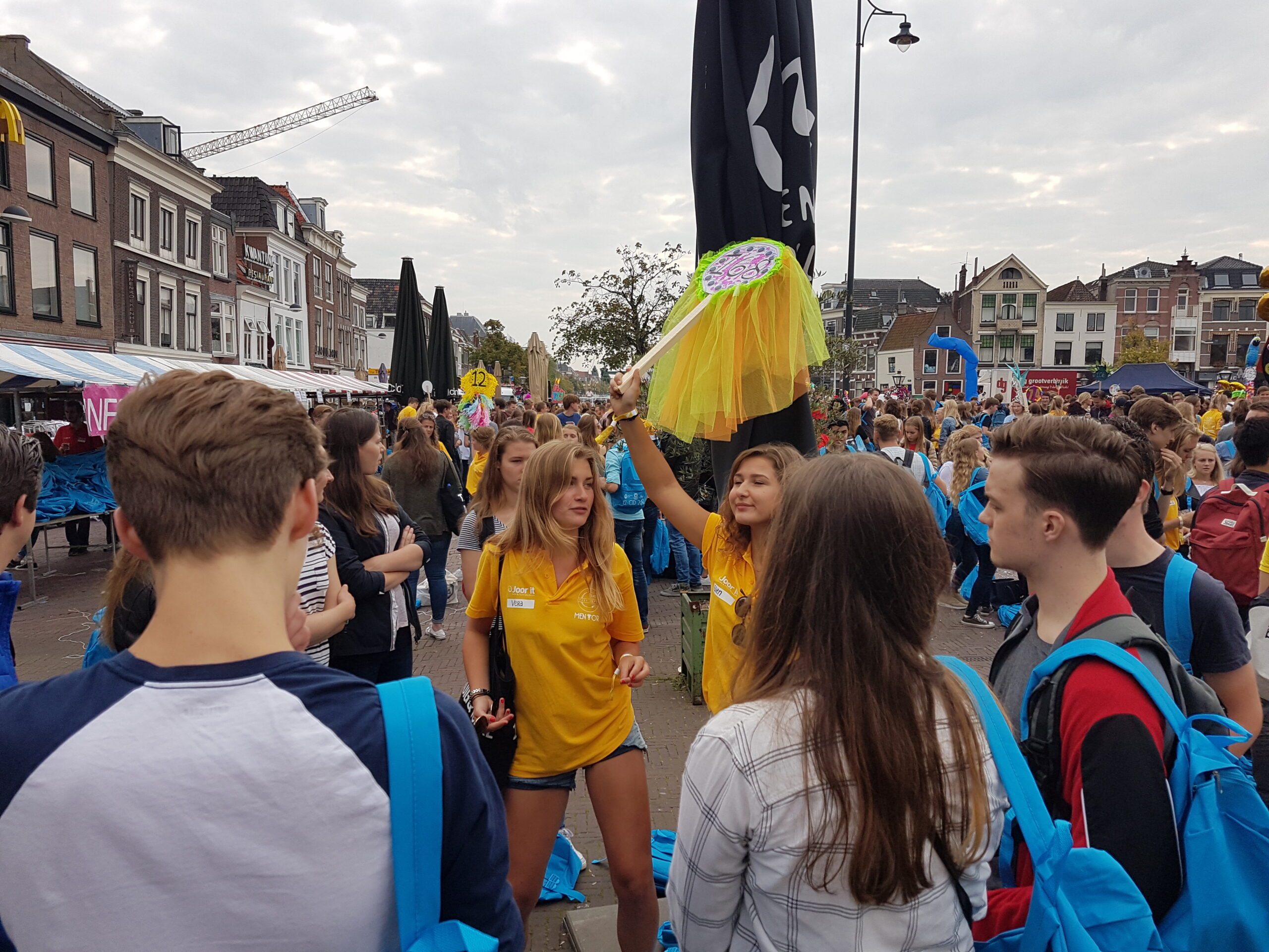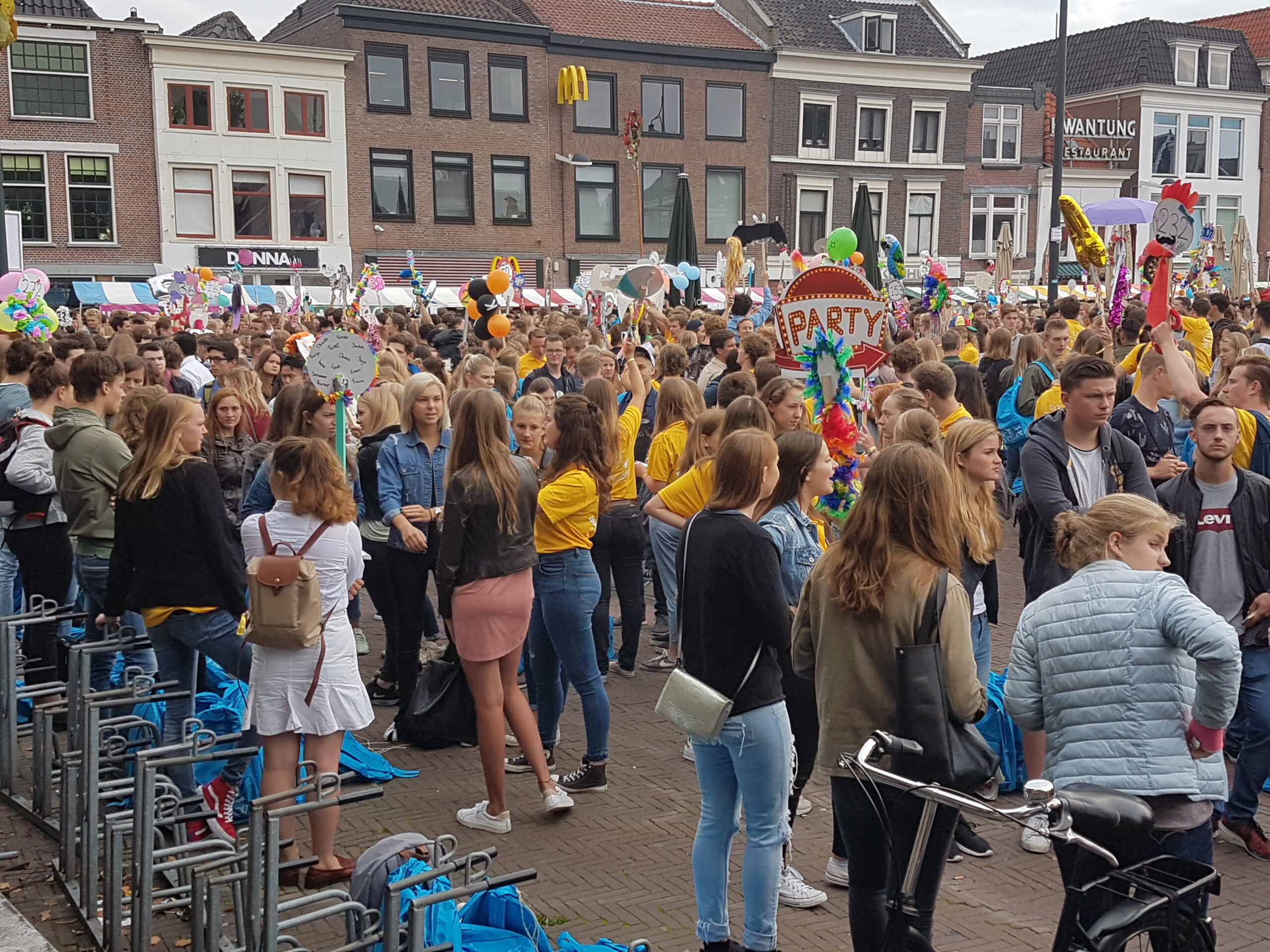 De komende dagen leren de eerstejaars de stad kennen. Vanmorgen werd er vanaf half tien verzameld op de Beestenmarkt. Daar konden ze onder meer hun tassen en koffers inleveren. Die werden met busjes naar naar de slaapzalen in de Schaatshal Leiden en het Universitair Sportcentrum gebracht.