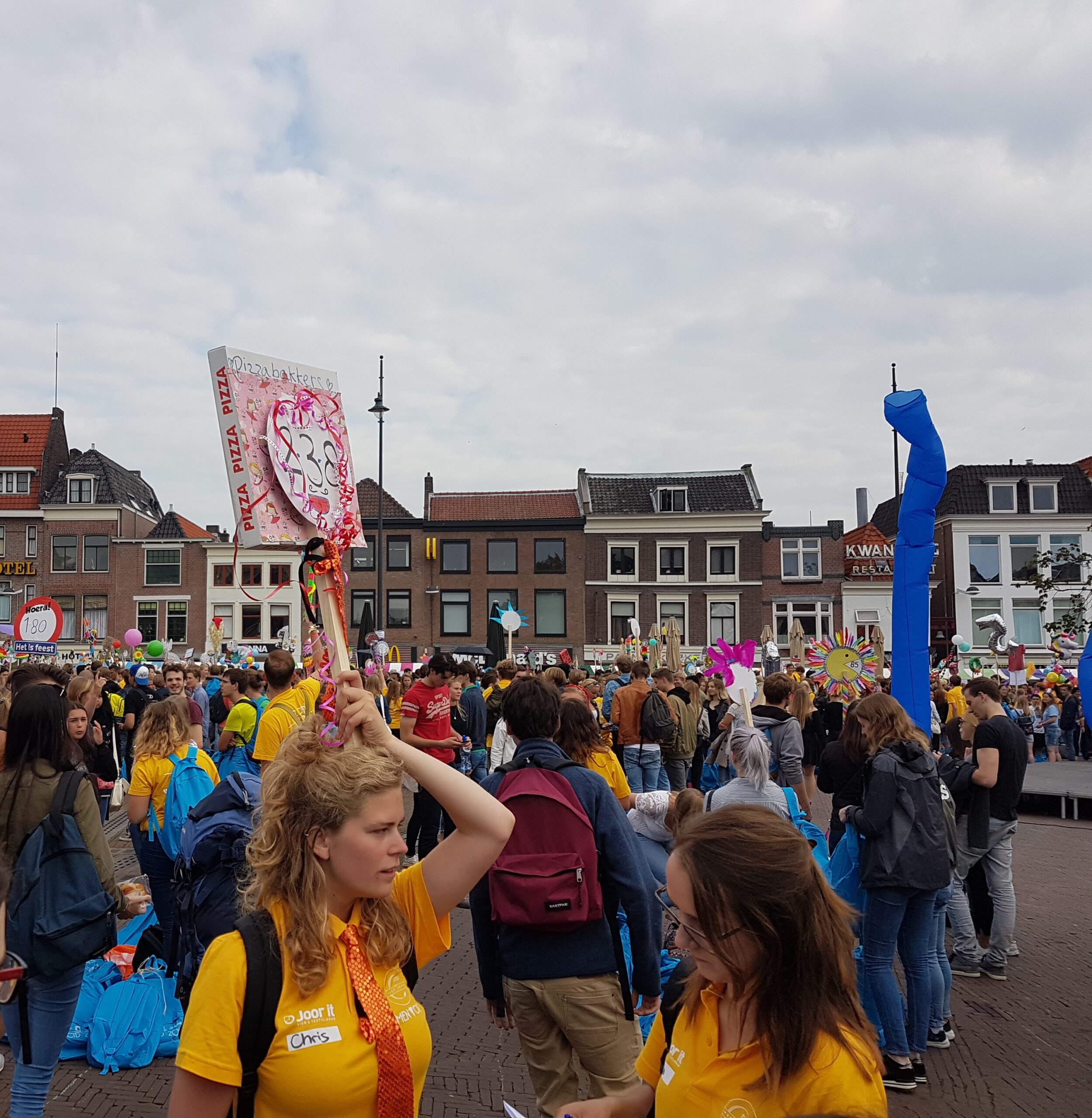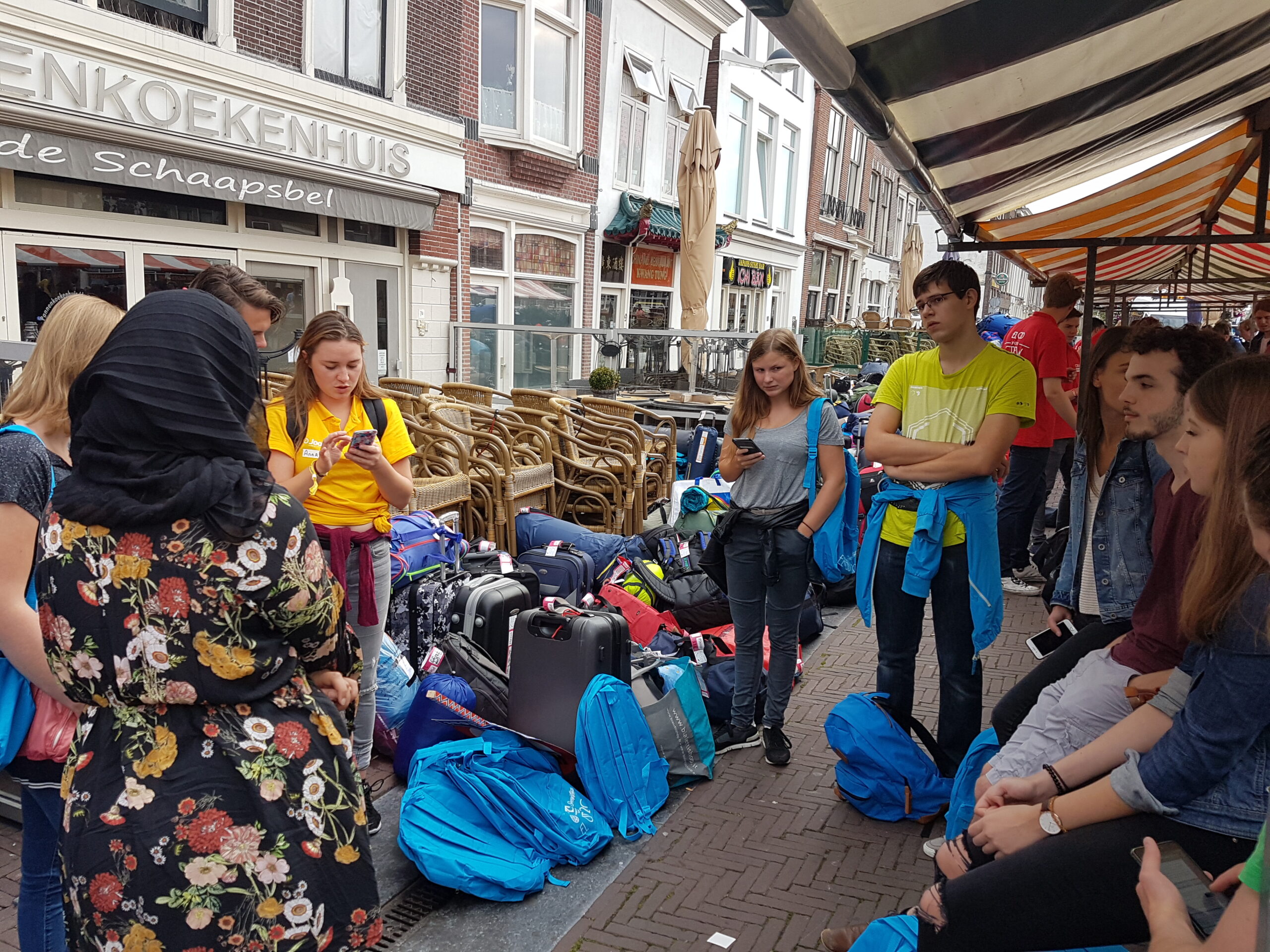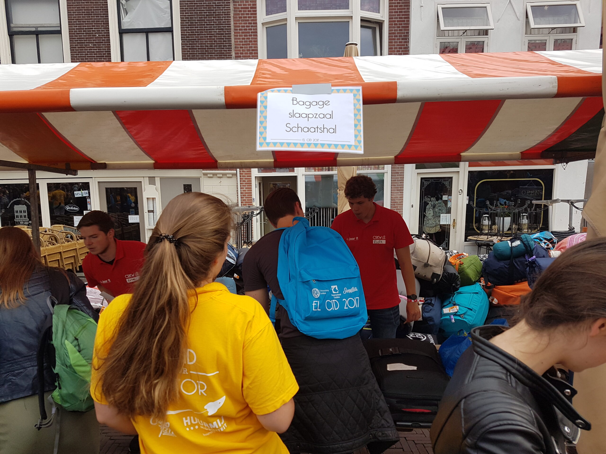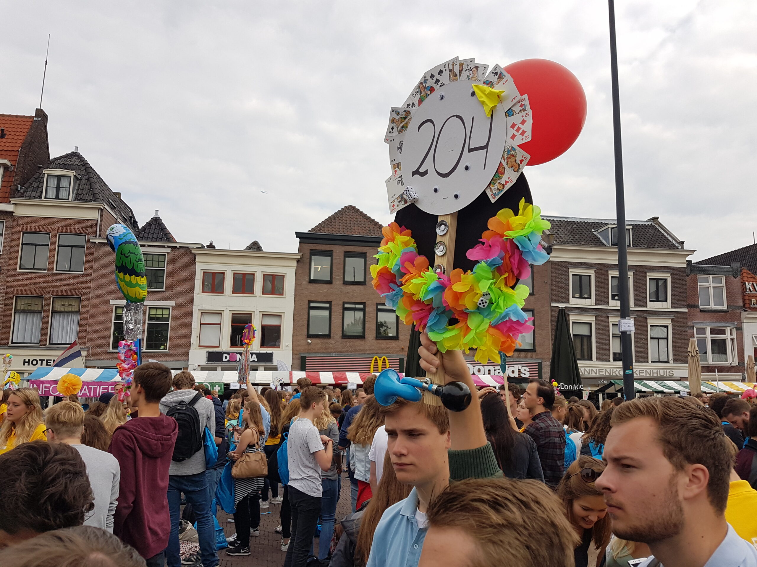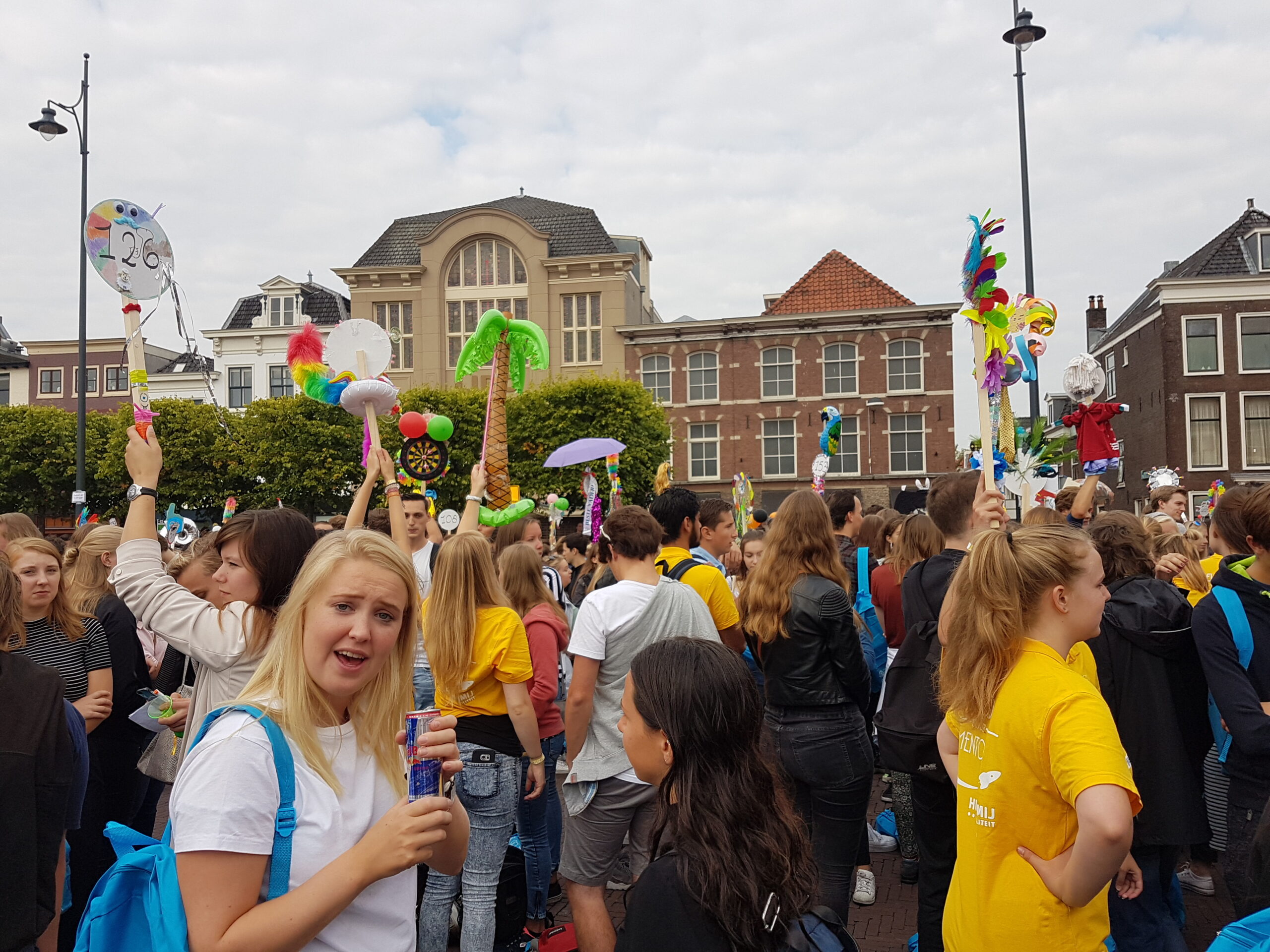 De komende dagen leren de eerstejaars de stad kennen. Vanmorgen werd er vanaf half tien verzameld op de Beestenmarkt. Daar konden ze onder meer hun tassen en koffers inleveren. Die werden met busjes naar naar de slaapzalen in de Schaatshal Leiden en het Universitair Sportcentrum gebracht.