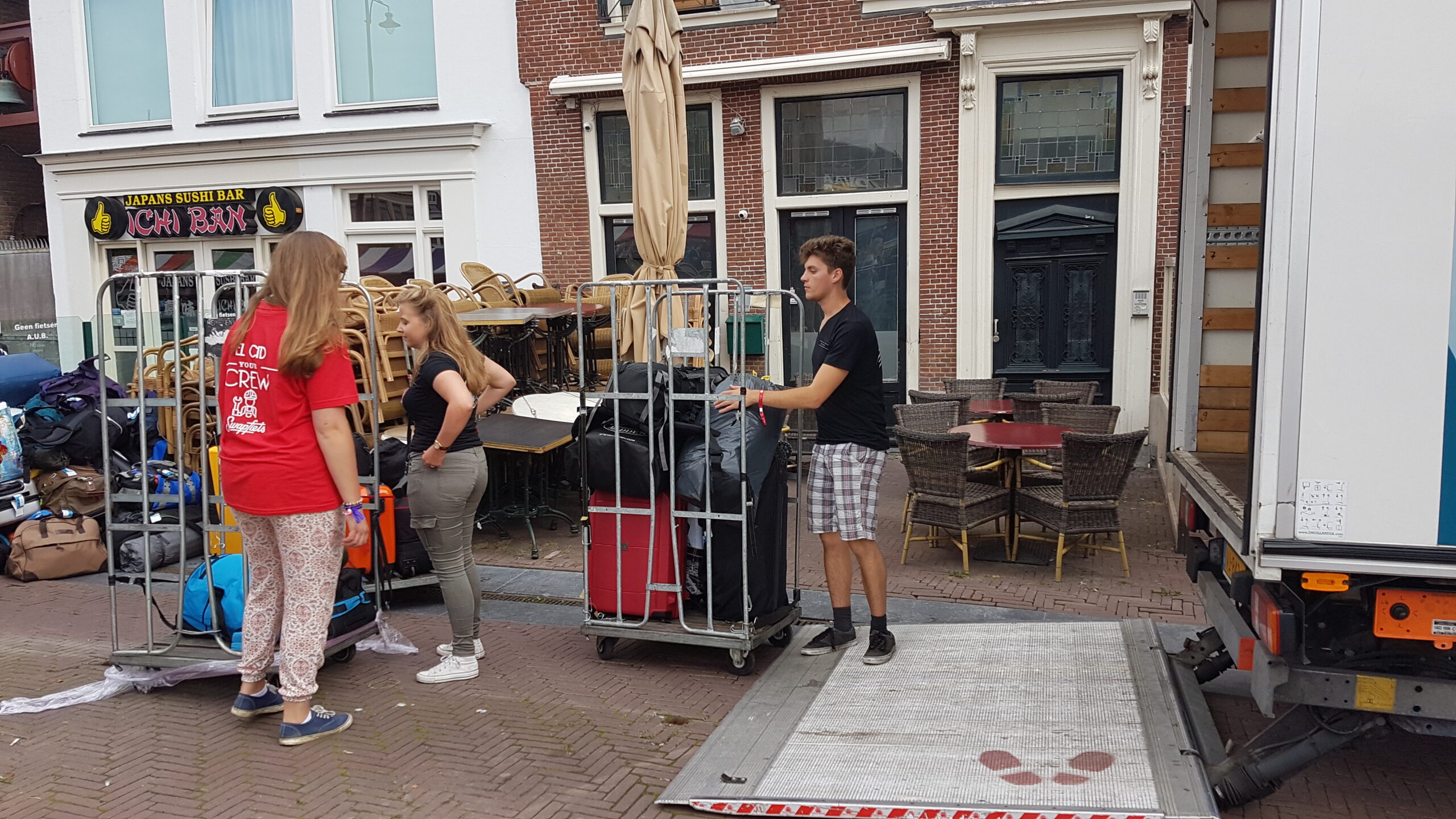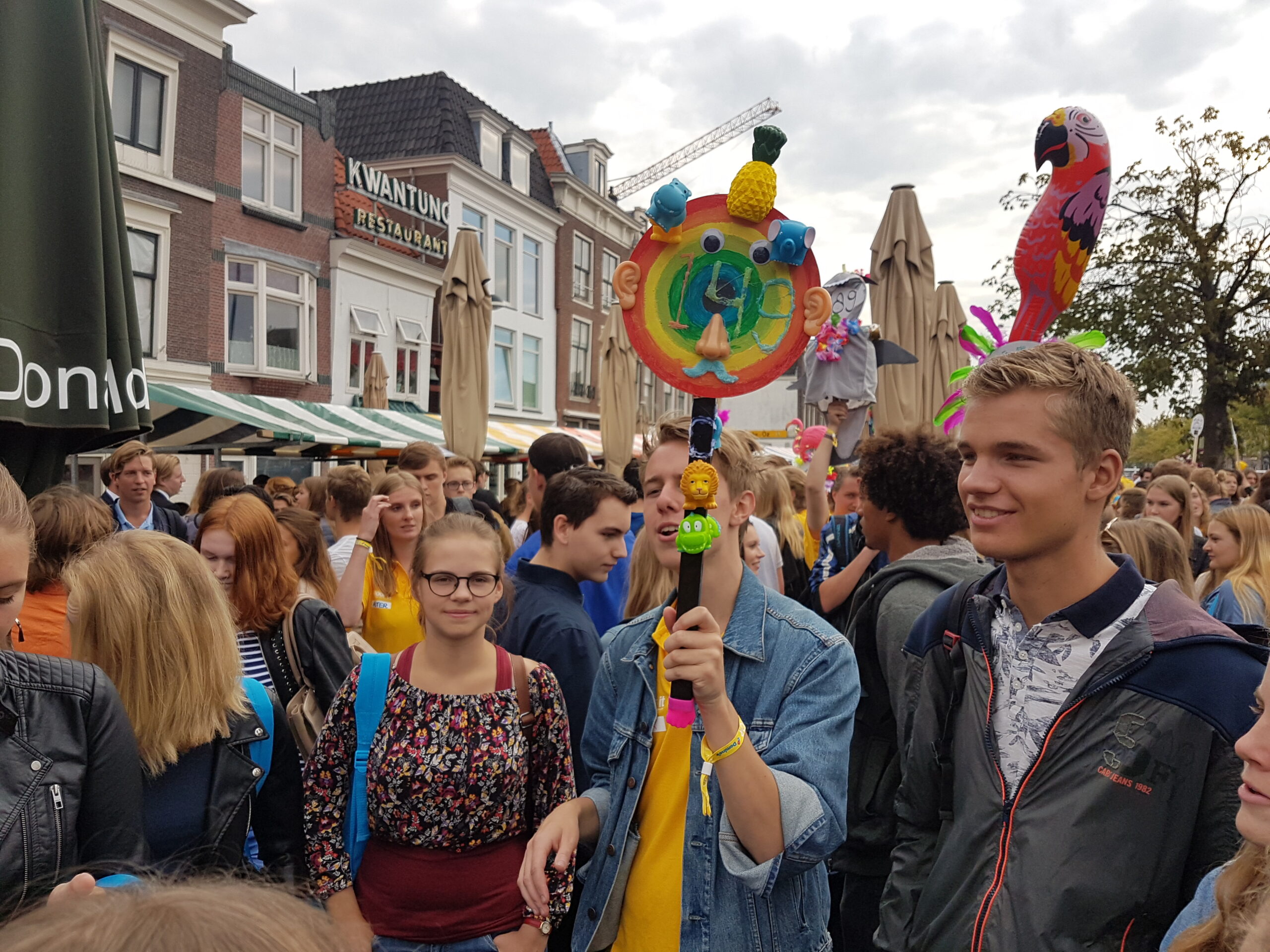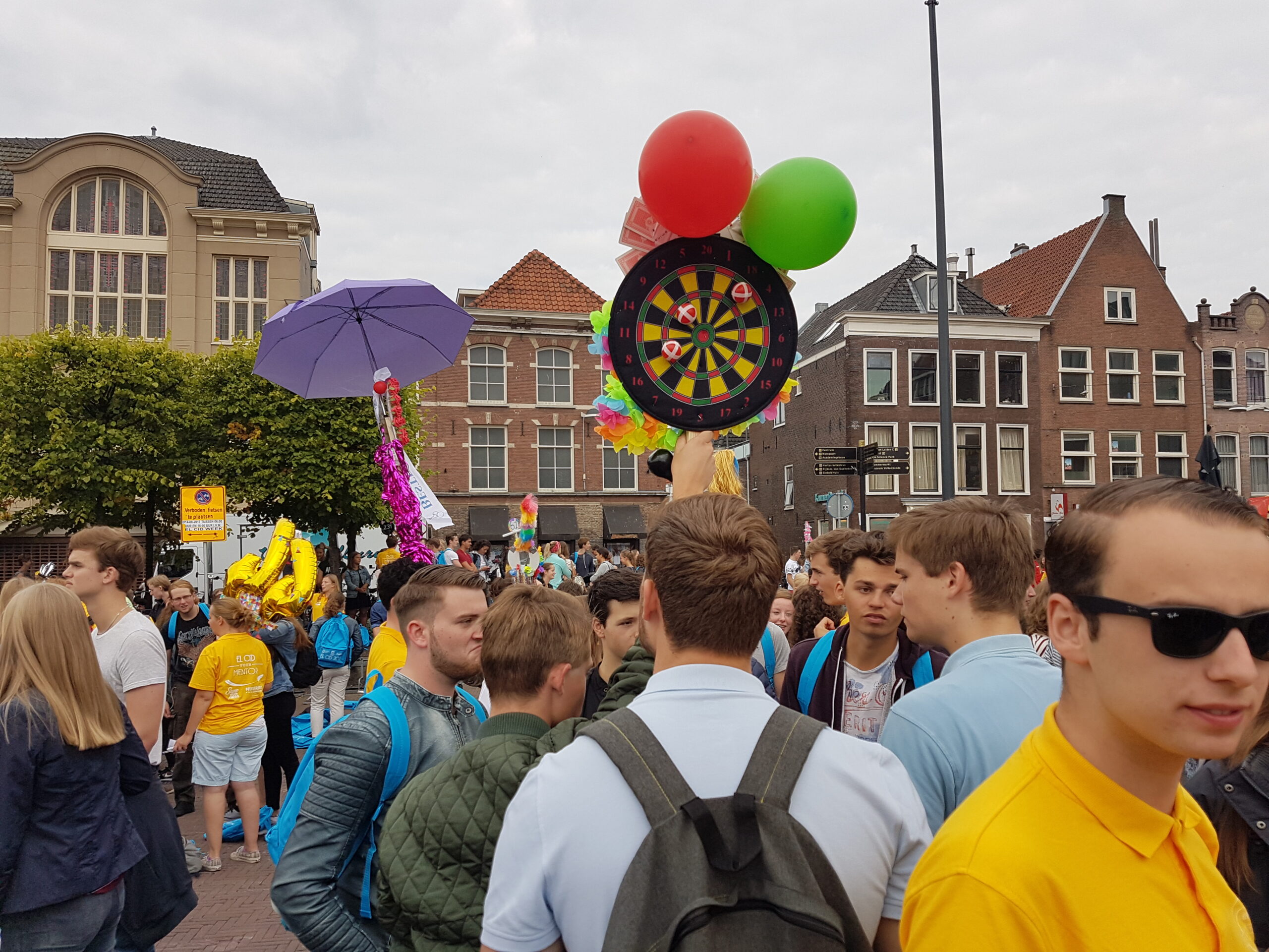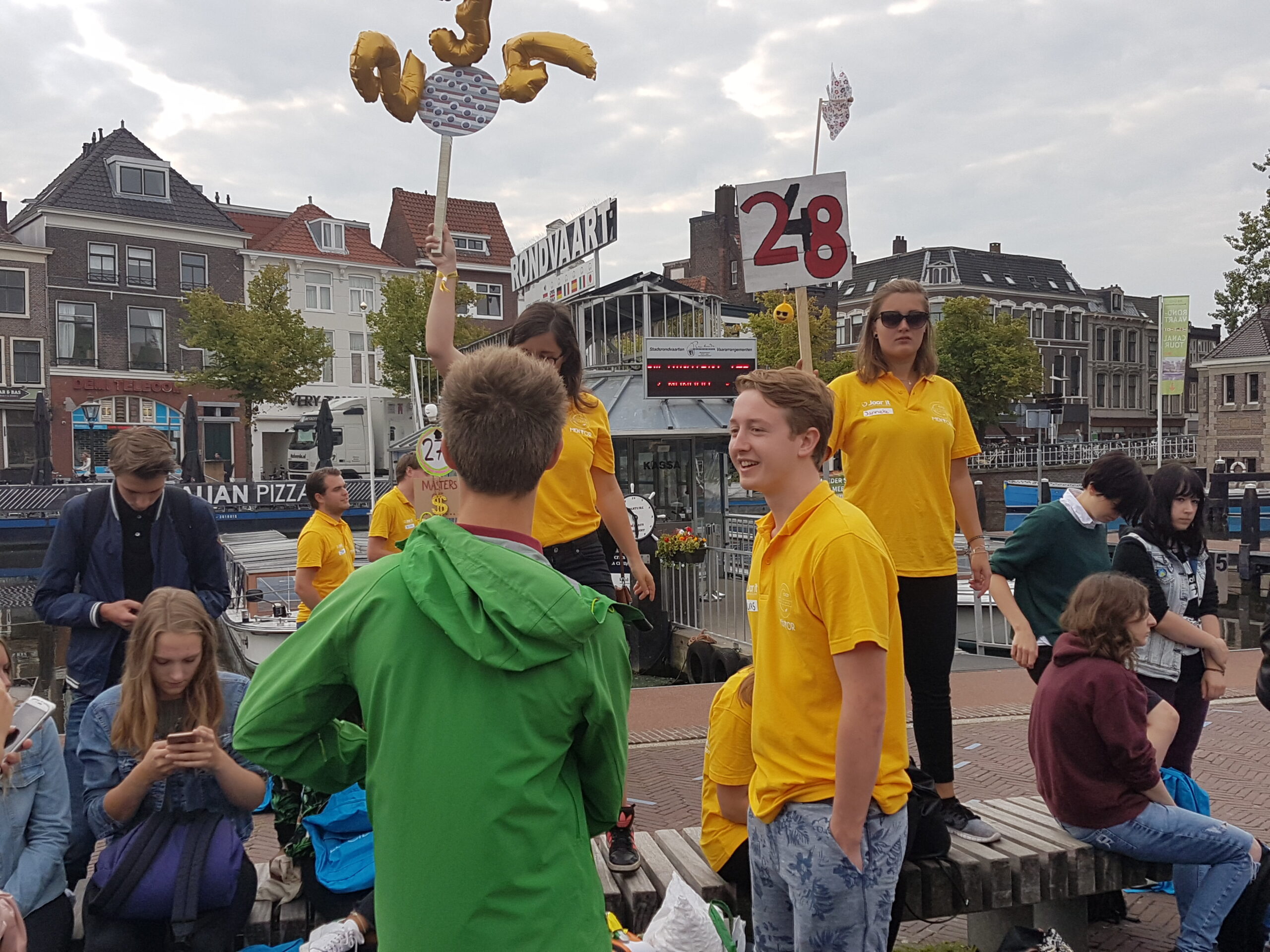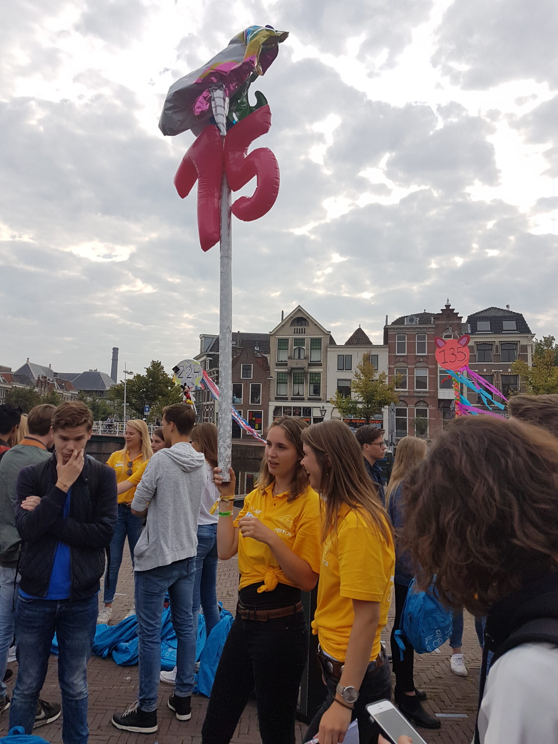 De komende dagen leren de eerstejaars de stad kennen. Vanmorgen werd er vanaf half tien verzameld op de Beestenmarkt. Daar konden ze onder meer hun tassen en koffers inleveren. Die werden met busjes naar naar de slaapzalen in de Schaatshal Leiden en het Universitair Sportcentrum gebracht.