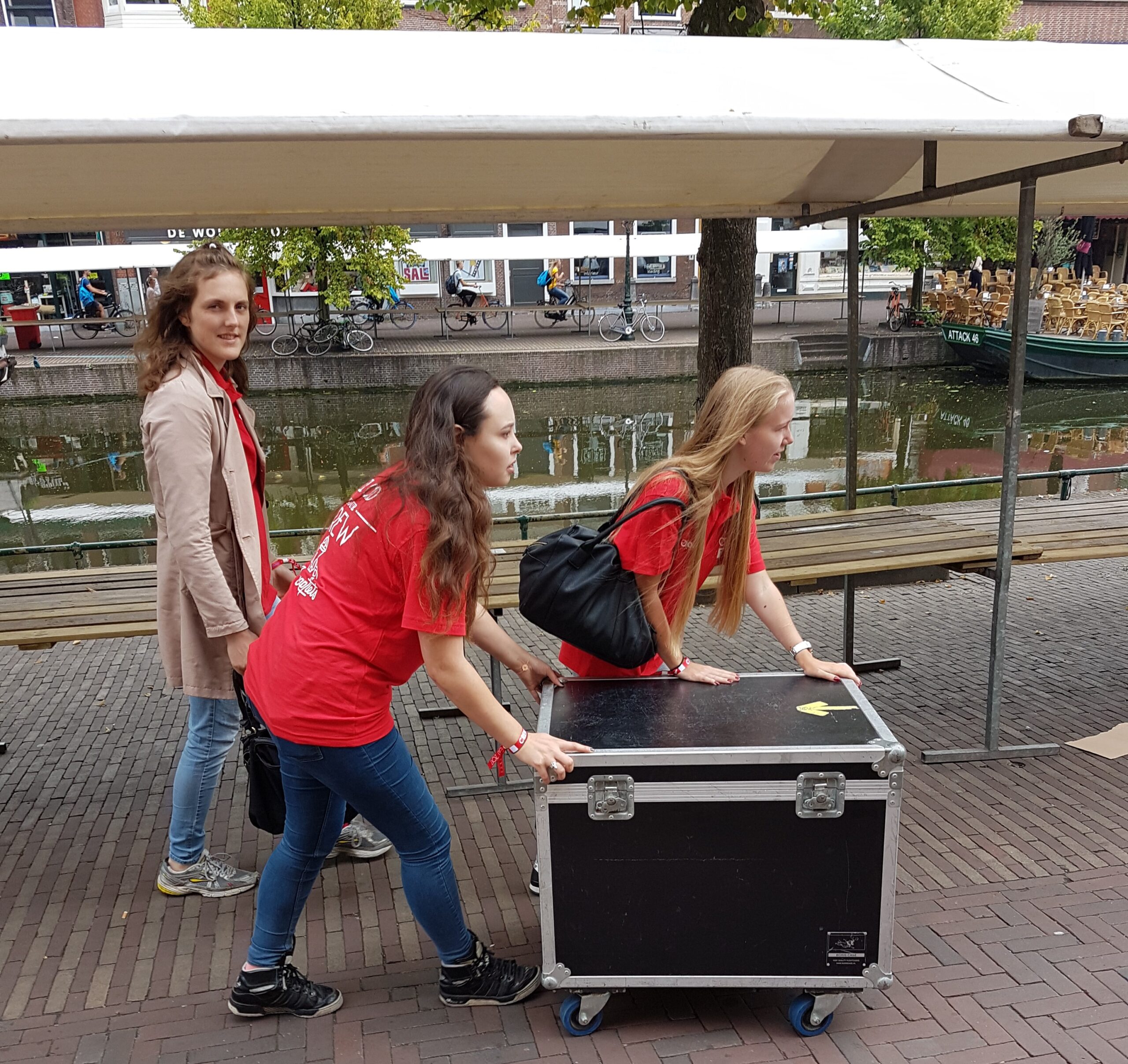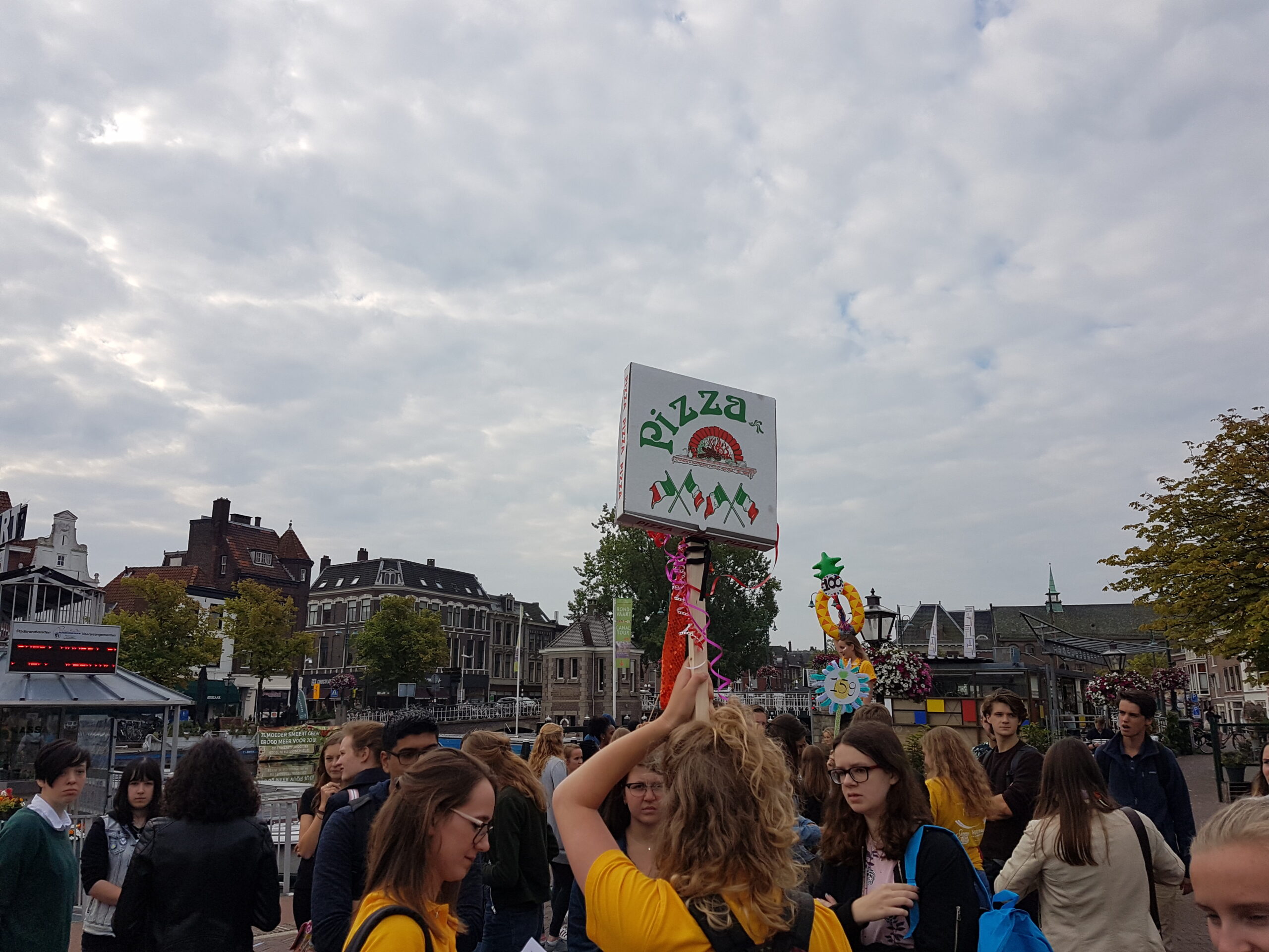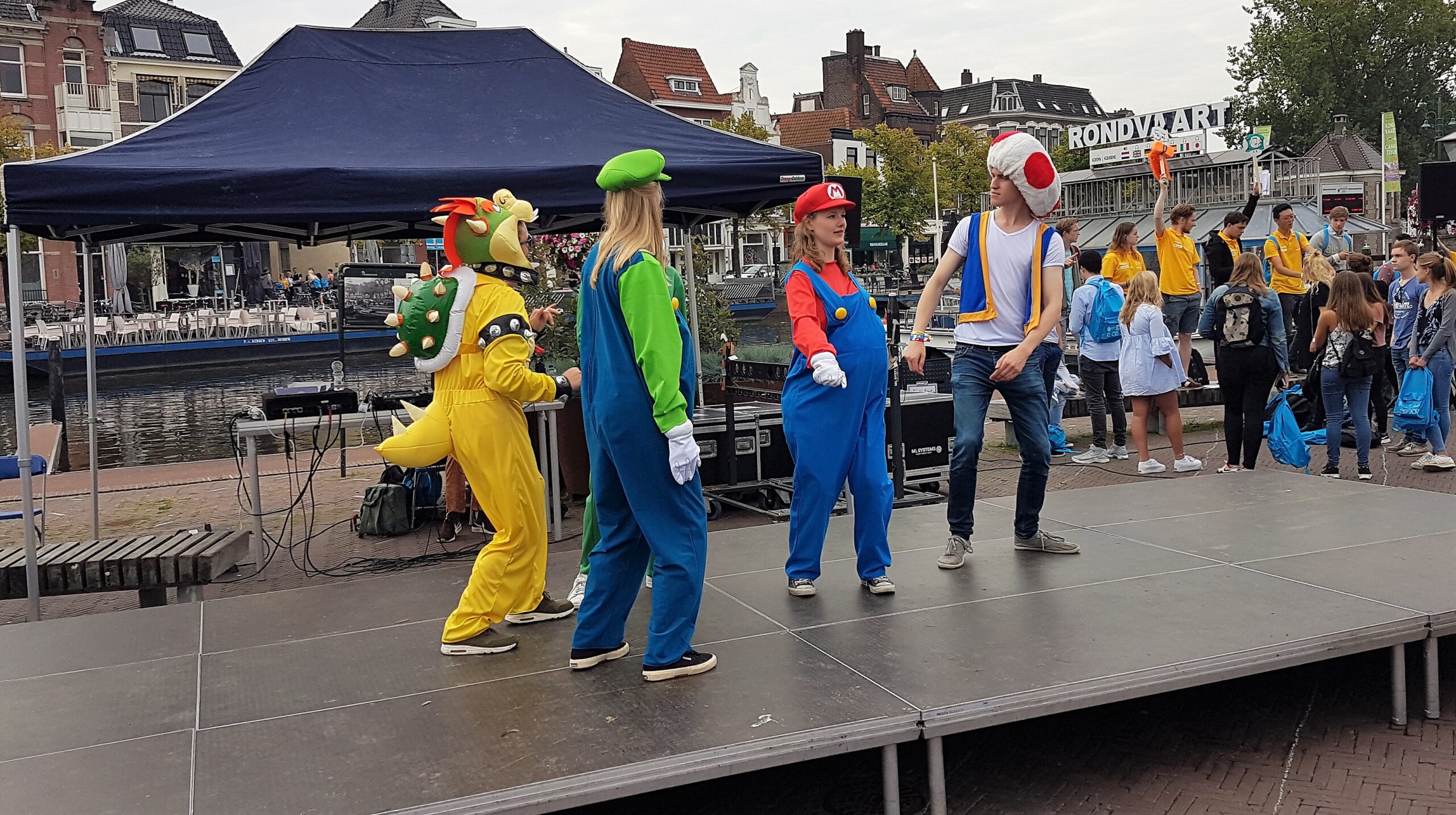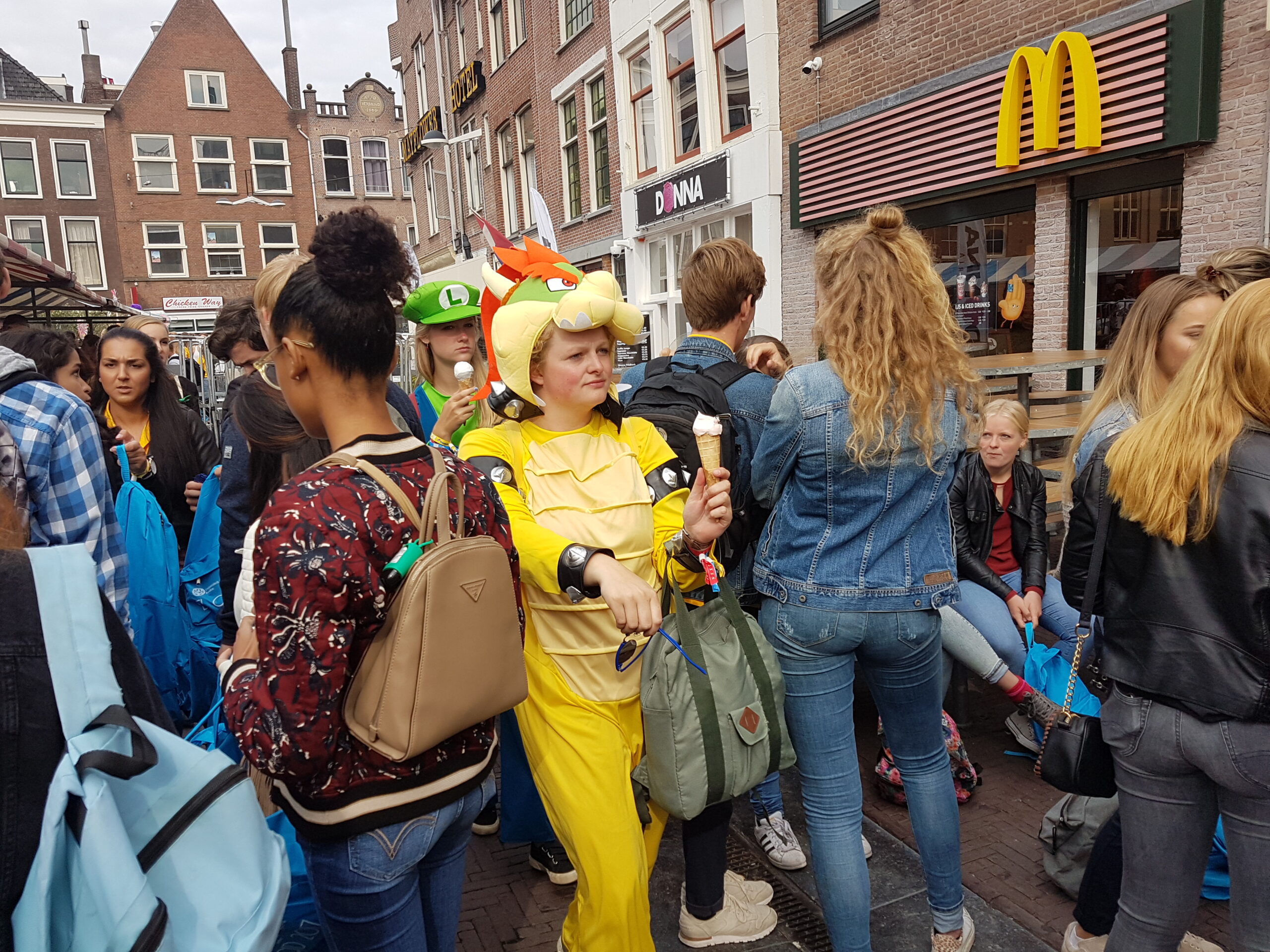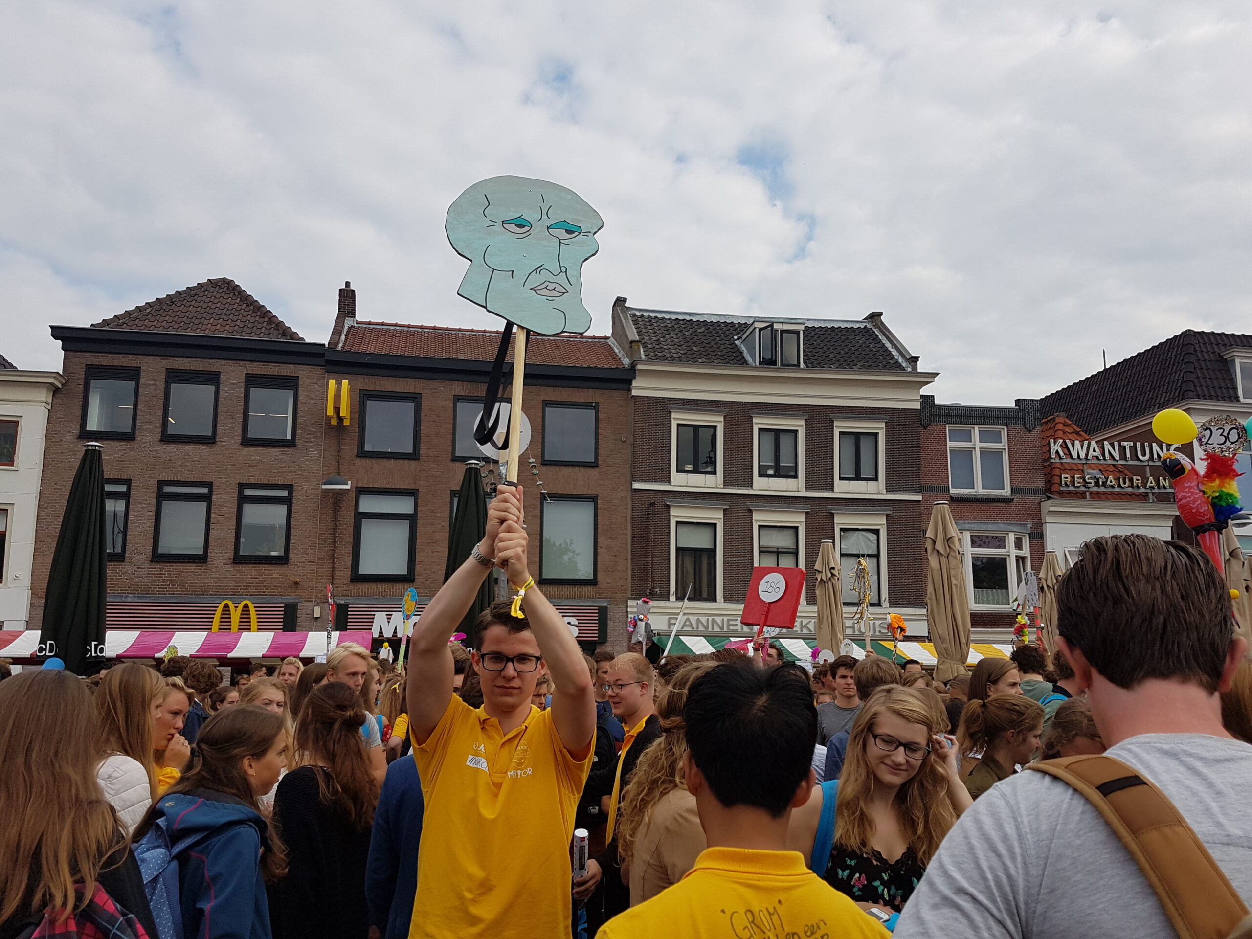 De komende dagen leren de eerstejaars de stad kennen. Vanmorgen werd er vanaf half tien verzameld op de Beestenmarkt. Daar konden ze onder meer hun tassen en koffers inleveren. Die werden met busjes naar naar de slaapzalen in de Schaatshal Leiden en het Universitair Sportcentrum gebracht.