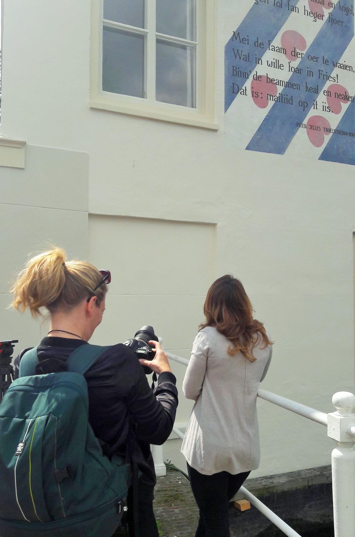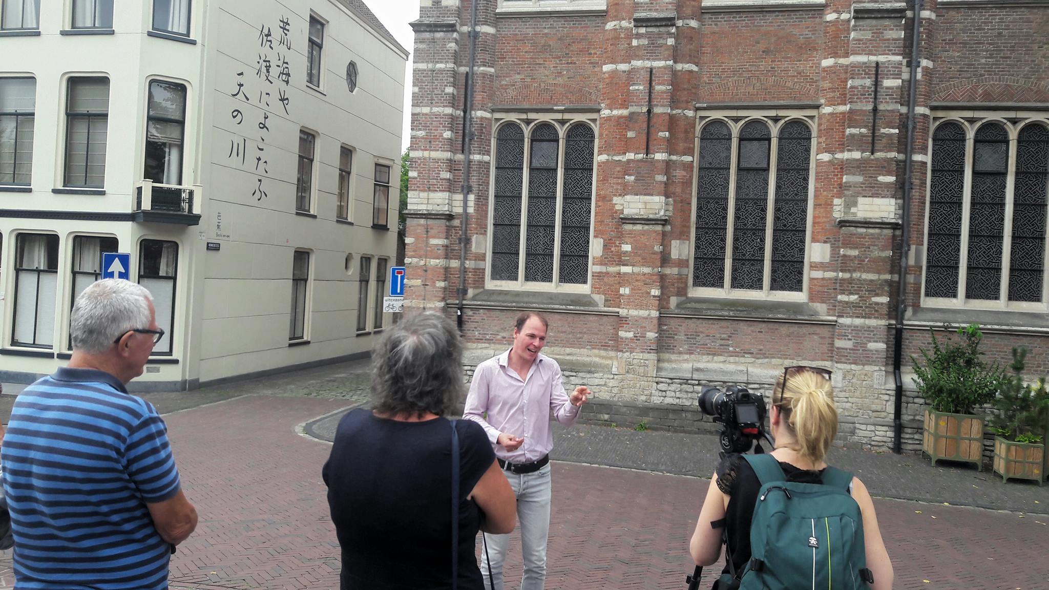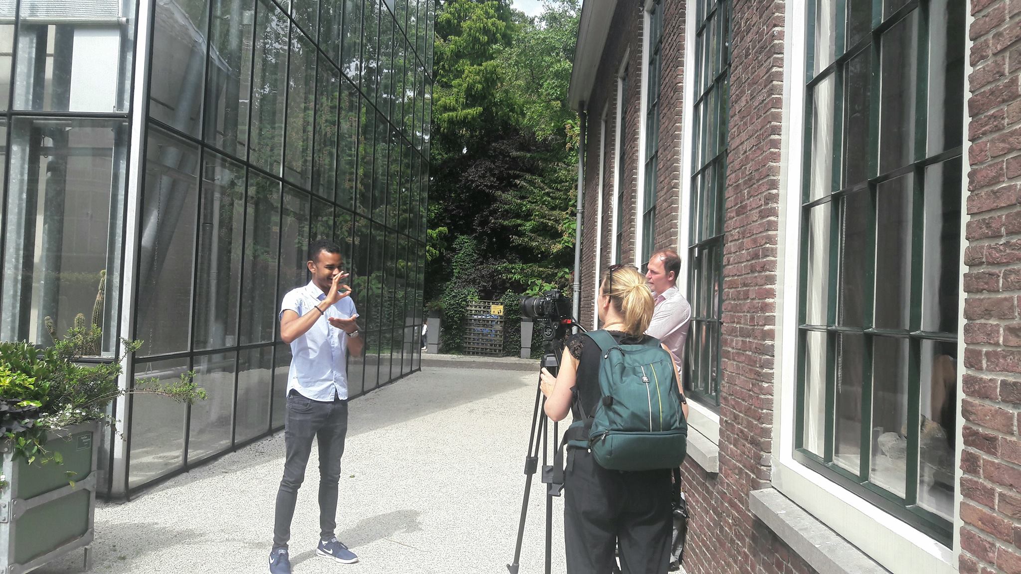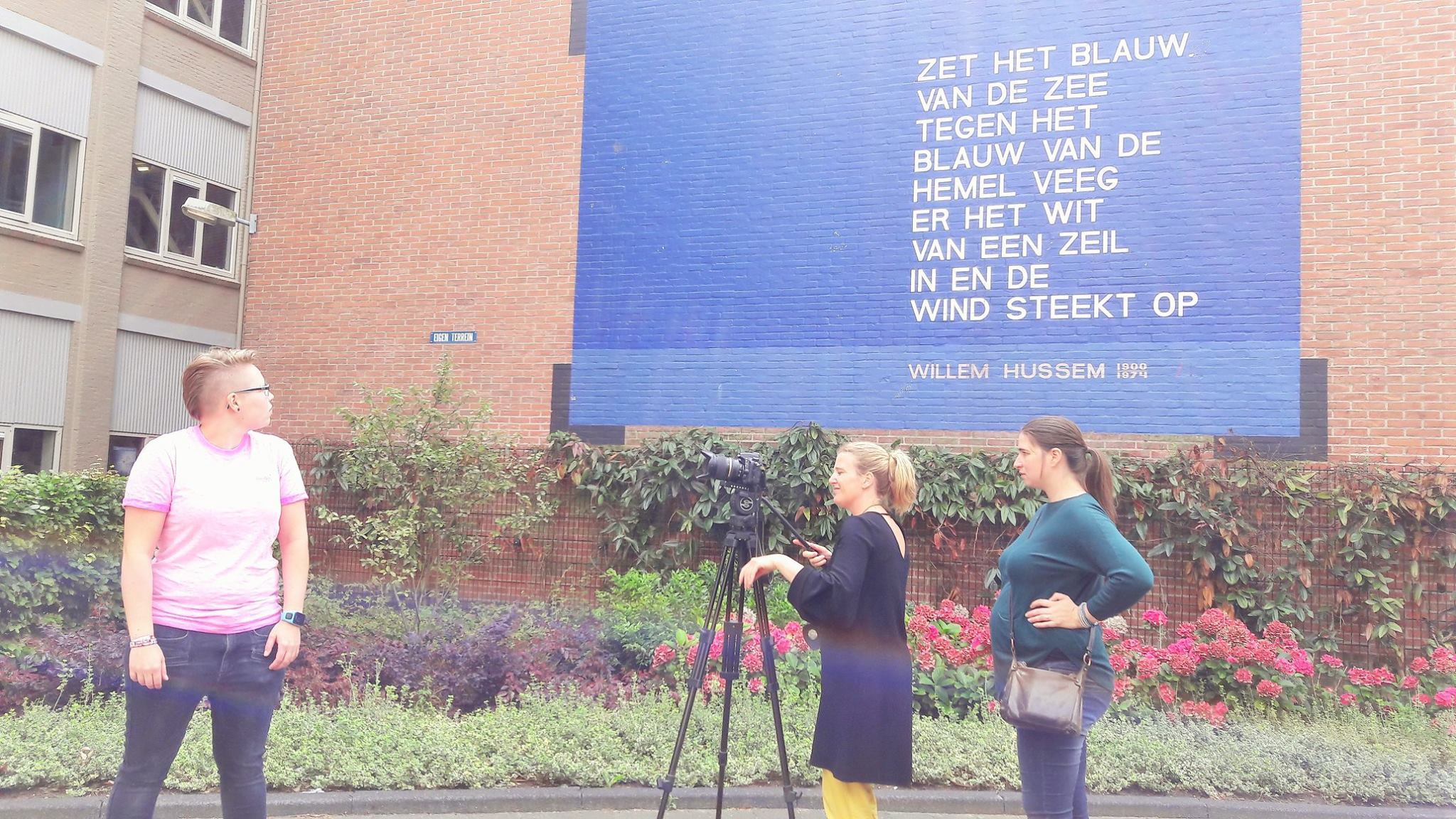 Opnames voor de crowdfundingvideo voor het Muurgedicht in gebarentaal (NGT) met onder andere Patrick Meijer en Jarzhinio Curiel. Bij een van de vele muurgedichten die er al zijn en bij de plek waar het nieuwe muurgedicht ‘Polder’ van Wim Emmerik komt: de Hortus Botanicus.