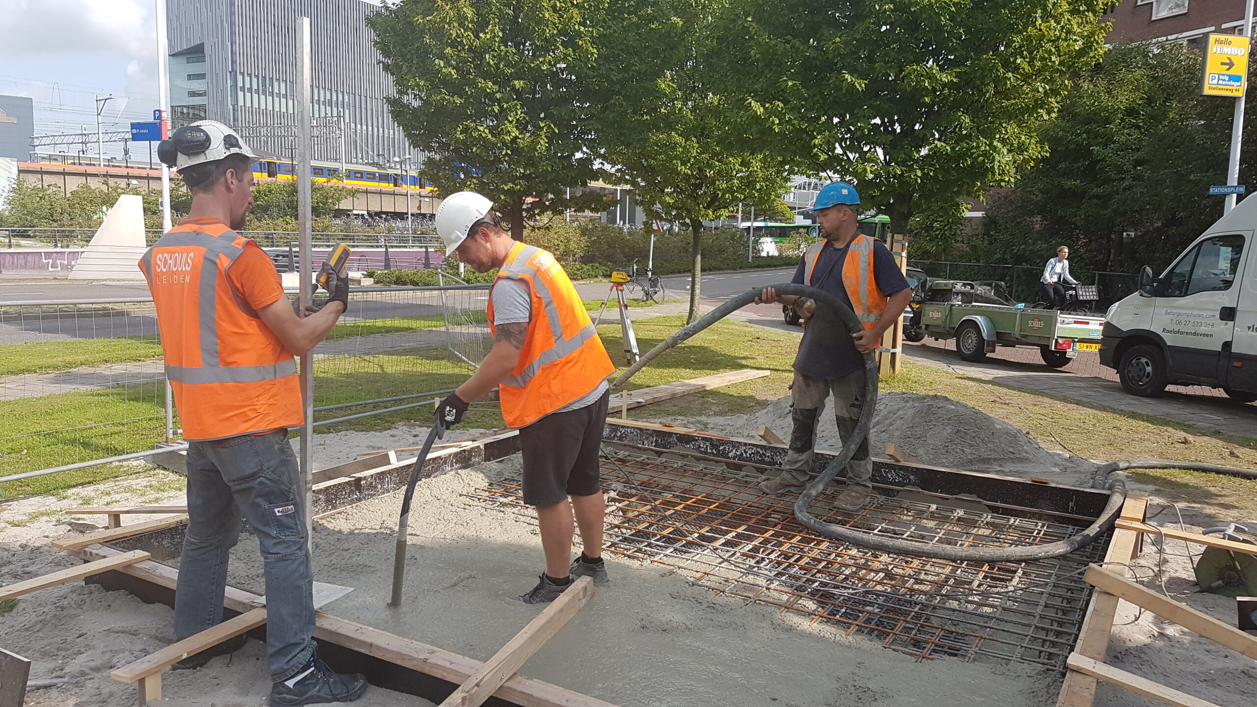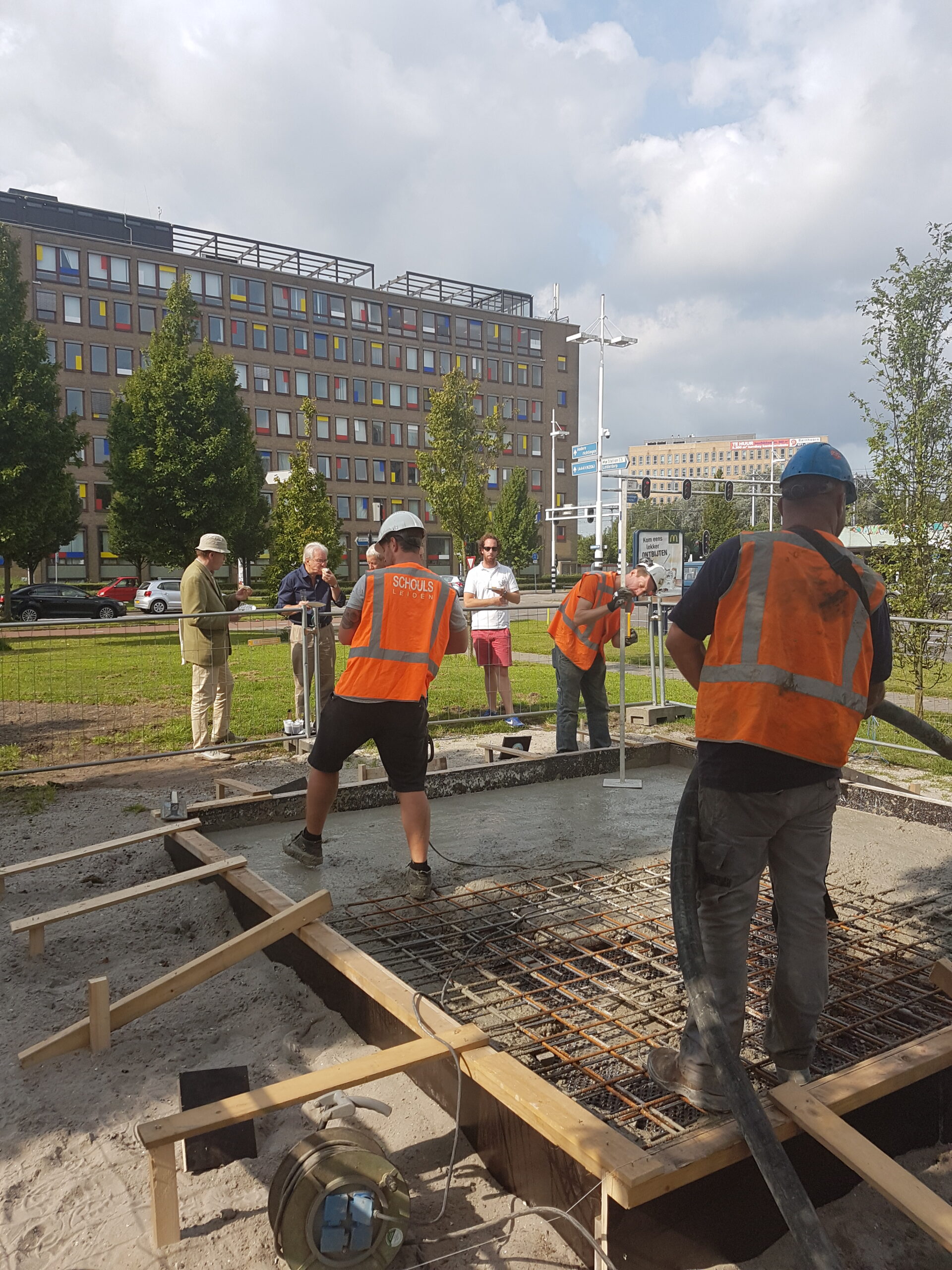 Het betonnen fundament moet in de komende twee weken uitharden. Daarna heeft de stichting Vierkant in Vierkant nog eens 14 dagen te tijd om het beeld op te bouwen. Op 23 september, tijdens de Kunstroute Leiden, moet het officieel worden onthuld.