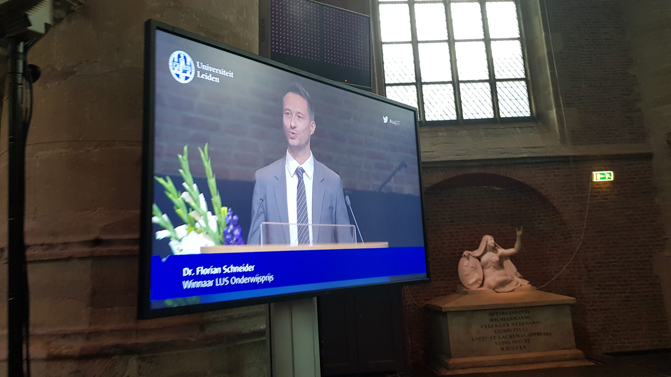 Tijdens de opening van het Academisch Jaar werden ook twee prijzen uitgereikt. Sinoloog Florian Schneider werd door het Leids Universitair Studentenplatform (LUS) verkozen tot docent van het jaar vanwege de hoge kwaliteit van zijn colleges. “Schneider is een docent die lesgeeft om het lesgeven,” zei LUS-voorzitter Ghislaine Voogd. “Hij doceert niet omdat het nou eenmaal een verplichting is voor een wetenschapper. Nee, hij beschouwt het als zijn prioriteit om de wetenschappers van morgen op te leiden.”