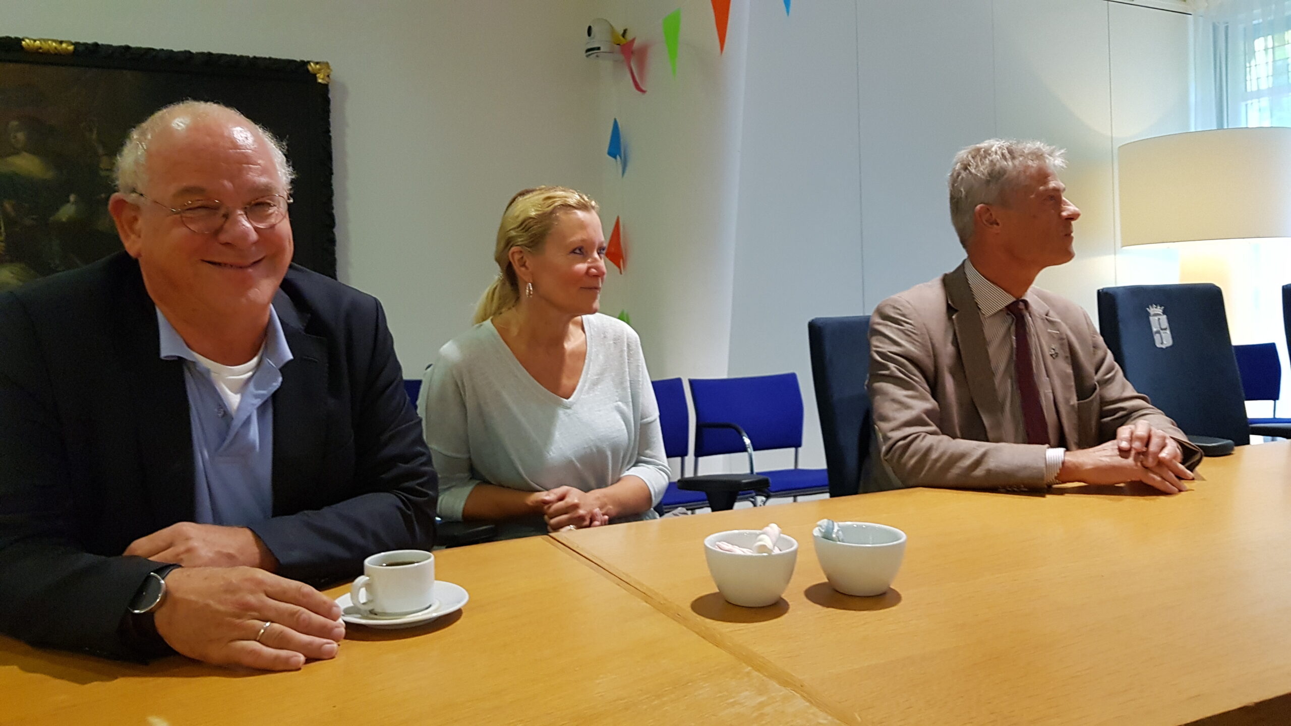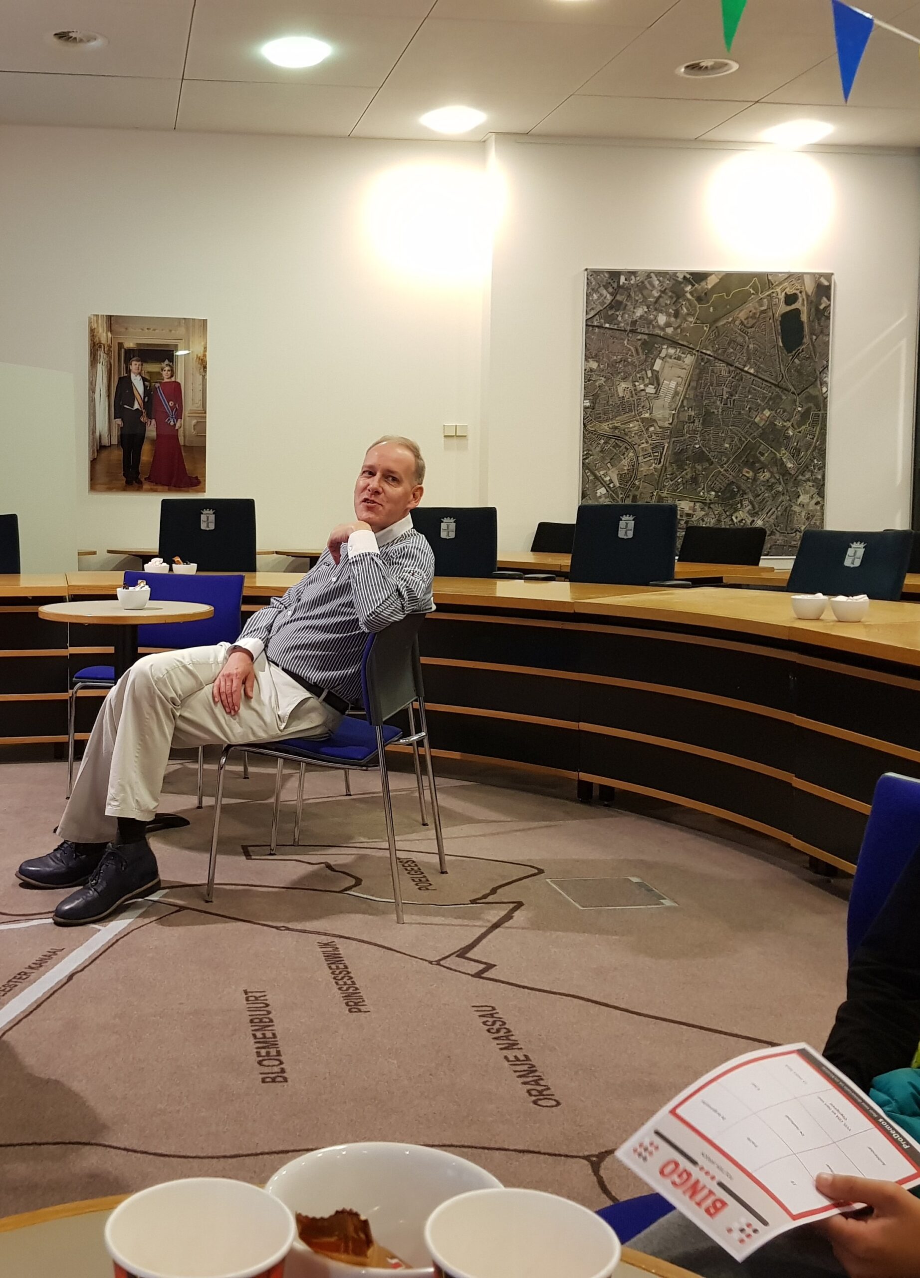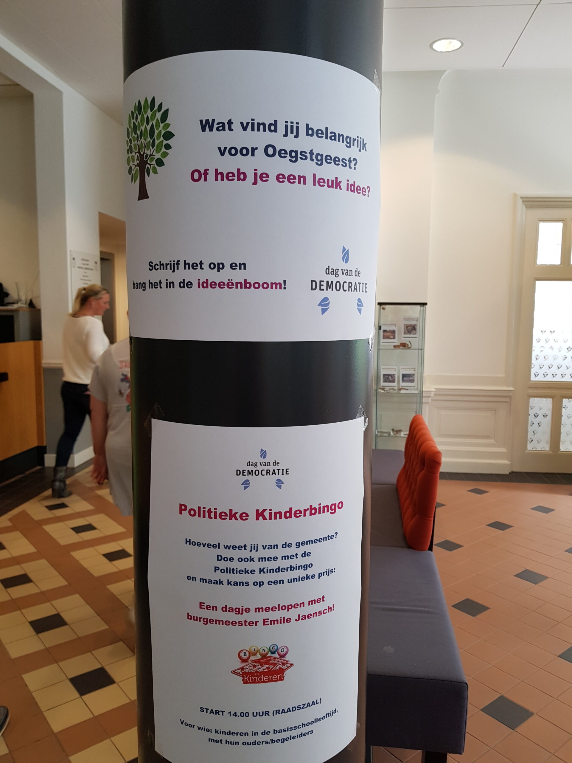 Chris de Waard was zondag in Oegstgeest. Hij kreeg een rondleiding door het gemeentehuis, woonde de kinderbingo bij en sprak met burgemeester Emile Jaensch over de fotowedstrijd en de ideeënboom.