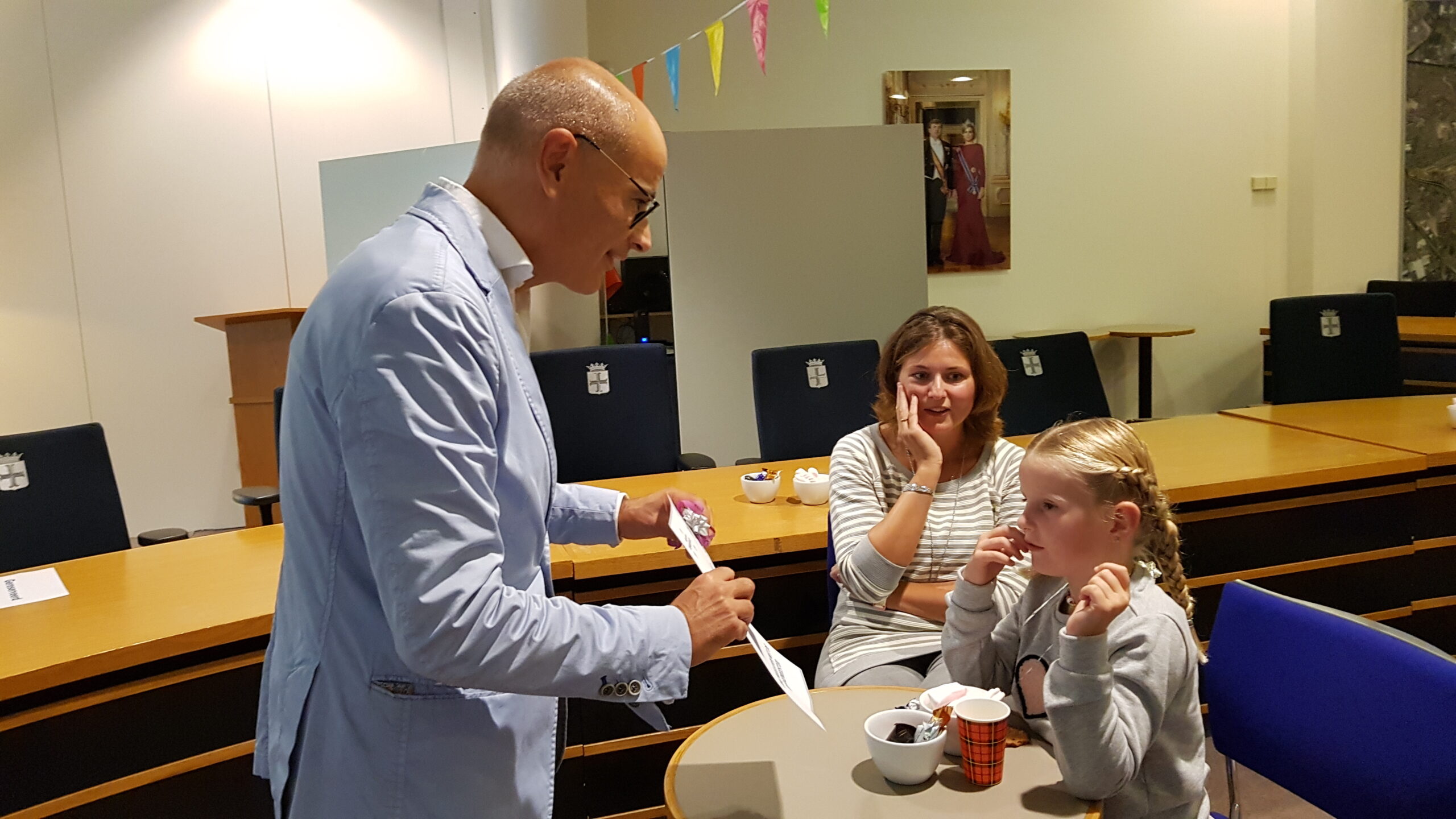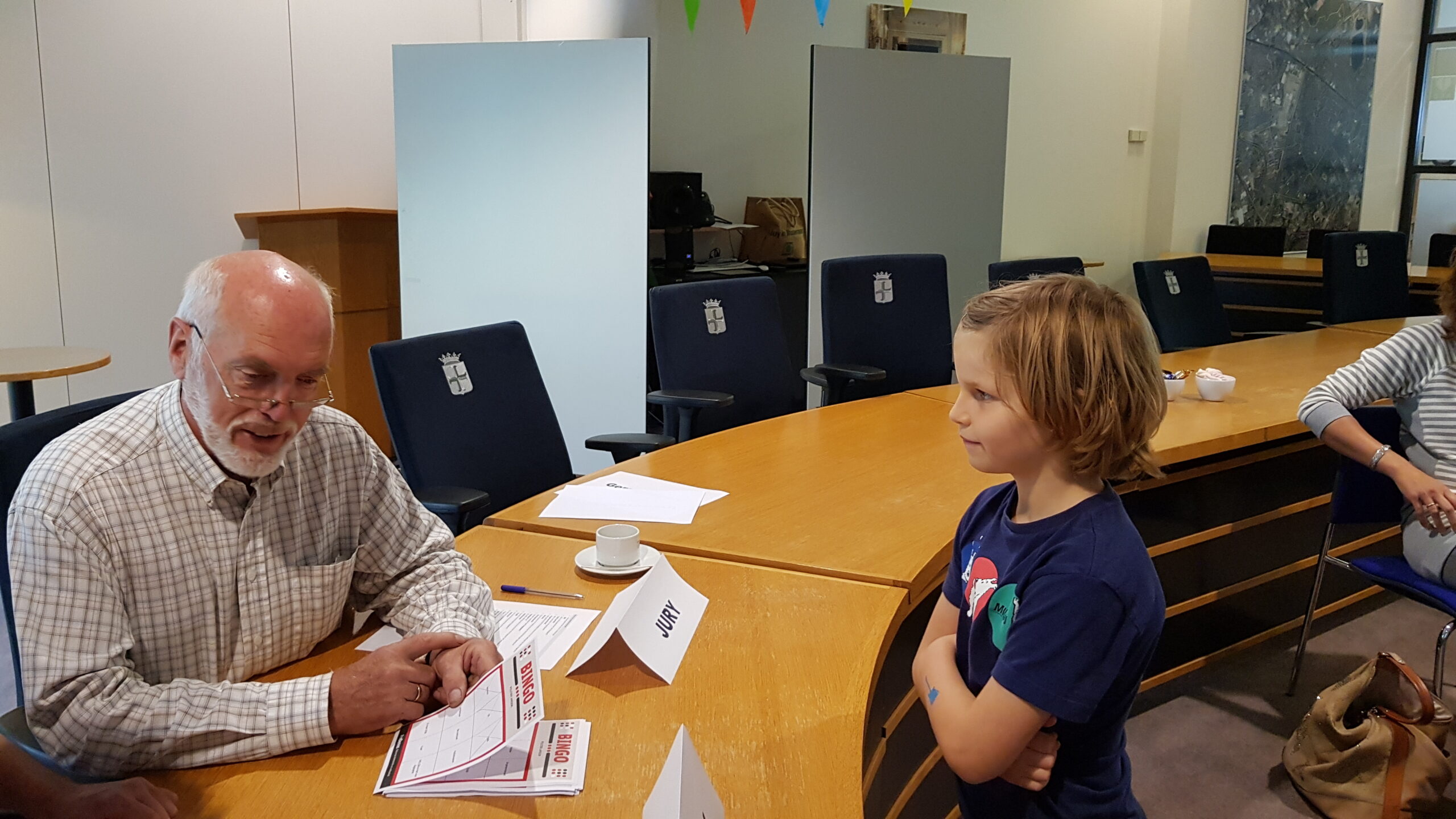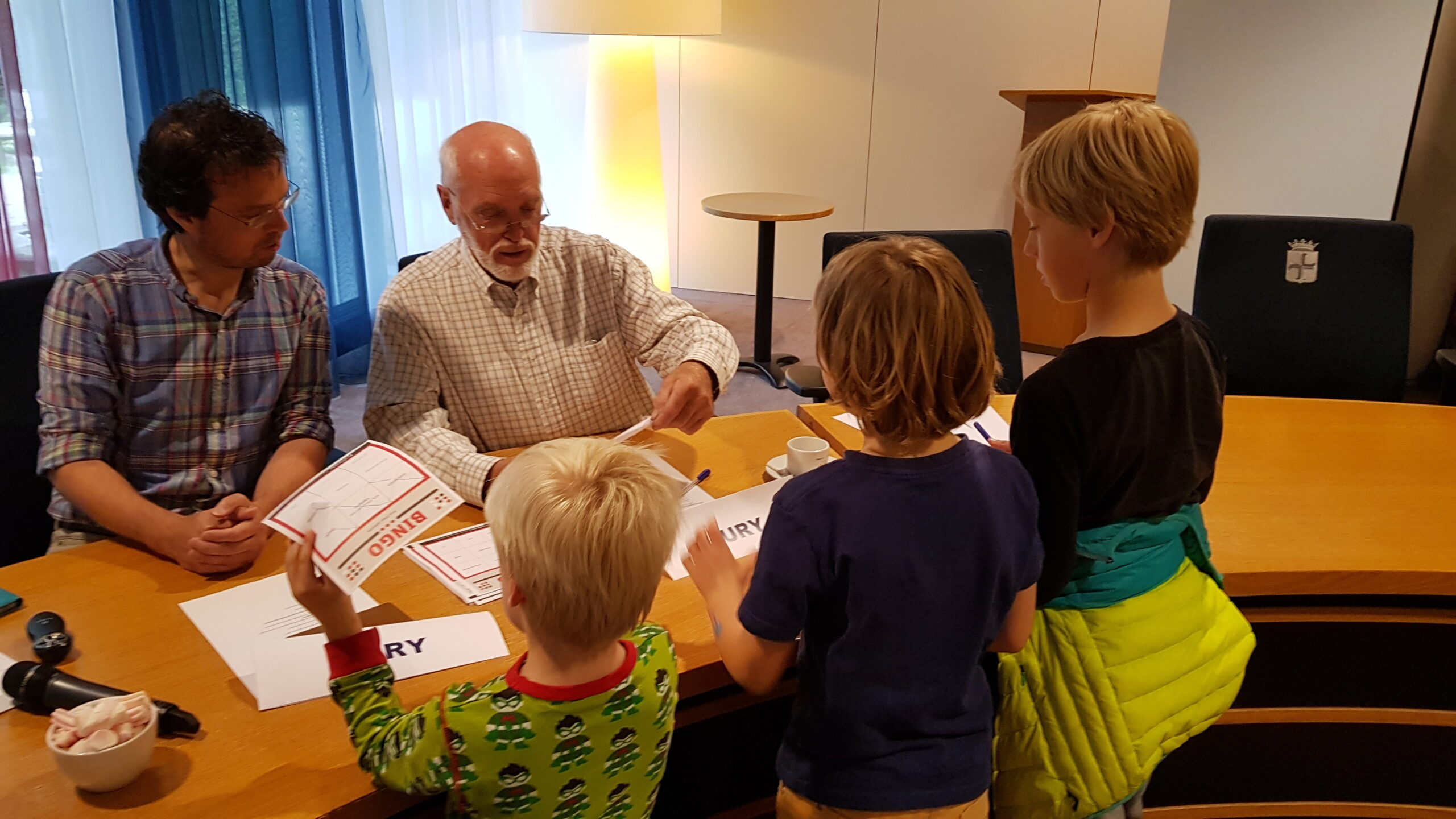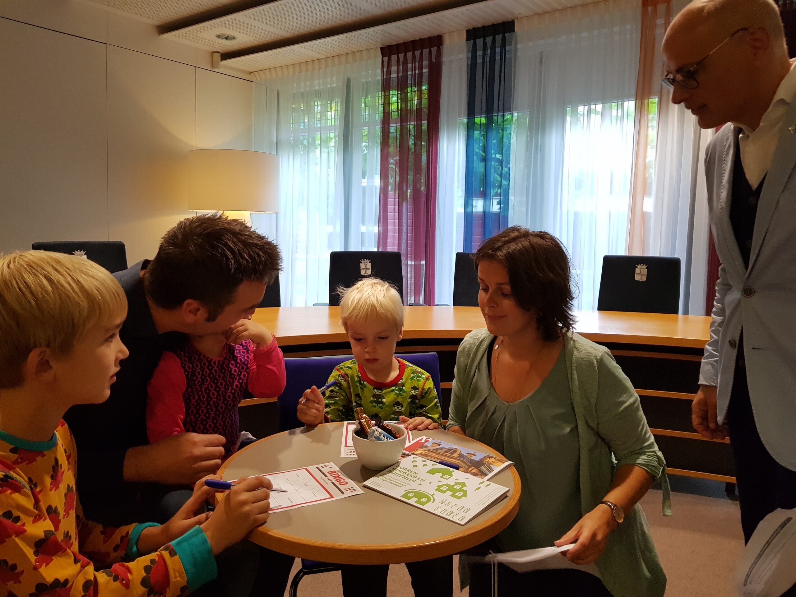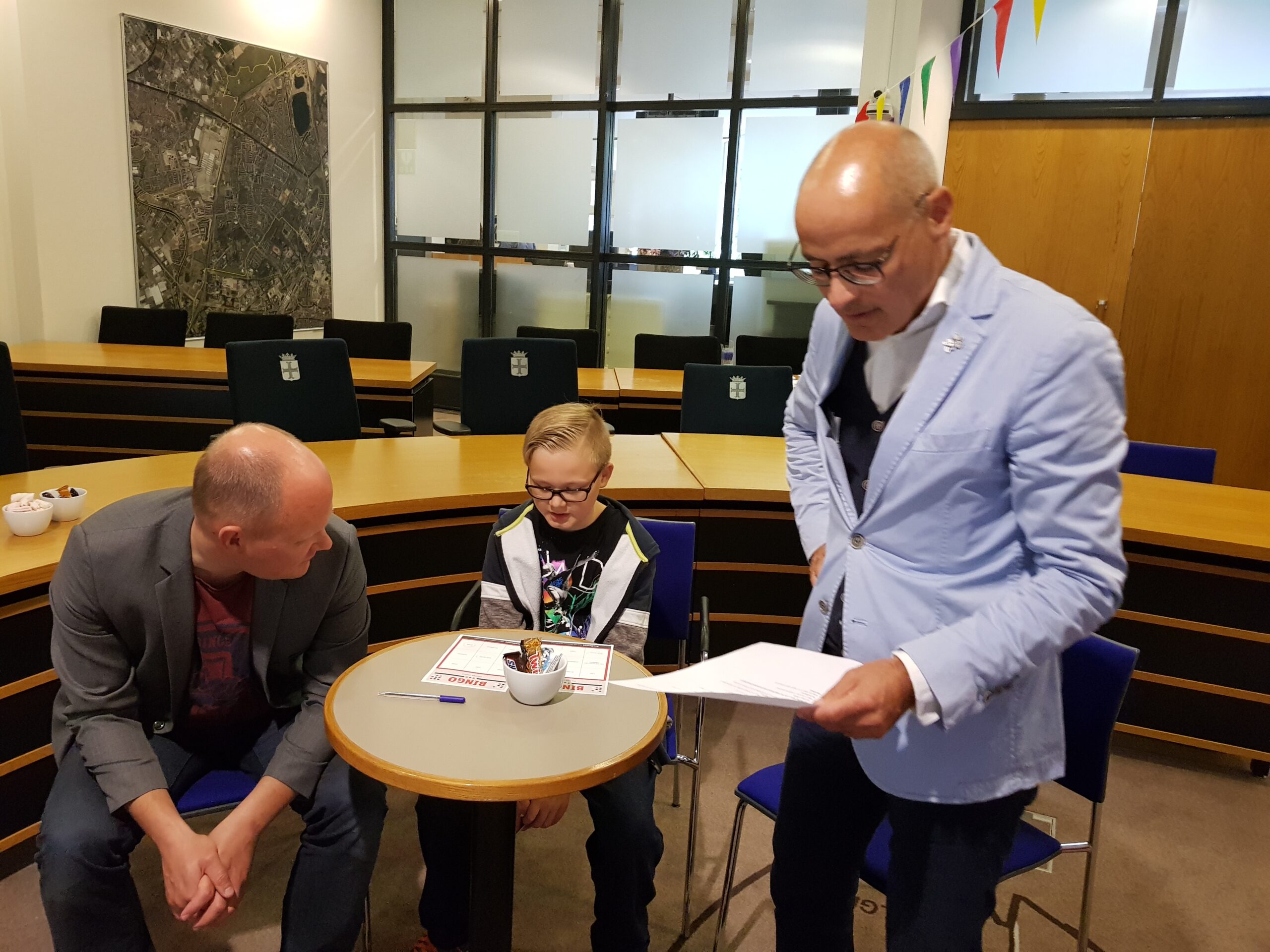 Burgemeester Jaensch van Oegstgeest stelde de vragen bij de bingo en de hoofdprijs, een dagje meelopen met de burgemeester, eindigt als het aan de zesjarige winnares Elize ligt in zwembad Poelmeer. “Maar misschien durft ‘ie wel helemaal niet te zwemmen omdat hij geen diploma heeft,” opperde de winnares. “Ik heb een beetje watervrees,” gaf Jaensch wel toe. Maar een leuke dag gaan ze er zeker van maken.